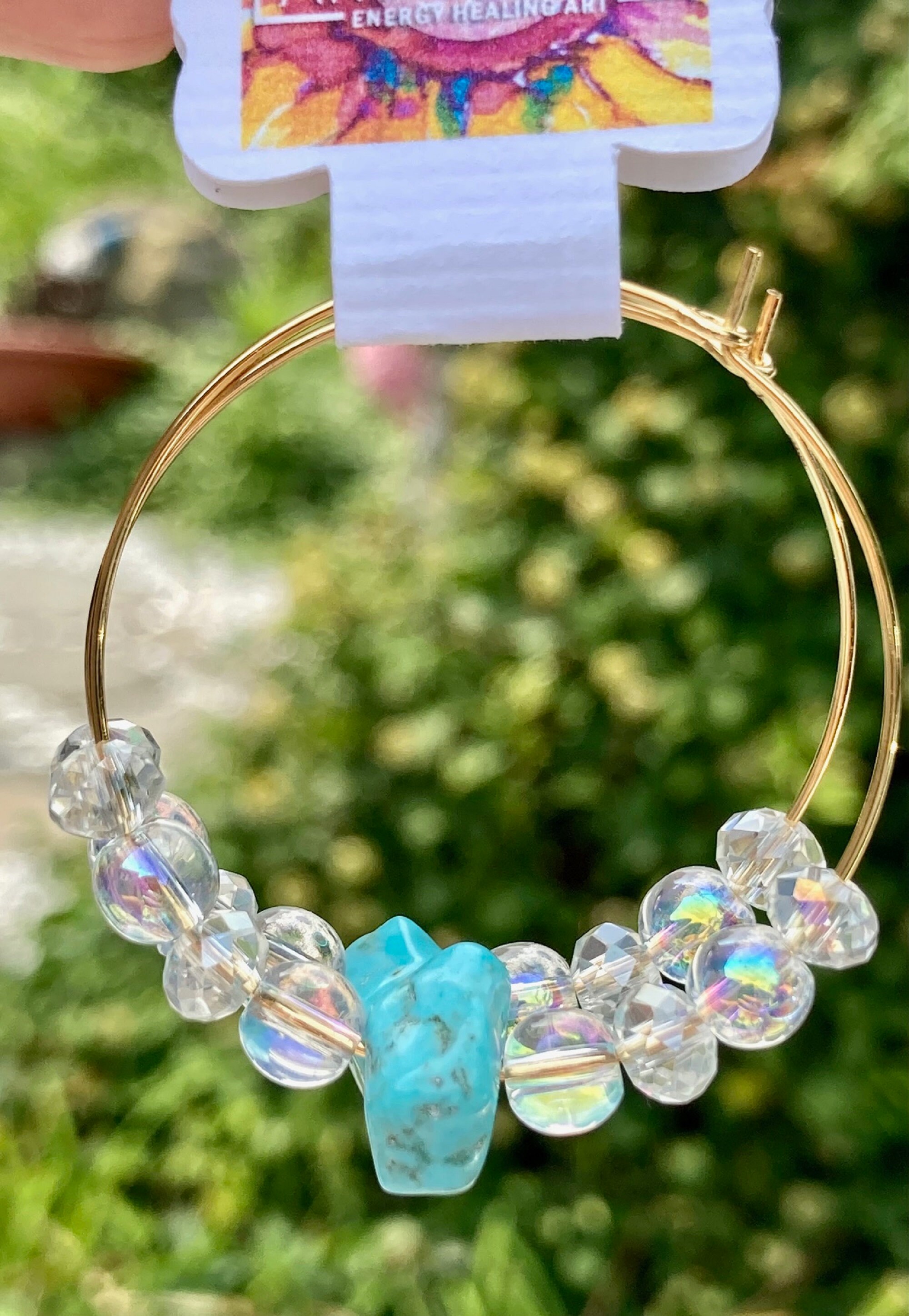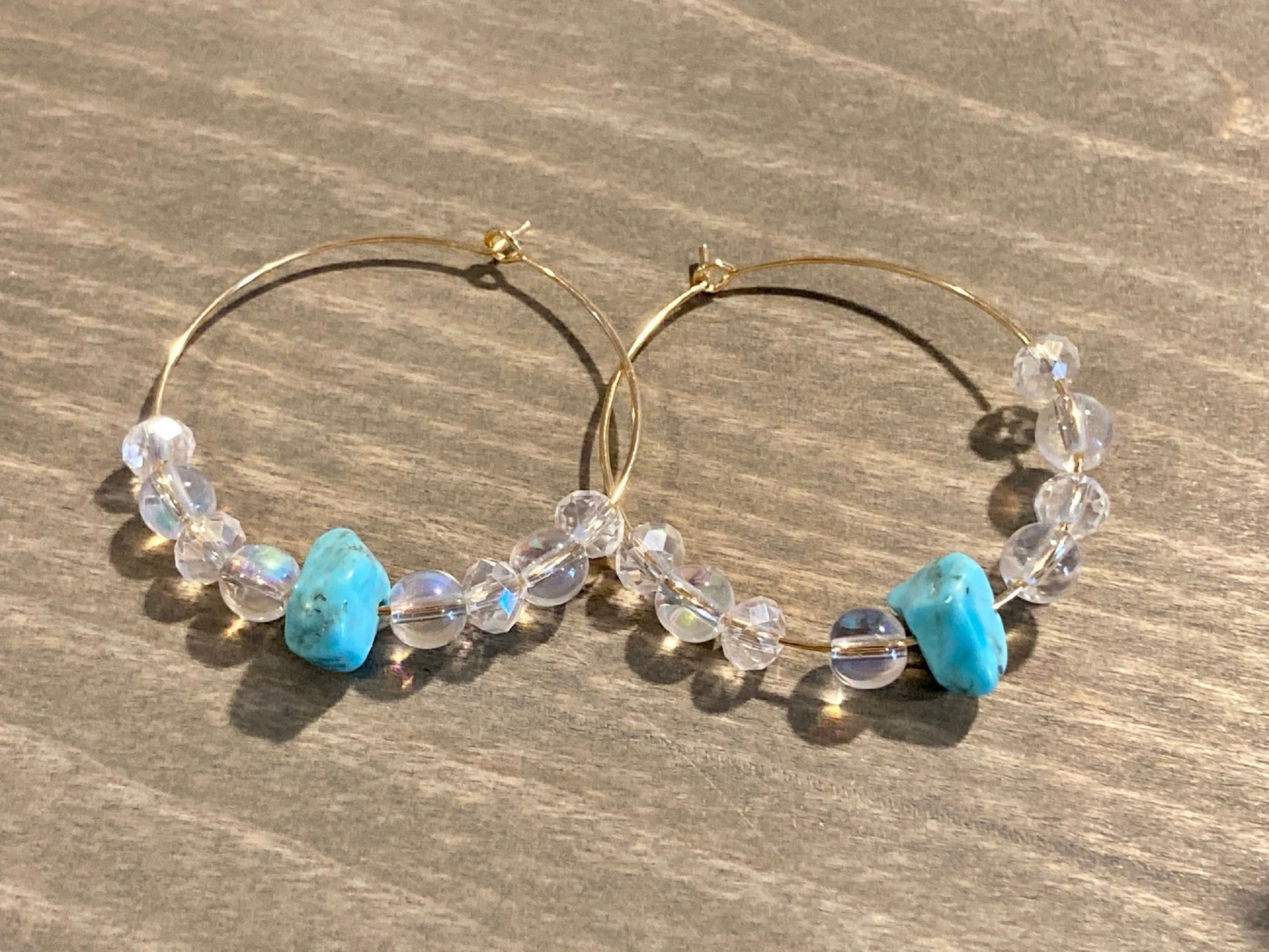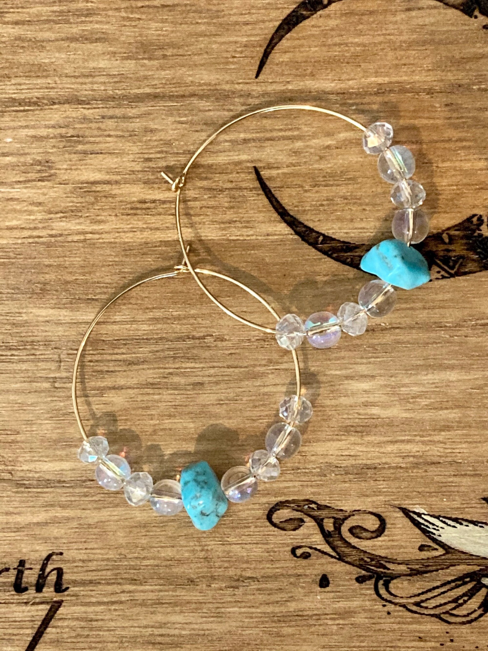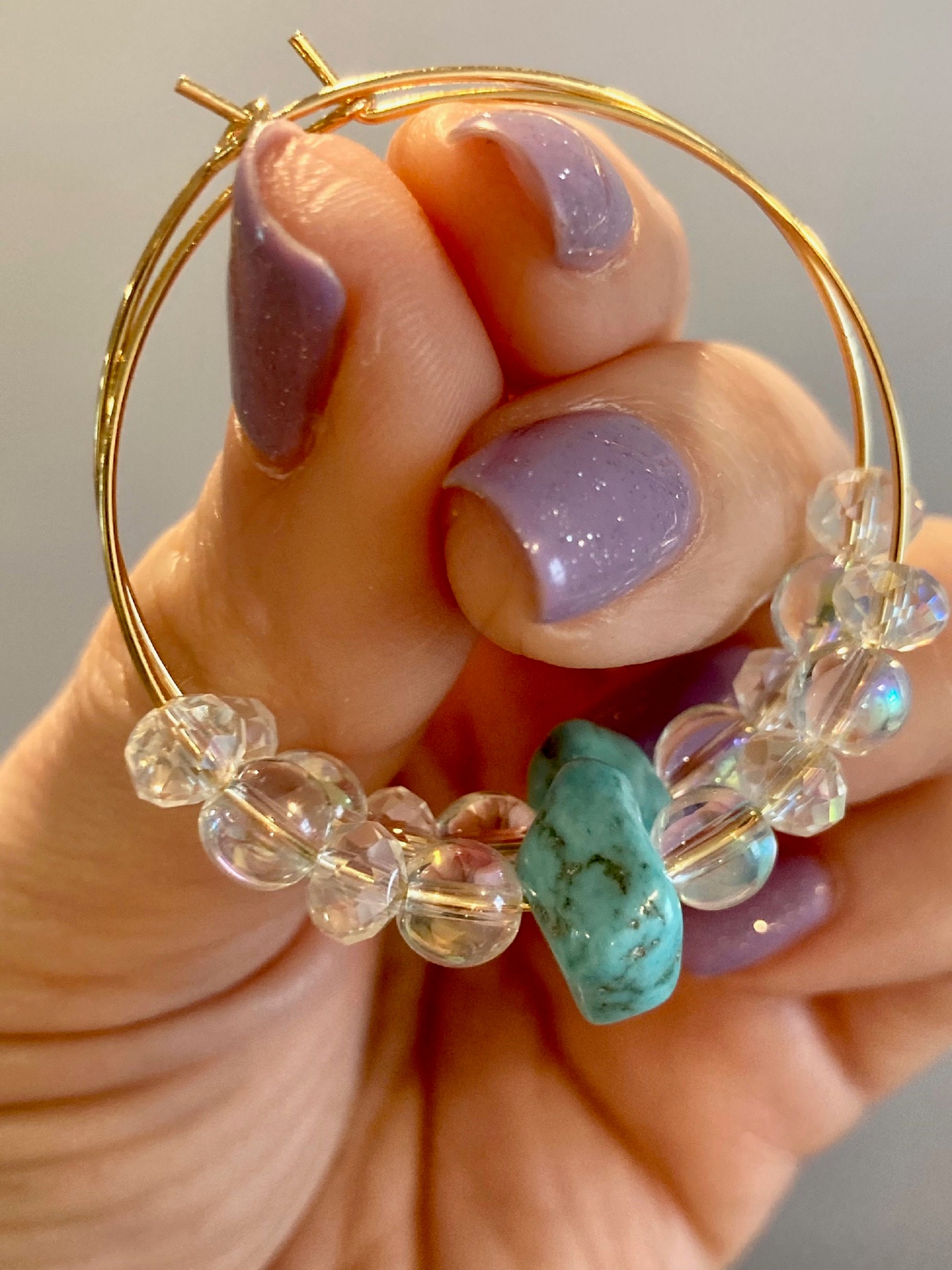 These are handmade, light weight, and thin, 18K gold plated over copper, Gemstone hoop earrings, sized 40mm with a gorgeous Turquoise chunky chip and Czech Glass Crystals. These hoops are slow tarnish for everyday wear.