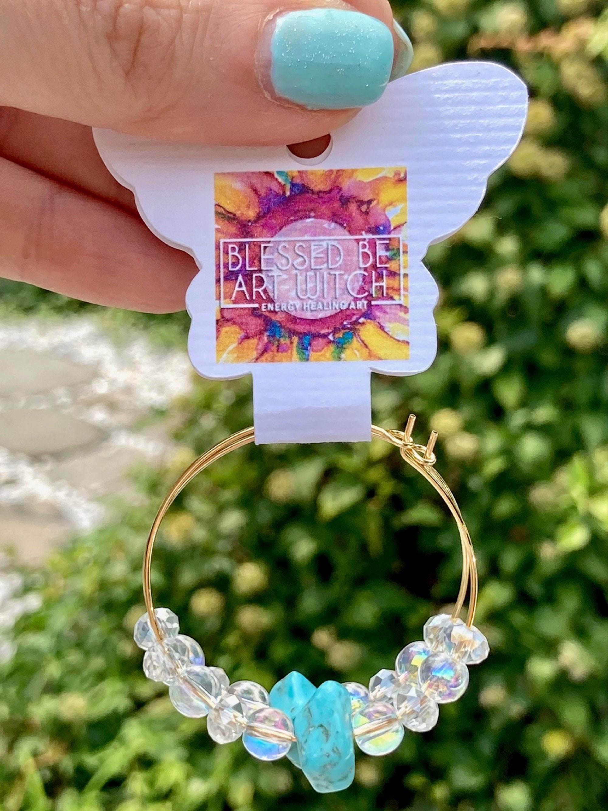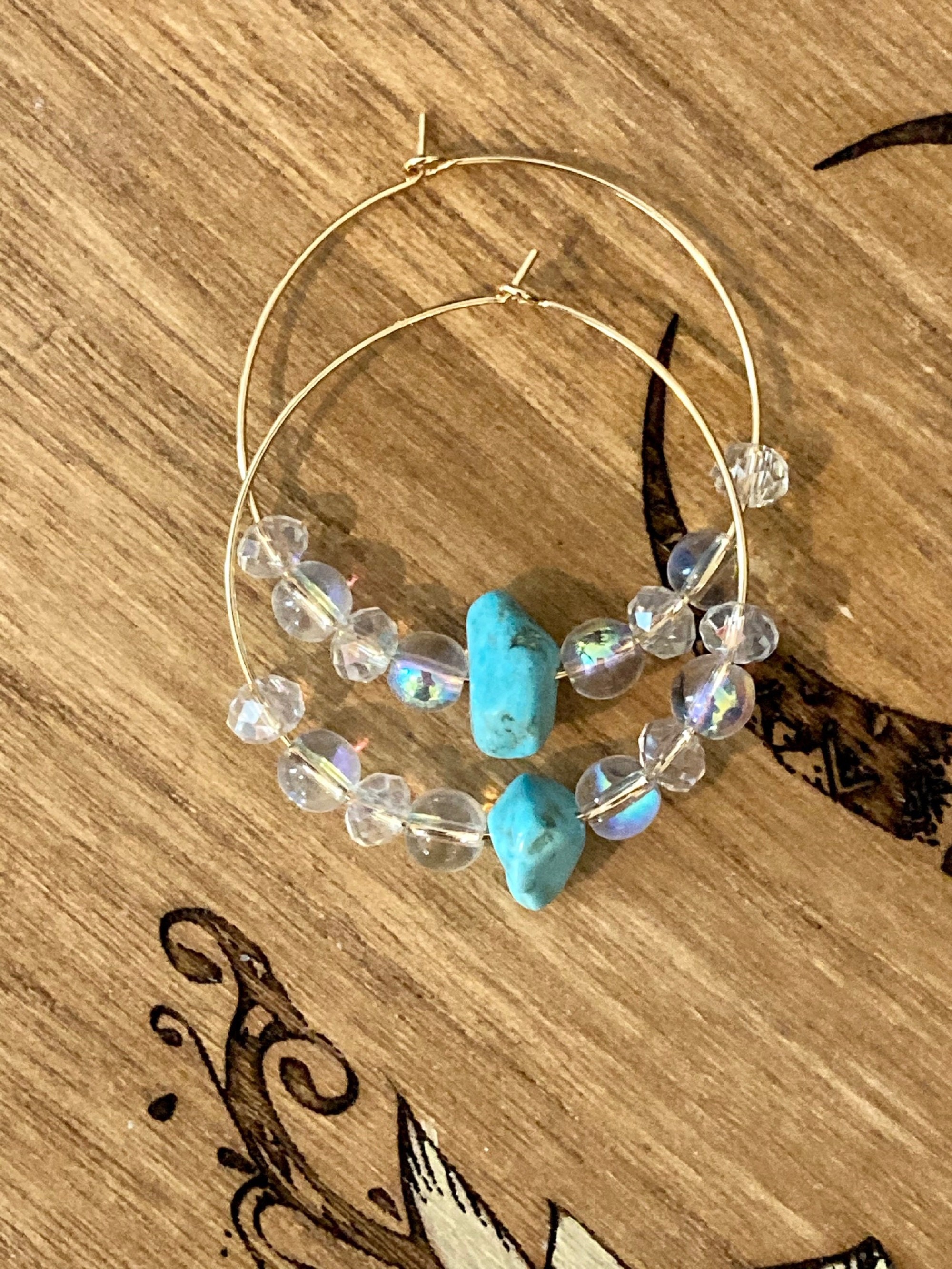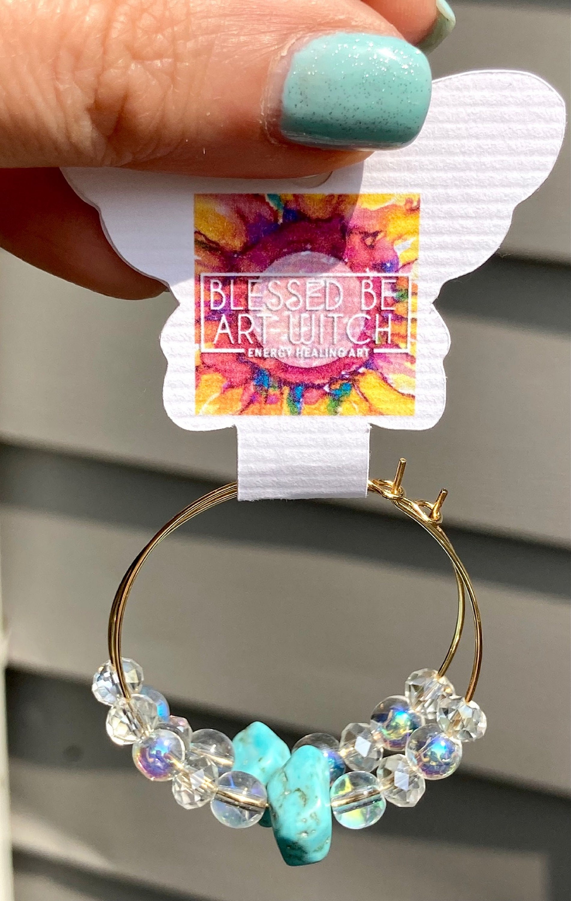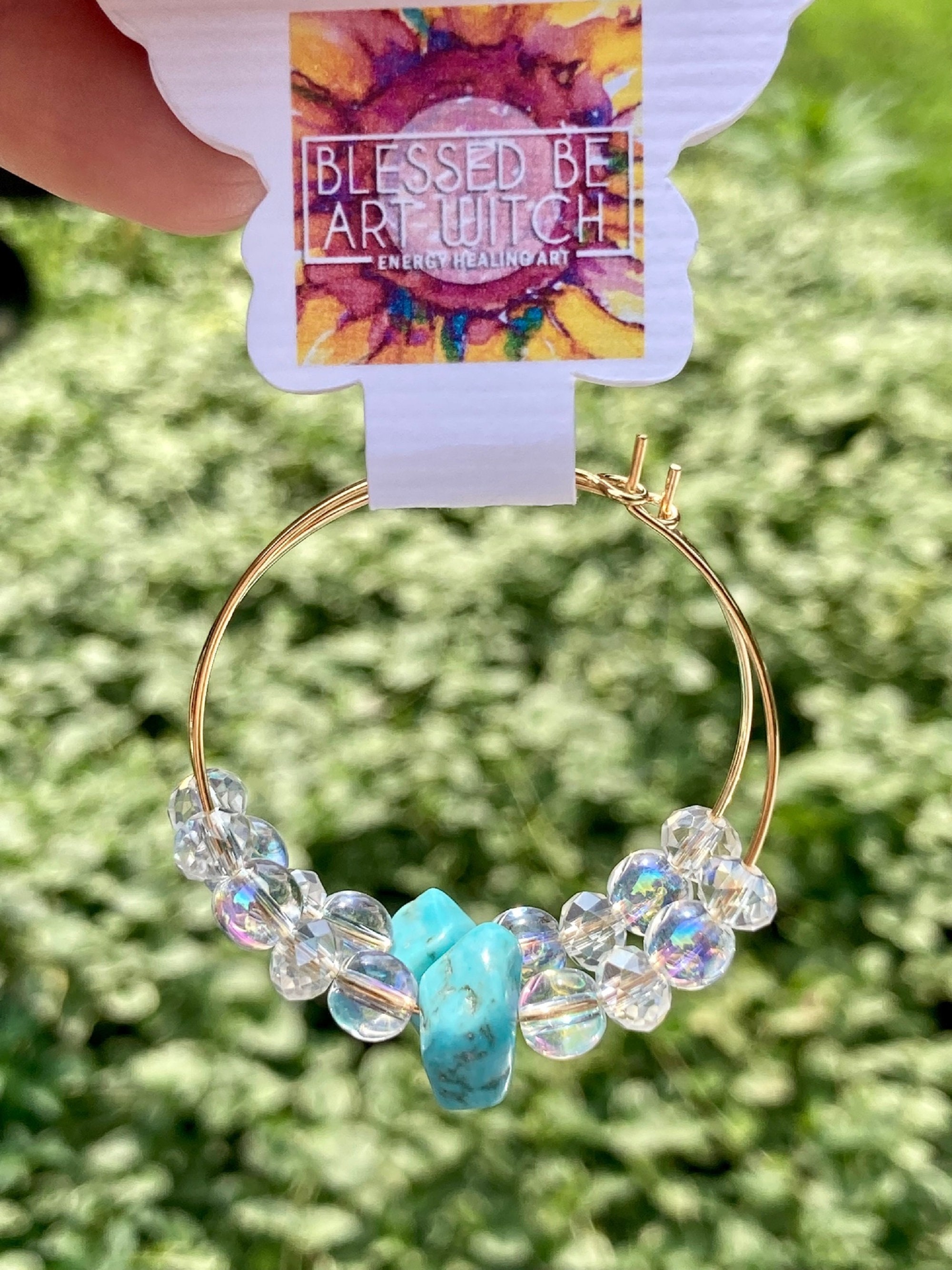 These are handmade, light weight, and thin, 18K gold plated over copper, Gemstone hoop earrings, sized 40mm with a gorgeous Turquoise chunky chip and Czech Glass Crystals. These hoops are slow tarnish for everyday wear.
