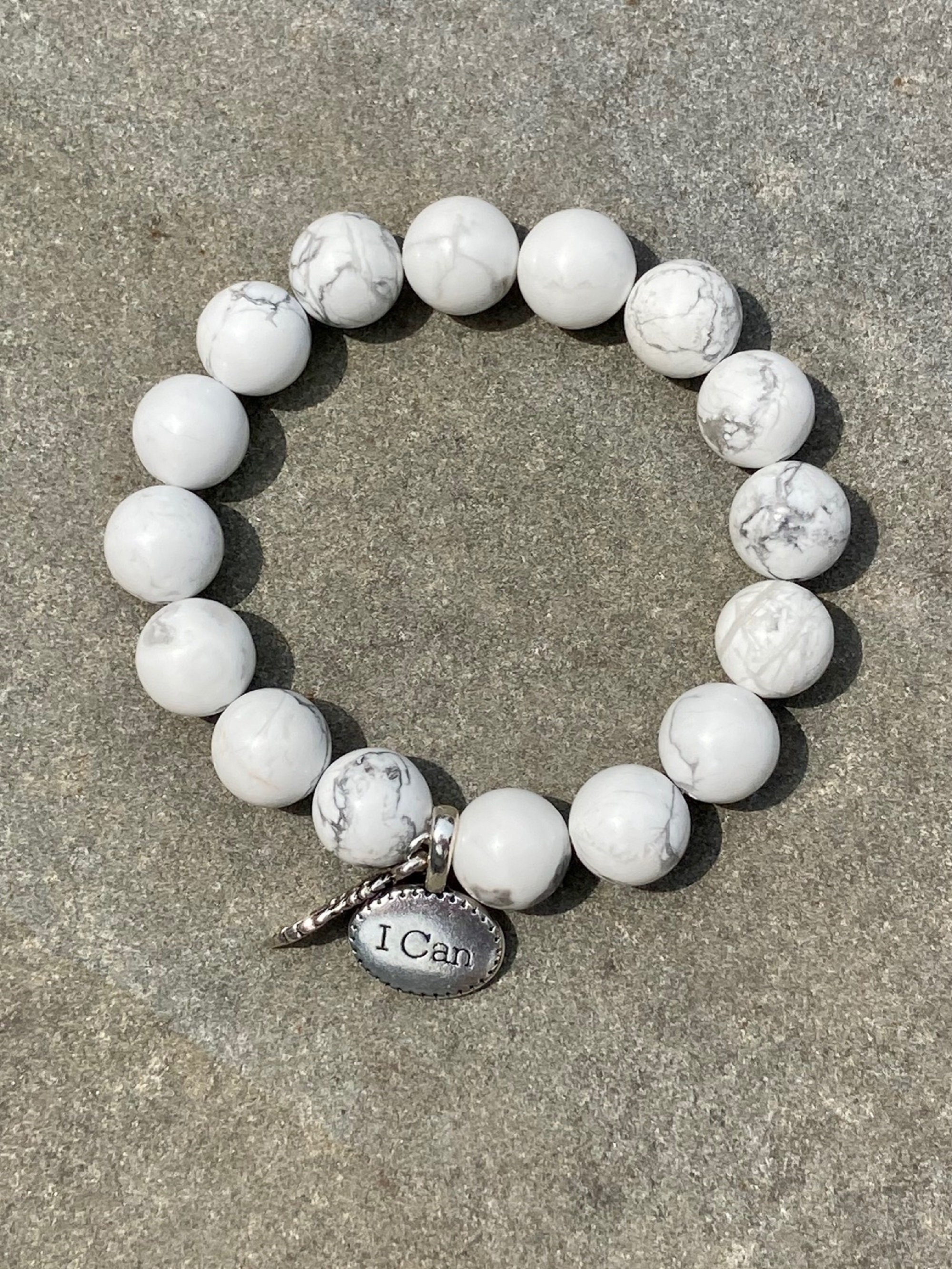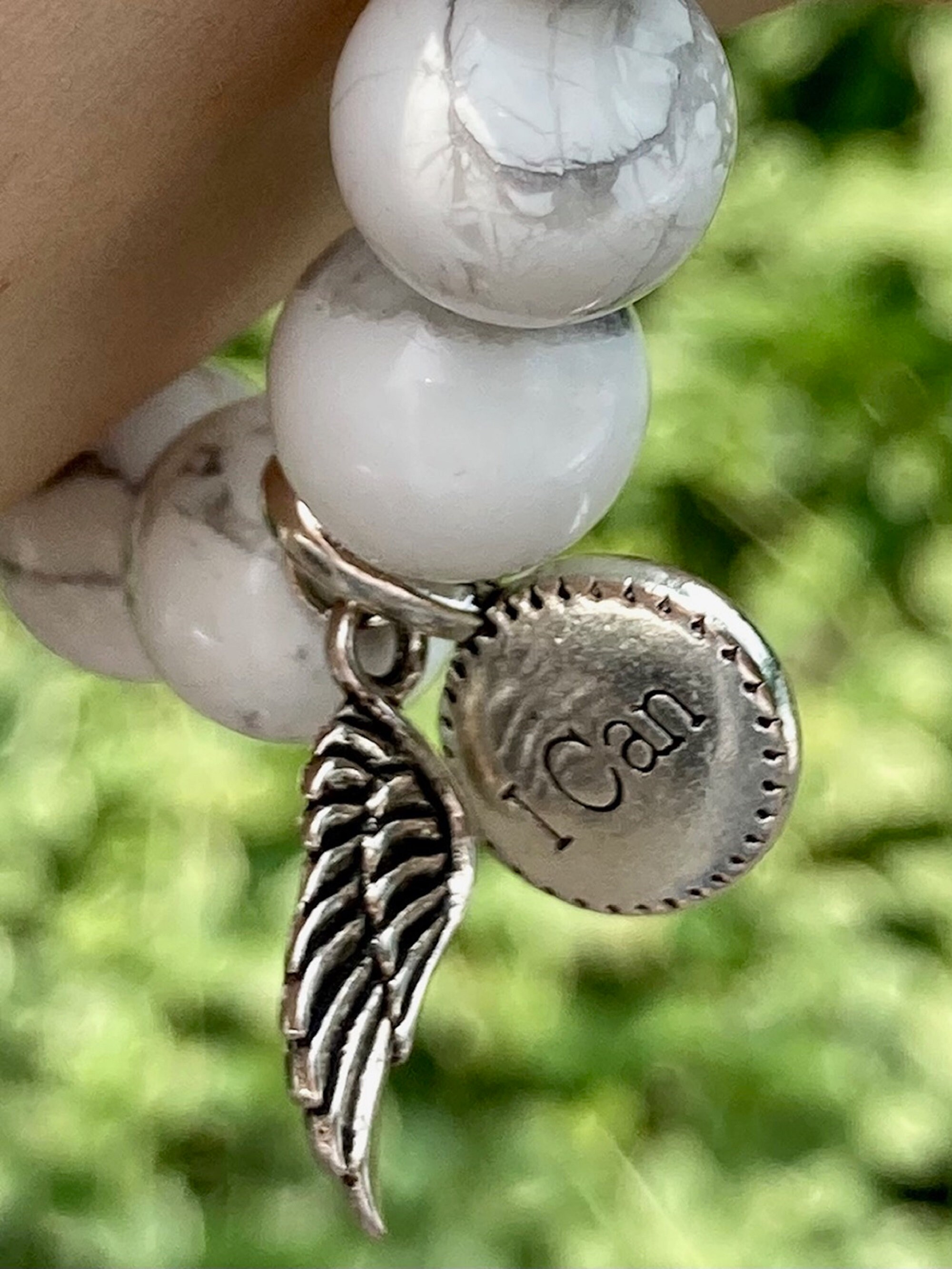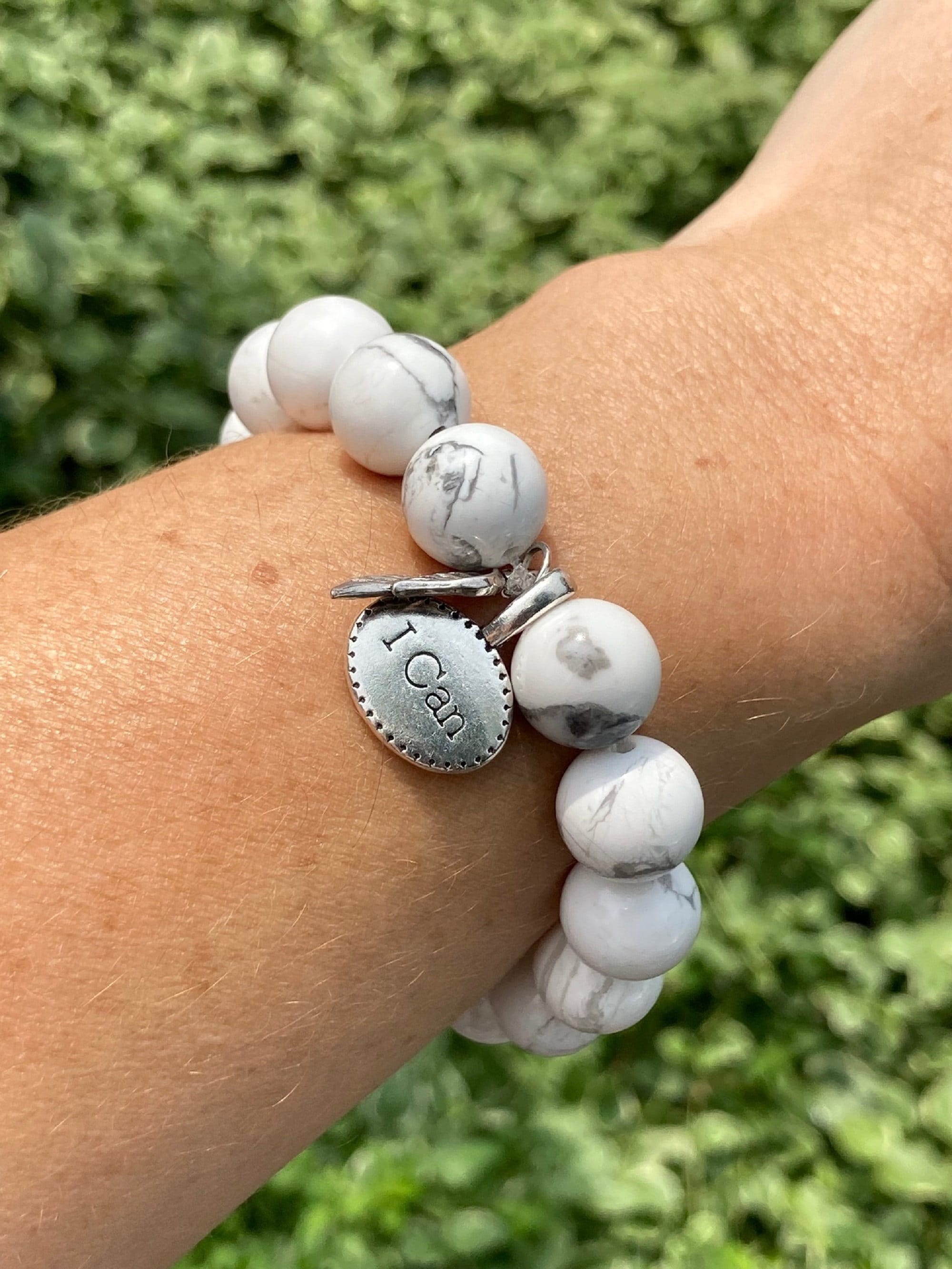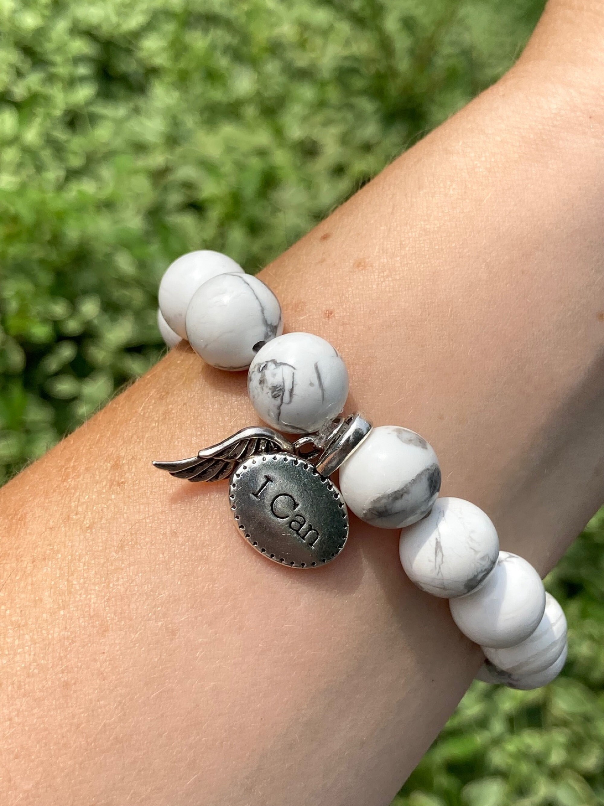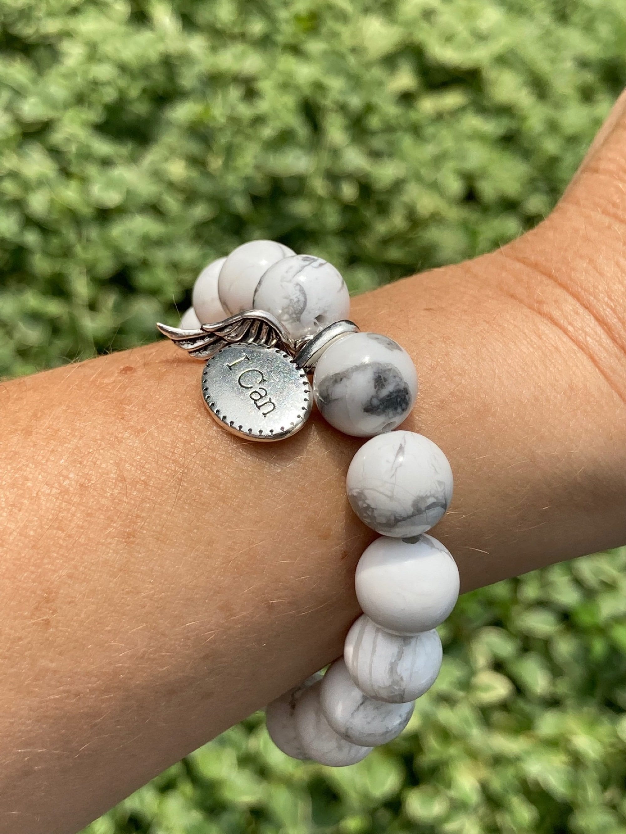 This is a chunky White Howlite Gemstone beaded stretch bracelet. This stunning bracelet is divine eye candy. The high quality beads are shiny and gorgeous. Each bracelet has two silver charms, a detailed angel wing charm and an inspirational word charm "I Can."
