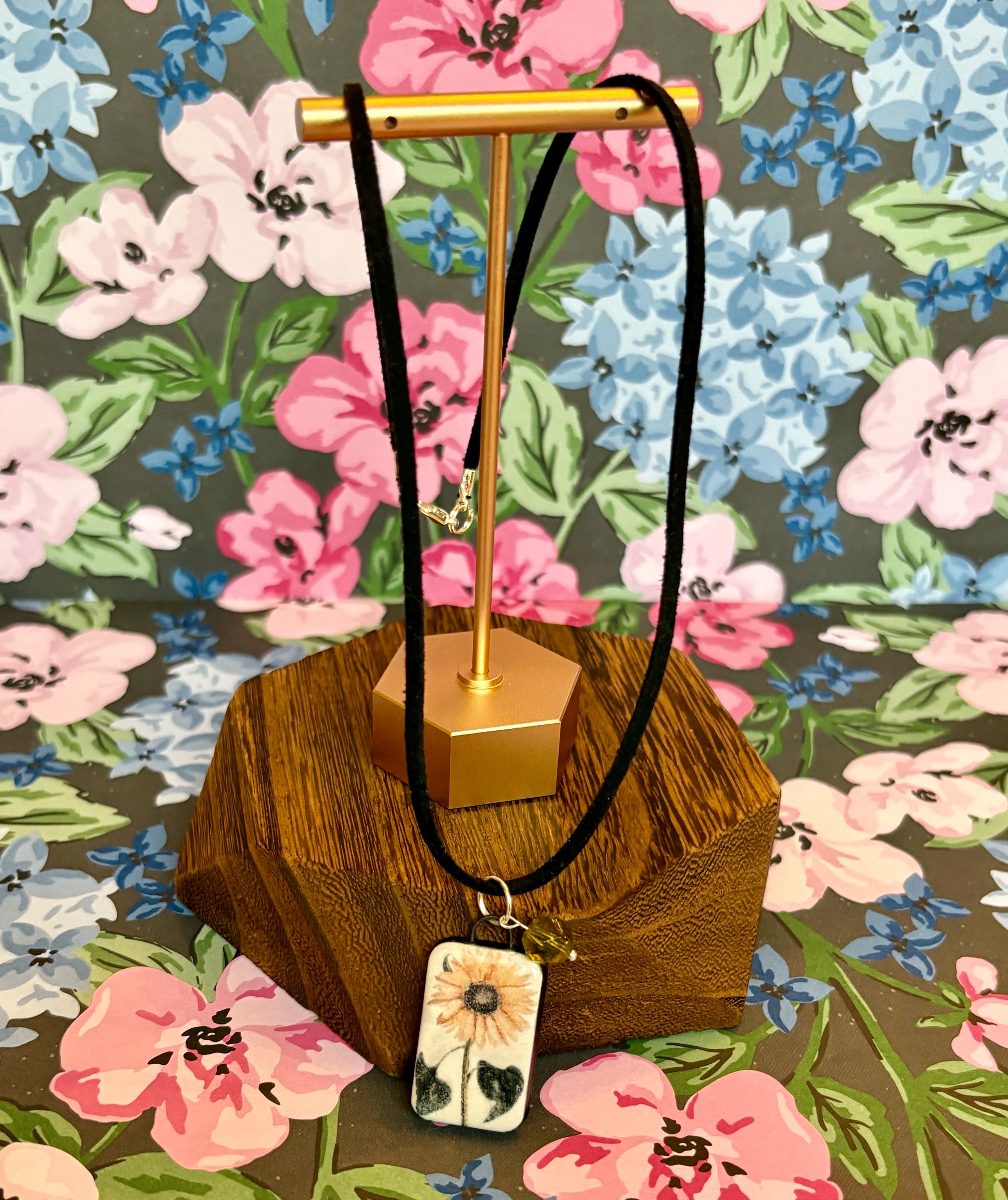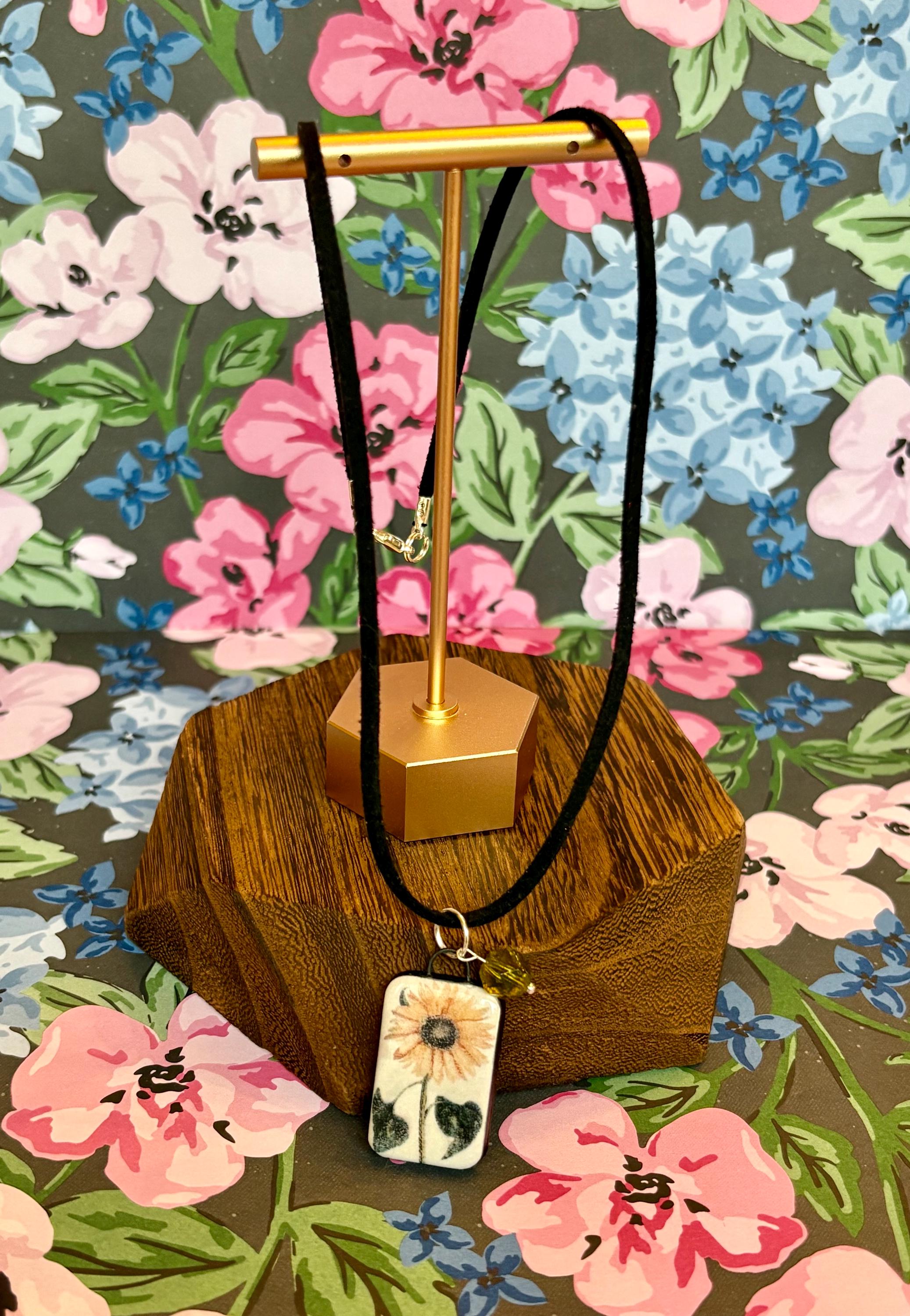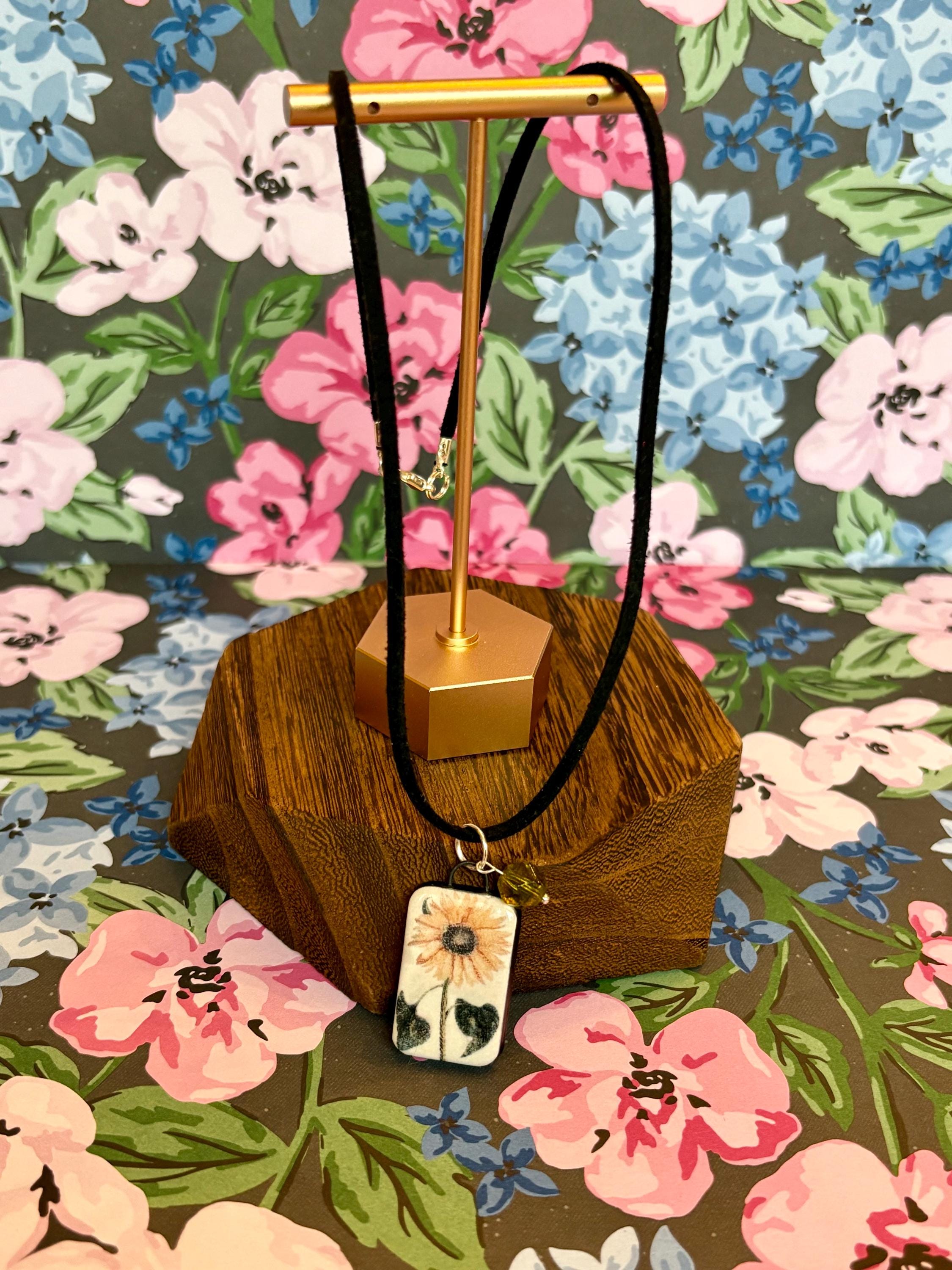 Enchanted Sunflower Serenity Necklace – Handmade Ceramic Sunflower Pendant with Peridot Gemstone on Black Suede Cord | 18” Adjustable Necklace