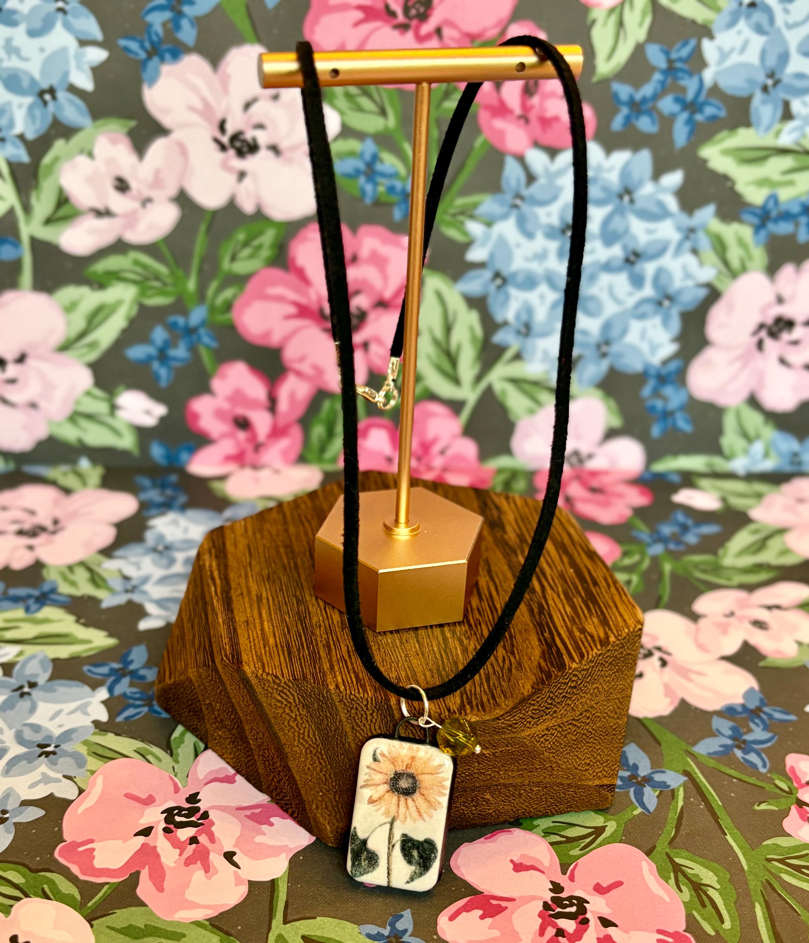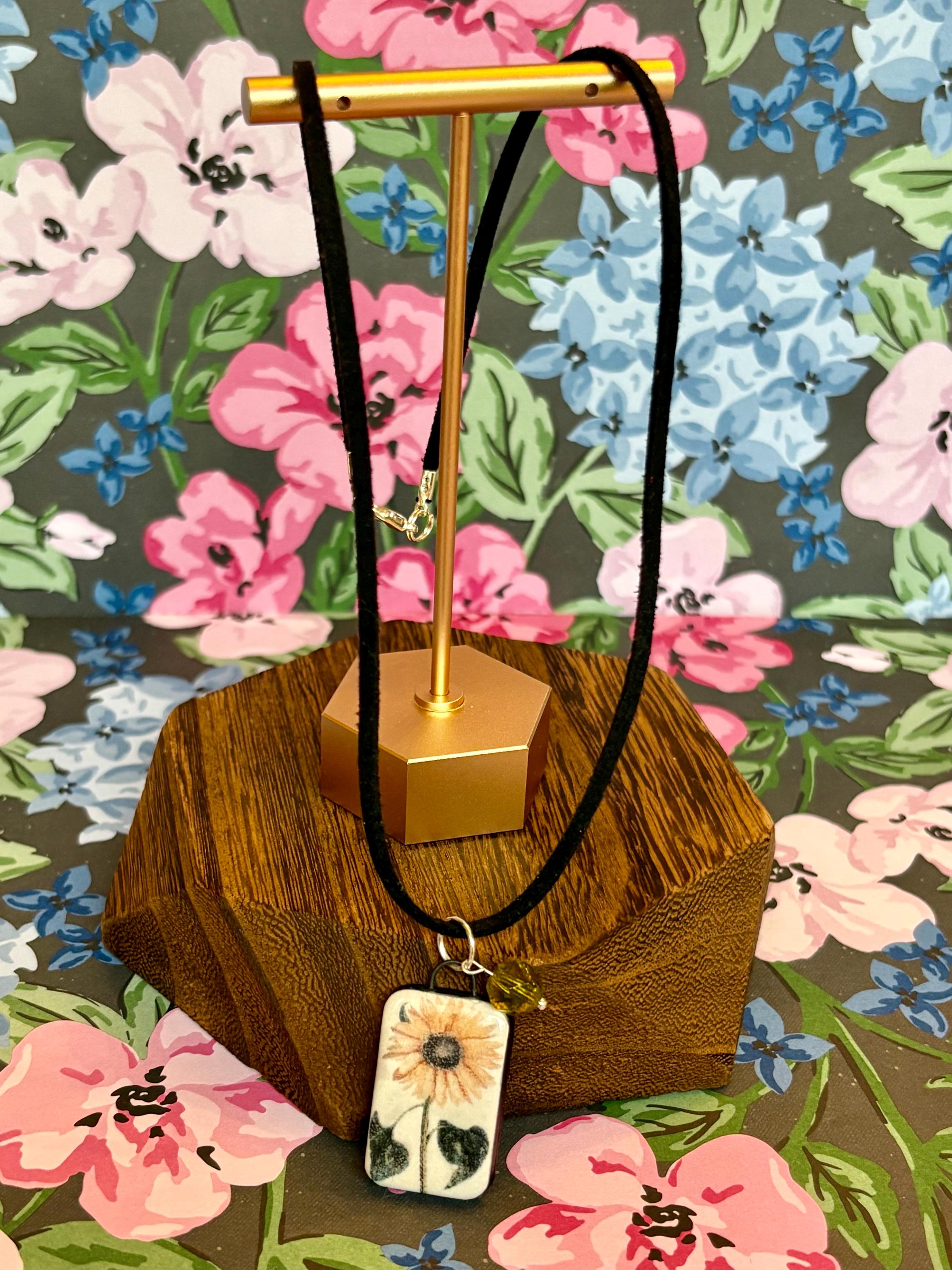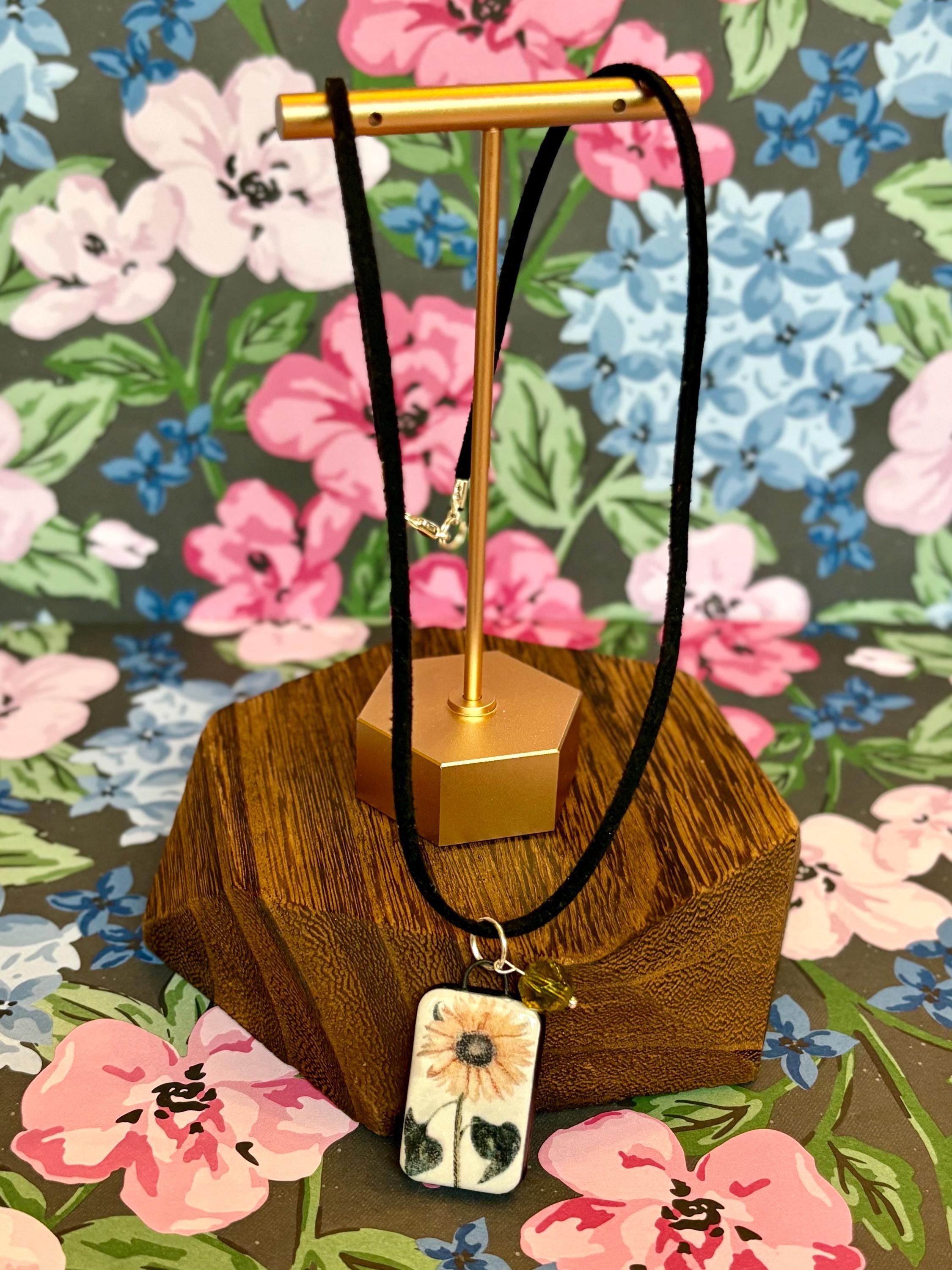 Enchanted Sunflower Serenity Necklace – Handmade Ceramic Sunflower Pendant with Peridot Gemstone on Black Suede Cord | 18” Adjustable Necklace