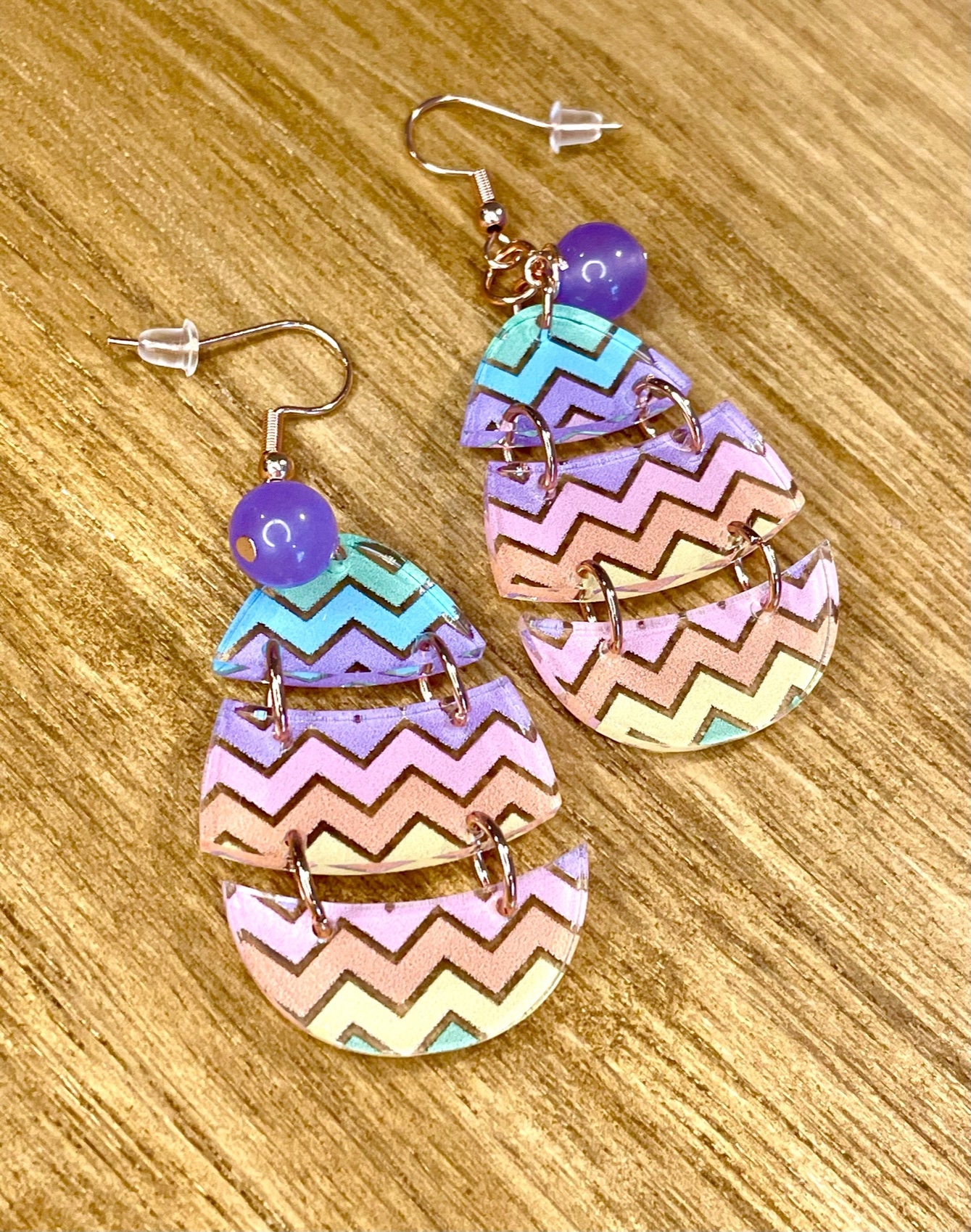 These are handmade, Gemstone hook earrings, with beautiful Jade Gemstones (choice of purple or orange) and chevron pastel rainbow print, acrylic Easter egg pendants, measuring 1.5 inches. The ear wires are hypoallergenic, surgical 316L, rose gold tone, stainless steel, French hook ear wires with a decorative ball and coil accent. Make them yours!