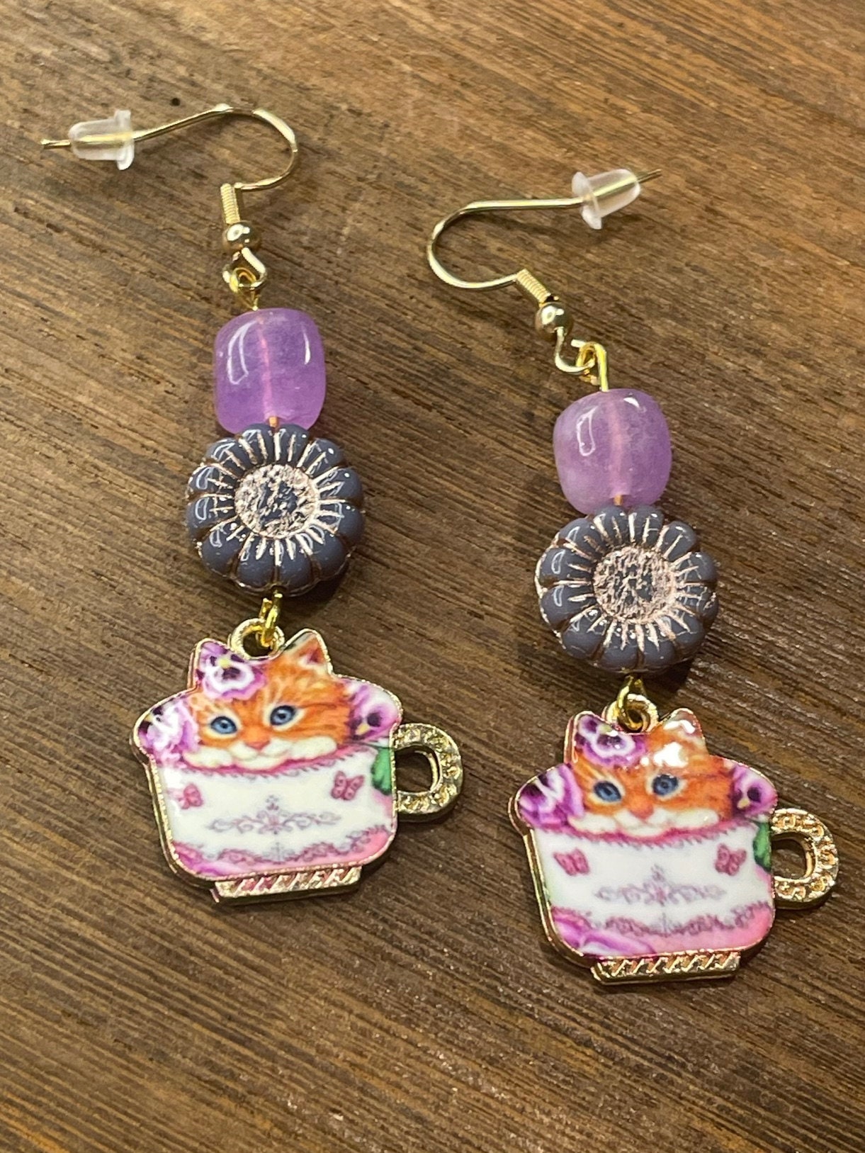 These are handmade, Gemstone hook earrings, with beautiful purple Tourmaline Gemstone cubes, Czech Glass sunflower beads in opaque purple with platinum wash, and cute enamel orange kittens in a tea cup charm, measuring 2.25 inches. The ear wires are hypoallergenic, surgical 316L, gold tone, stainless steel, French hook ear wires with a decorative ball and coil accent. Make them yours!