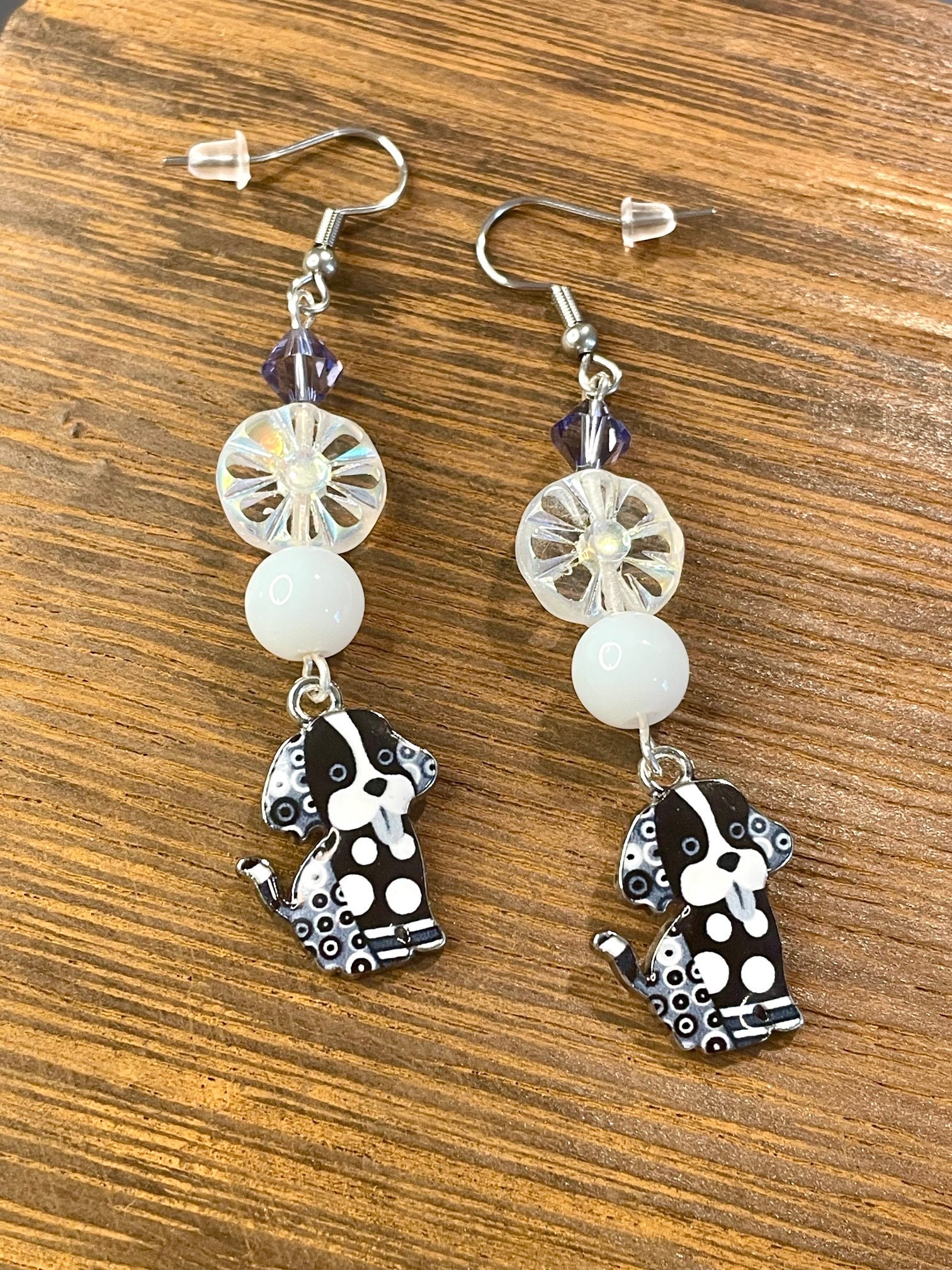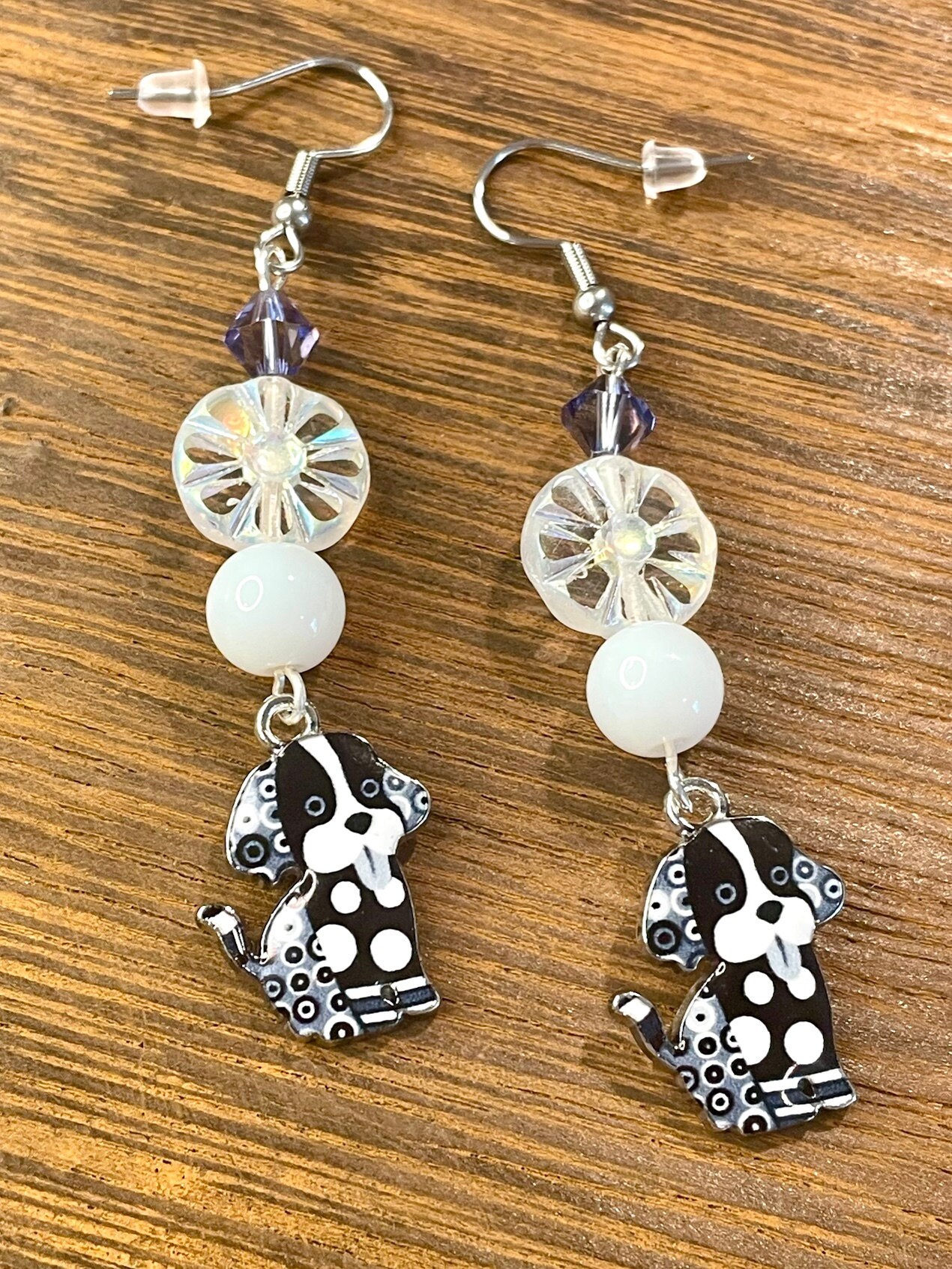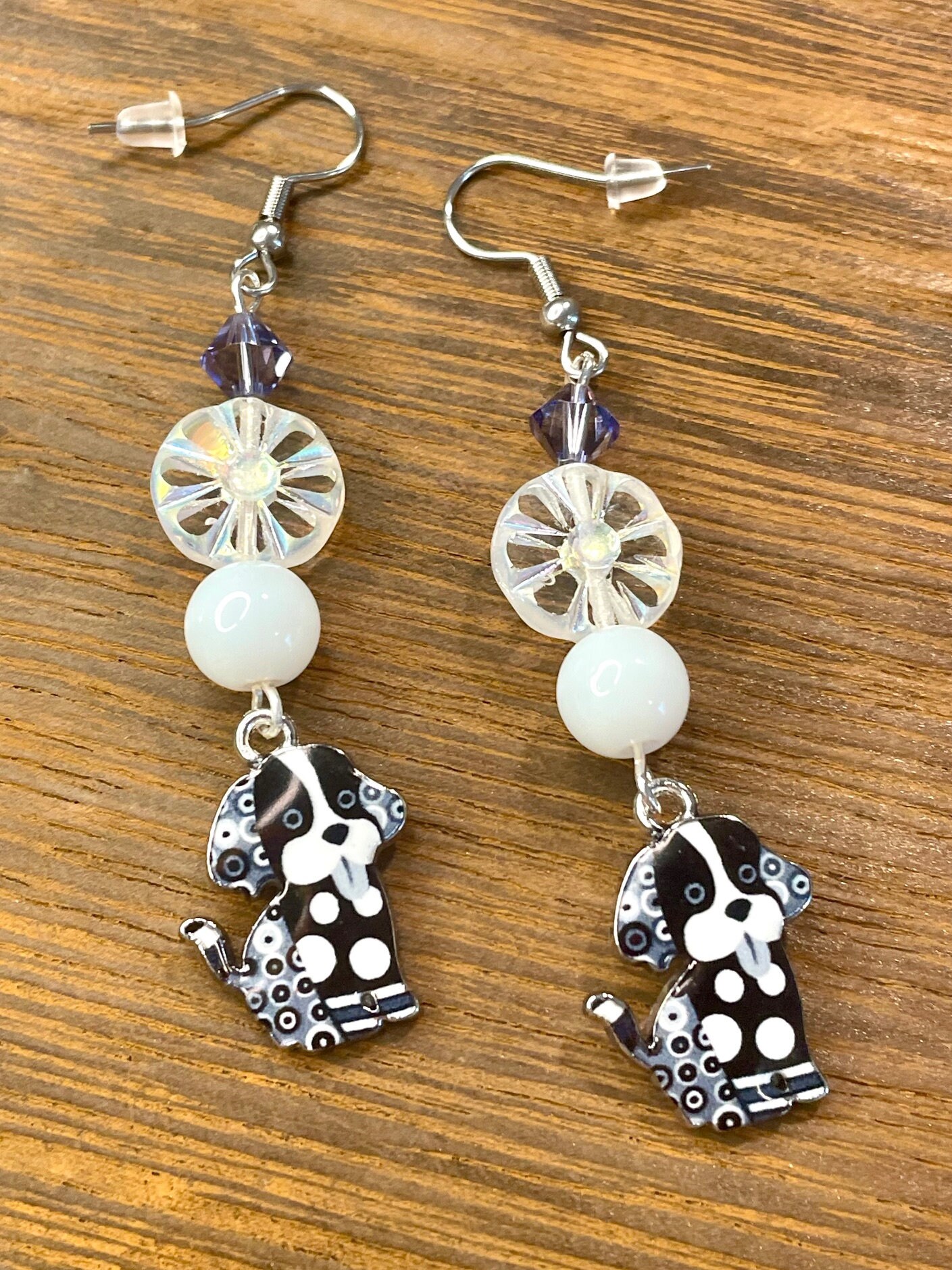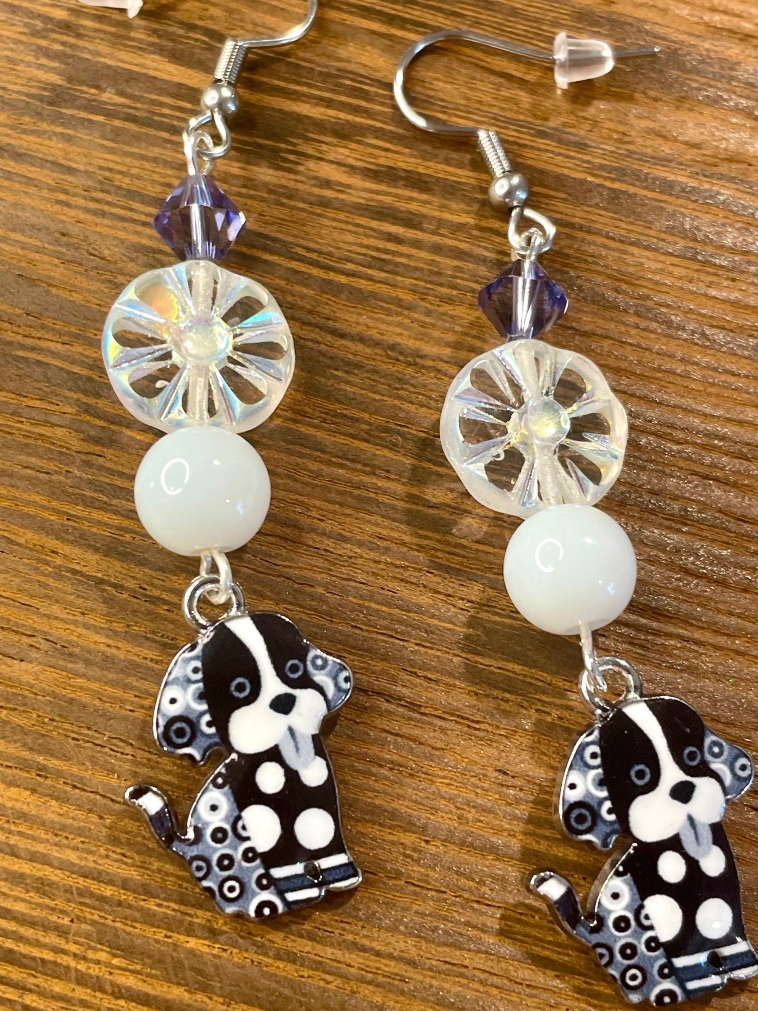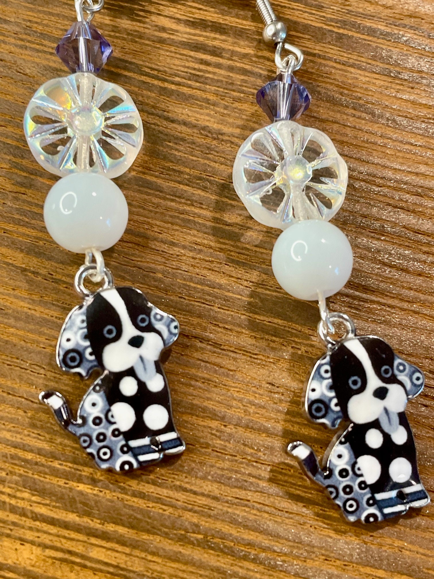 These are handmade, Gemstone earrings, with beautiful, white Jade Gemstones, Czech Glass coin beads in transparent white with AB finish, purple Swarovski bicone crystal beads, and decorative and black/white, enamel, puppy pendants, measuring 2.5 inches. The ear wires are hypoallergenic, surgical 316L, silver tone, stainless steel, French hook ear wires with a decorative ball and coil accent. Make them yours!