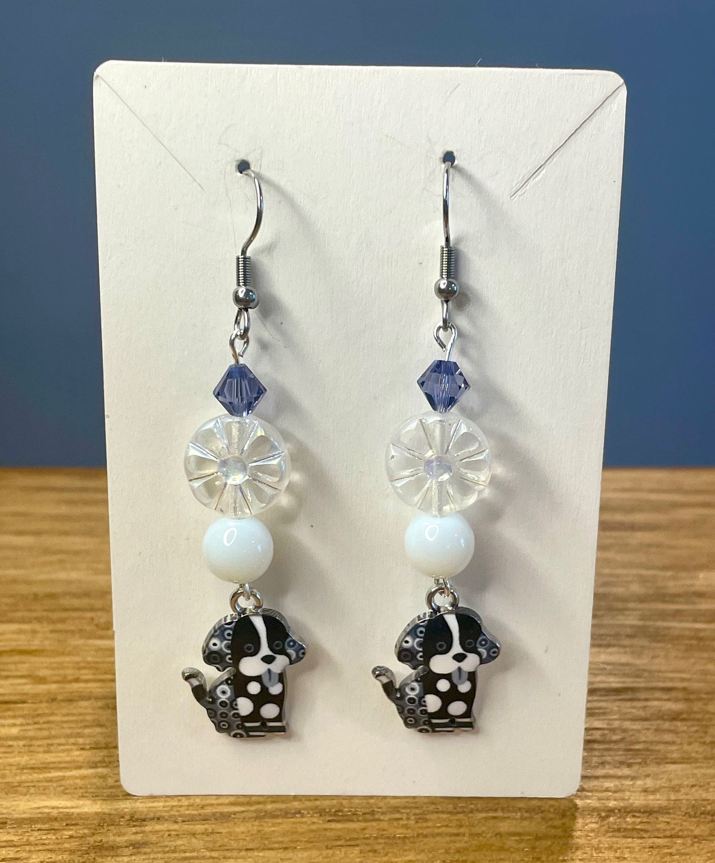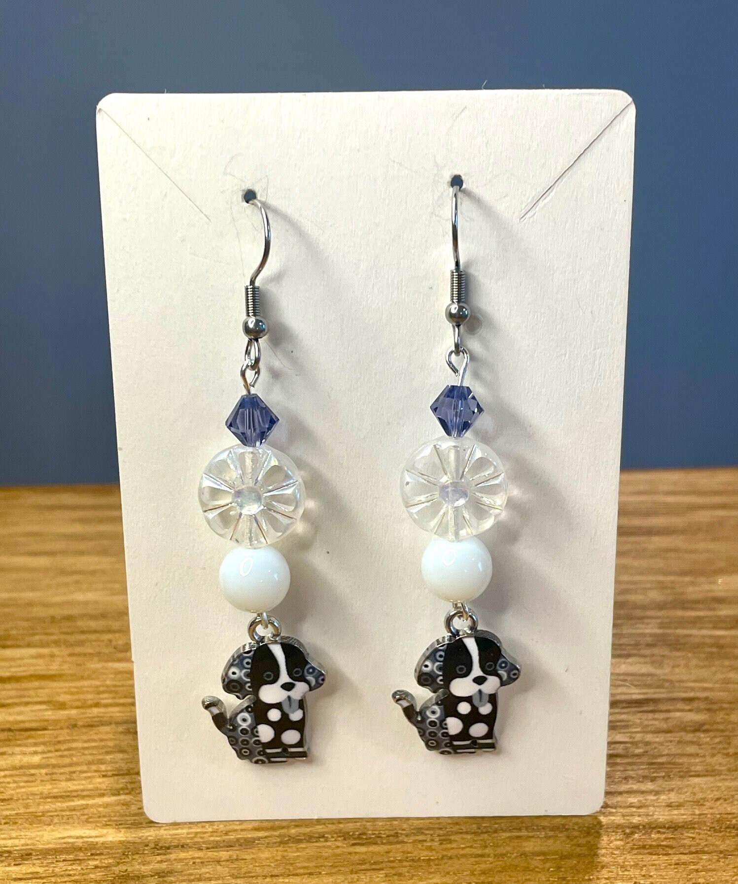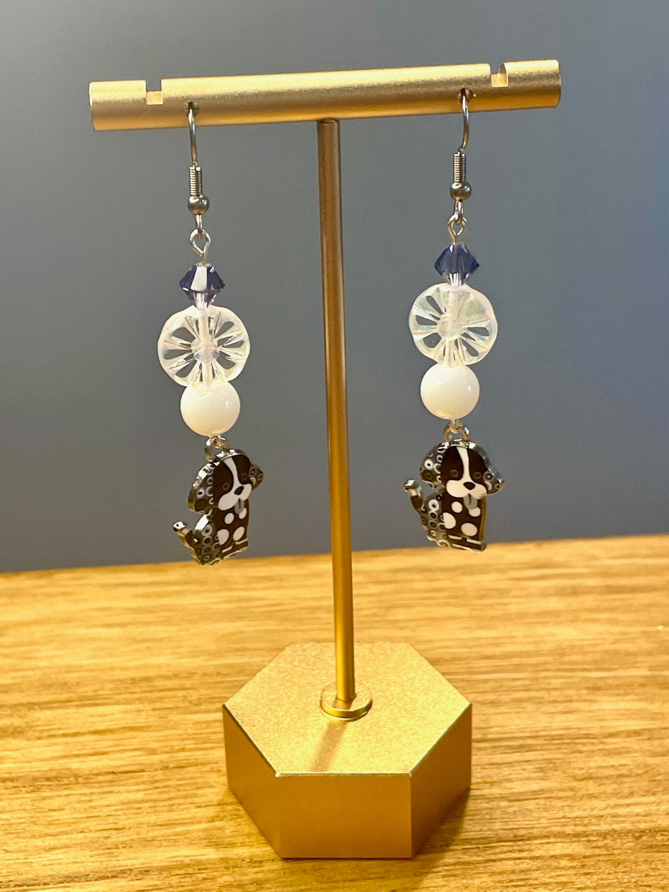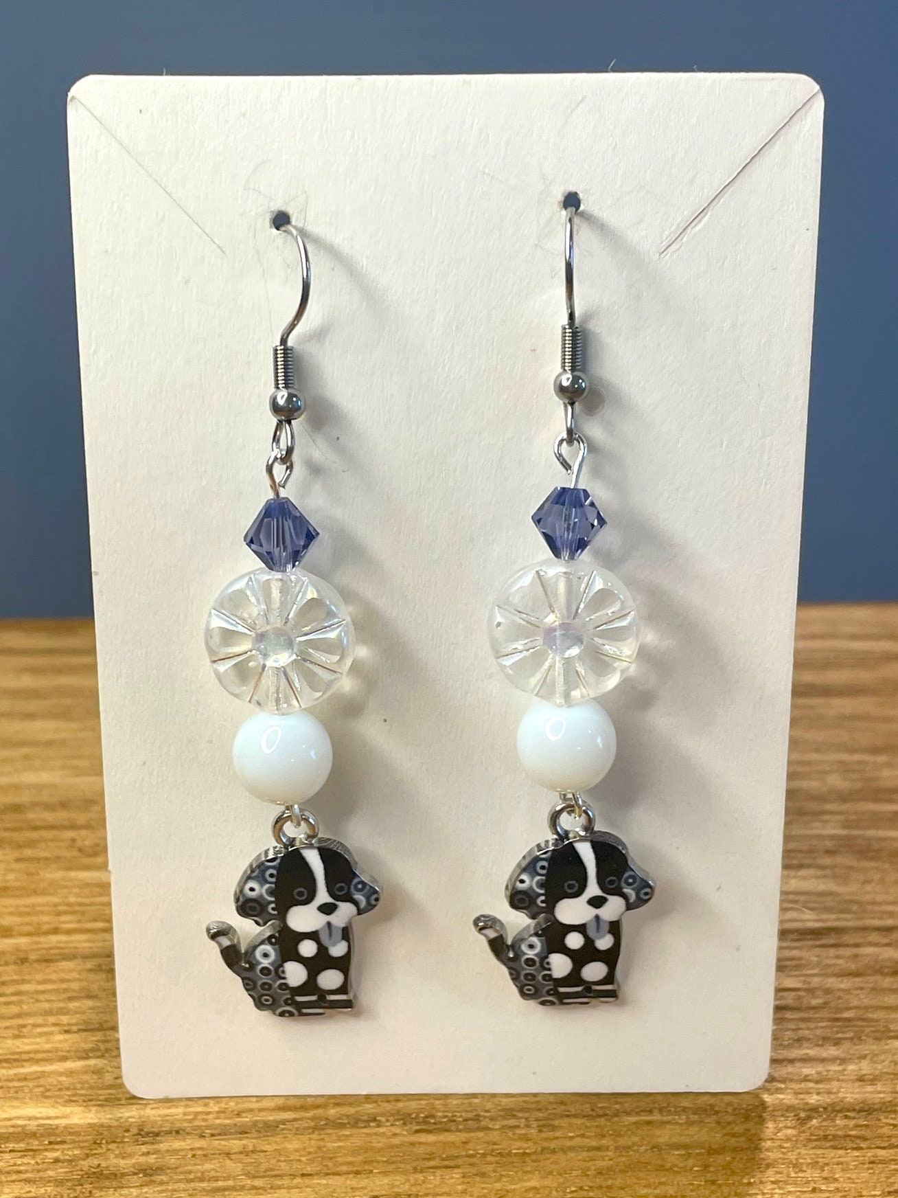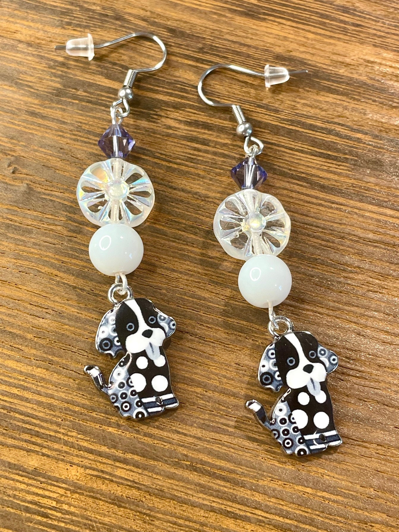 These are handmade, Gemstone earrings, with beautiful, white Jade Gemstones, Czech Glass coin beads in transparent white with AB finish, purple Swarovski bicone crystal beads, and decorative and black/white, enamel, puppy pendants, measuring 2.5 inches. The ear wires are hypoallergenic, surgical 316L, silver tone, stainless steel, French hook ear wires with a decorative ball and coil accent. Make them yours!