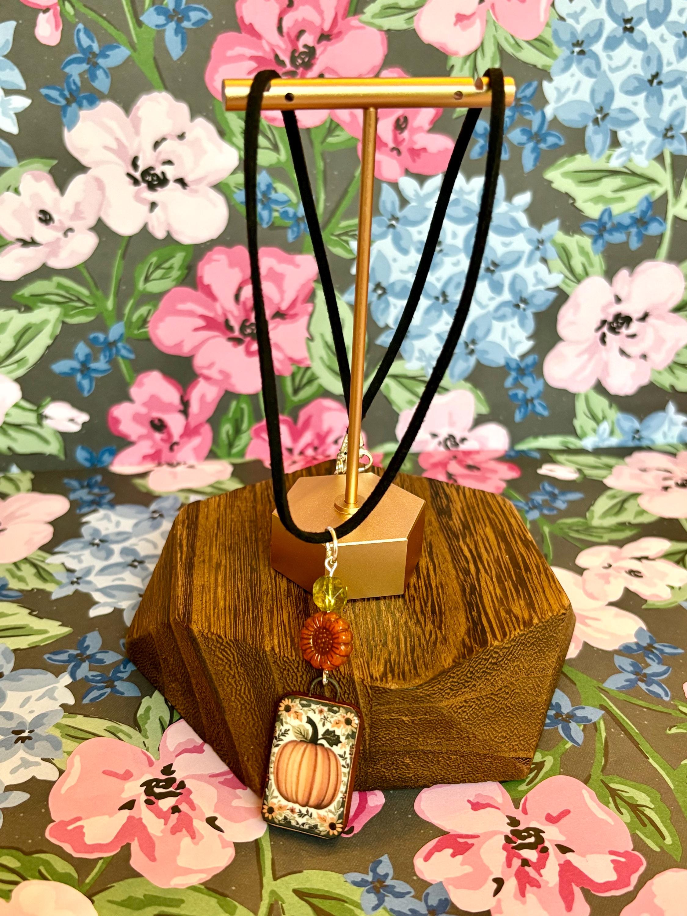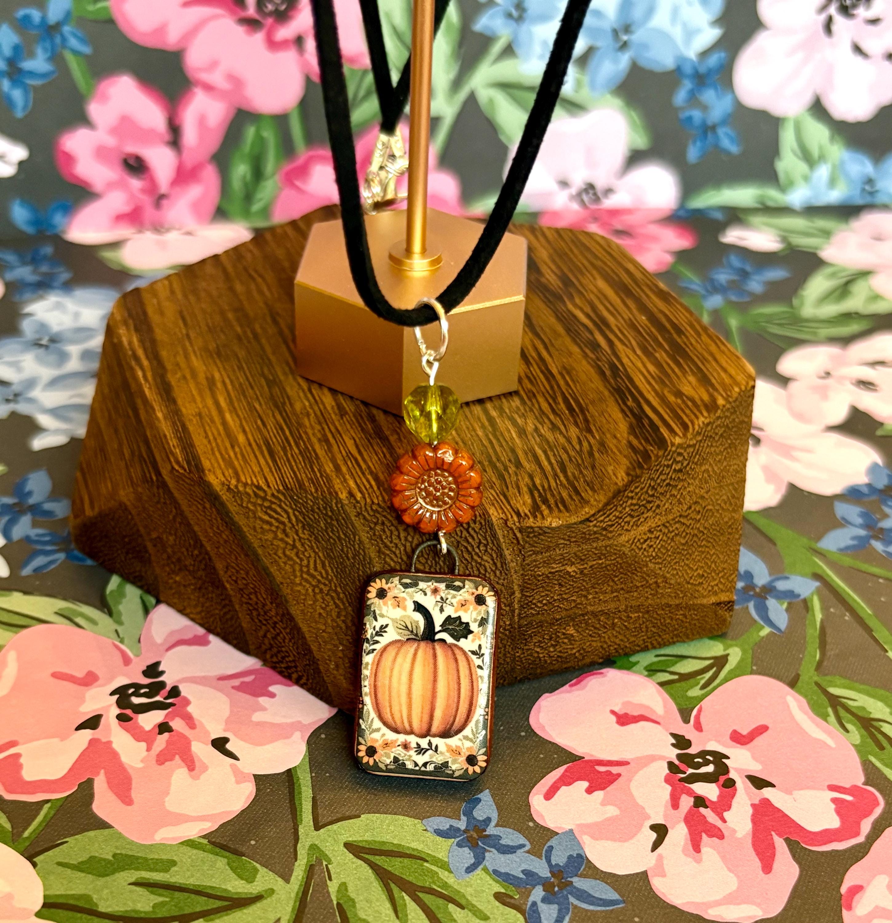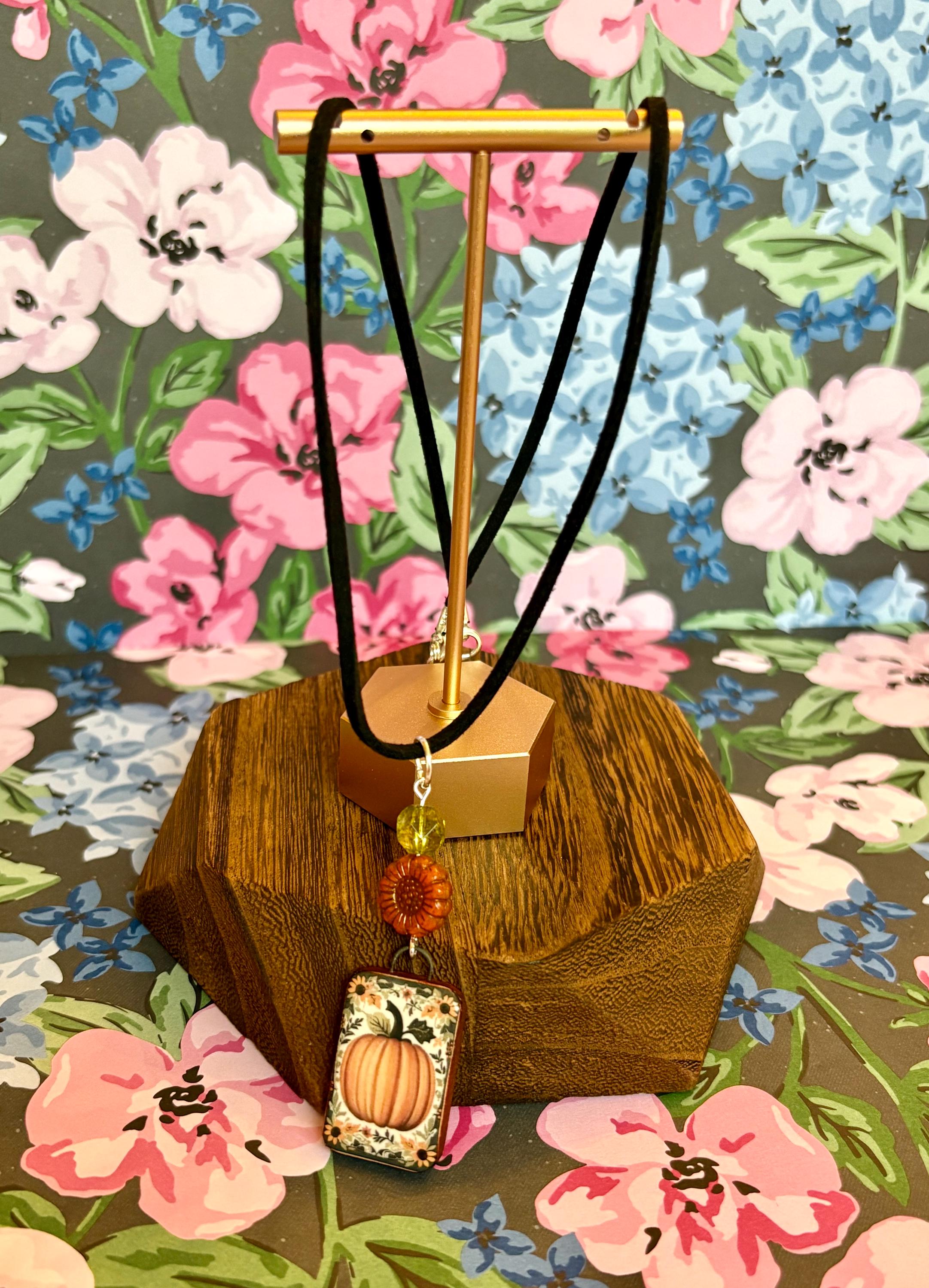 This handmade necklace features a lovely vintage-style pumpkin art pendant framed with delicate floral details, accented by a rich amber Czech glass sunflower and a sparkling Peridot gemstone bead. The pendant hangs from a soft black velvet cord, creating a charming contrast that embodies autumn warmth and earthy elegance.