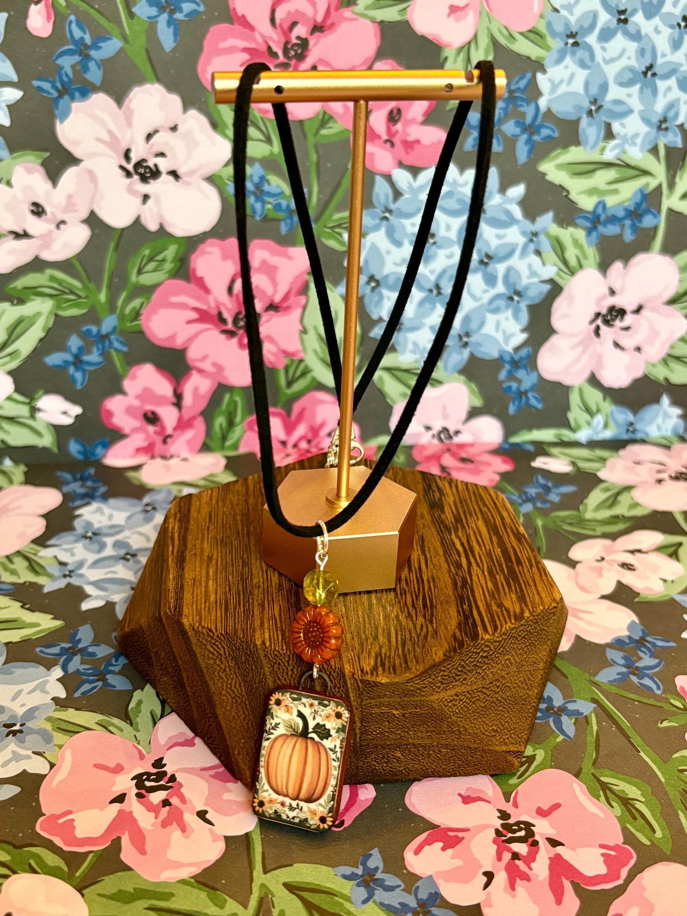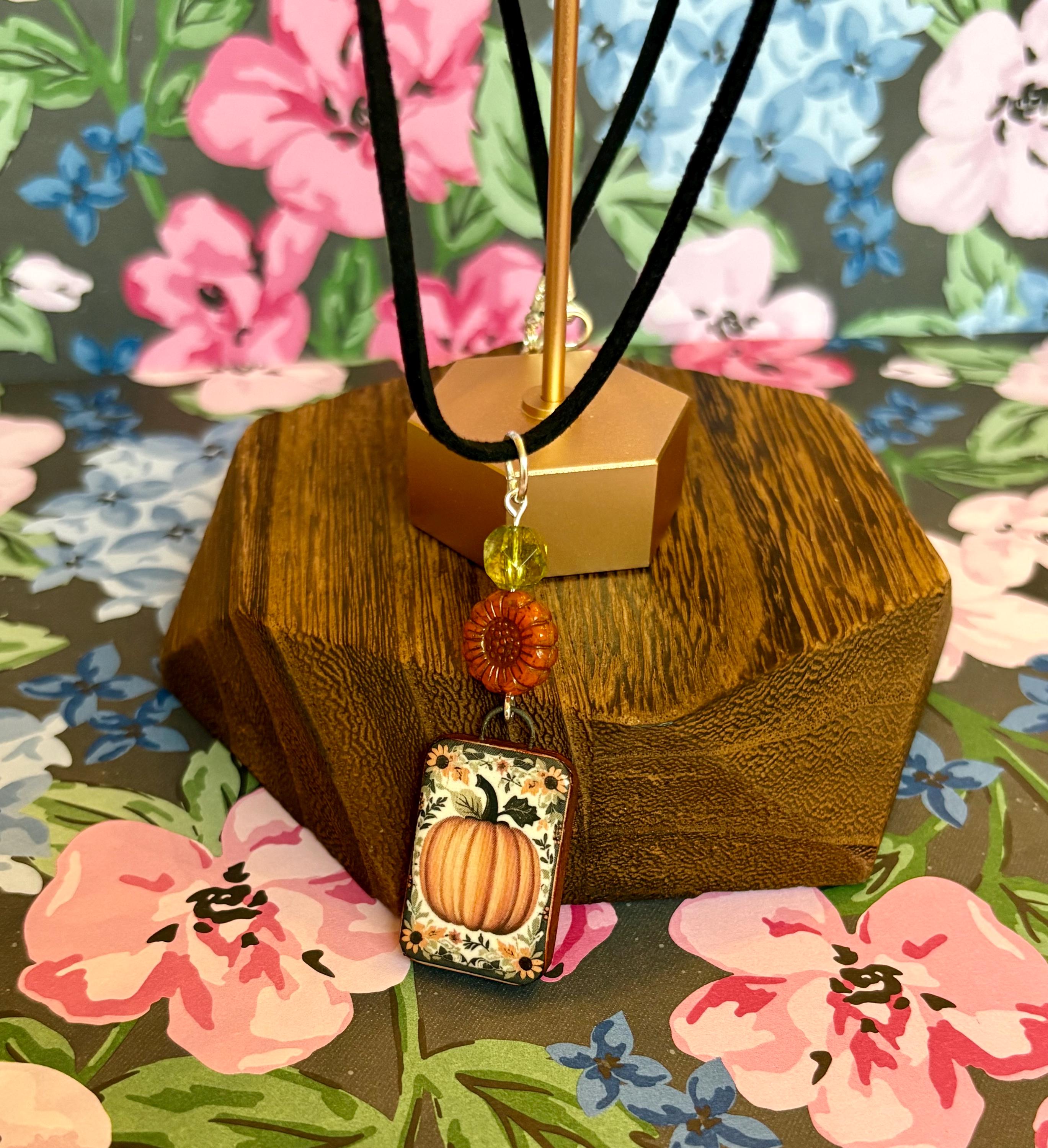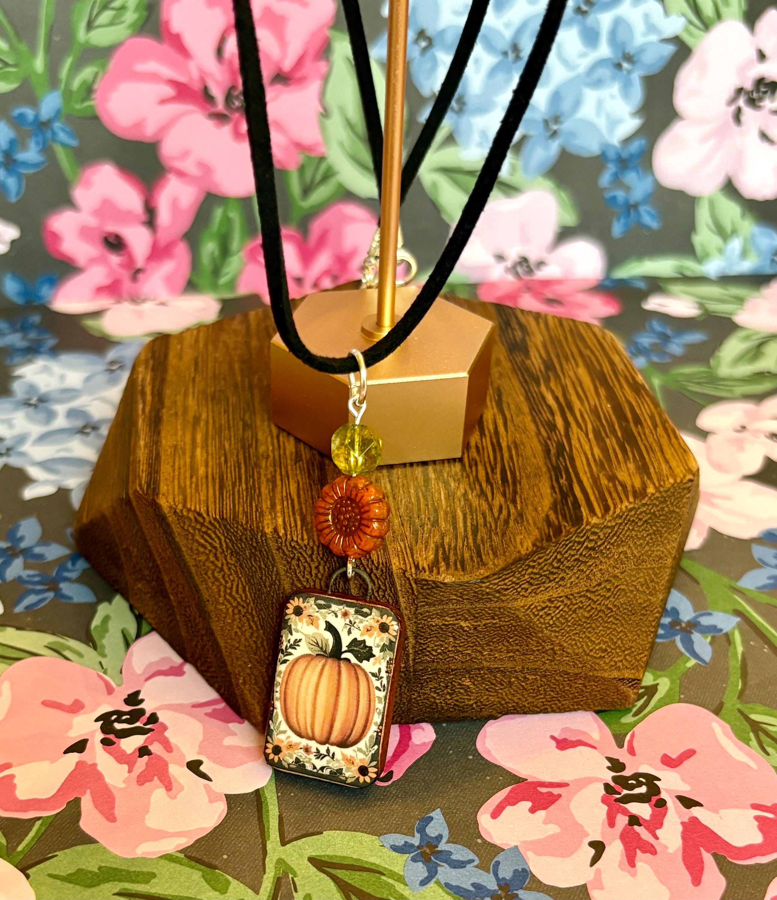 This handmade necklace features a lovely vintage-style pumpkin art pendant framed with delicate floral details, accented by a rich amber Czech glass sunflower and a sparkling Peridot gemstone bead. The pendant hangs from a soft black velvet cord, creating a charming contrast that embodies autumn warmth and earthy elegance.