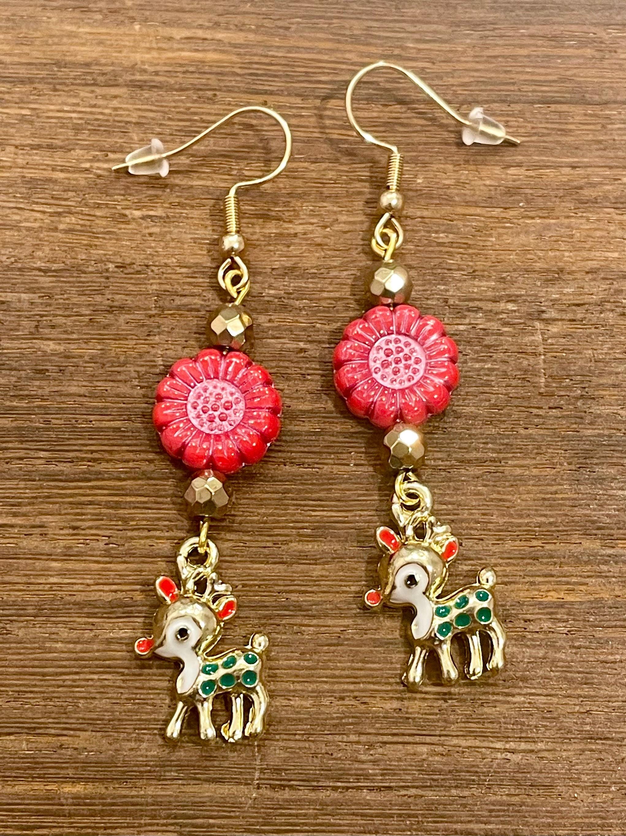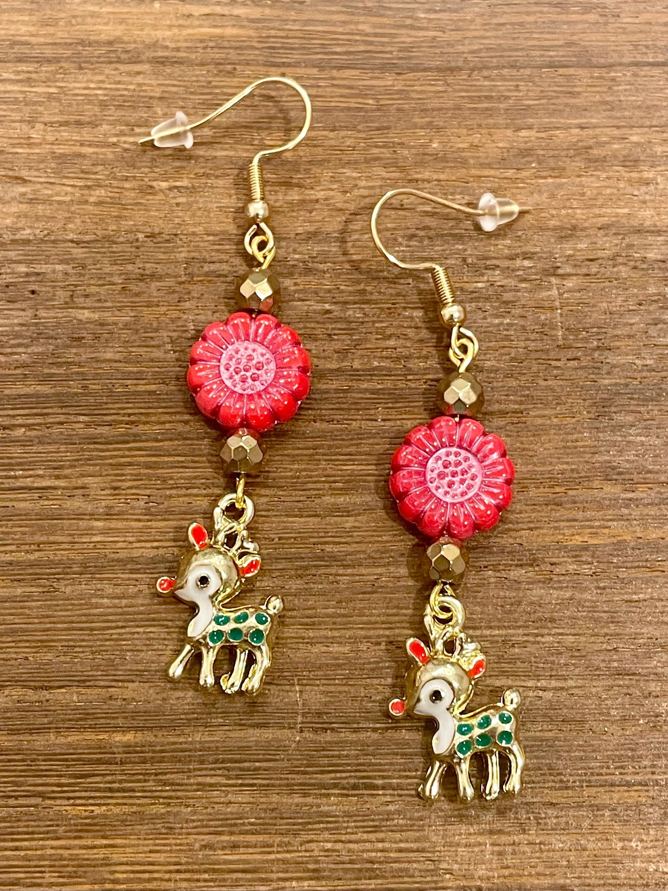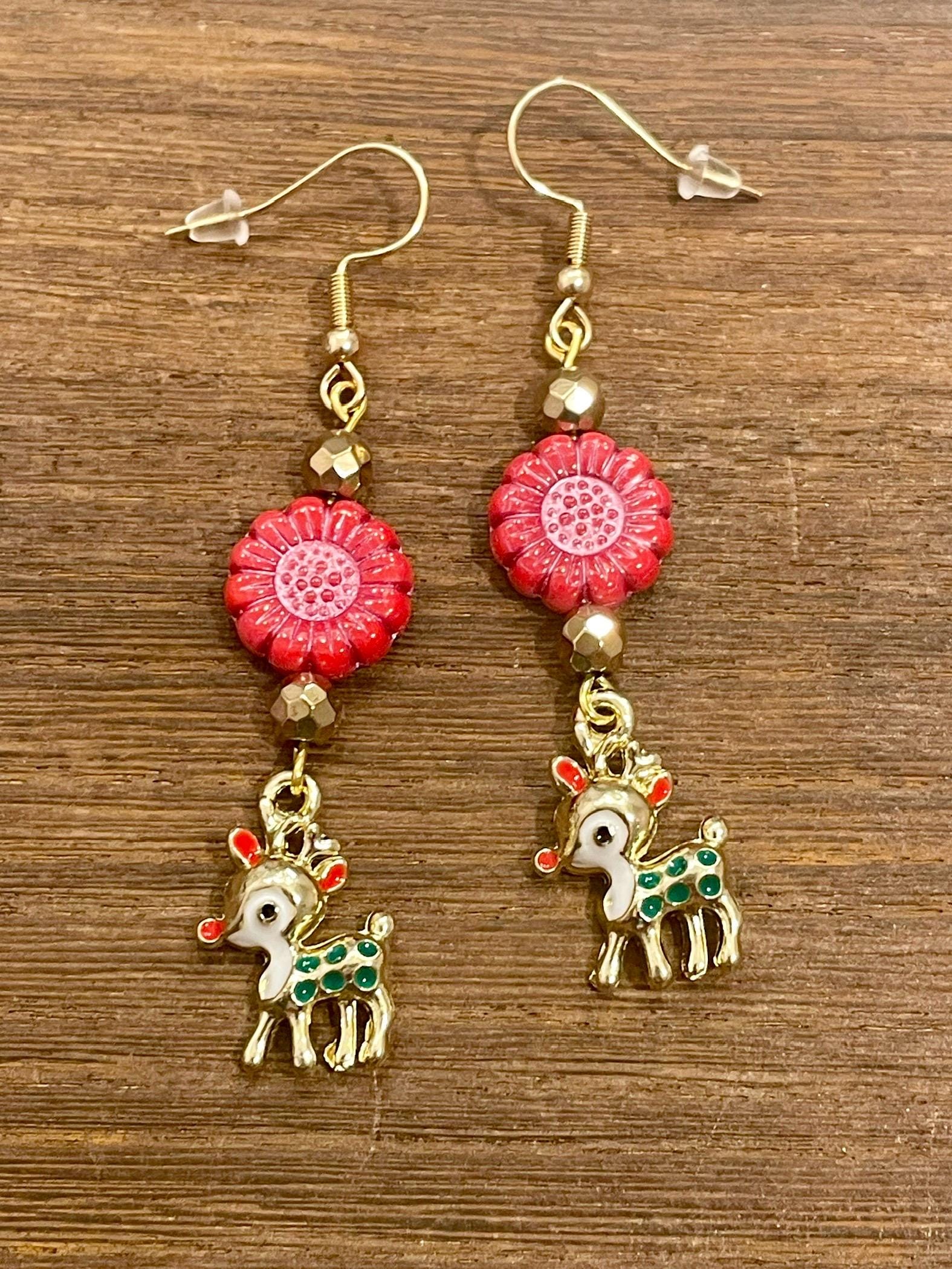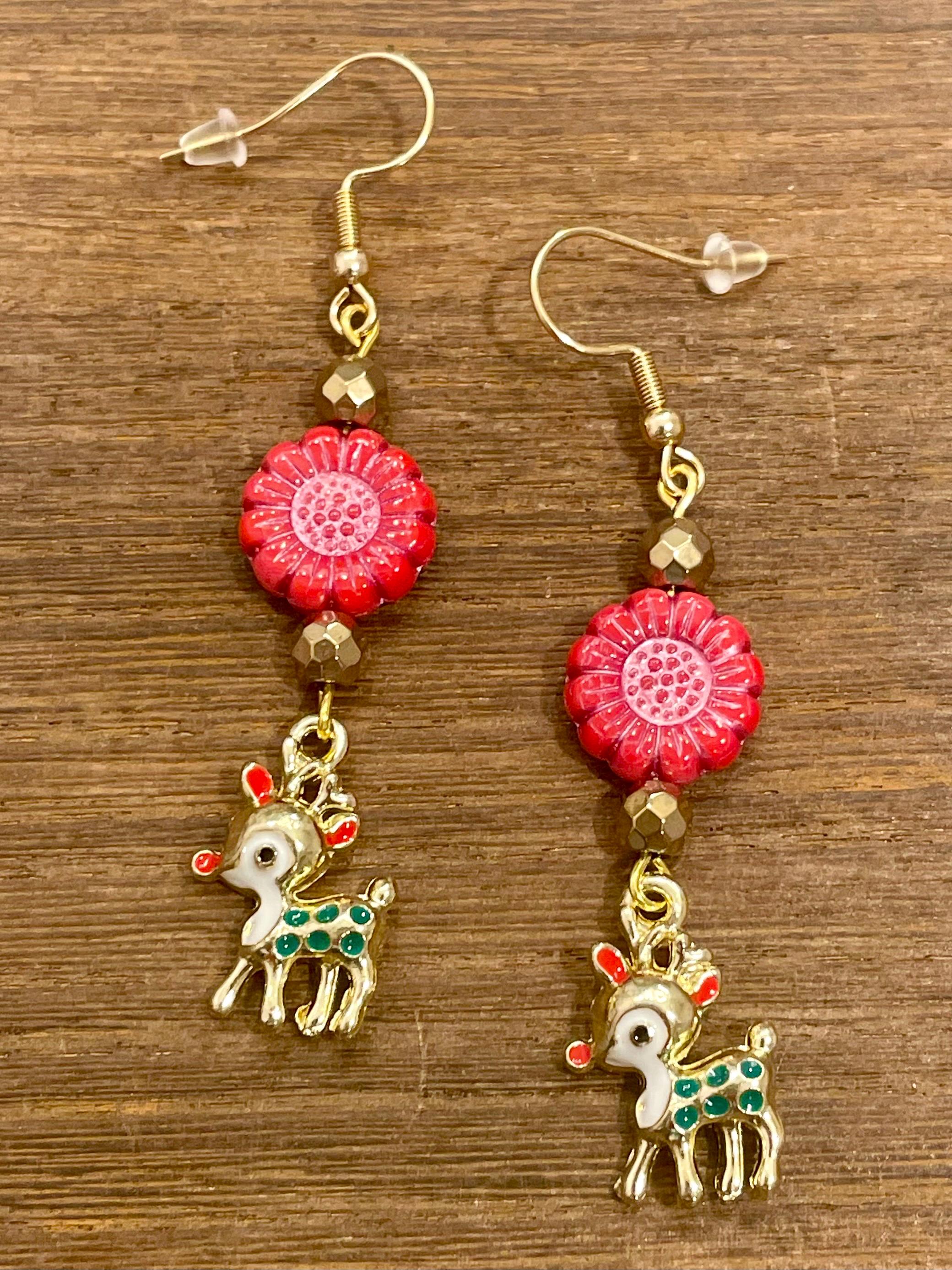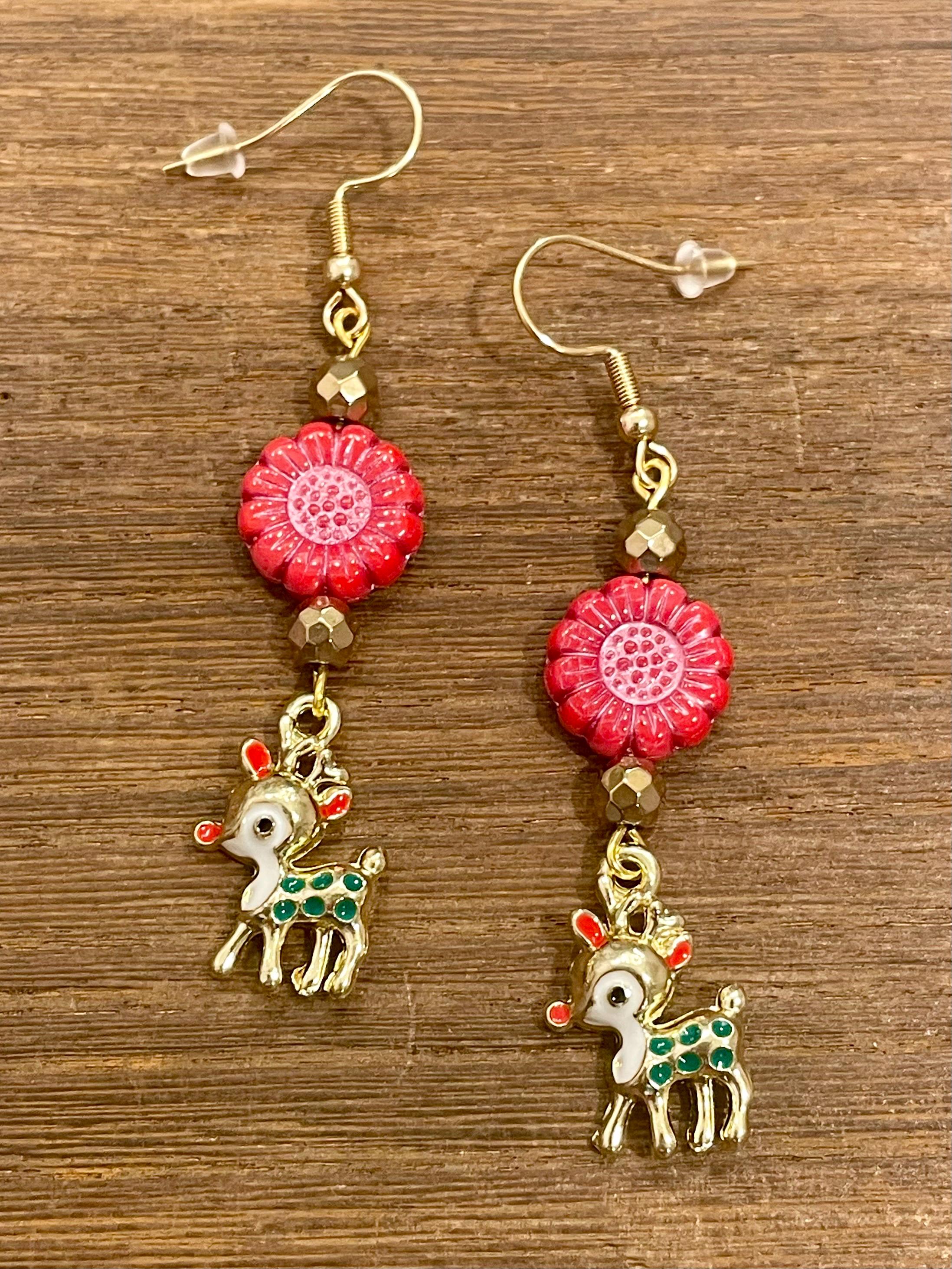 These are handmade, Gemstone earrings, with faceted, 18k gold Hematite Gemstones, Czech Glass sunflower beads in opaque coral red with pink wash, and enamel red nose reindeer charms in gold tone. The ear wires are hypoallergenic, surgical 316L, gold tone, stainless steel, French hook ear wires with a decorative ball and coil accent, measuring 2.5 inches. Make them yours!
