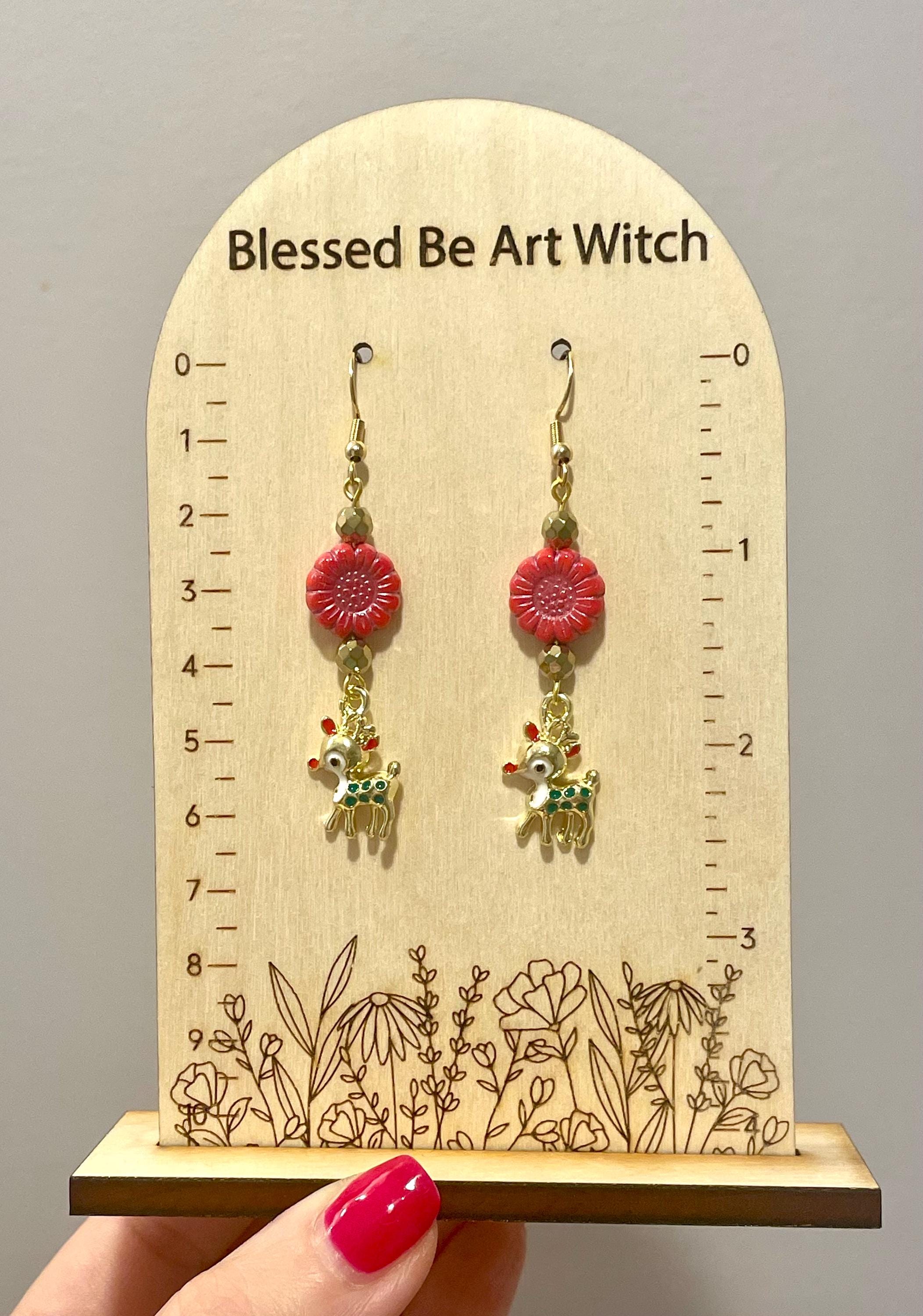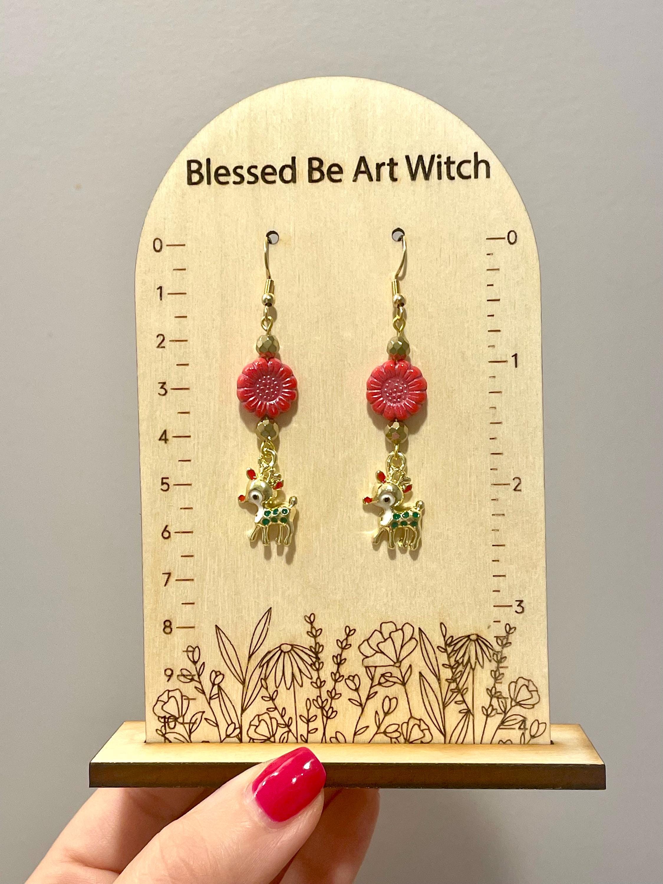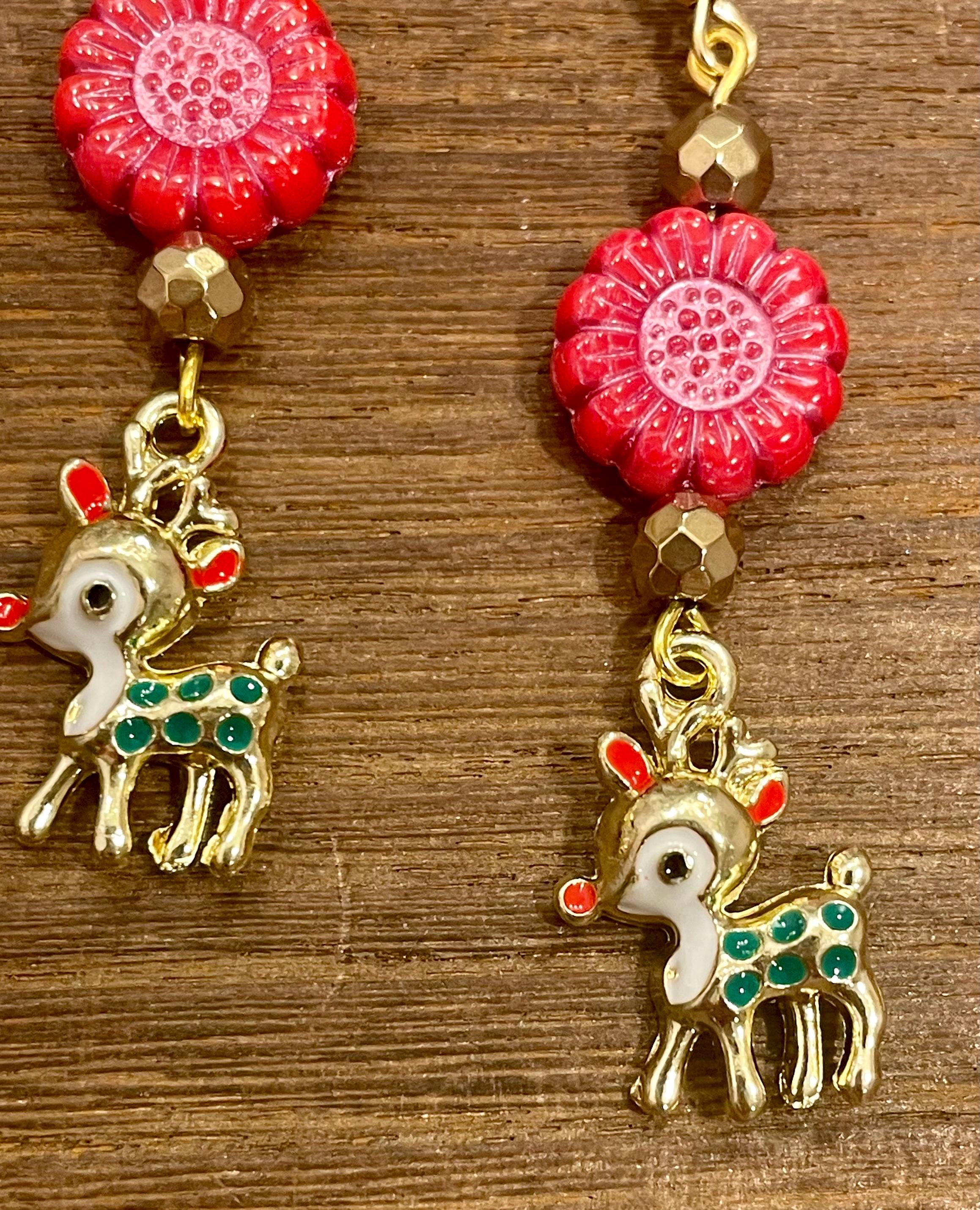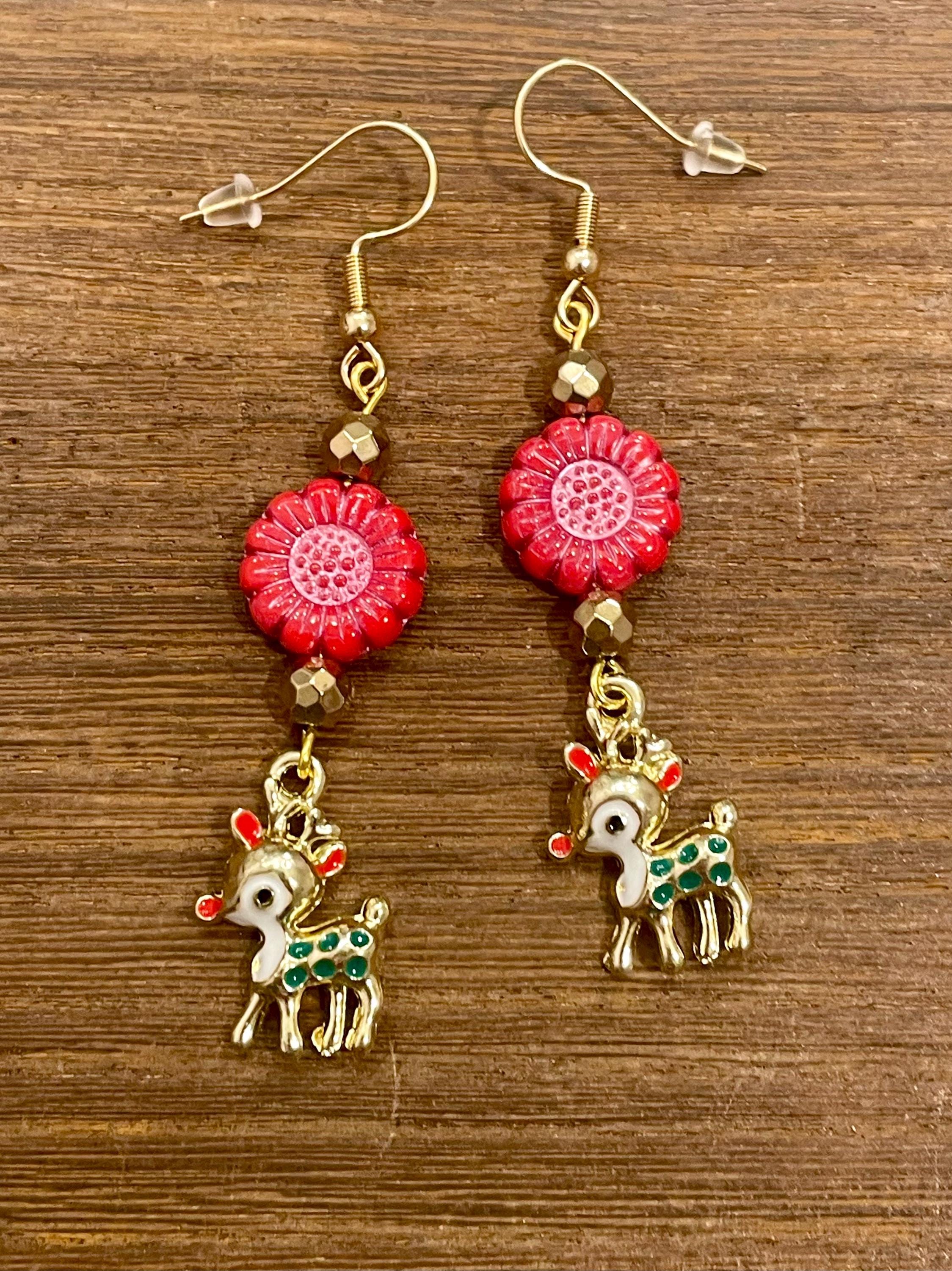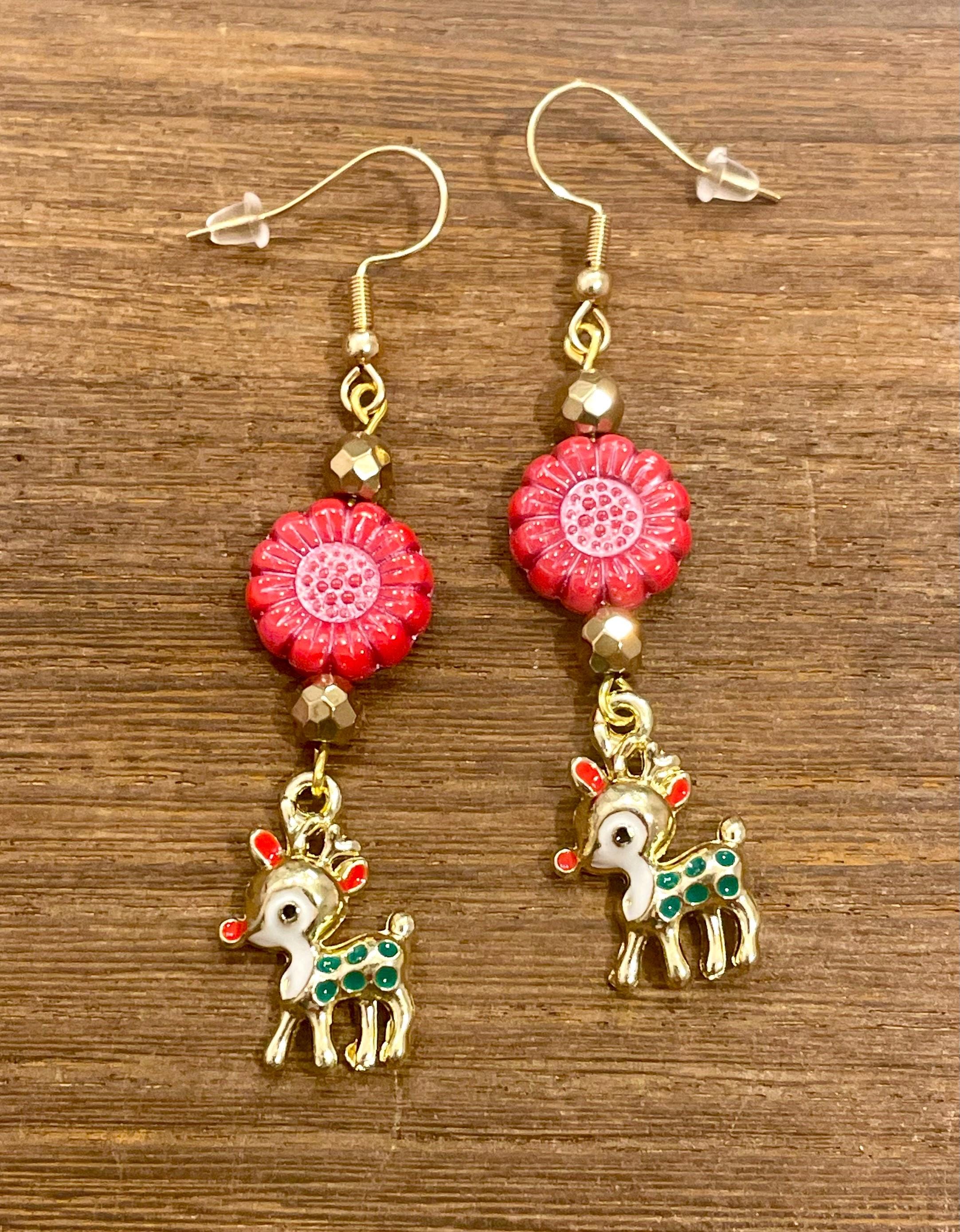 These are handmade, Gemstone earrings, with faceted, 18k gold Hematite Gemstones, Czech Glass sunflower beads in opaque coral red with pink wash, and enamel red nose reindeer charms in gold tone. The ear wires are hypoallergenic, surgical 316L, gold tone, stainless steel, French hook ear wires with a decorative ball and coil accent, measuring 2.5 inches. Make them yours!