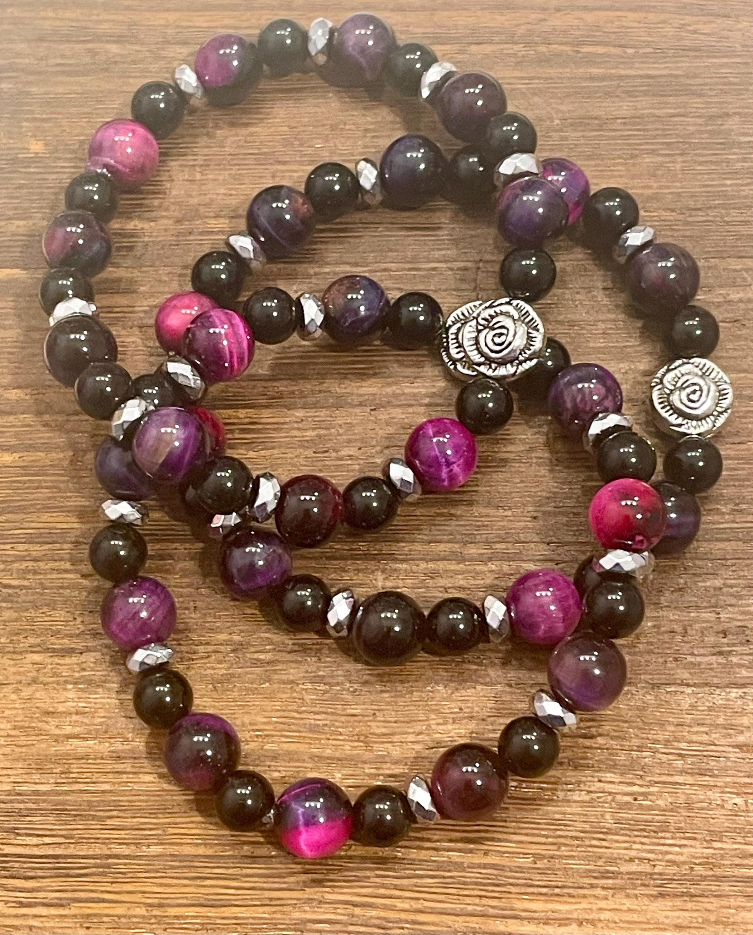 Beautiful purple / raspberry pink Tiger’s Eye gemstone beaded stretch bracelet with faceted, Silver Hematite Gemstones, and Black Obsidian Gemstones! Each bracelet has a silver rose flower charm.