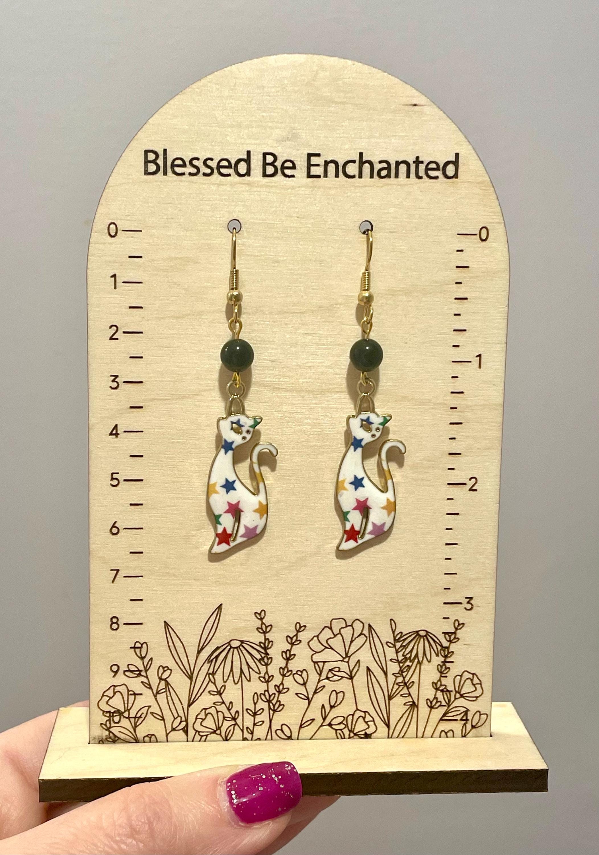 These are handmade, Gemstone earrings, with Black Obsidian Gemstones and gold tone, enamel, colorful cats charms with a white background with primary color stars. The ear wires are hypoallergenic, surgical 316L, gold tone, stainless steel, French hook ear wires with a decorative ball and coil accent, measuring 2.5 inches. Make them yours!