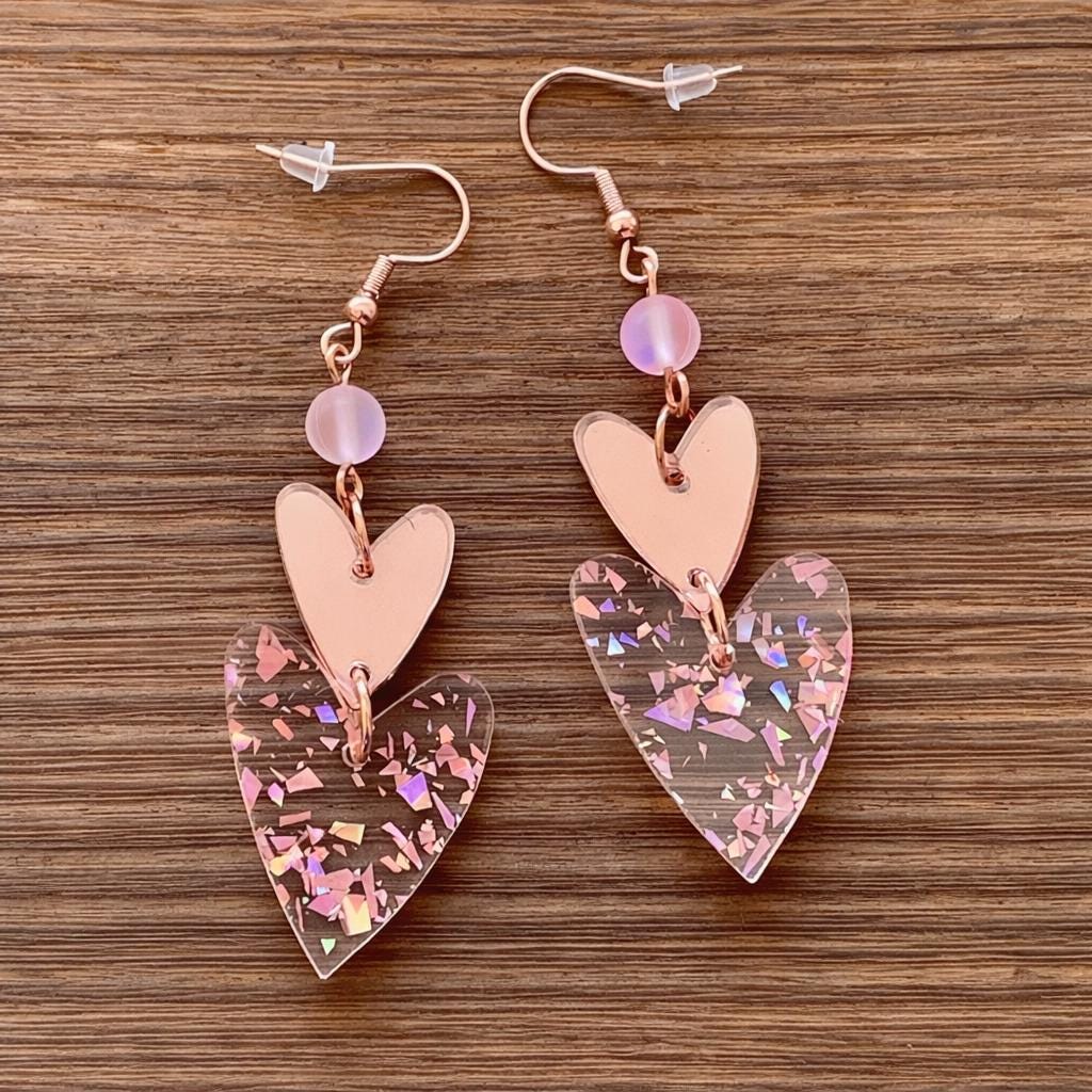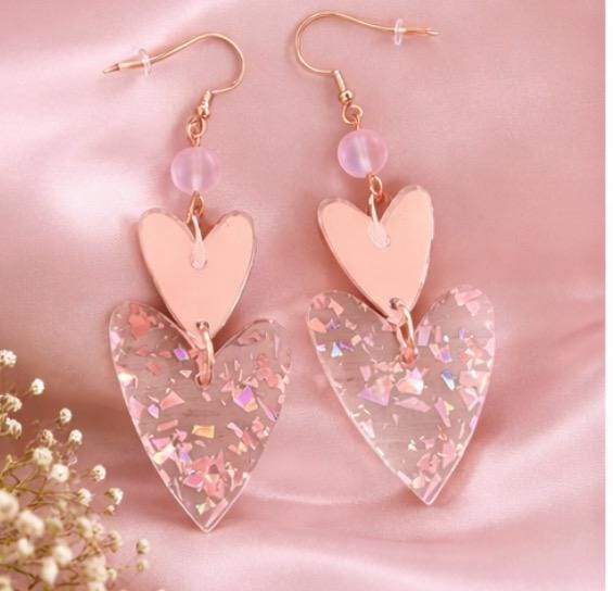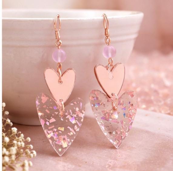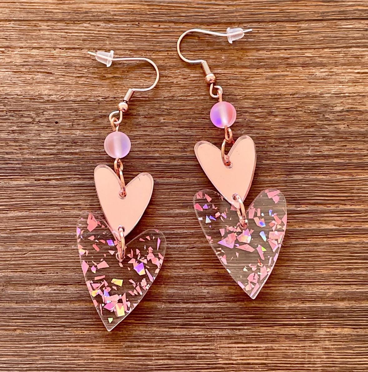 • Layered acrylic heart charms (blush + clear pink confetti)