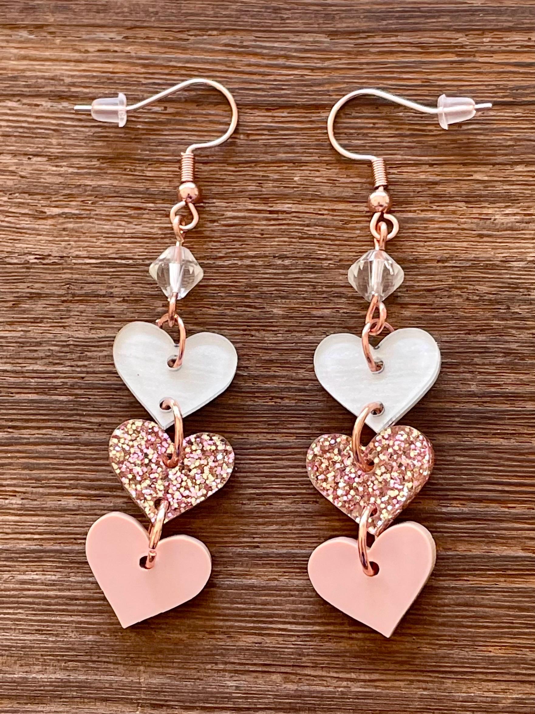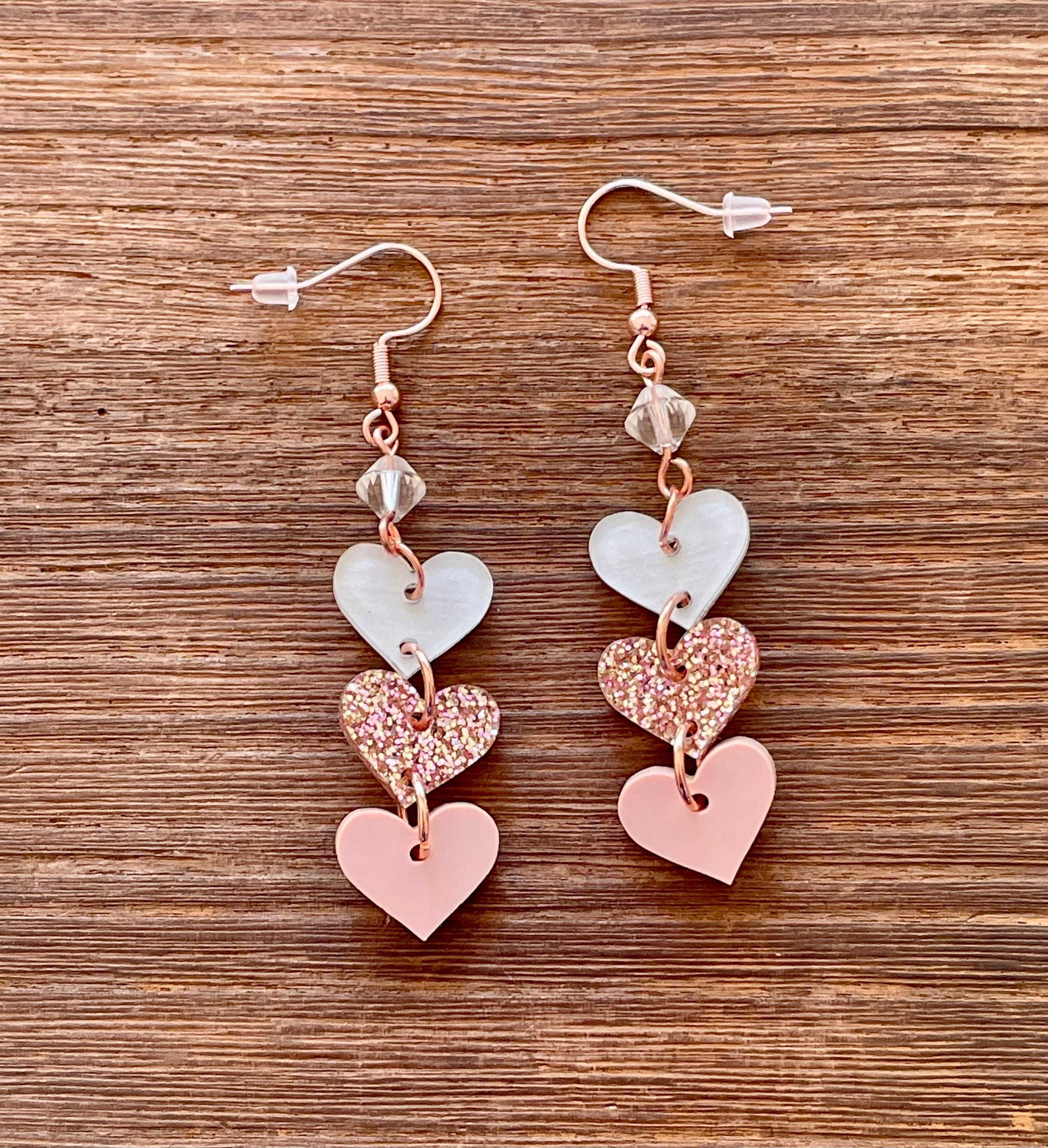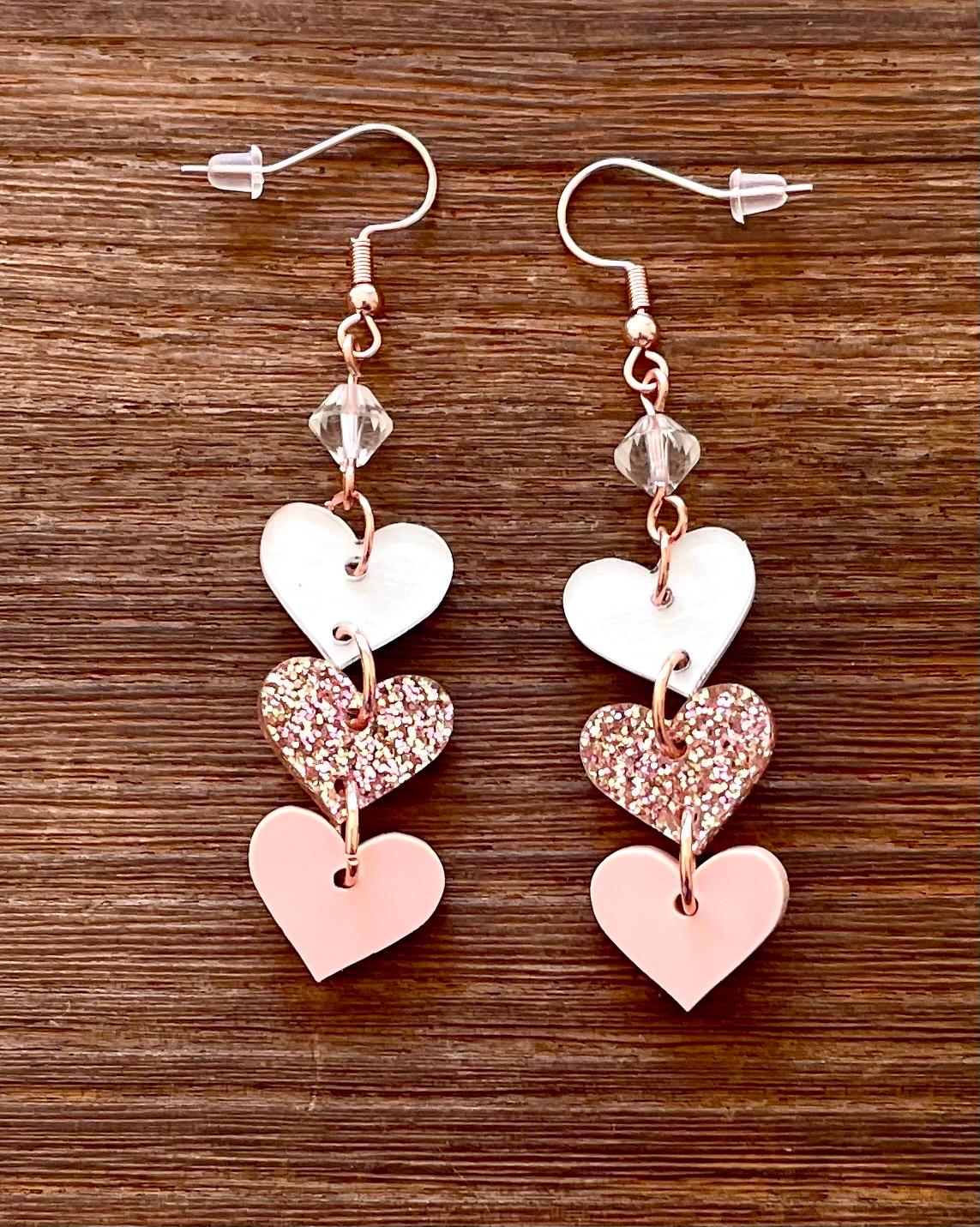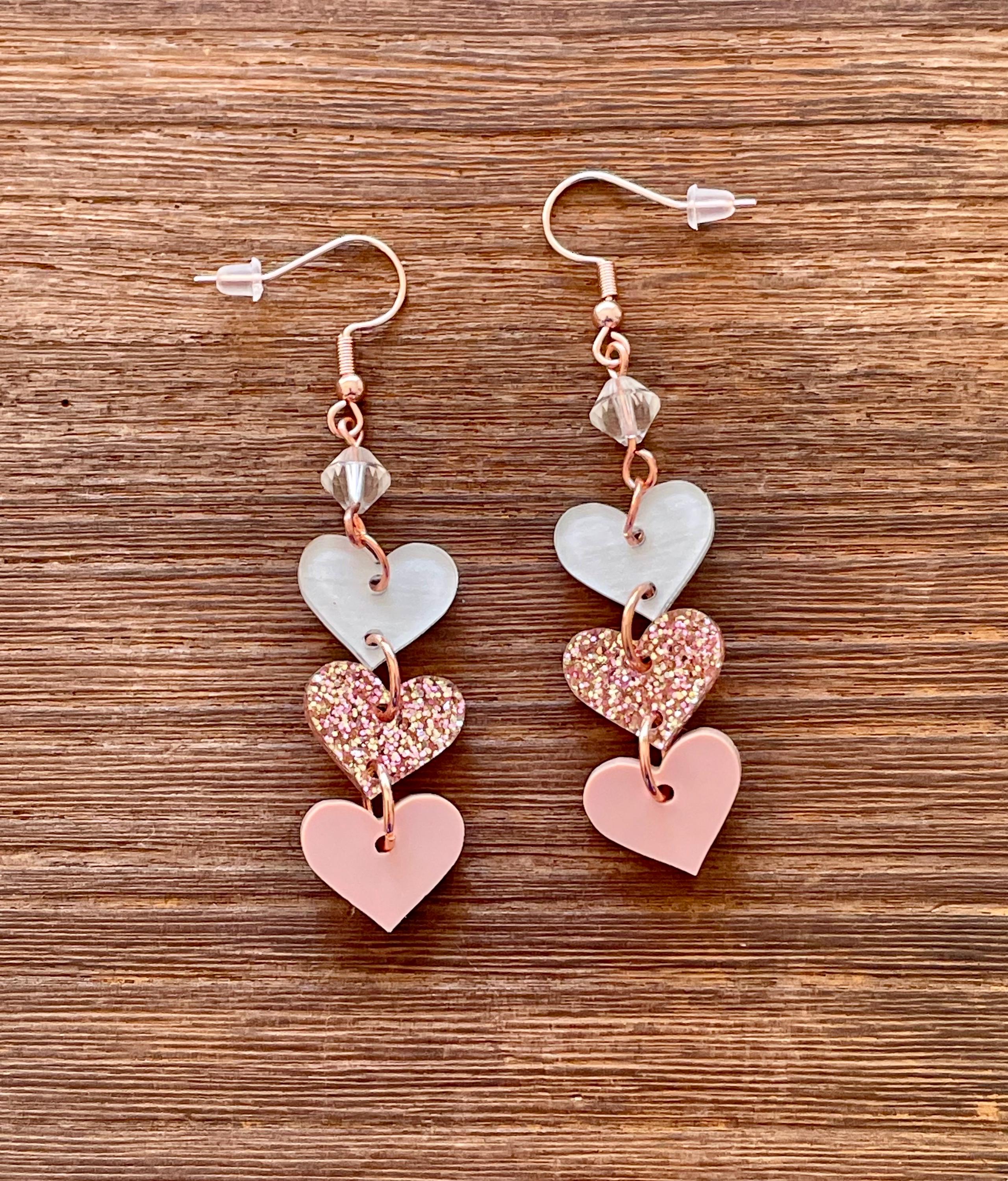 These are handmade, Gemstone hook earrings, with Clear Quartz Gemstones and three acrylic heart pendants, one clear with white, rose gold sparkle, and opaque pink, measuring 2.5 inches. The ear wires are rose gold tone, hypoallergenic, surgical 316L, stainless steel, French hook ear wires with a decorative ball and coil accent. Make them yours!