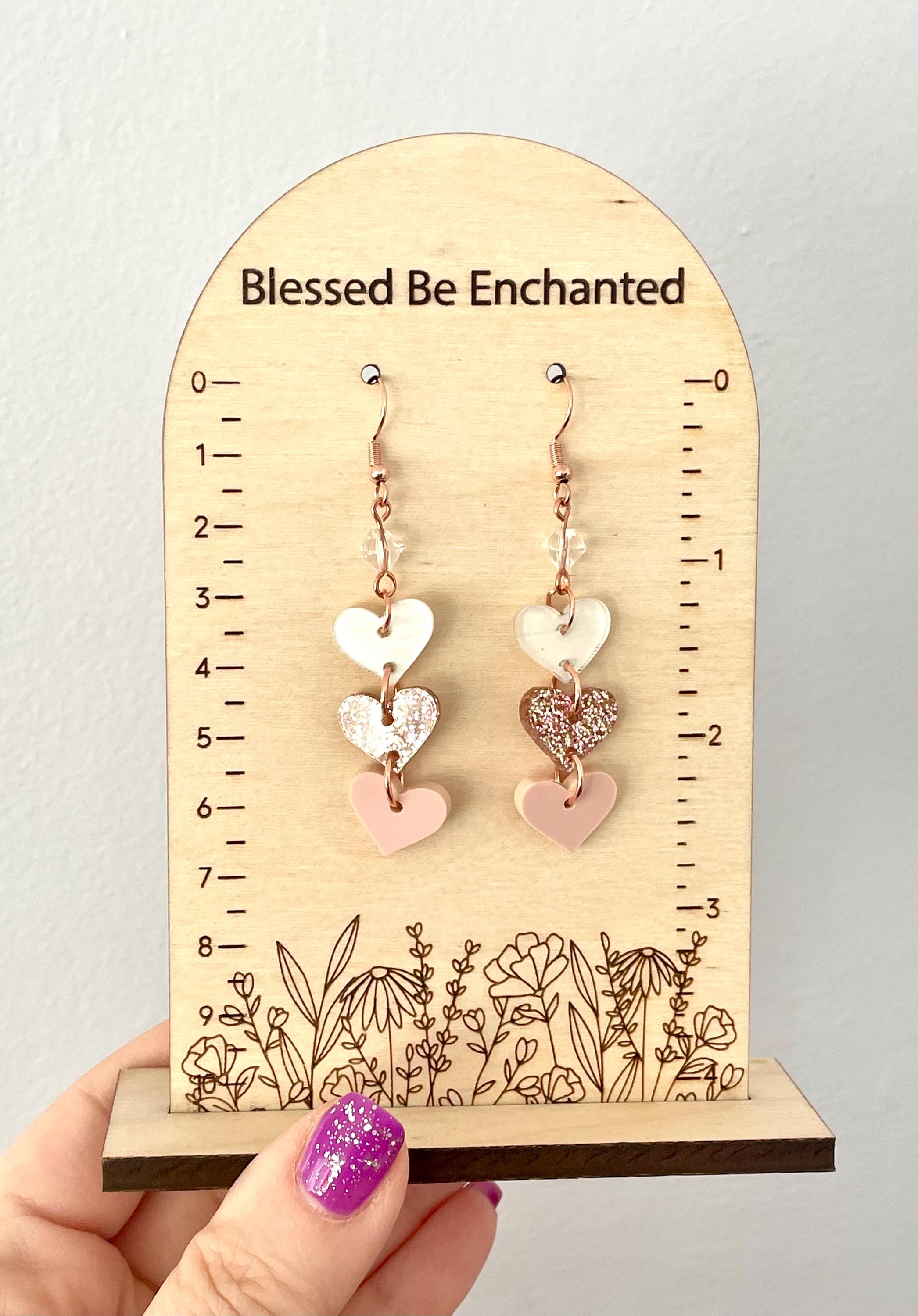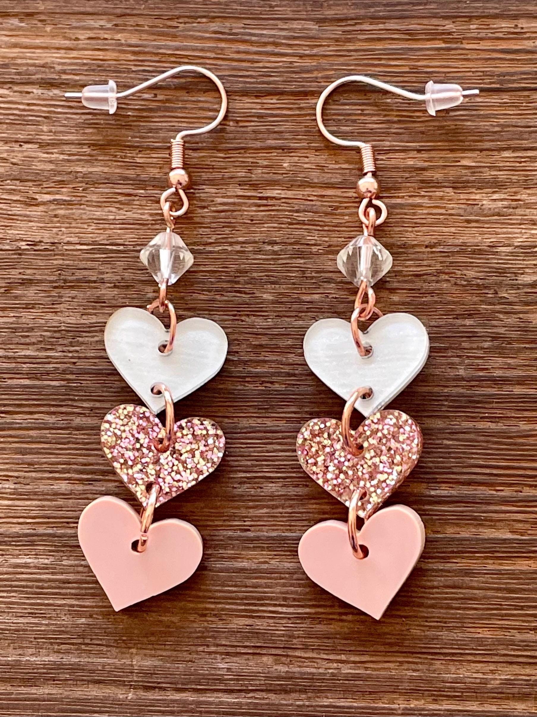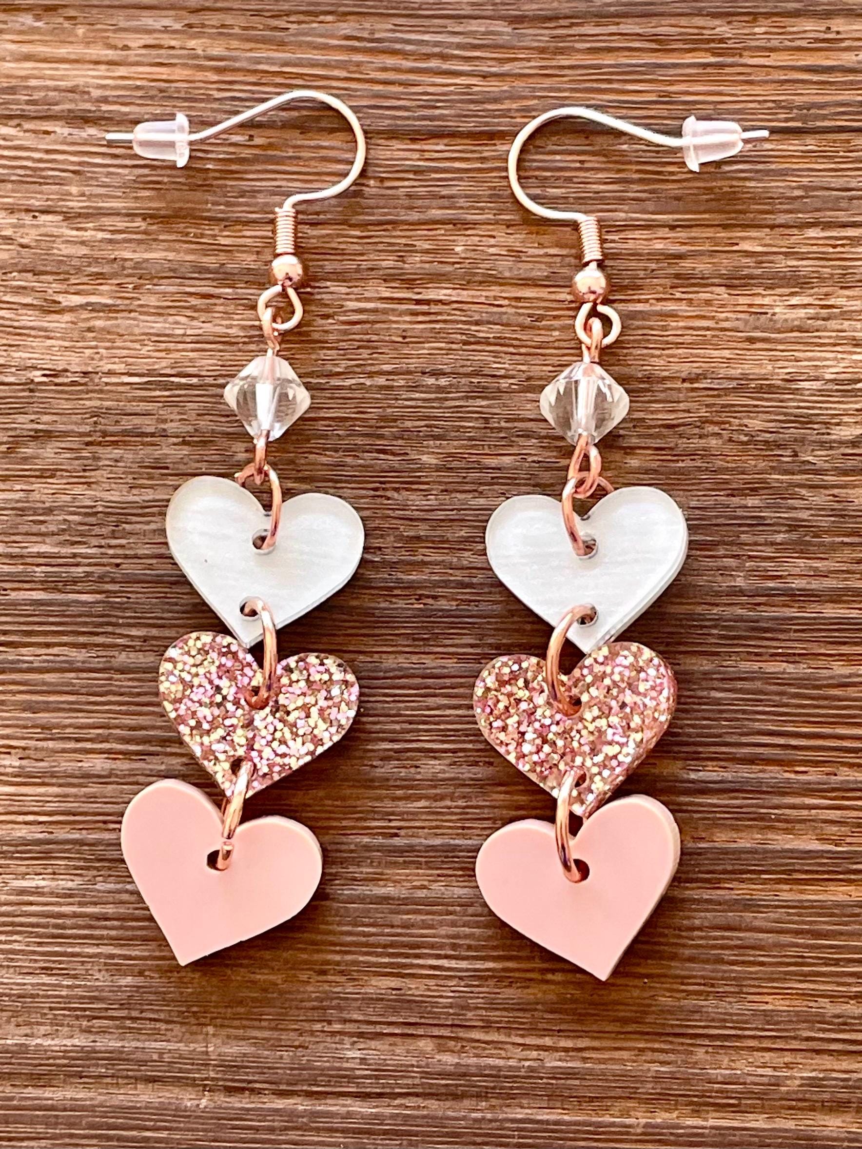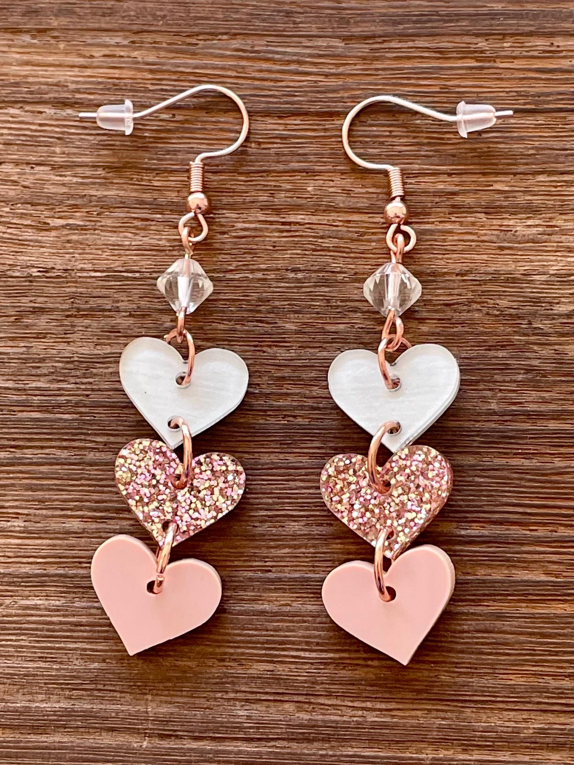 These are handmade, Gemstone hook earrings, with Clear Quartz Gemstones and three acrylic heart pendants, one clear with white, rose gold sparkle, and opaque pink, measuring 2.5 inches. The ear wires are rose gold tone, hypoallergenic, surgical 316L, stainless steel, French hook ear wires with a decorative ball and coil accent. Make them yours!