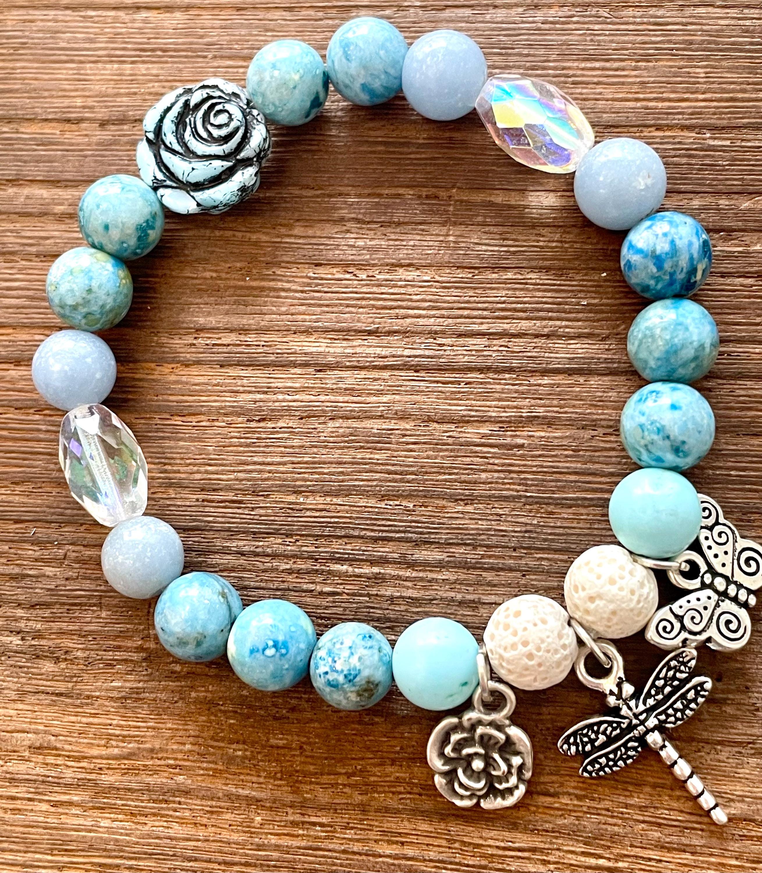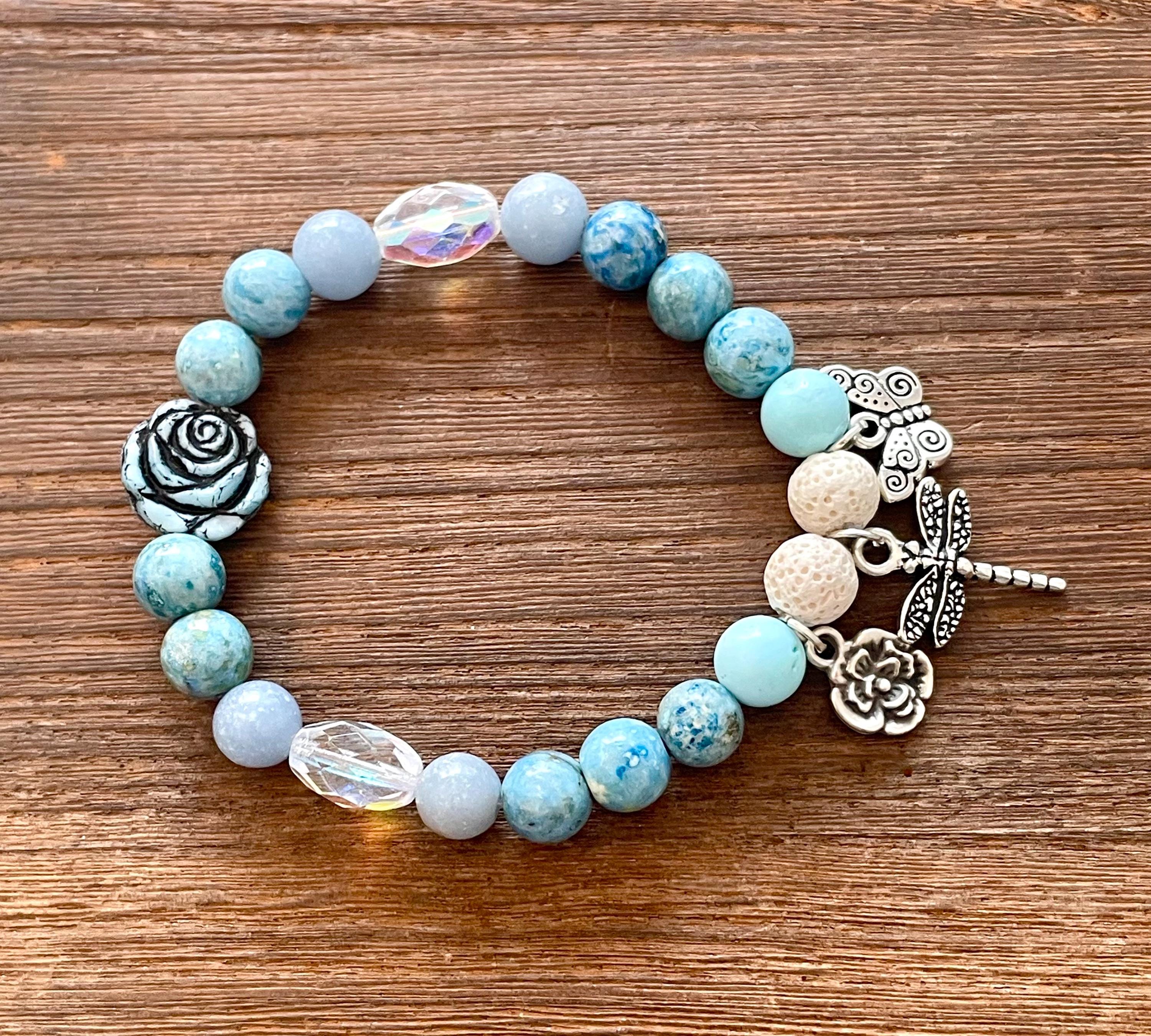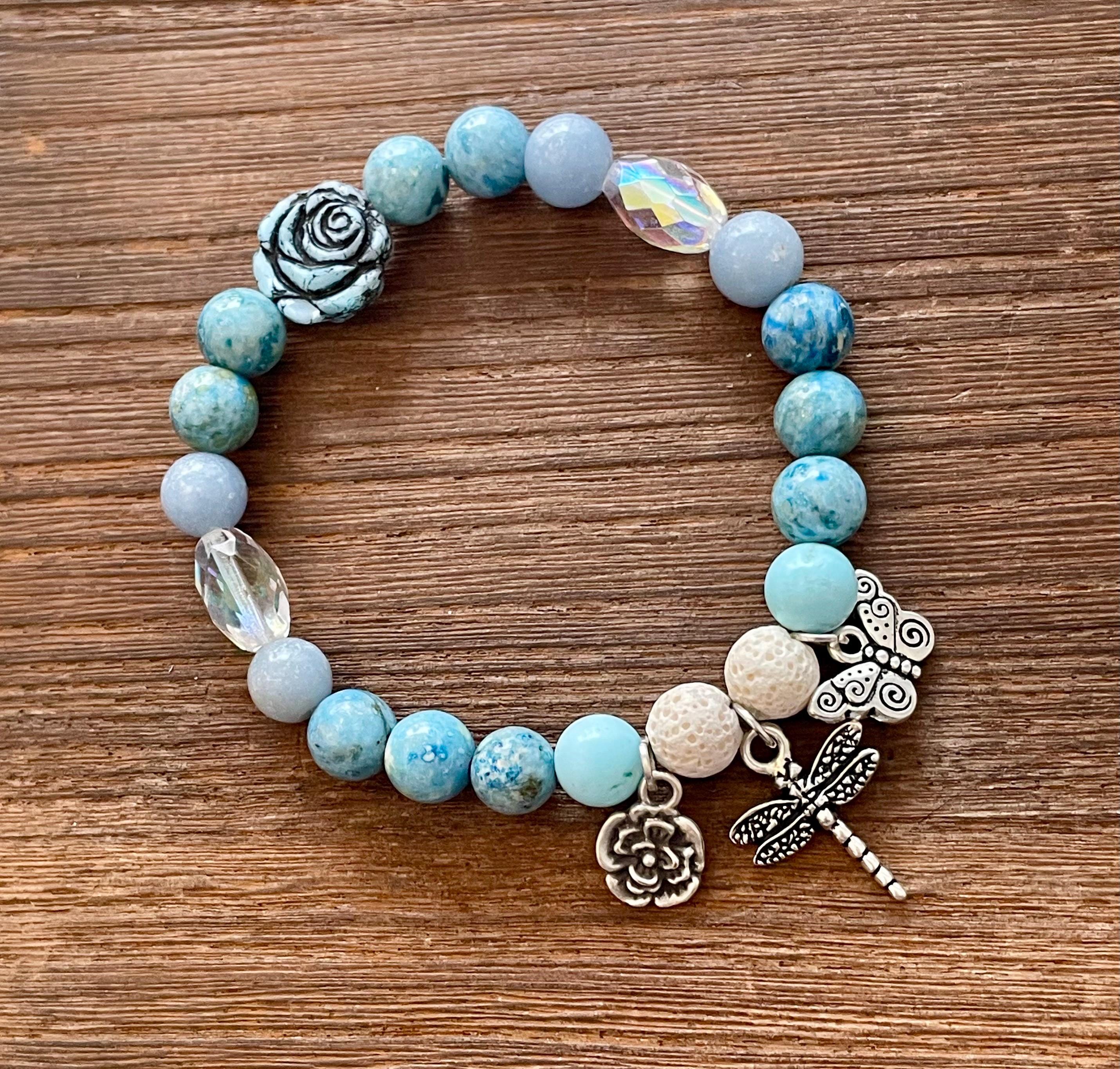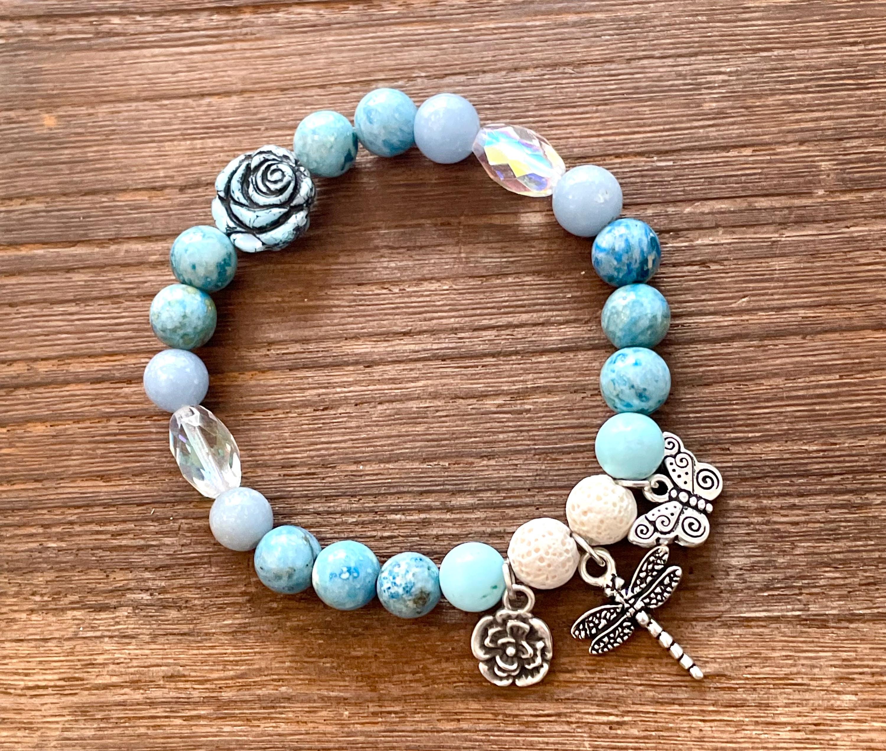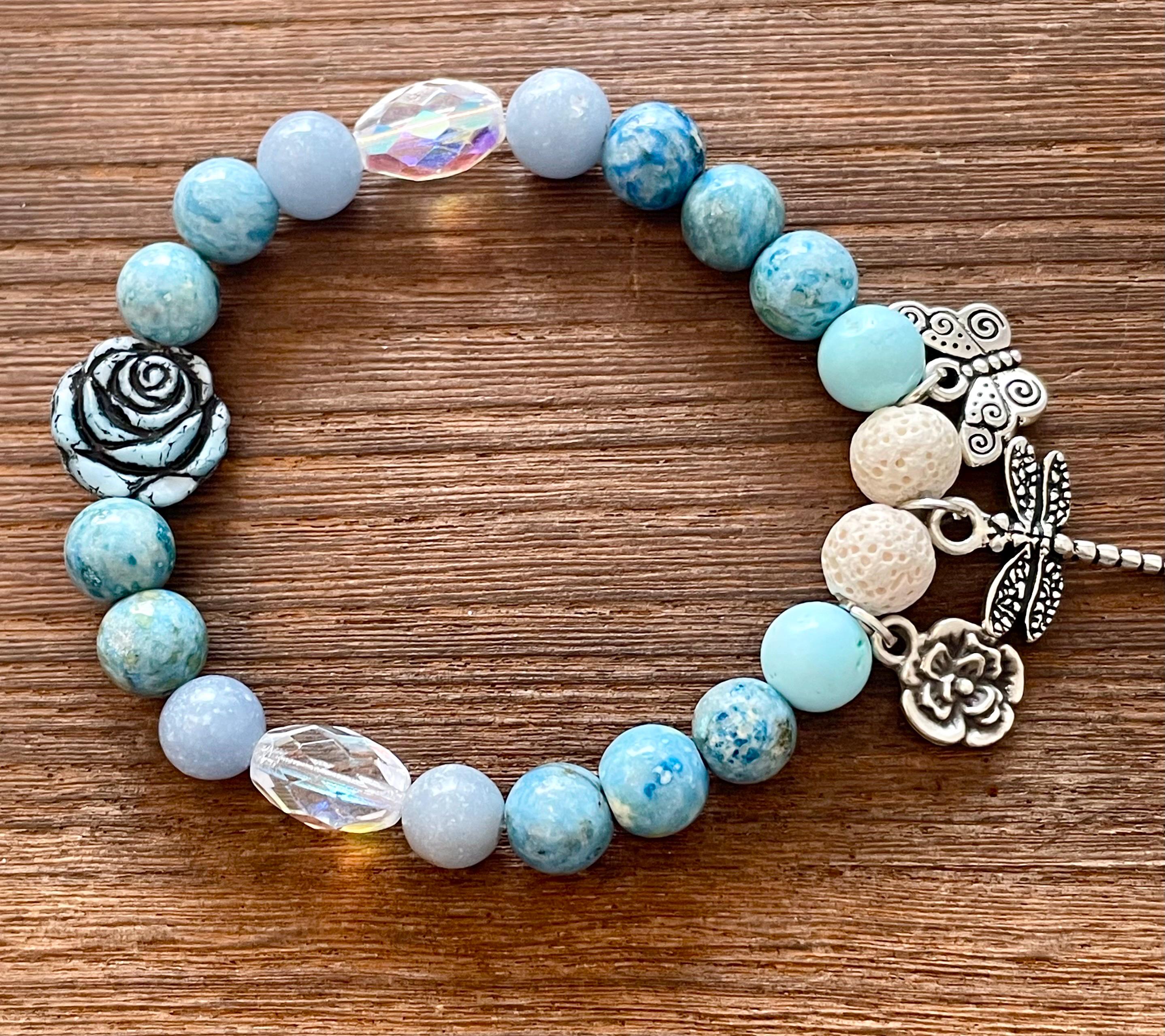 This is a very beautiful, Angelite, Blue Howlite, Larimar Quartz, and Lava Stone, Gemstone beaded stretch bracelet. The beautiful, shiny beads are such pretty shades of blue. One Czech Glass 14mm rose flower bead in a subtle bluish gray with white color and black wash accents the gemstones perfectly. Also there are two, faceted, Czech Glass Picasso, oval beads, 12x18mm, that are transparent with an AB finish. Each bracelet has three antique silver charms, a flower, butterfly, and a dragonfly.