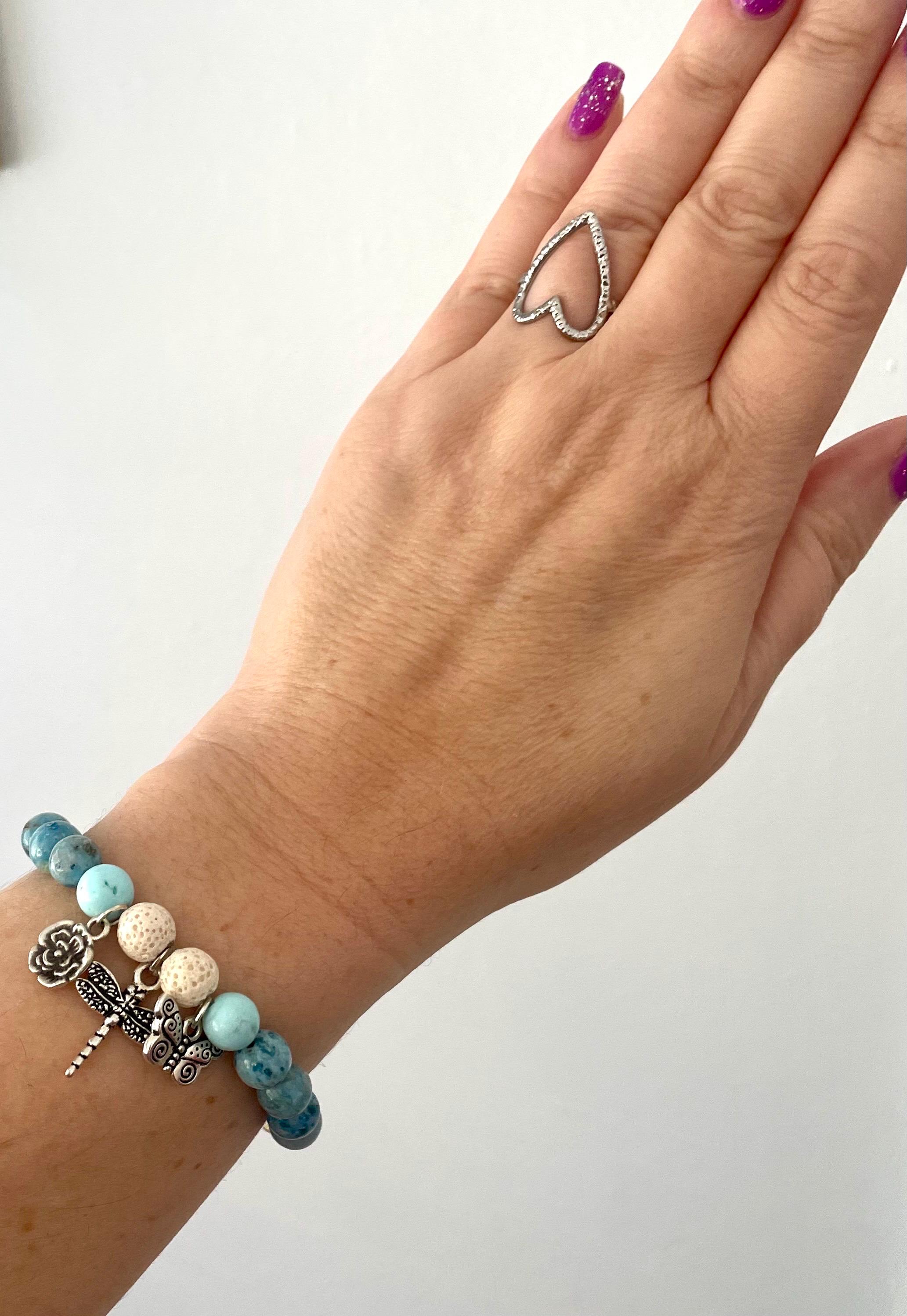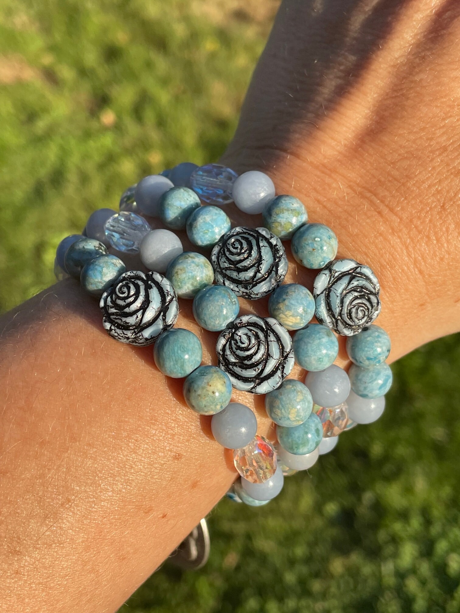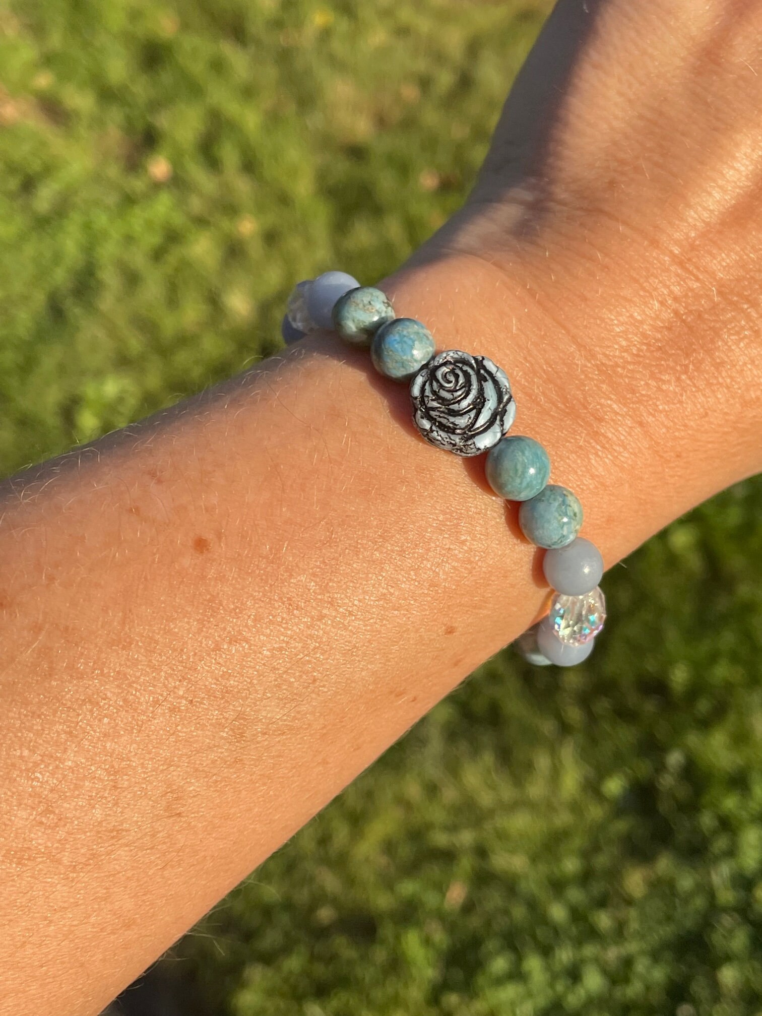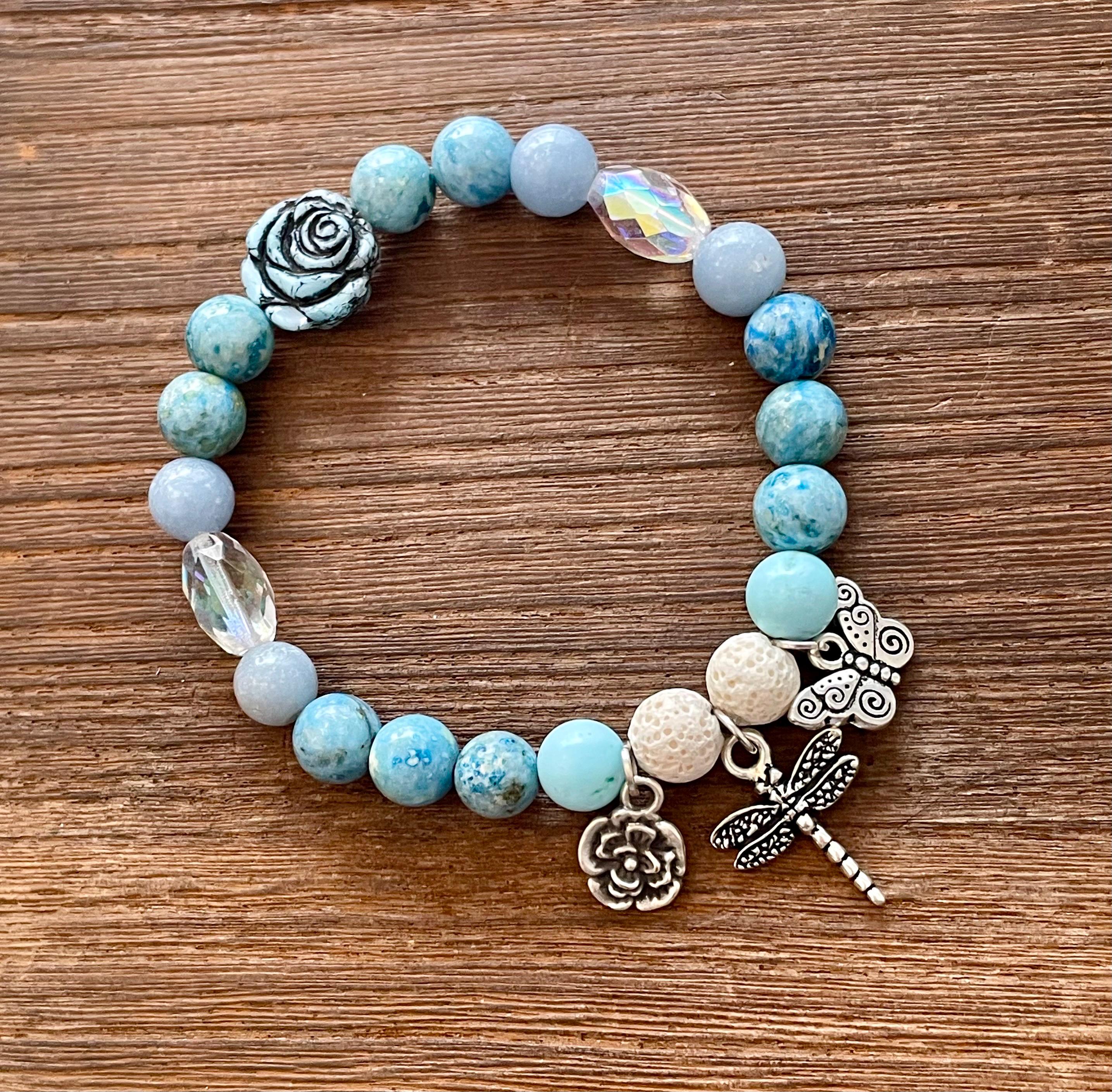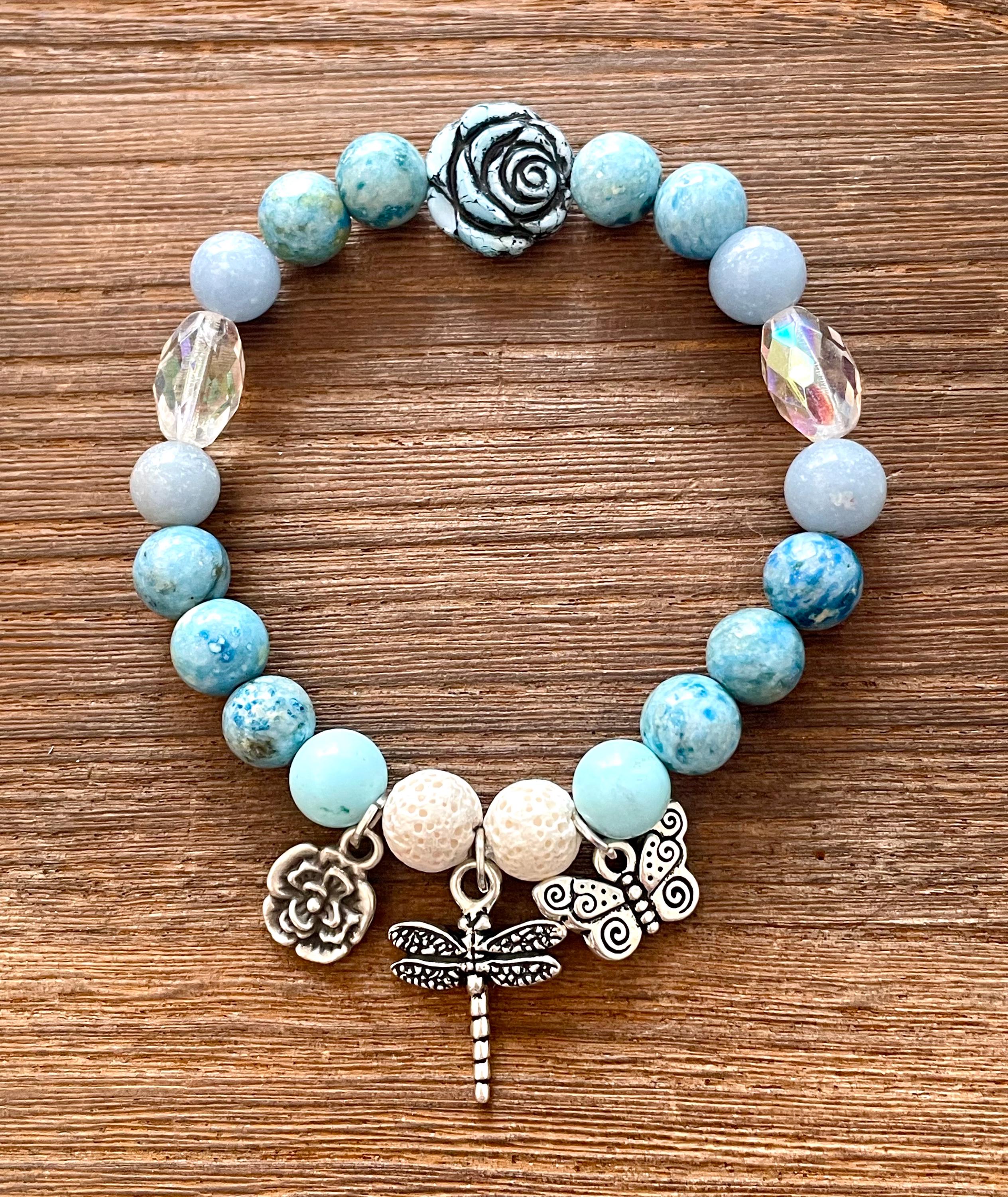 This is a very beautiful, Angelite, Blue Howlite, Larimar Quartz, and Lava Stone, Gemstone beaded stretch bracelet. The beautiful, shiny beads are such pretty shades of blue. One Czech Glass 14mm rose flower bead in a subtle bluish gray with white color and black wash accents the gemstones perfectly. Also there are two, faceted, Czech Glass Picasso, oval beads, 12x18mm, that are transparent with an AB finish. Each bracelet has three antique silver charms, a flower, butterfly, and a dragonfly.