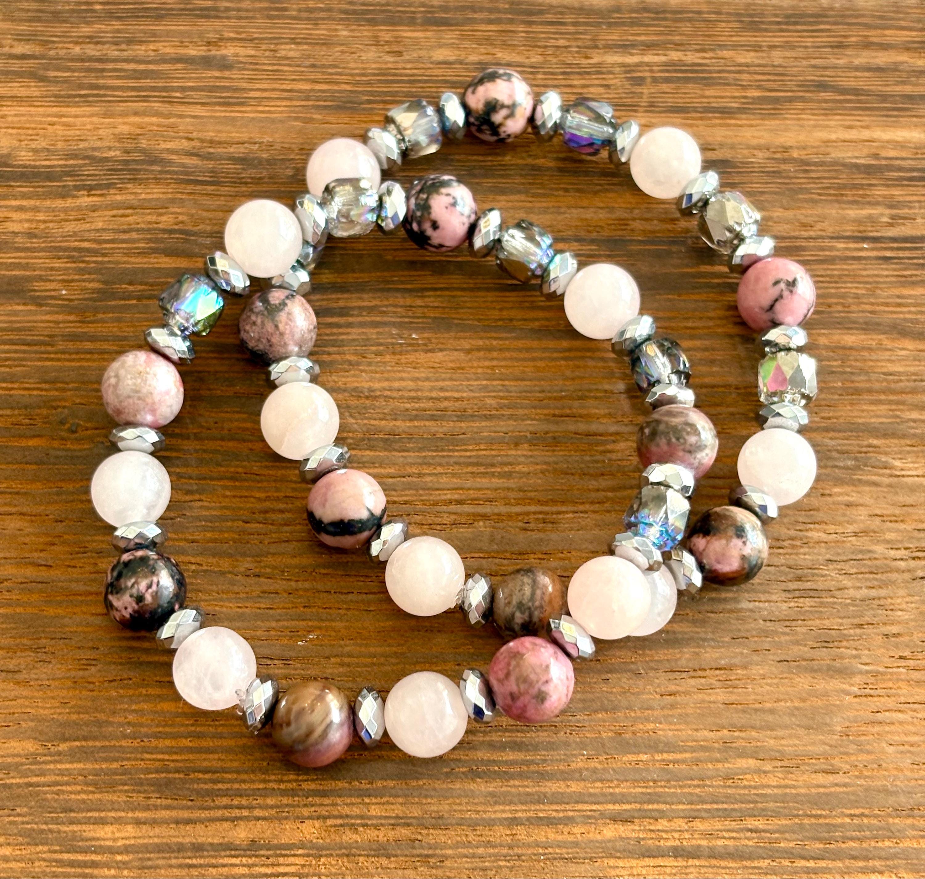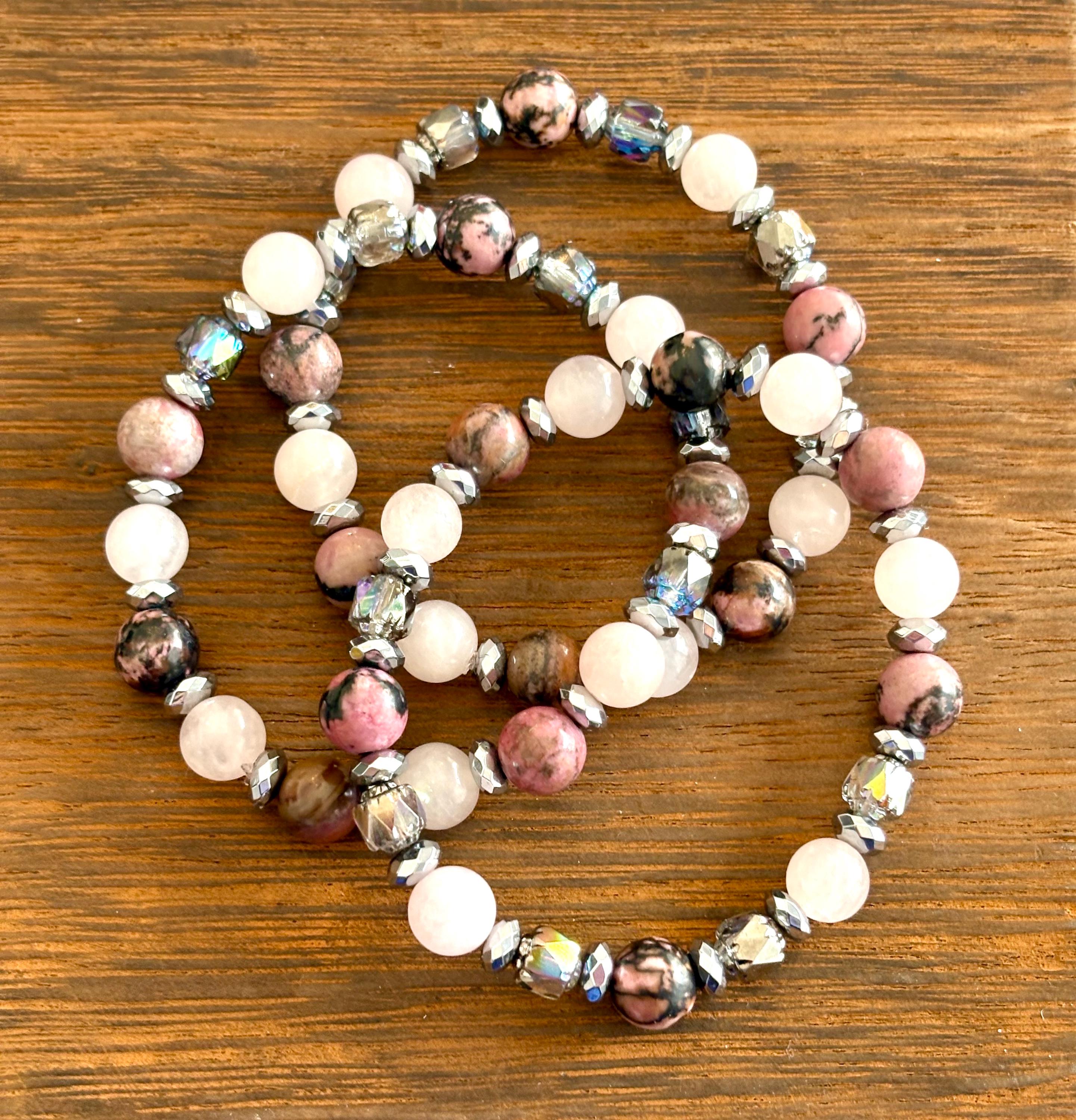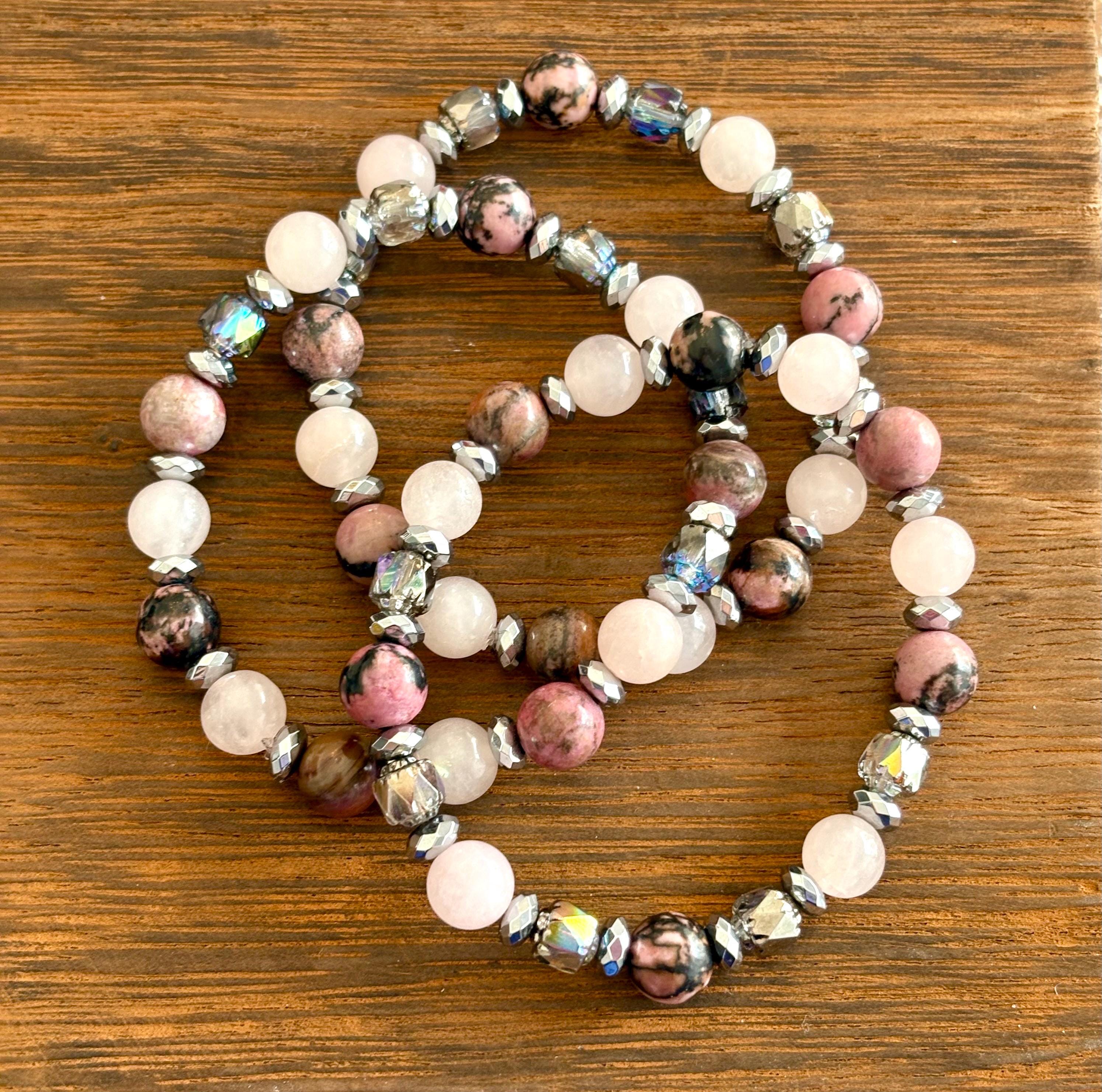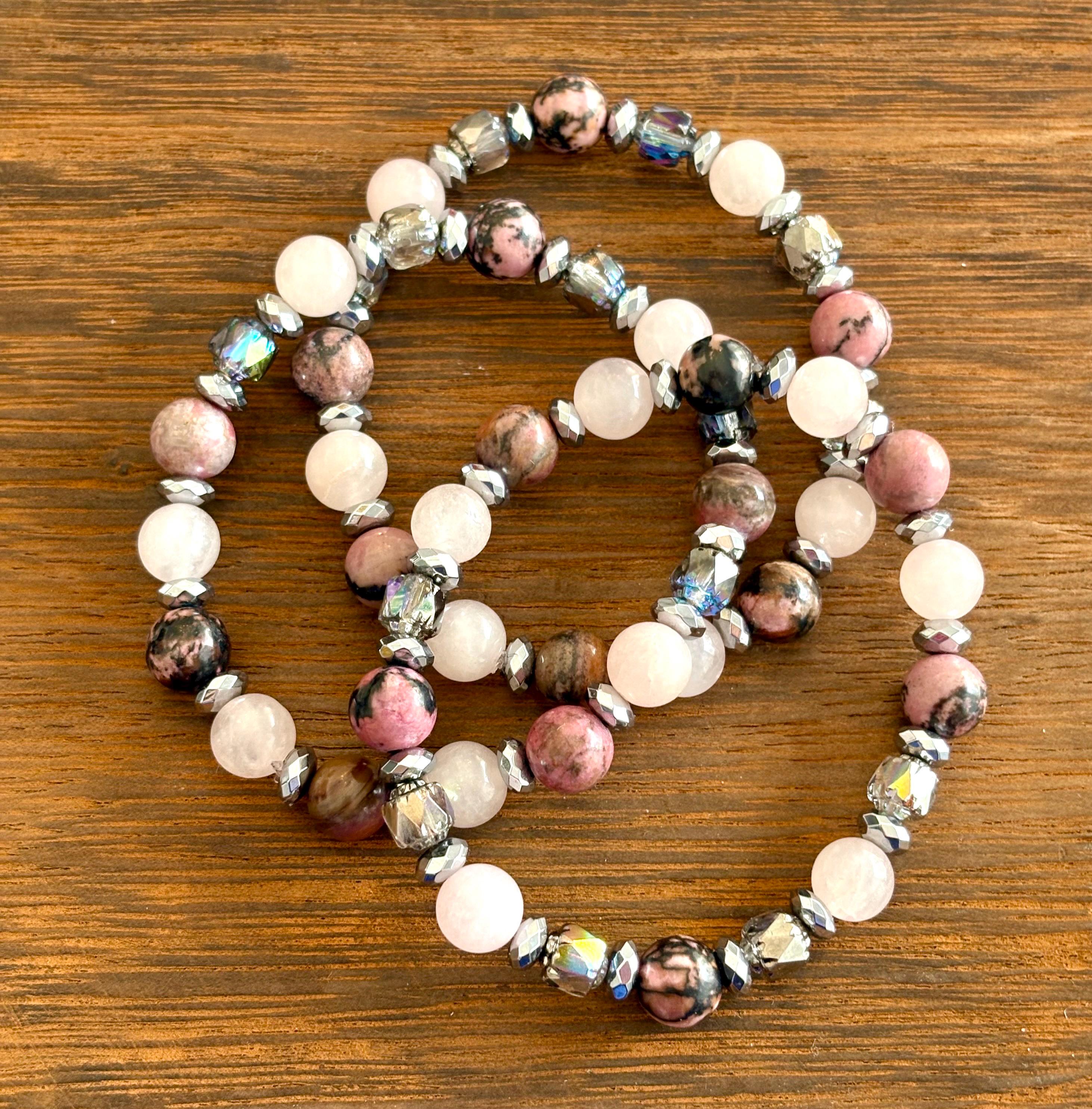 Gemstone Bracelet - Rhodonite / Rose Quartz / Hematite Crystal Healing, Compassionate Lovely Human