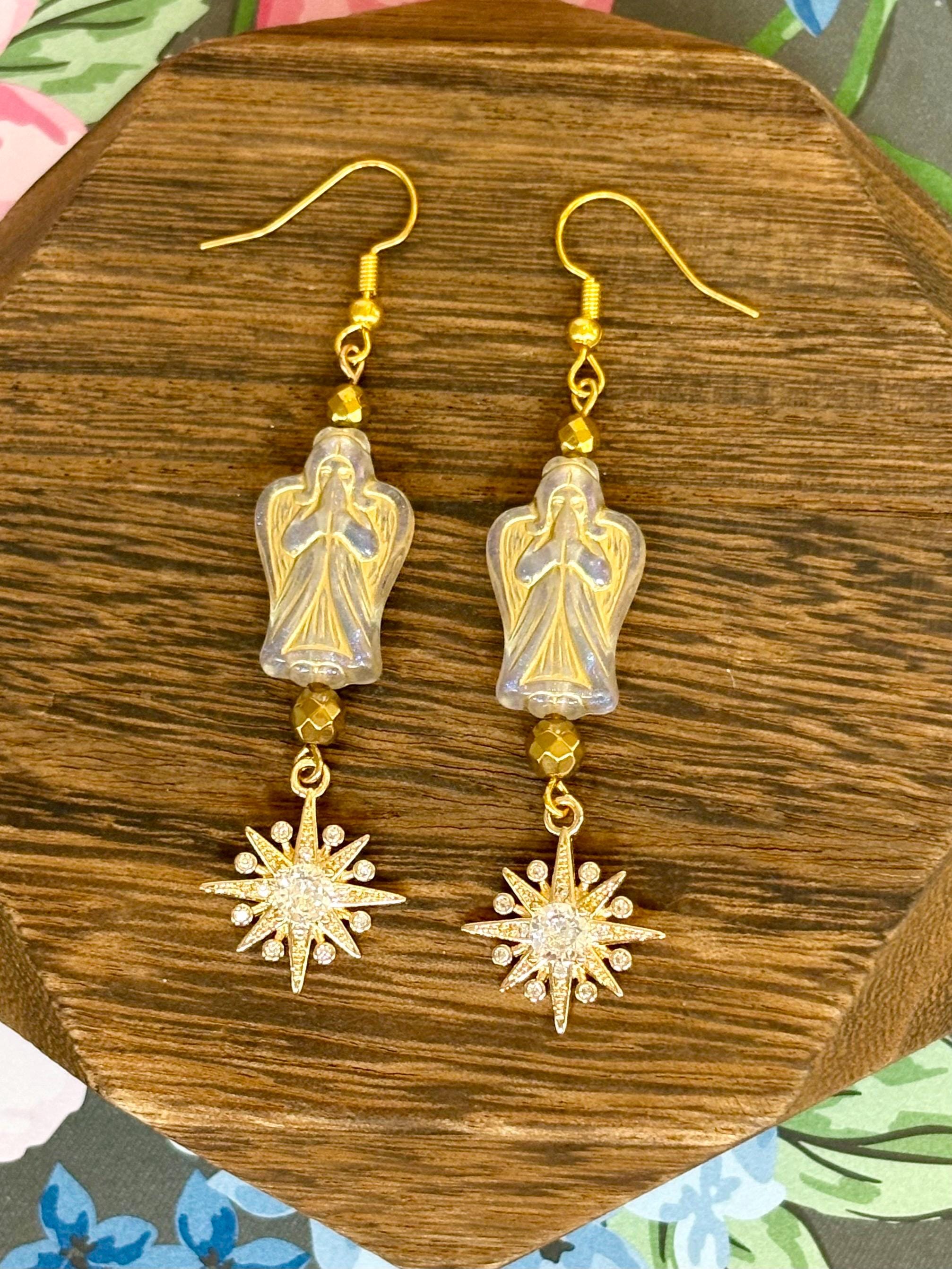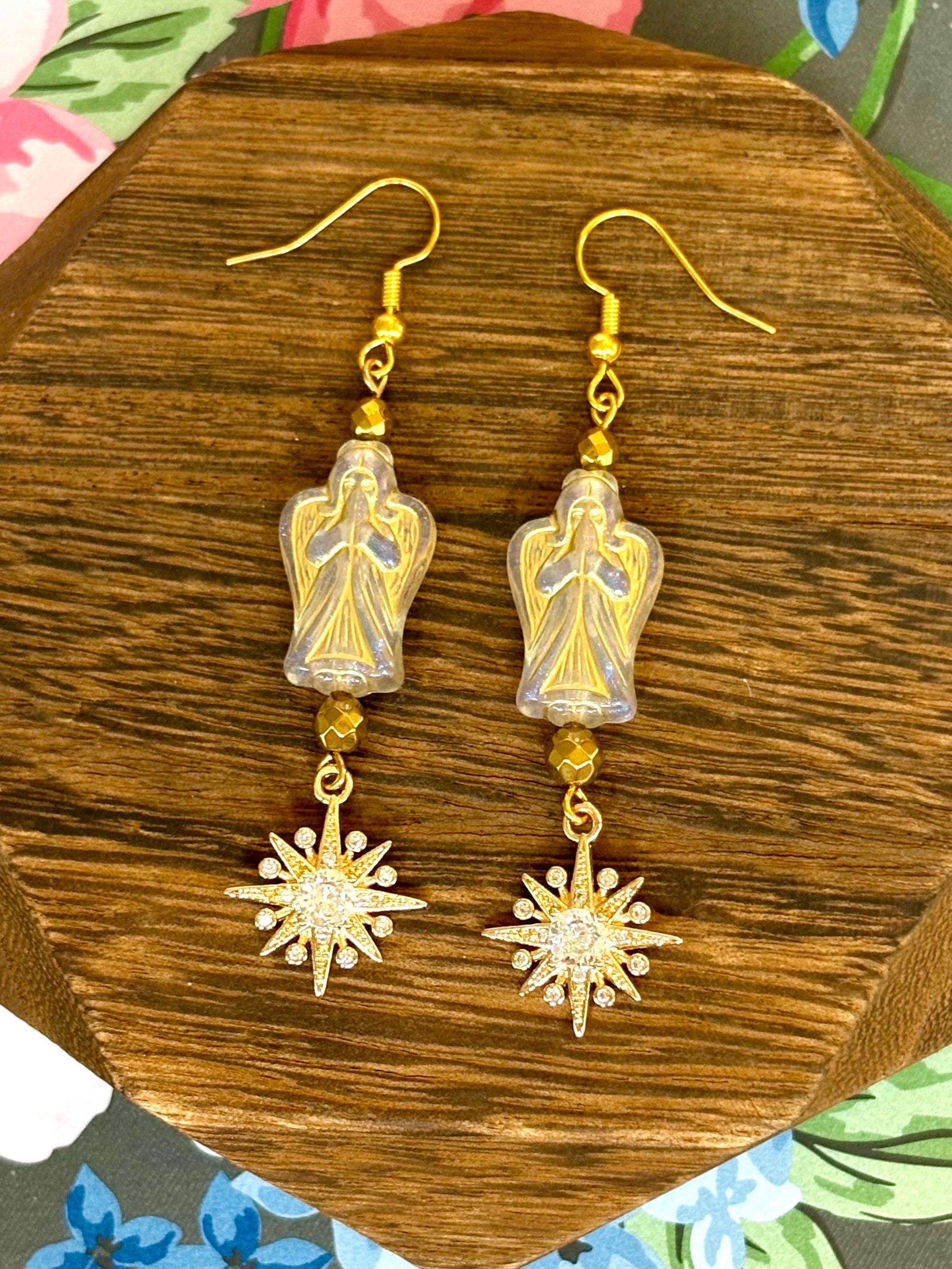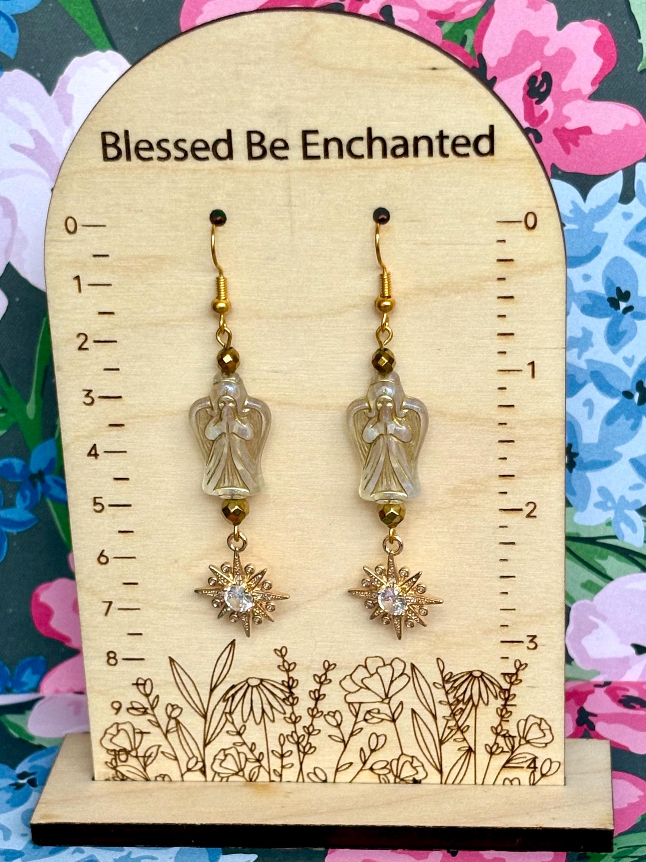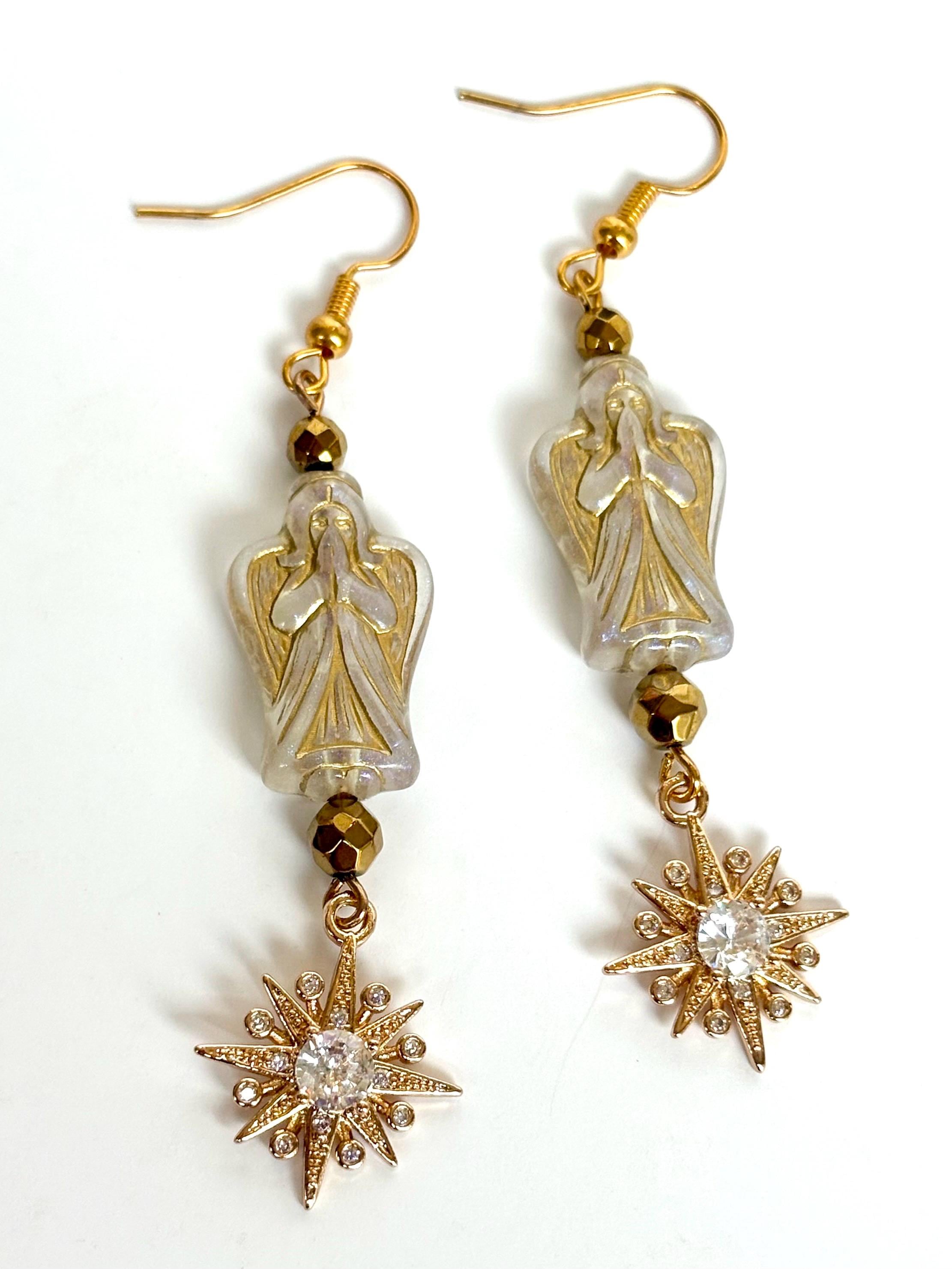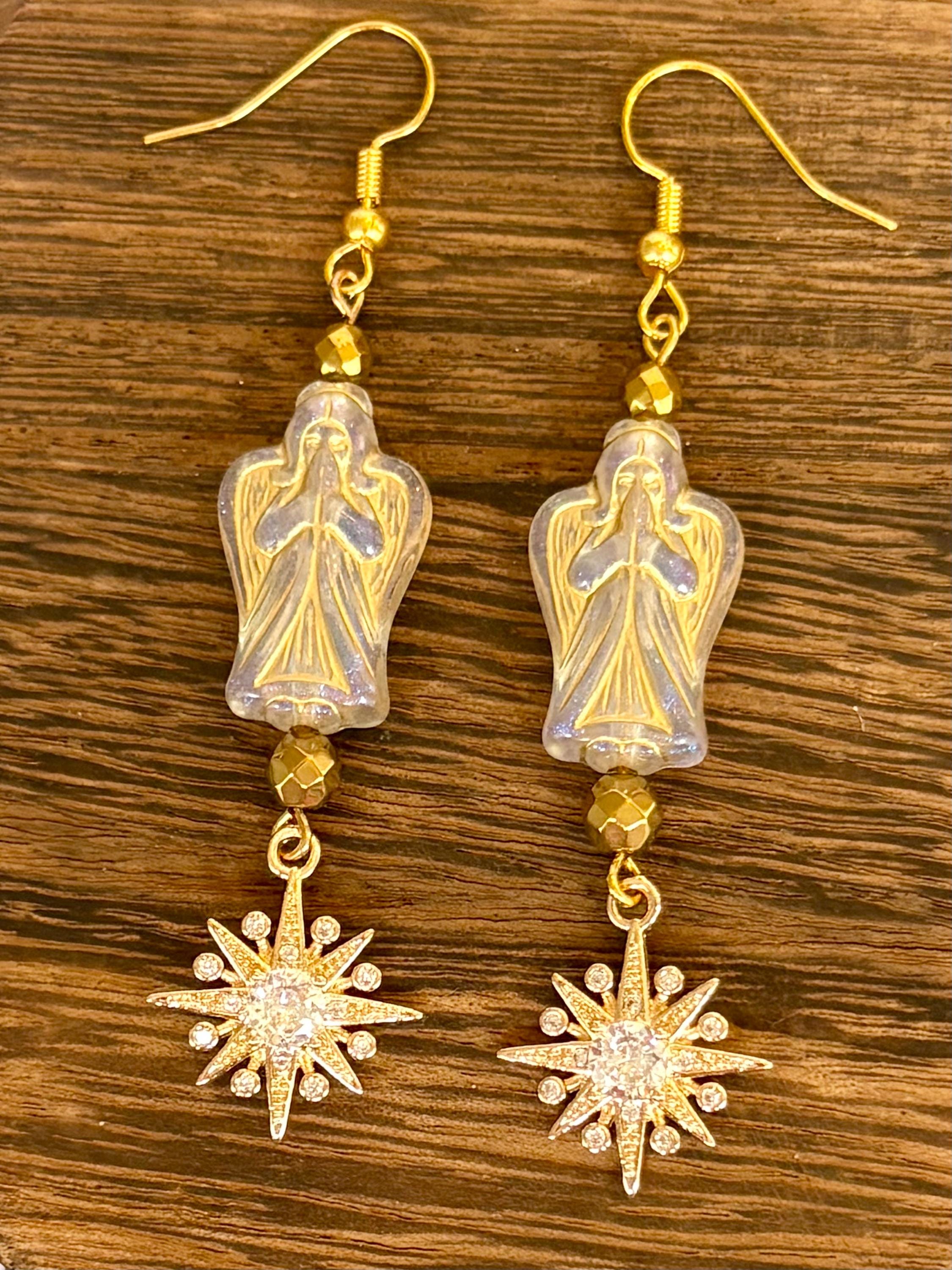 Step into a gentle celestial glow with Angel Light — a luminous jewelry set designed to surround you with protection, clarity, and heavenly guidance! Each piece features an etched iridescent angel bead shimmering in soft gold AB hues, paired with a sparkling CZ pavé star that catches the light like a tiny burst of divine radiance.