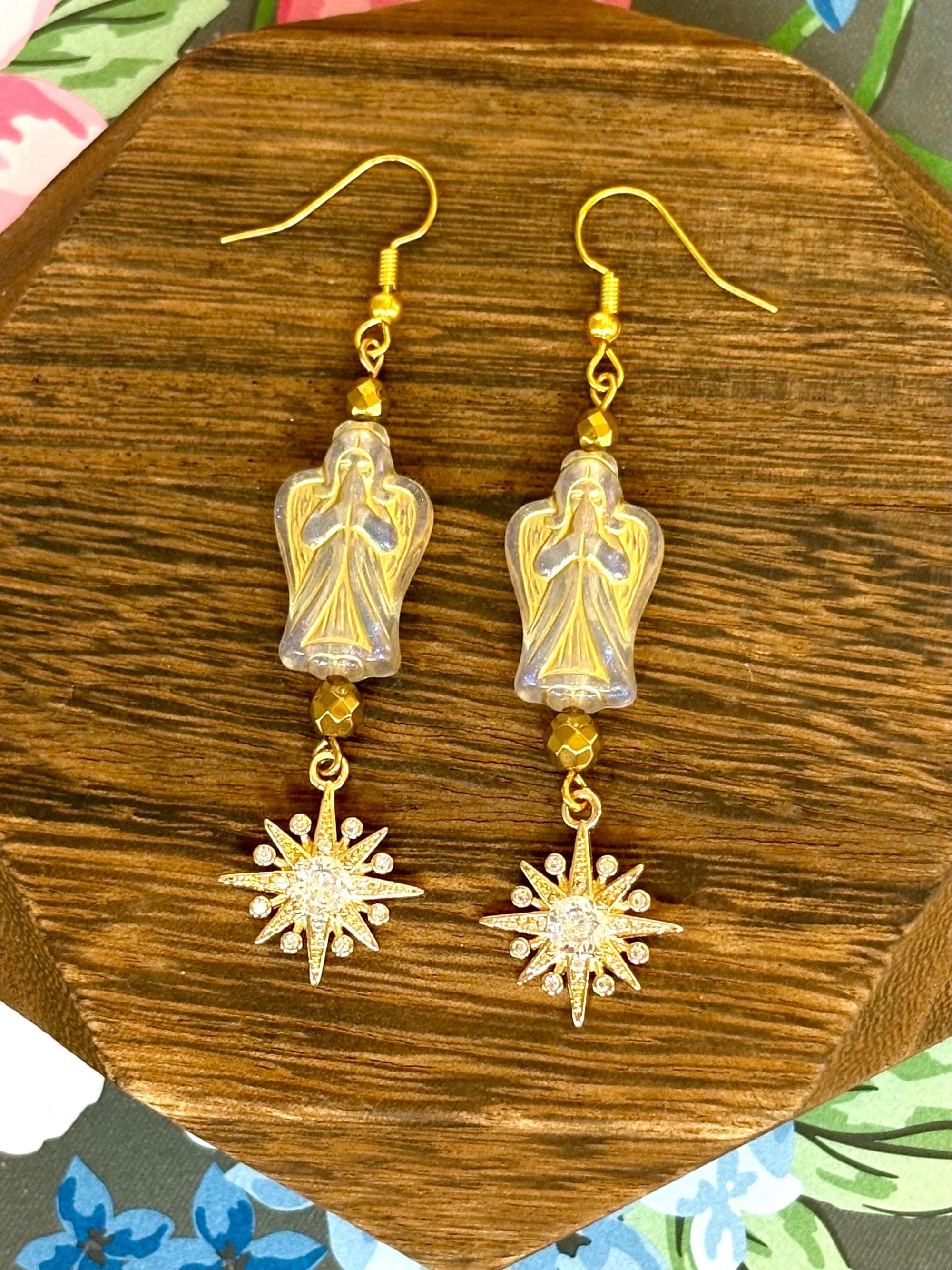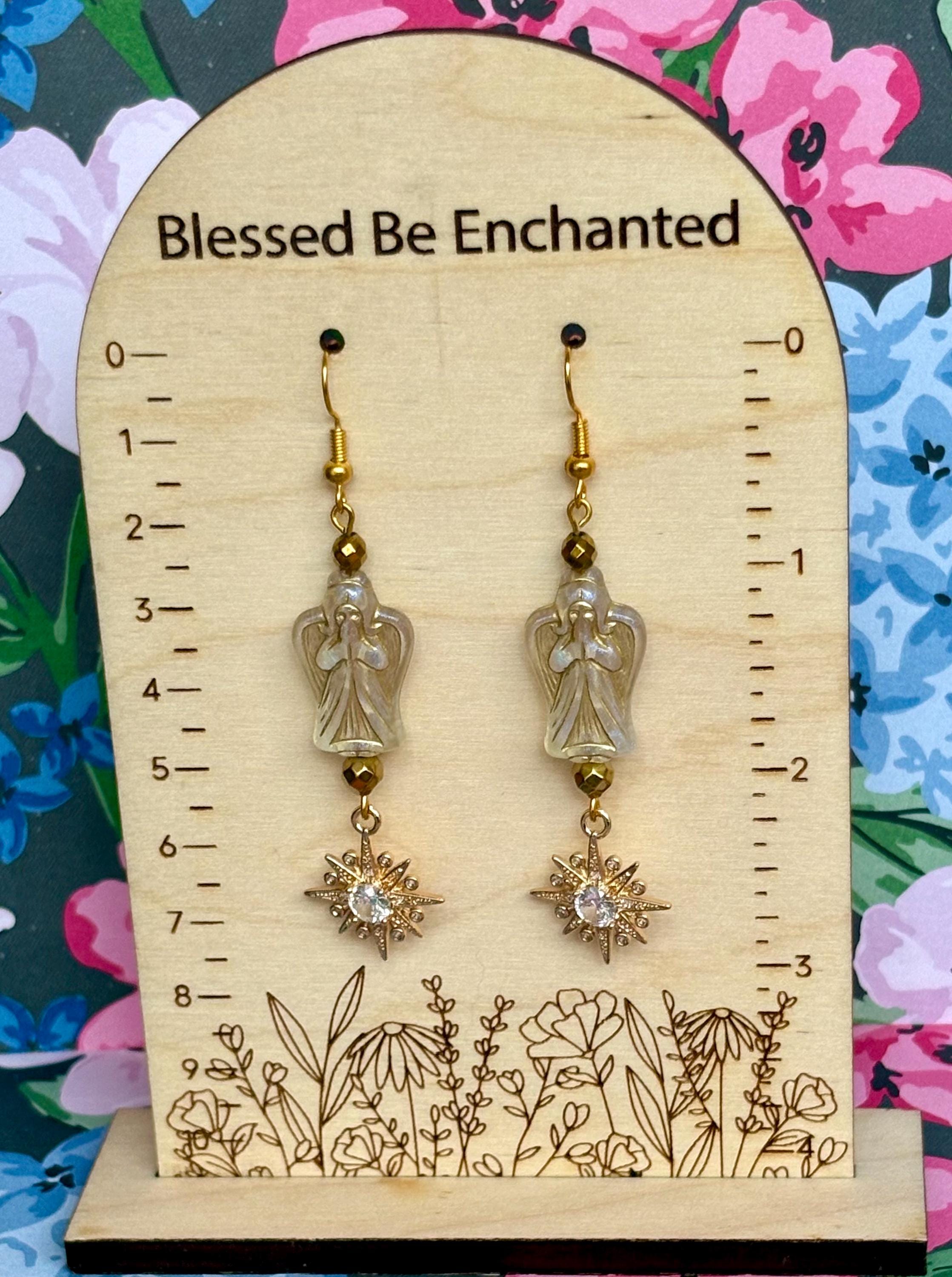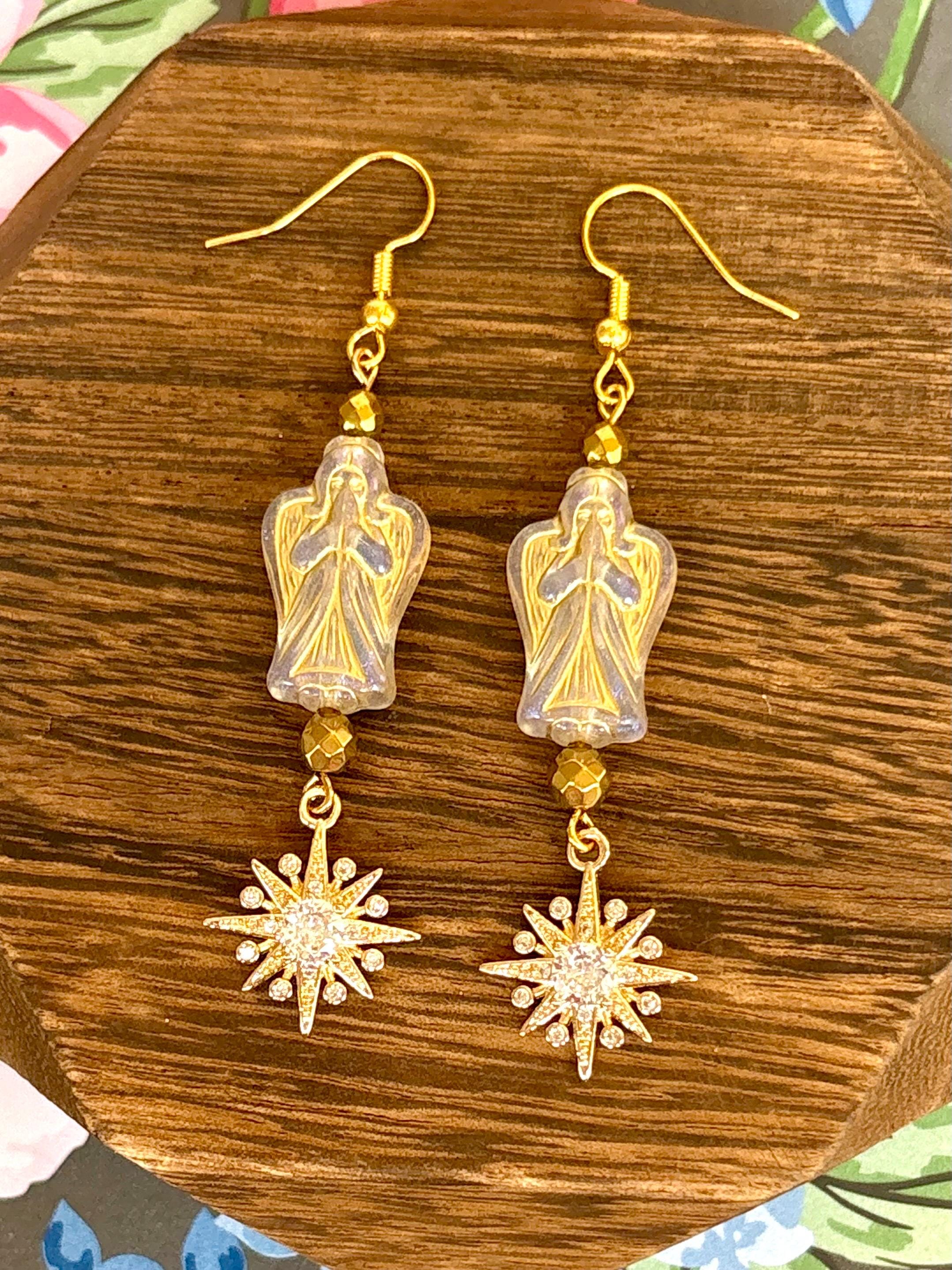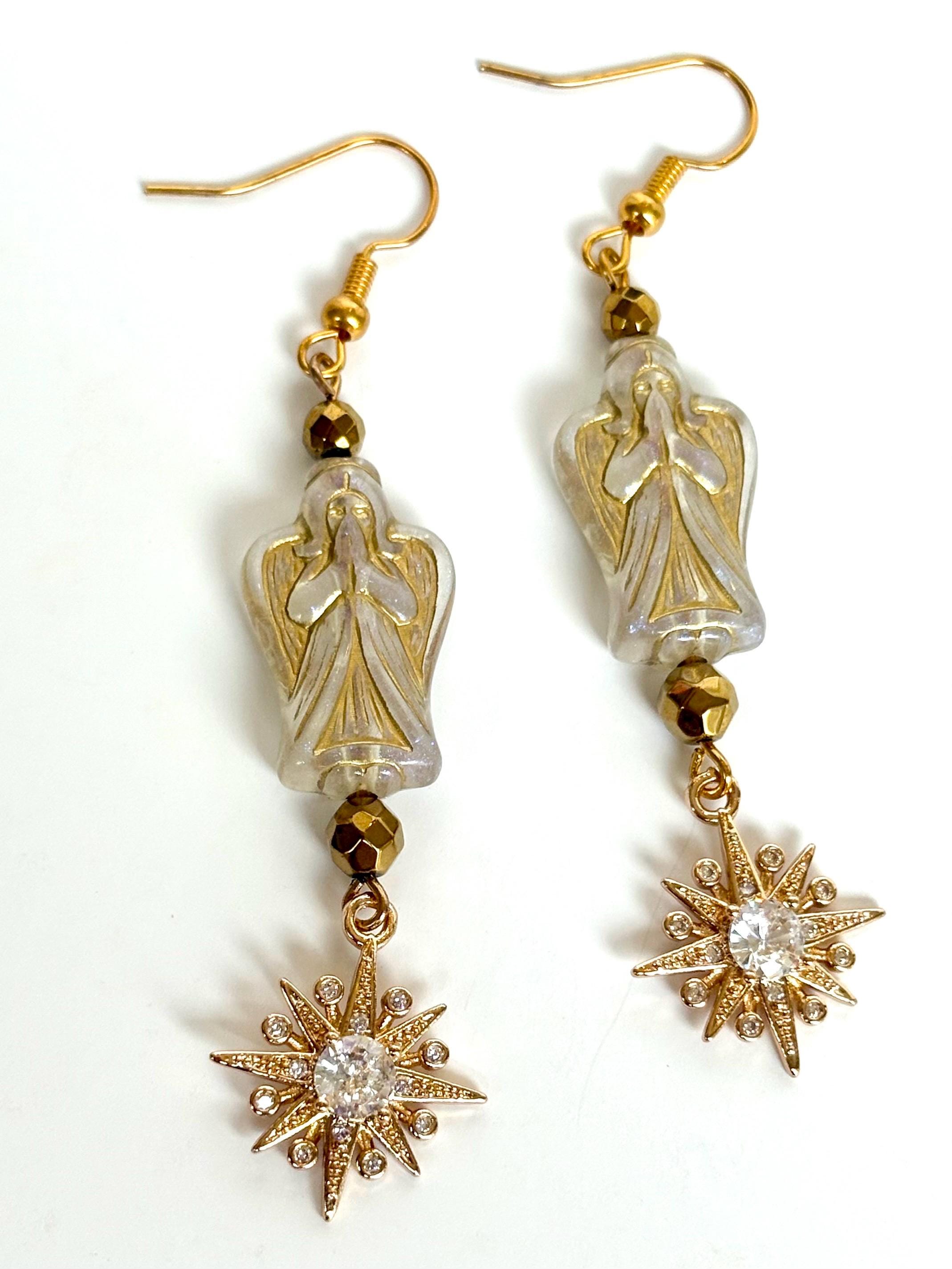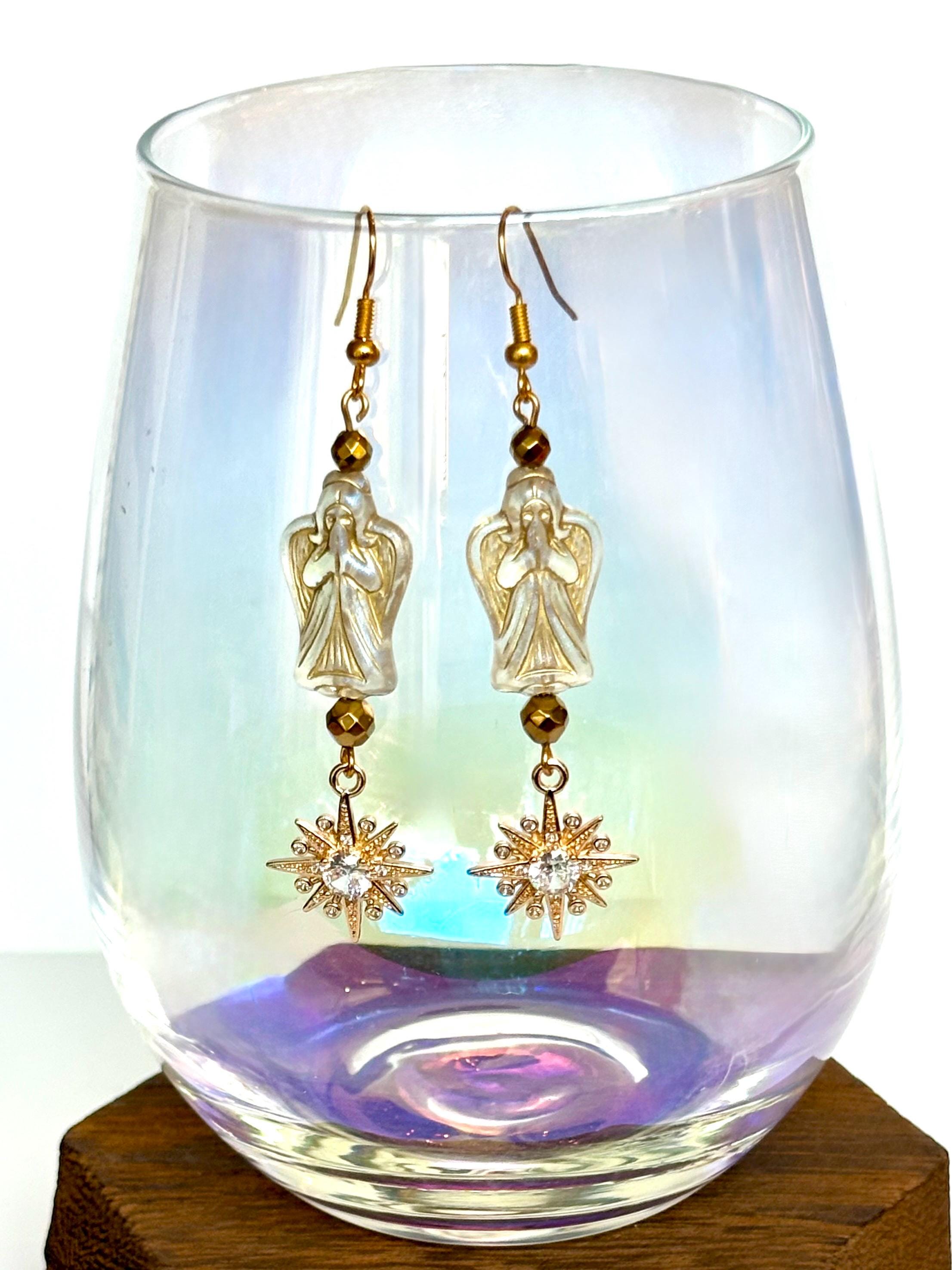 Step into a gentle celestial glow with Angel Light — a luminous jewelry set designed to surround you with protection, clarity, and heavenly guidance! Each piece features an etched iridescent angel bead shimmering in soft gold AB hues, paired with a sparkling CZ pavé star that catches the light like a tiny burst of divine radiance.
