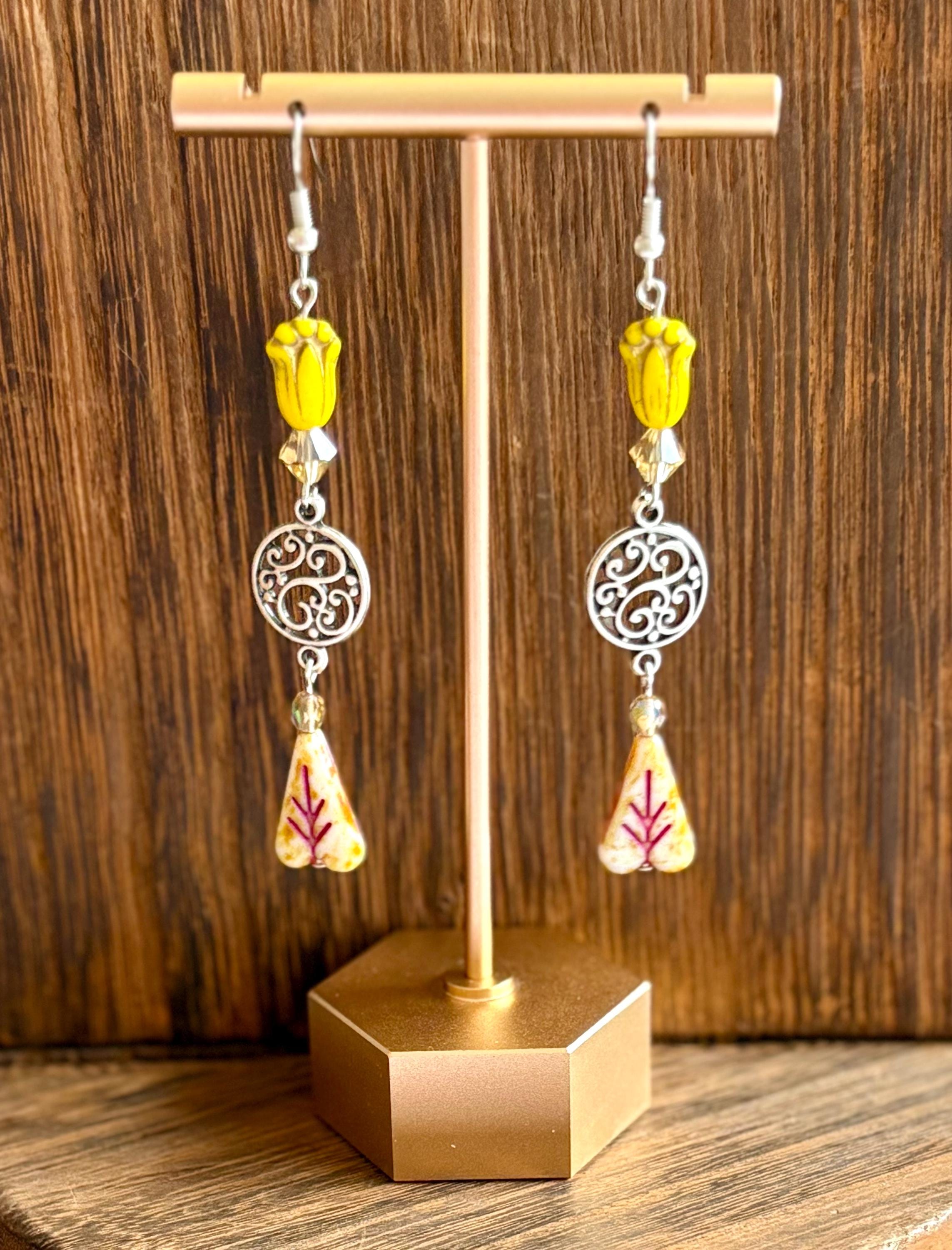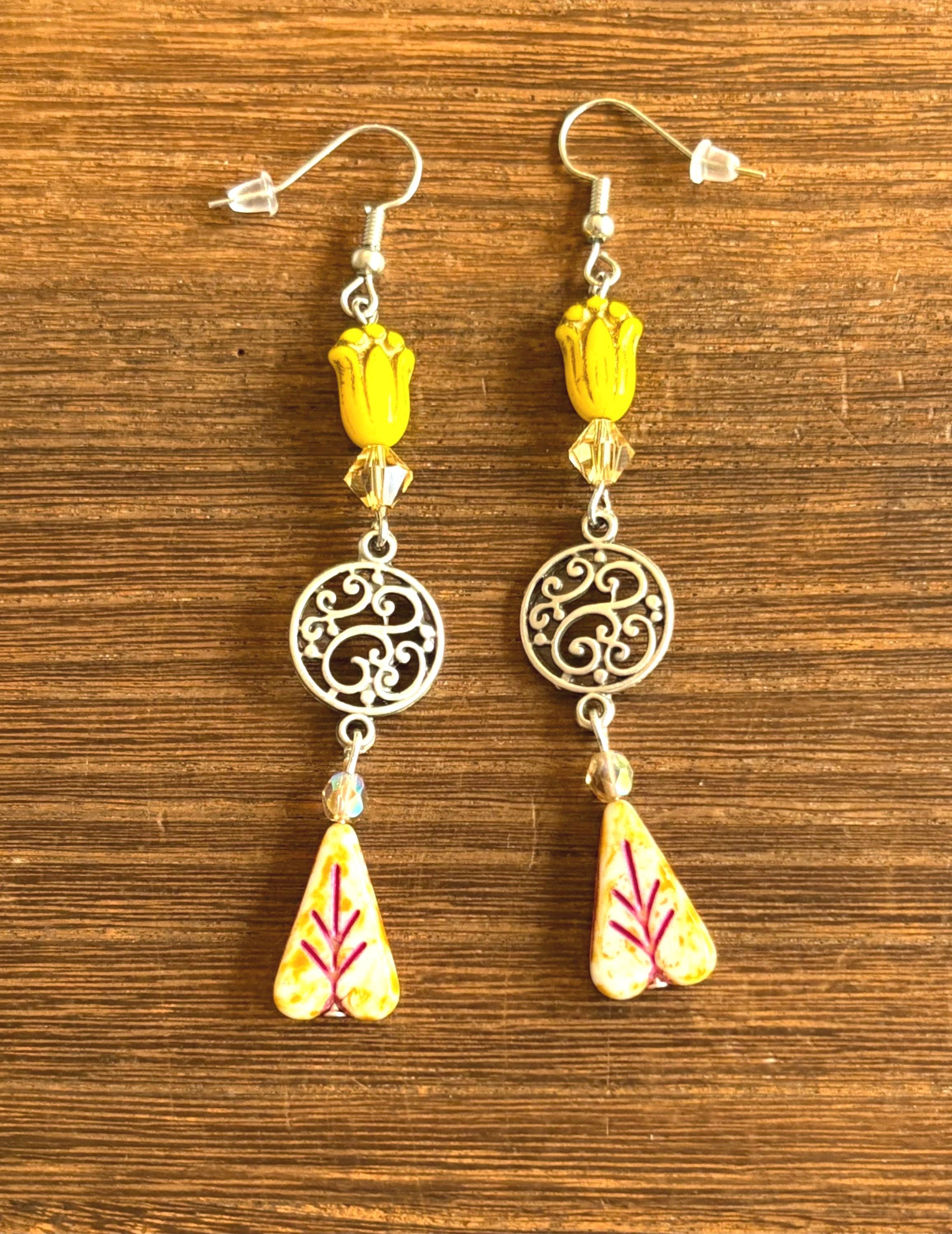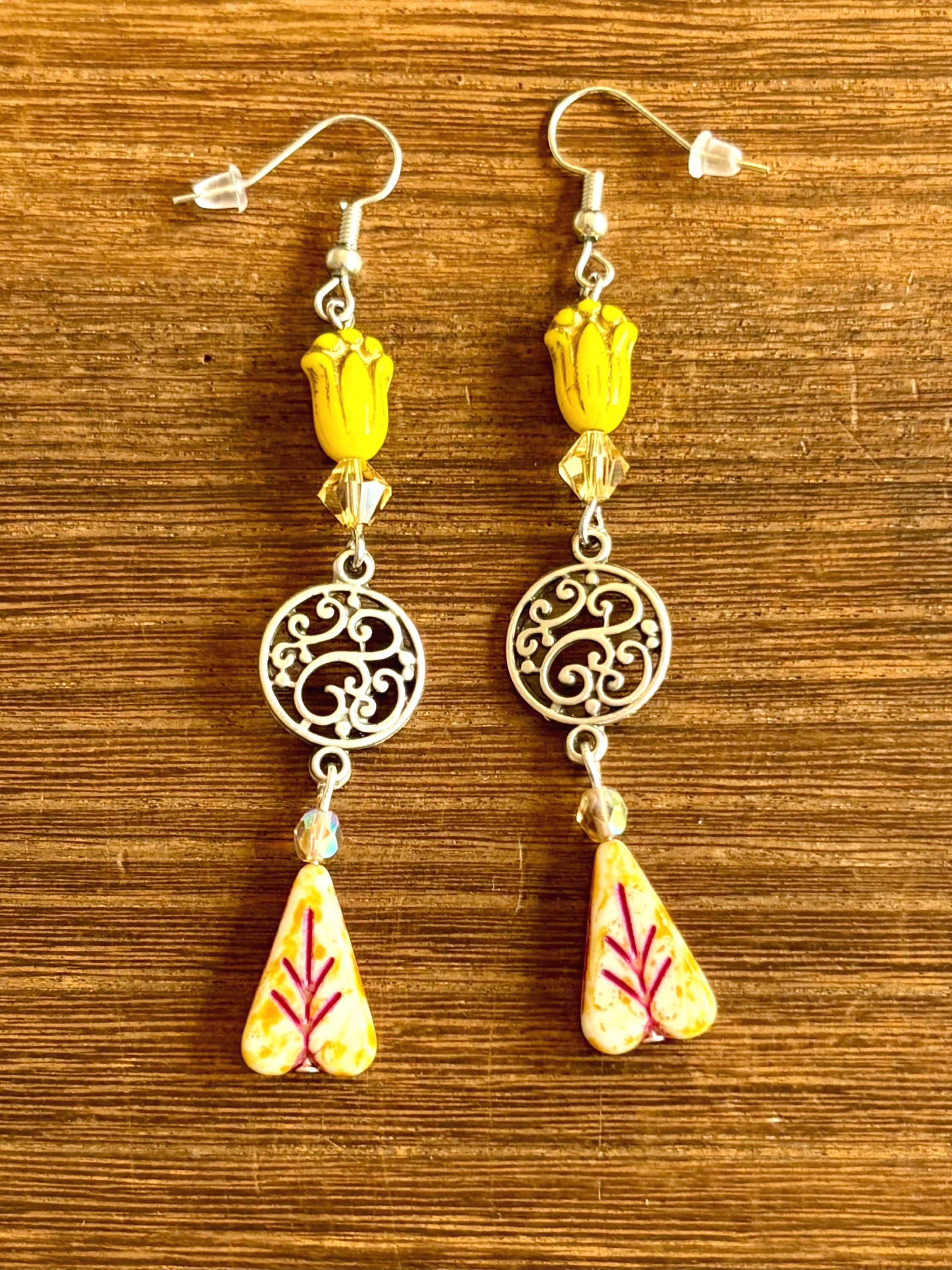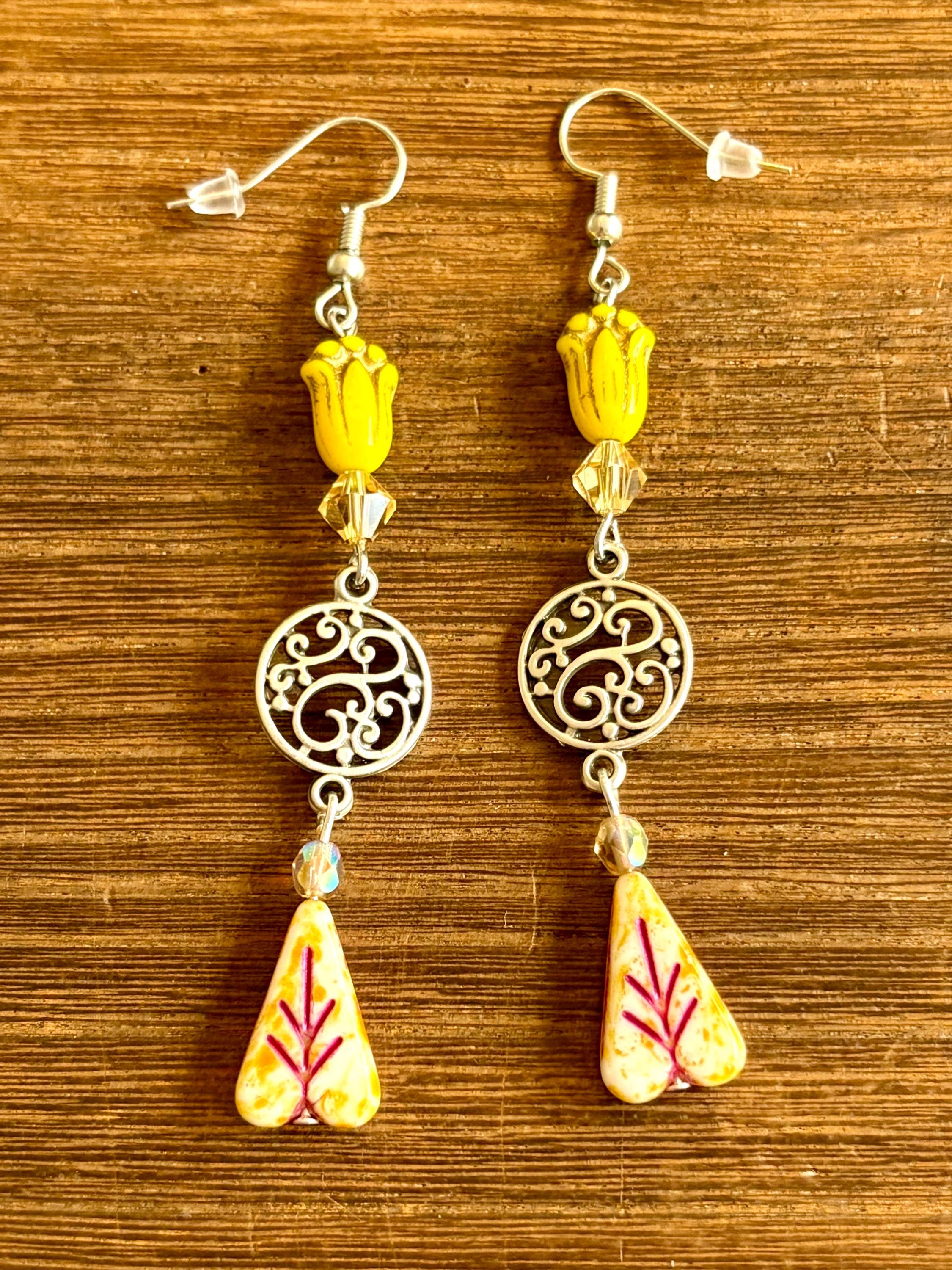 These are handmade, Gemstone earrings with faceted, Citrine Gemstones, Czech Glass, yellow tulips beads, in daffodil yellow with metallic accents, pretty little faceted Czech Glass crystals, ornate filigree charms in antique silver, Czech Glass heart beads in white with Picasso and pink wash wash. The ear wires are hypoallergenic, surgical 316L, silver tone, stainless steel, French hook ear wires with a decorative ball and coil accent, measuring 3.25 inches. Make them yours!