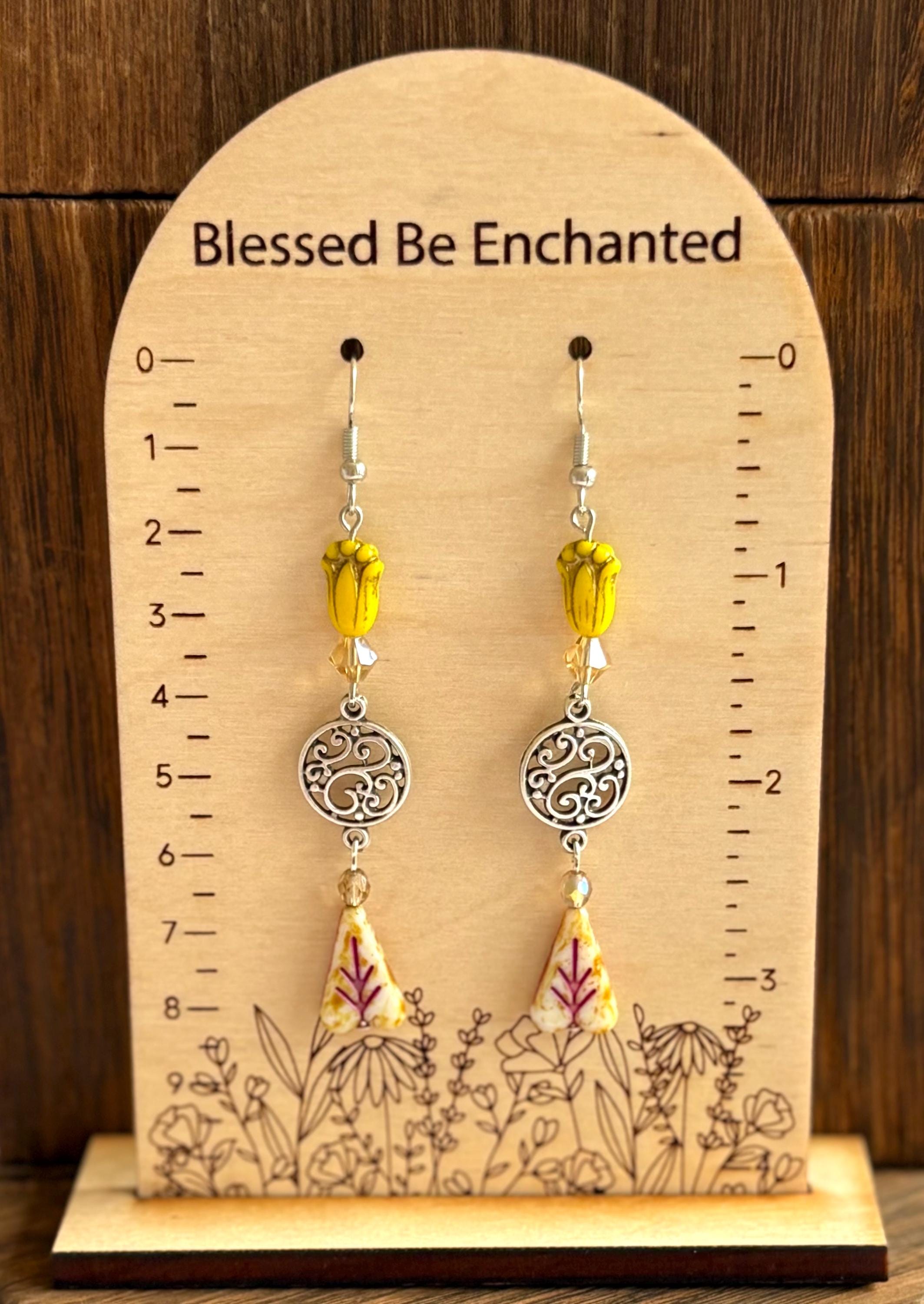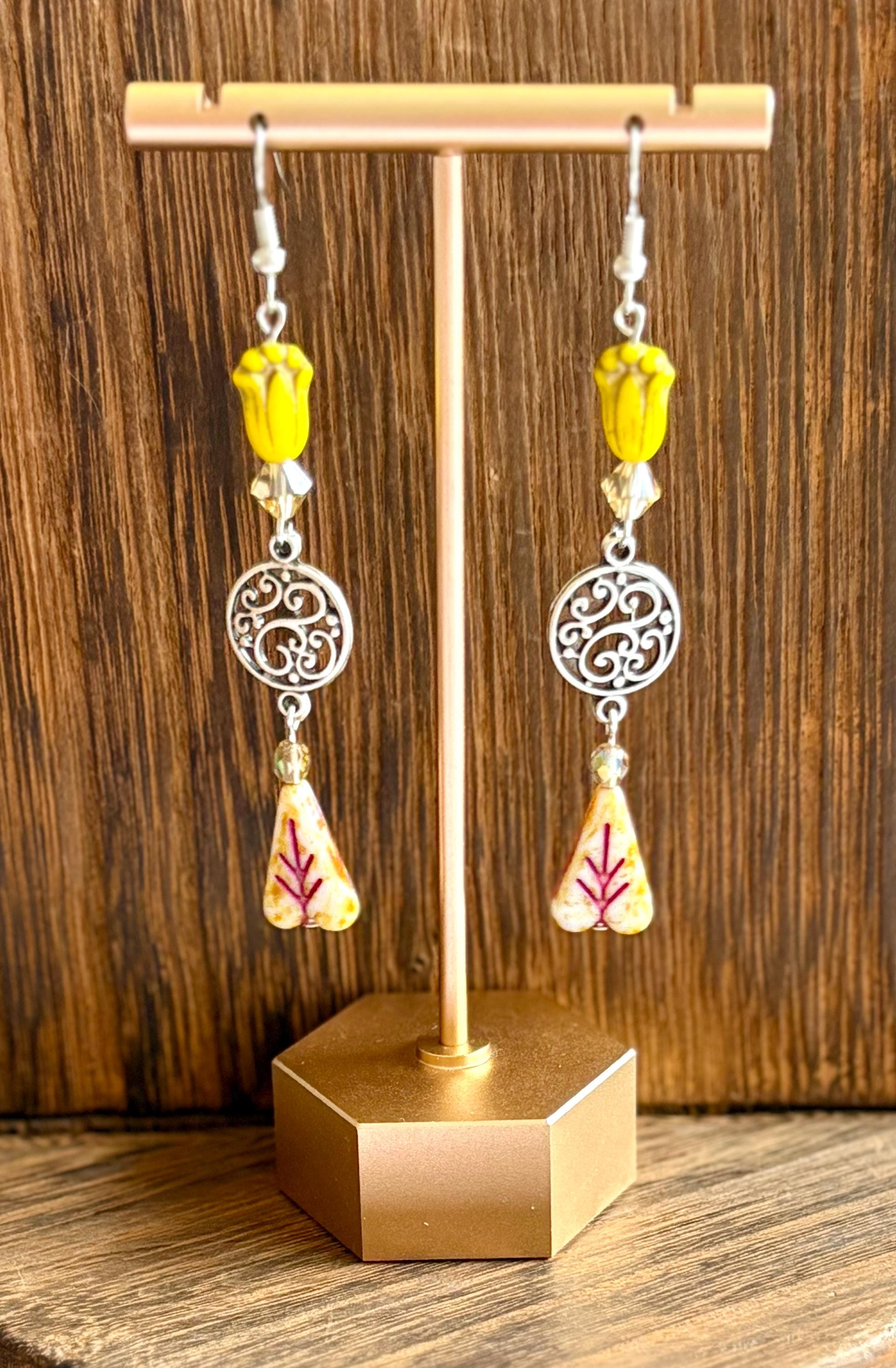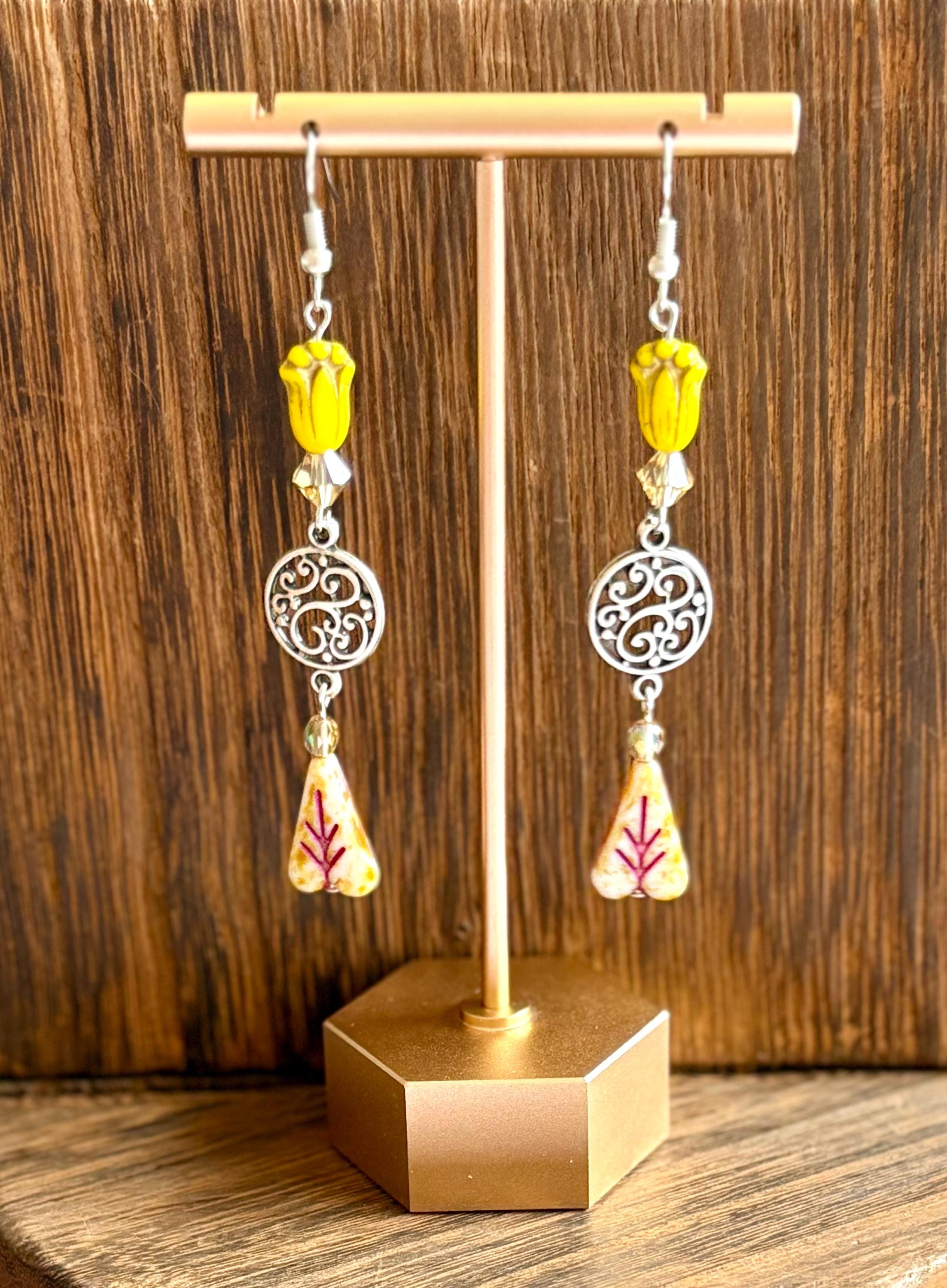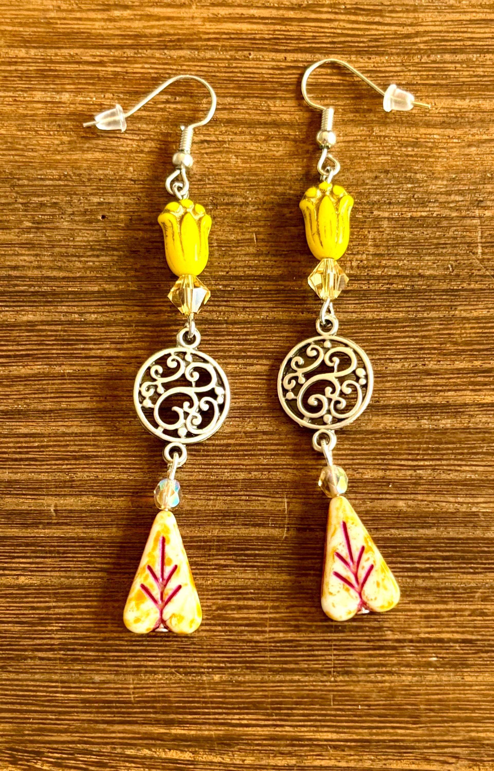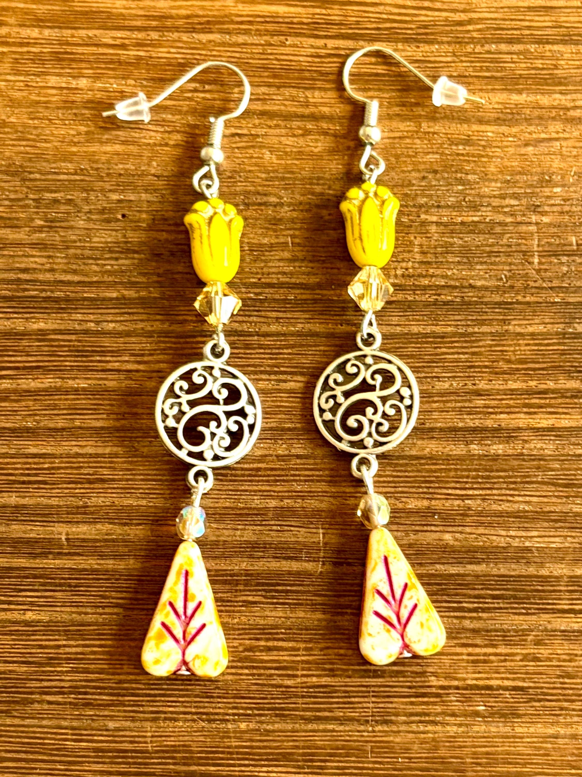 These are handmade, Gemstone earrings with faceted, Citrine Gemstones, Czech Glass, yellow tulips beads, in daffodil yellow with metallic accents, pretty little faceted Czech Glass crystals, ornate filigree charms in antique silver, Czech Glass heart beads in white with Picasso and pink wash wash. The ear wires are hypoallergenic, surgical 316L, silver tone, stainless steel, French hook ear wires with a decorative ball and coil accent, measuring 3.25 inches. Make them yours!