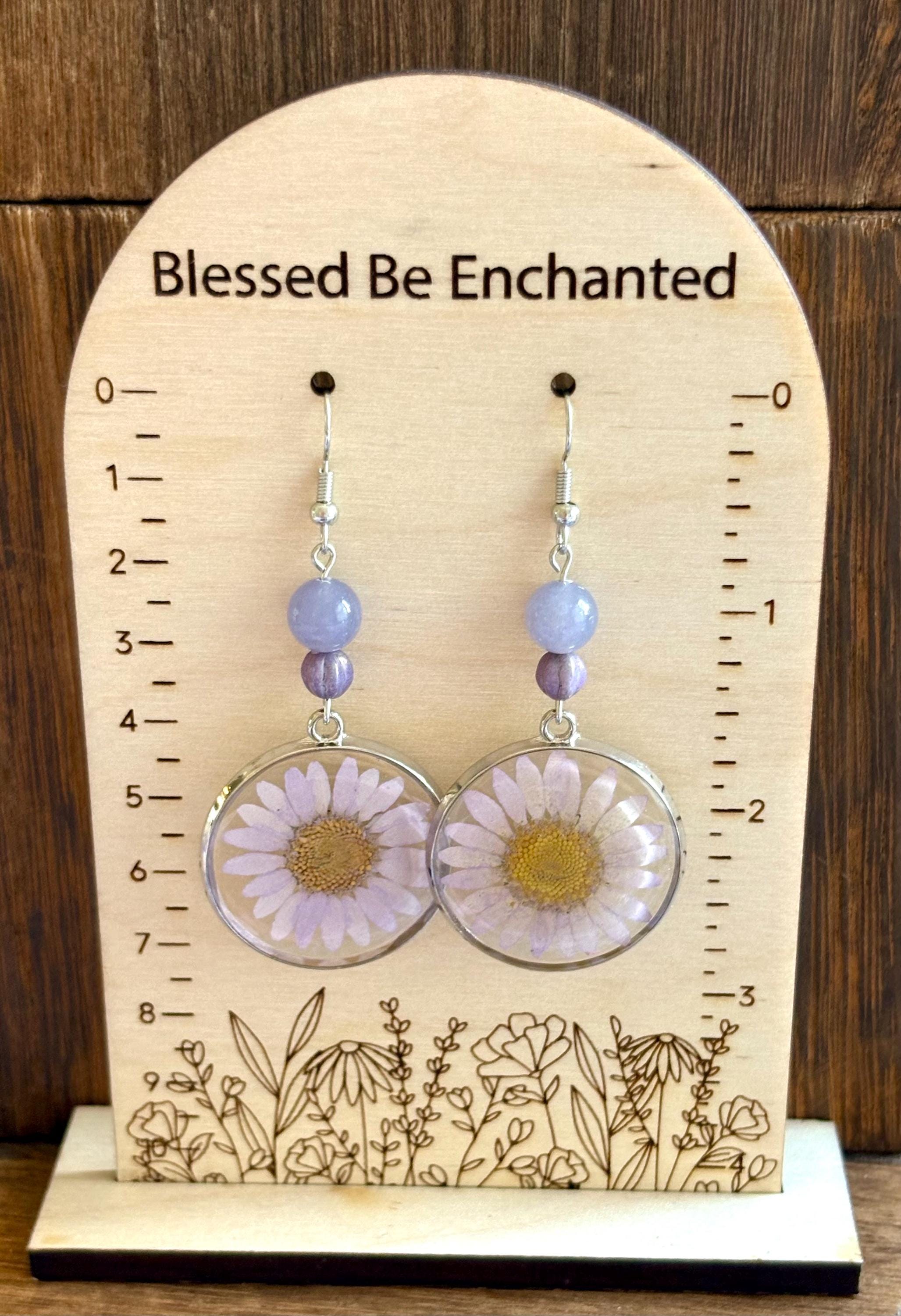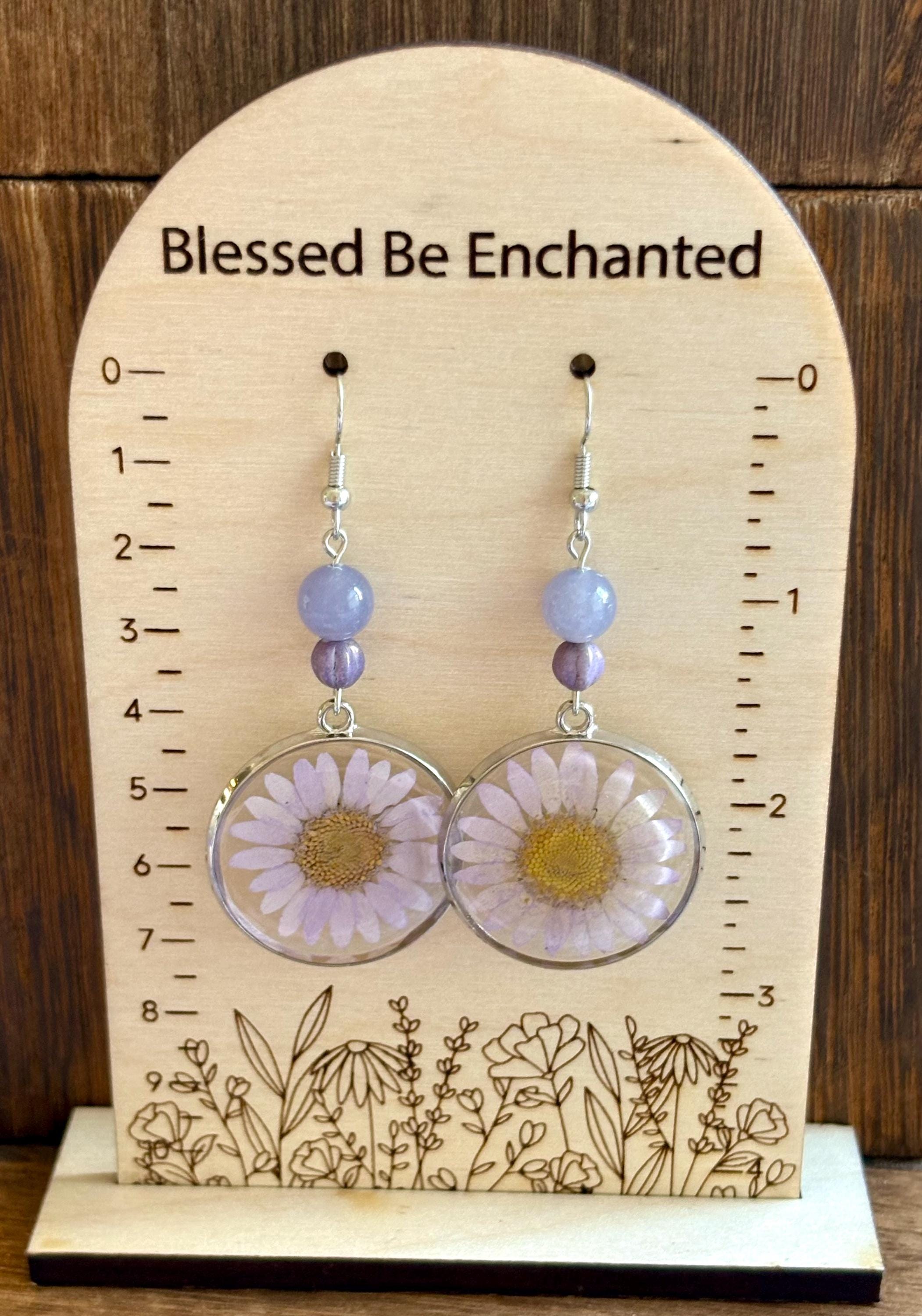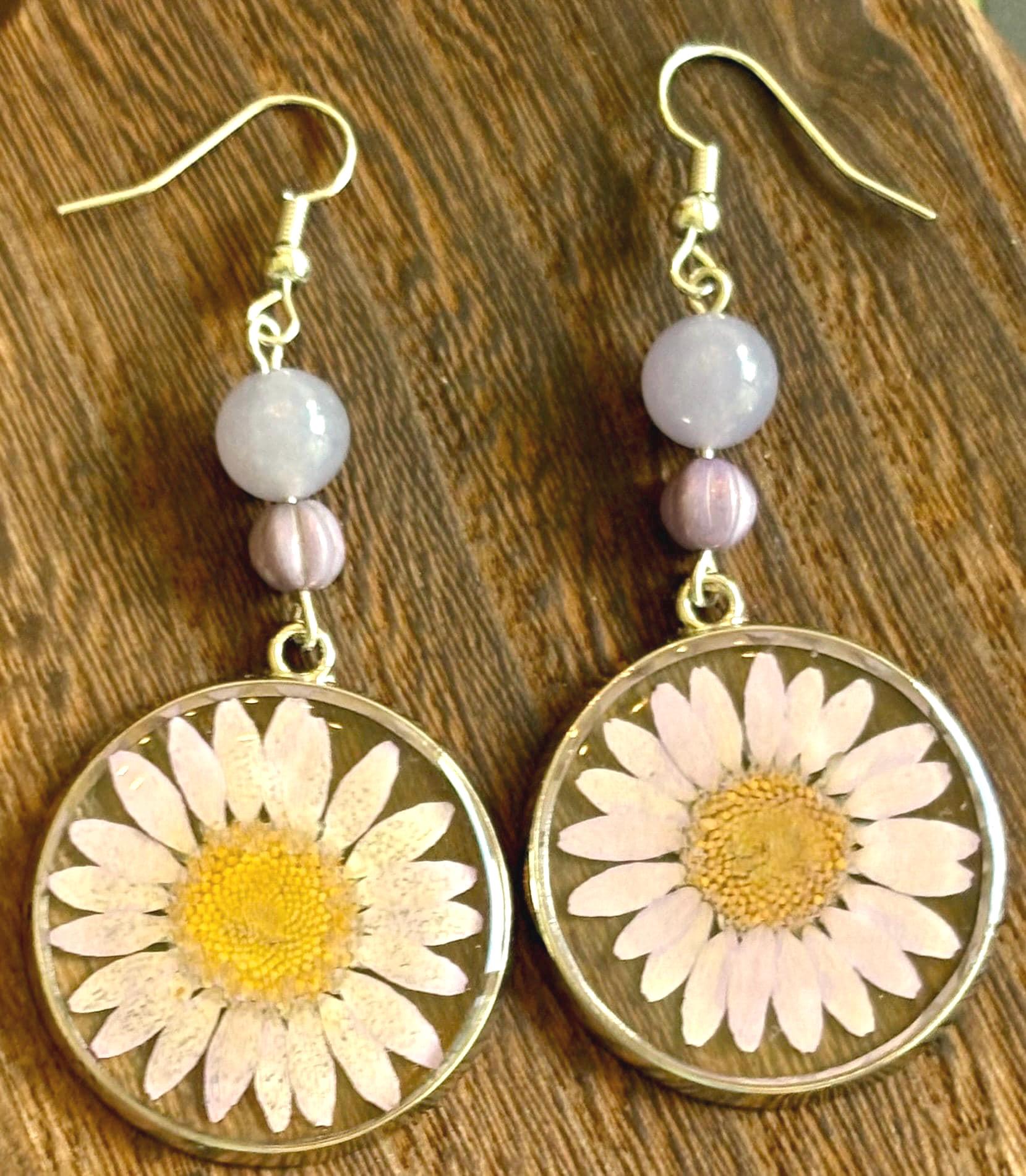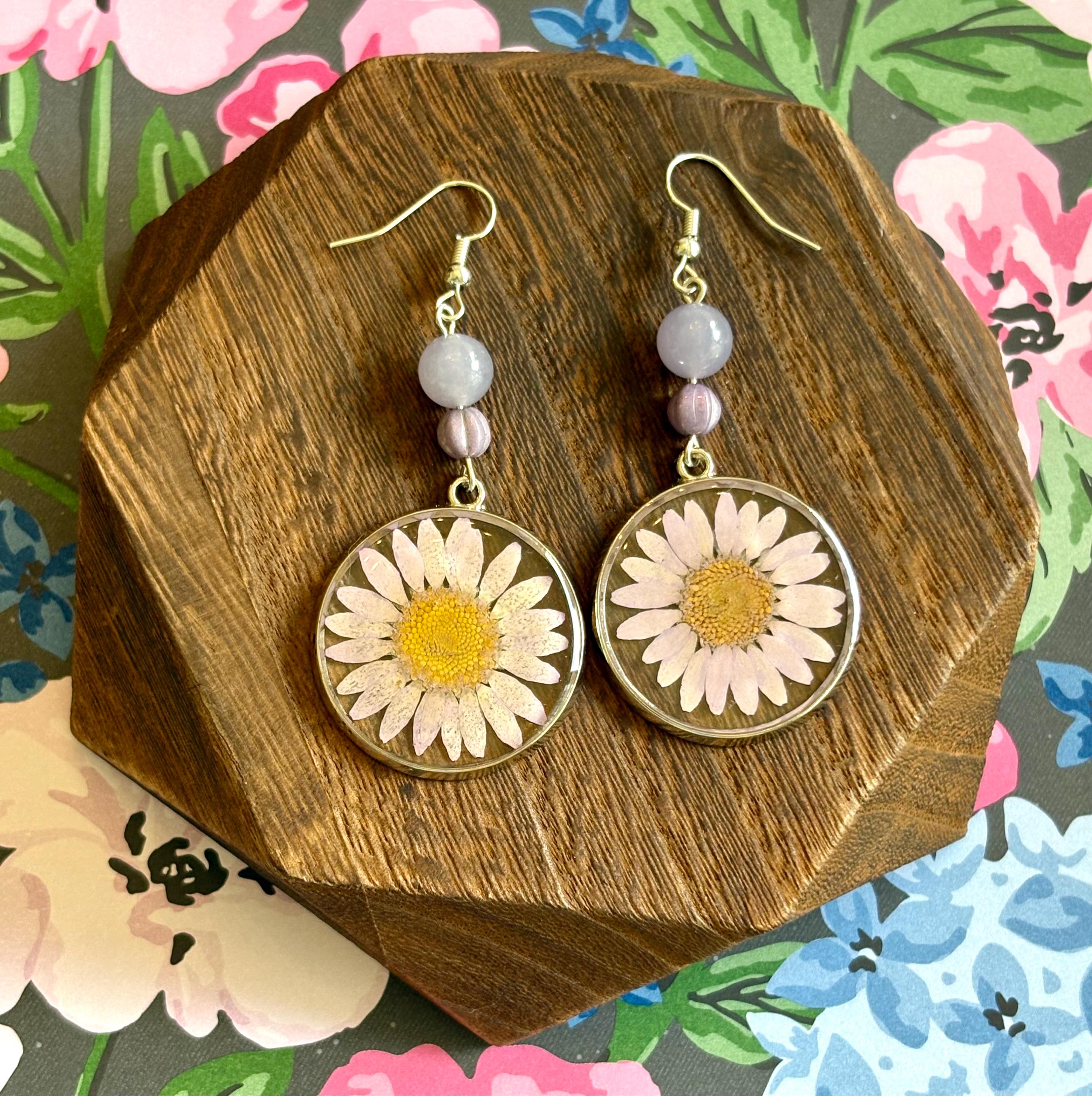 These are handmade, Gemstone earrings, with pretty Tanzanian Lepidolite Gemstones, lavender Czech Glass melon beads, and silver tone, real, dried pressed daisy flowers,in light lavender, measuring 2 7/8 inches. The ear wires are hypoallergenic, surgical 316L, silver tone, stainless steel, French hook ear wires with a decorative ball and coil accent. Make them yours!