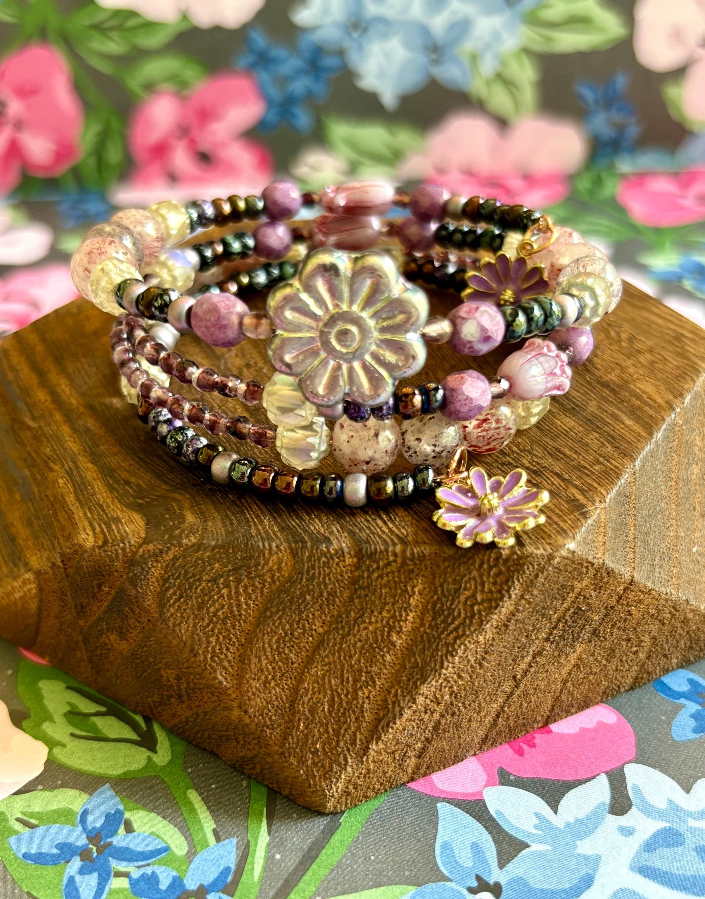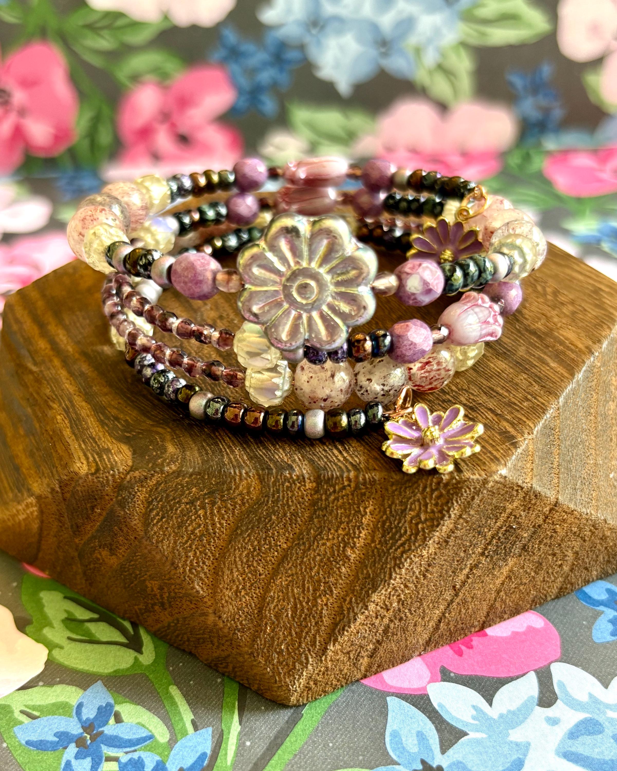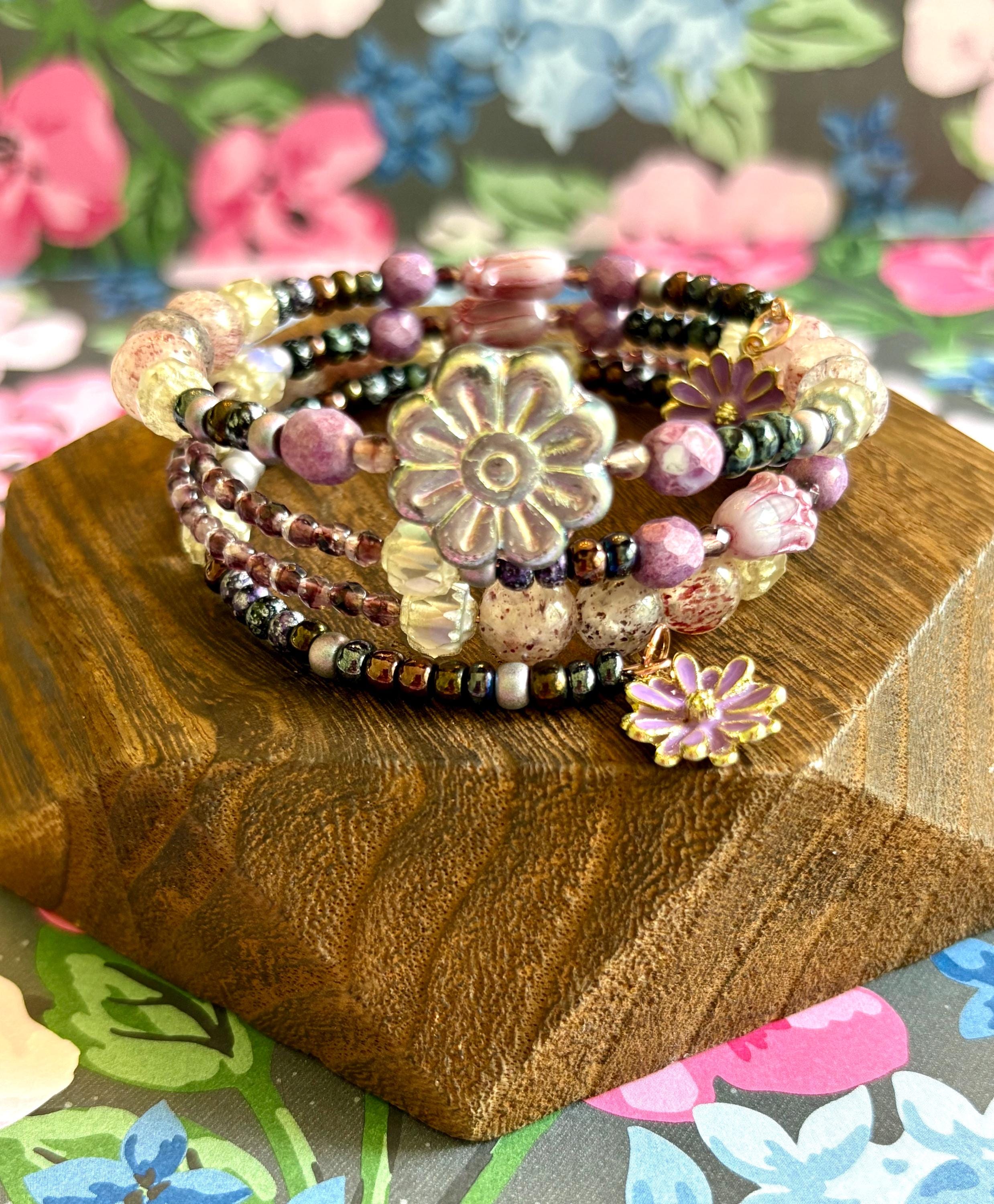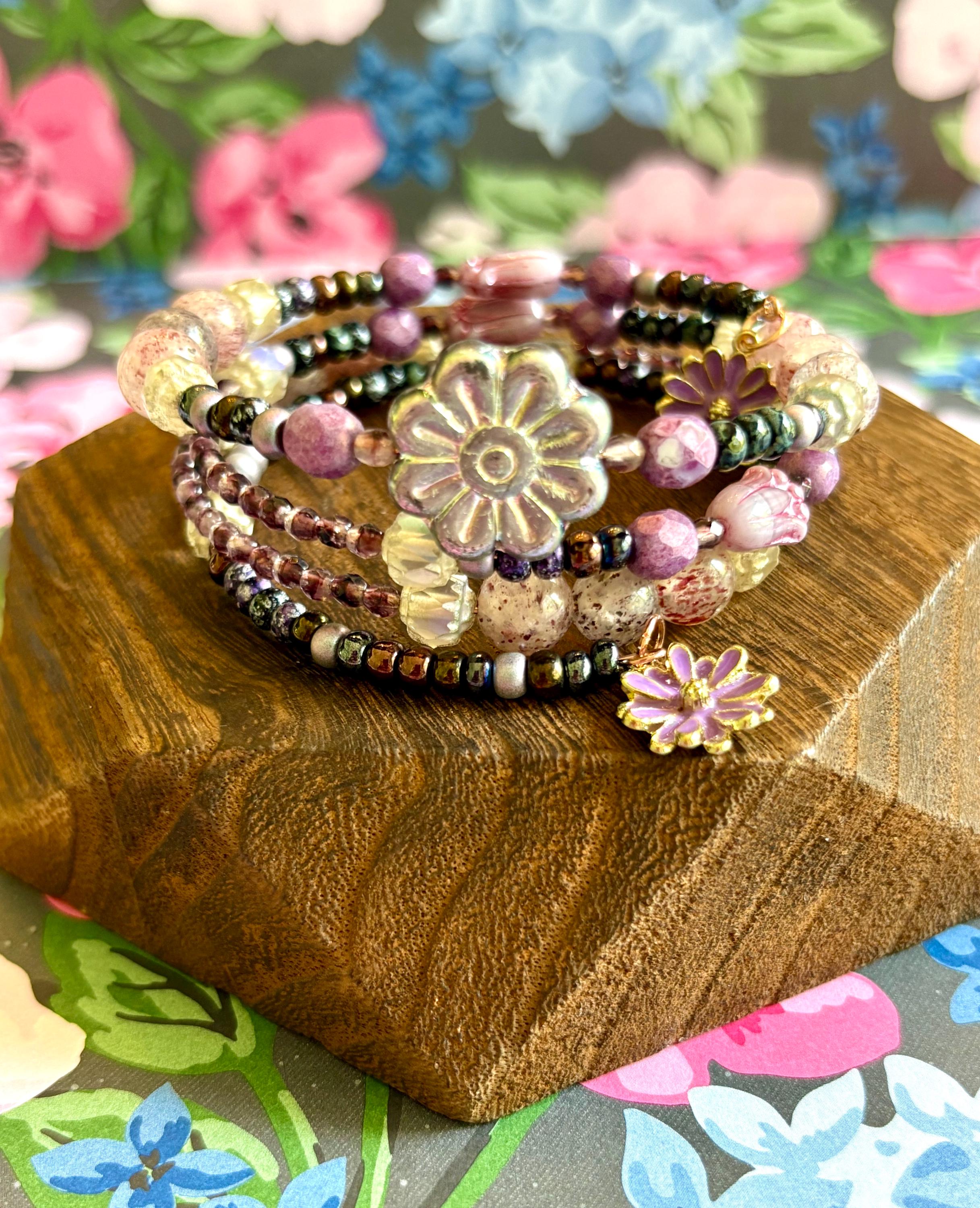 A beautiful four row, memory wire, wrap Gemstone Bracelet adorned with Strawberry Quartz Gemstones, Czech Glass daisy and tulip flower beads, along with melon beads, Picasso mix seed beads with two gold tone, enamel, purple flower charms!