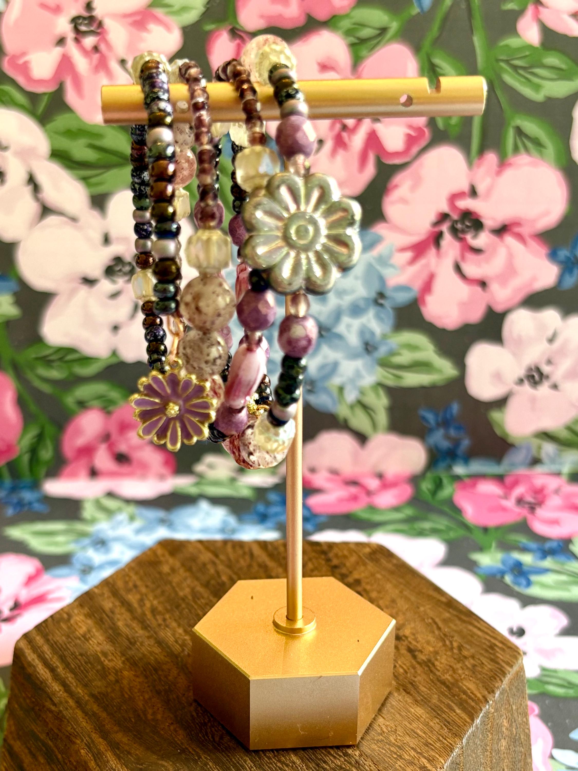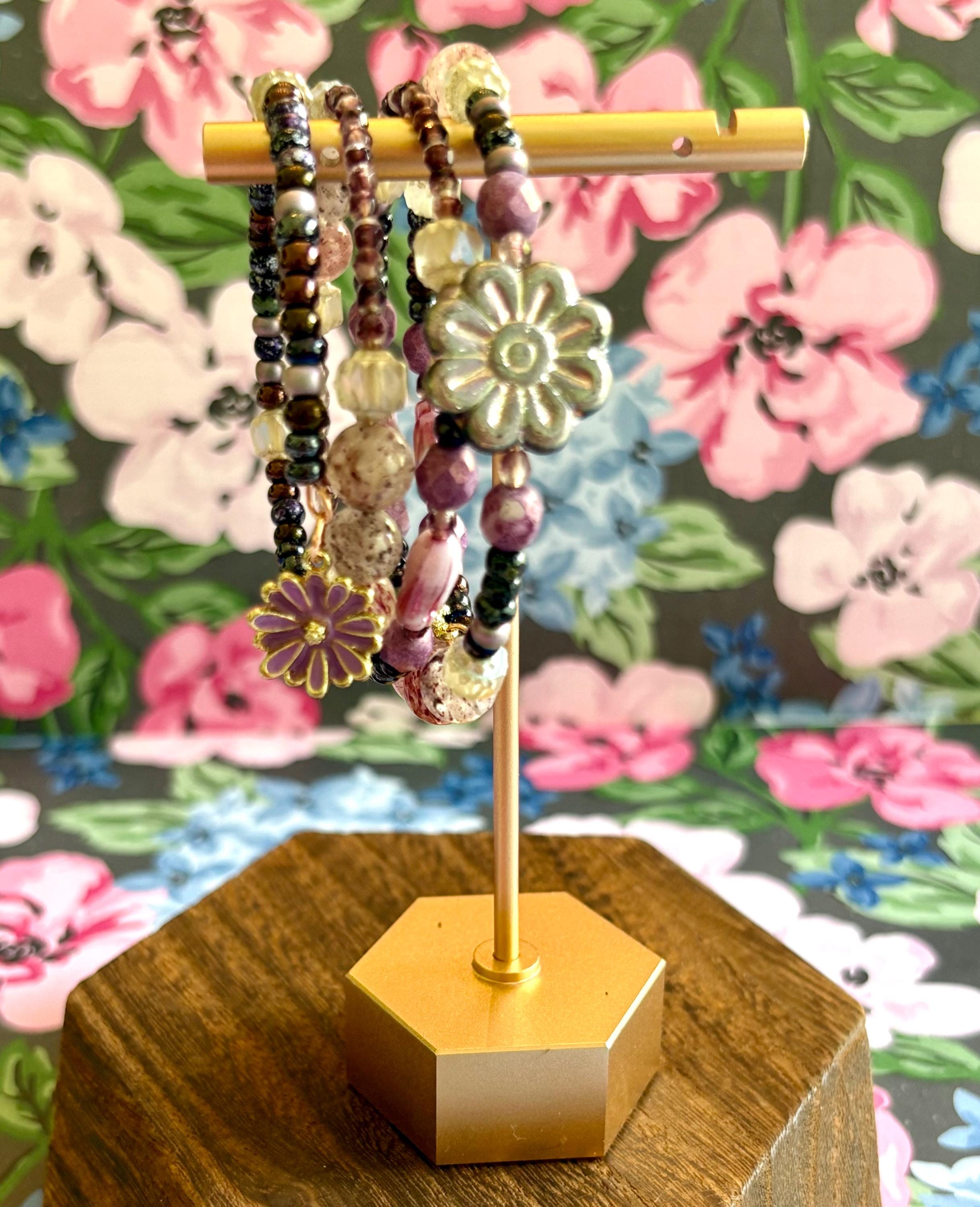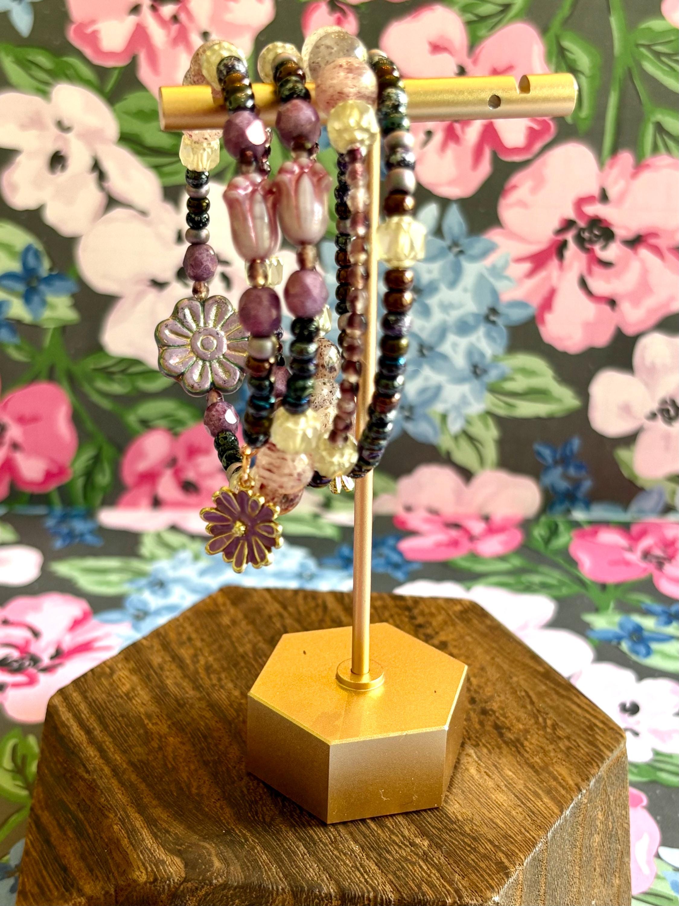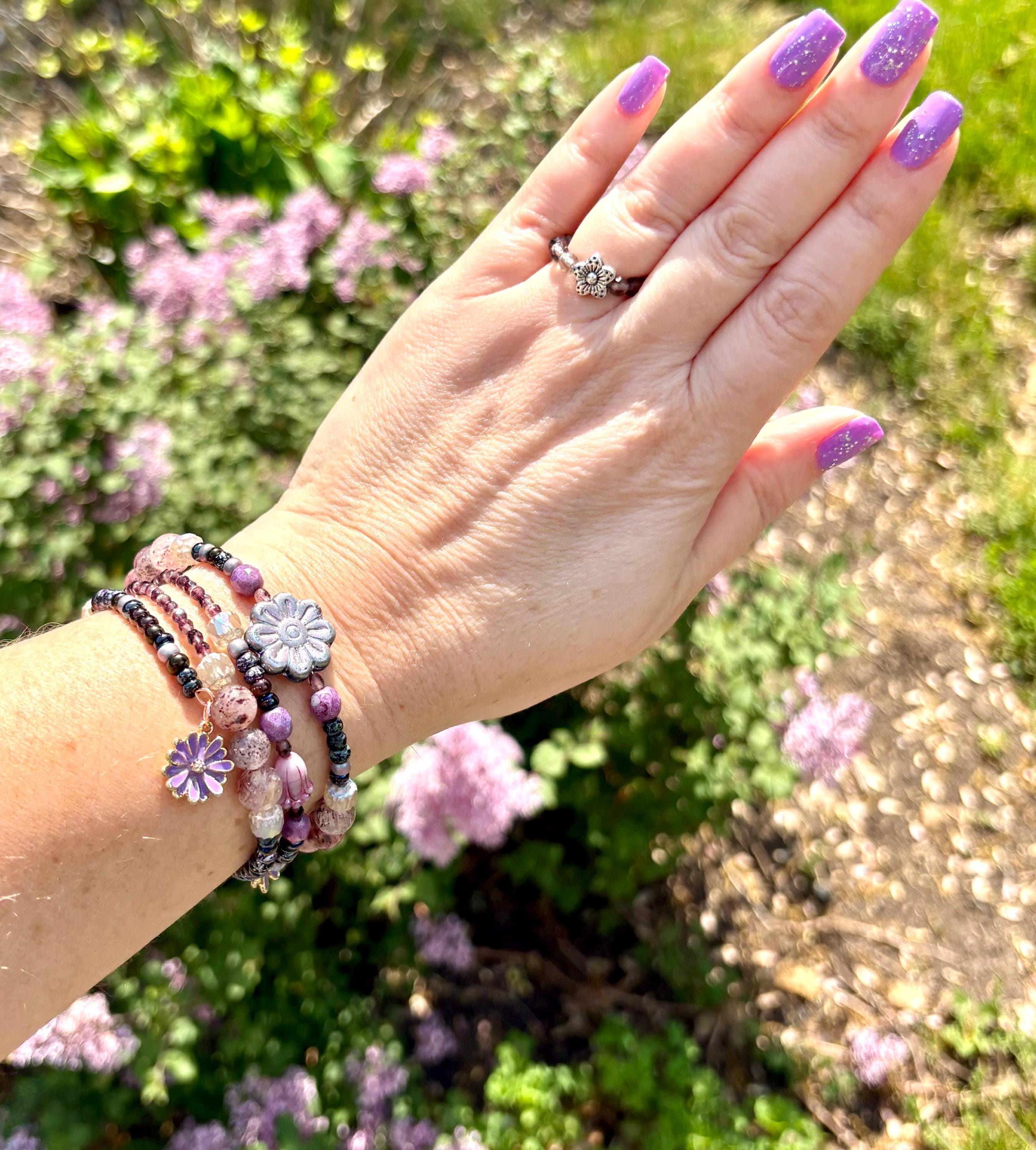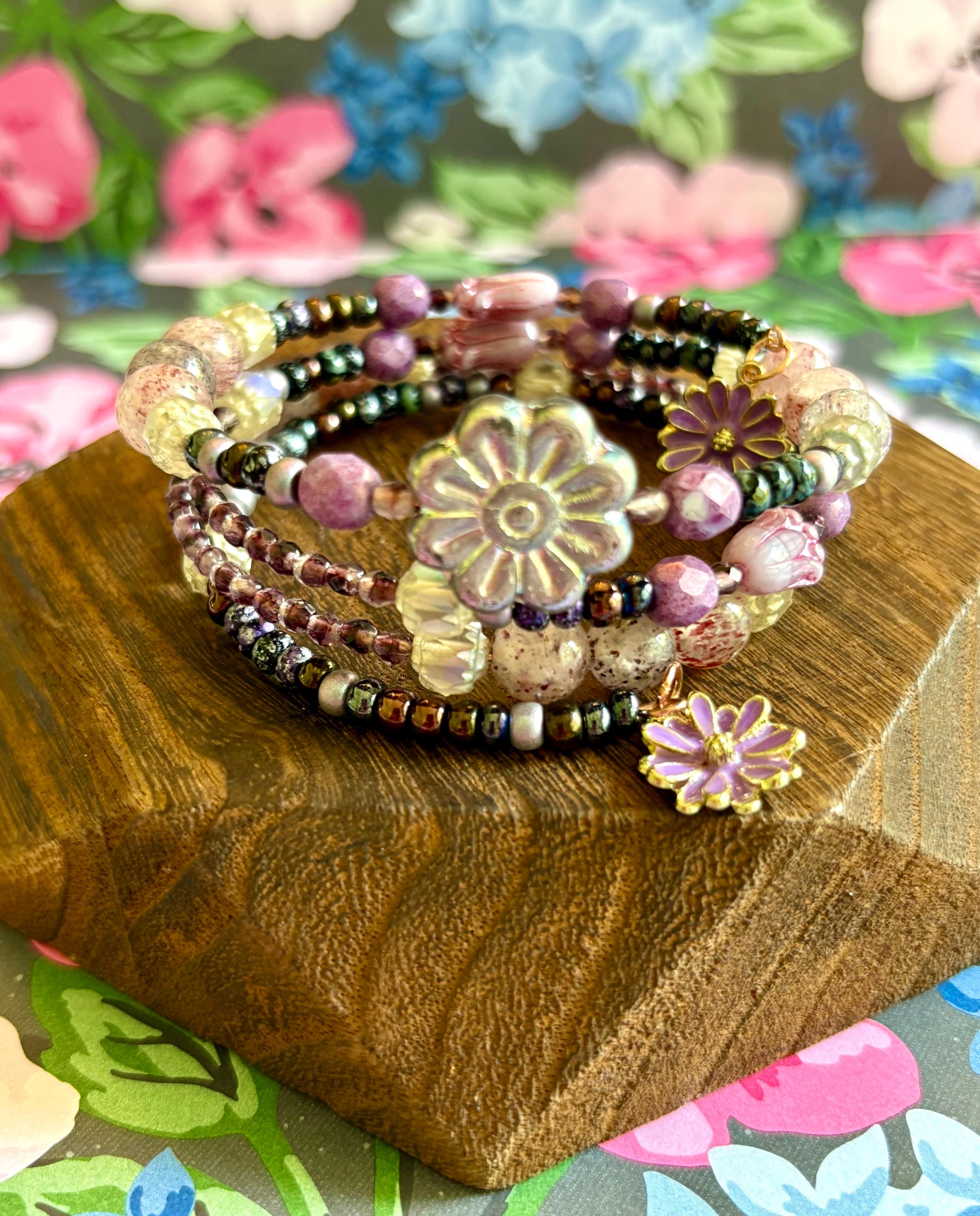 A beautiful four row, memory wire, wrap Gemstone Bracelet adorned with Strawberry Quartz Gemstones, Czech Glass daisy and tulip flower beads, along with melon beads, Picasso mix seed beads with two gold tone, enamel, purple flower charms!