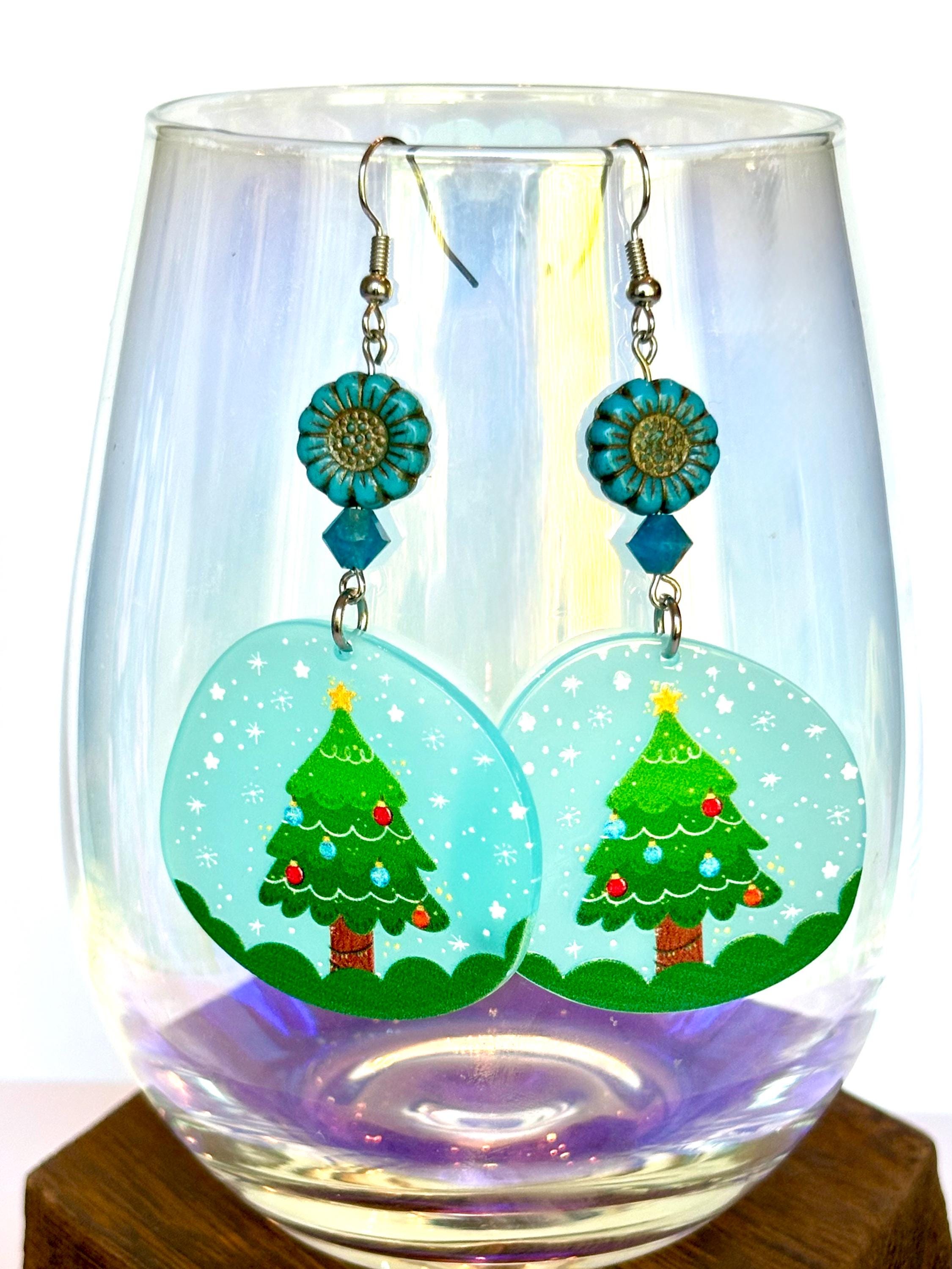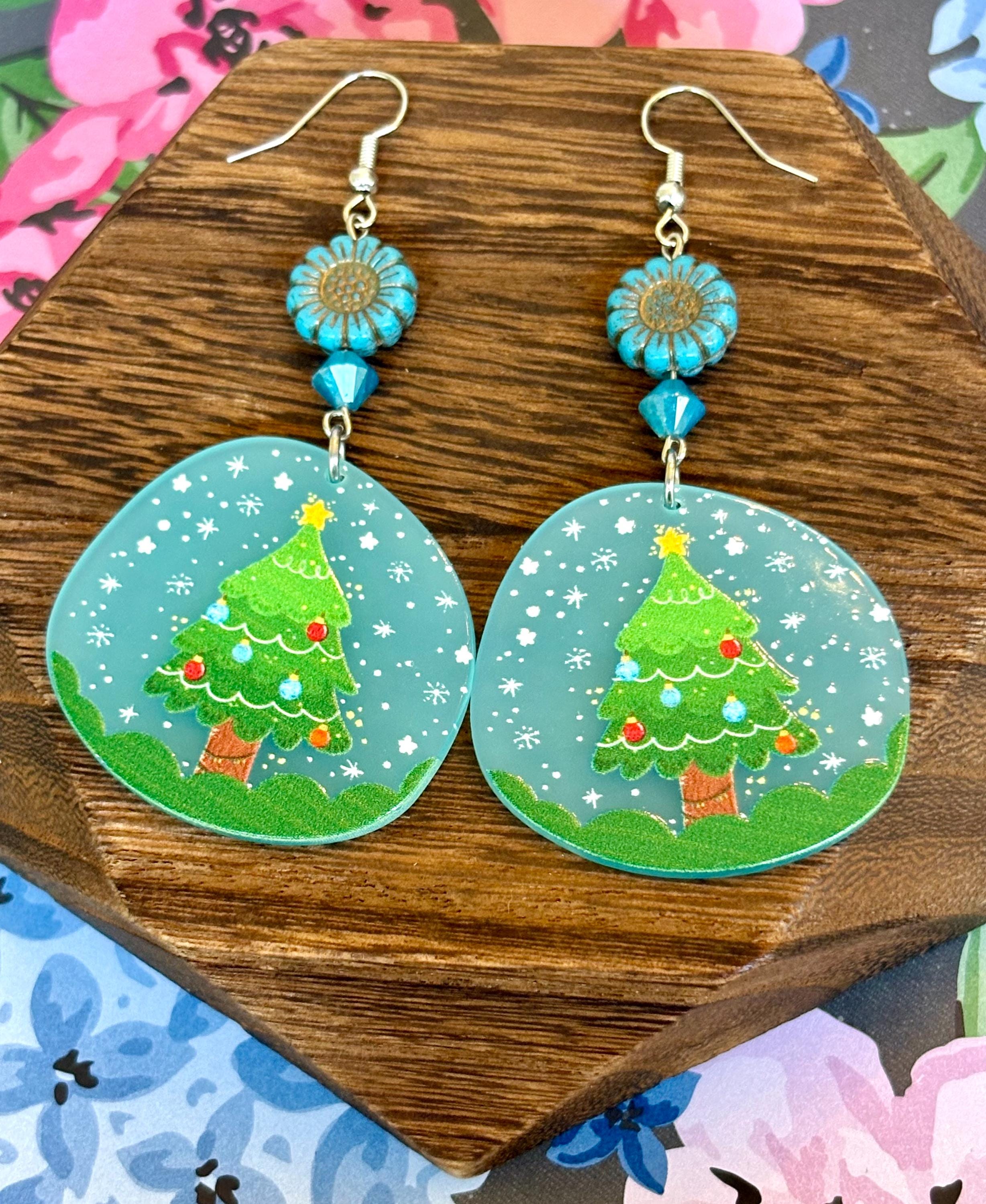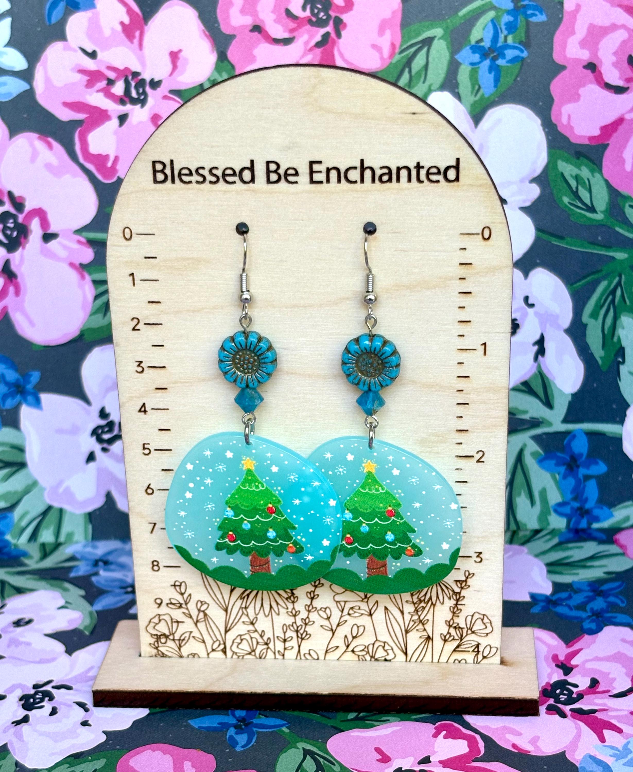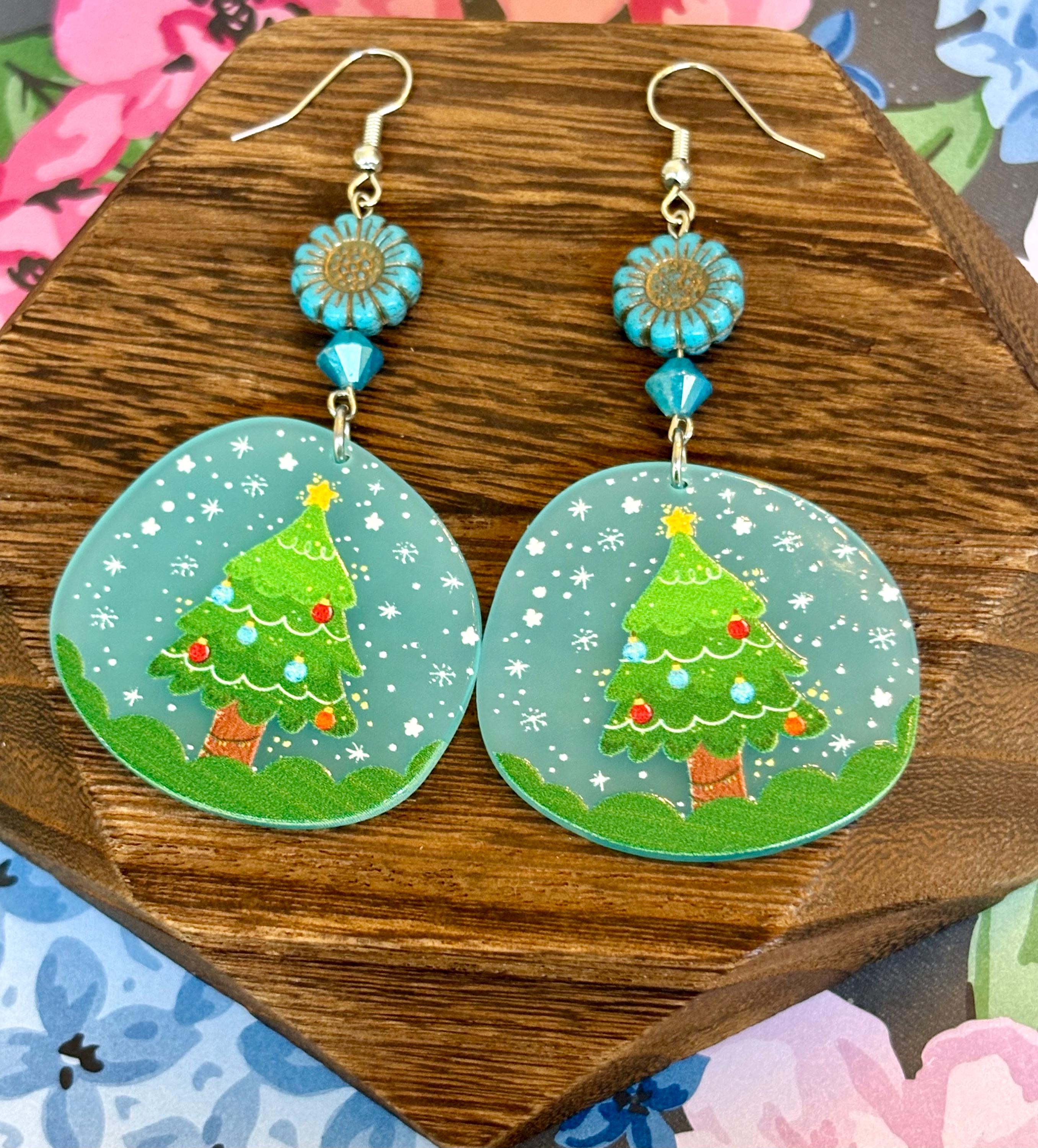 Frosted Holiday Glow Earrings – Apatite Gemstones, Czech Glass Sunflowers & Acrylic Christmas Tree Pendants – 3.25” Hypoallergenic Silver Earrings