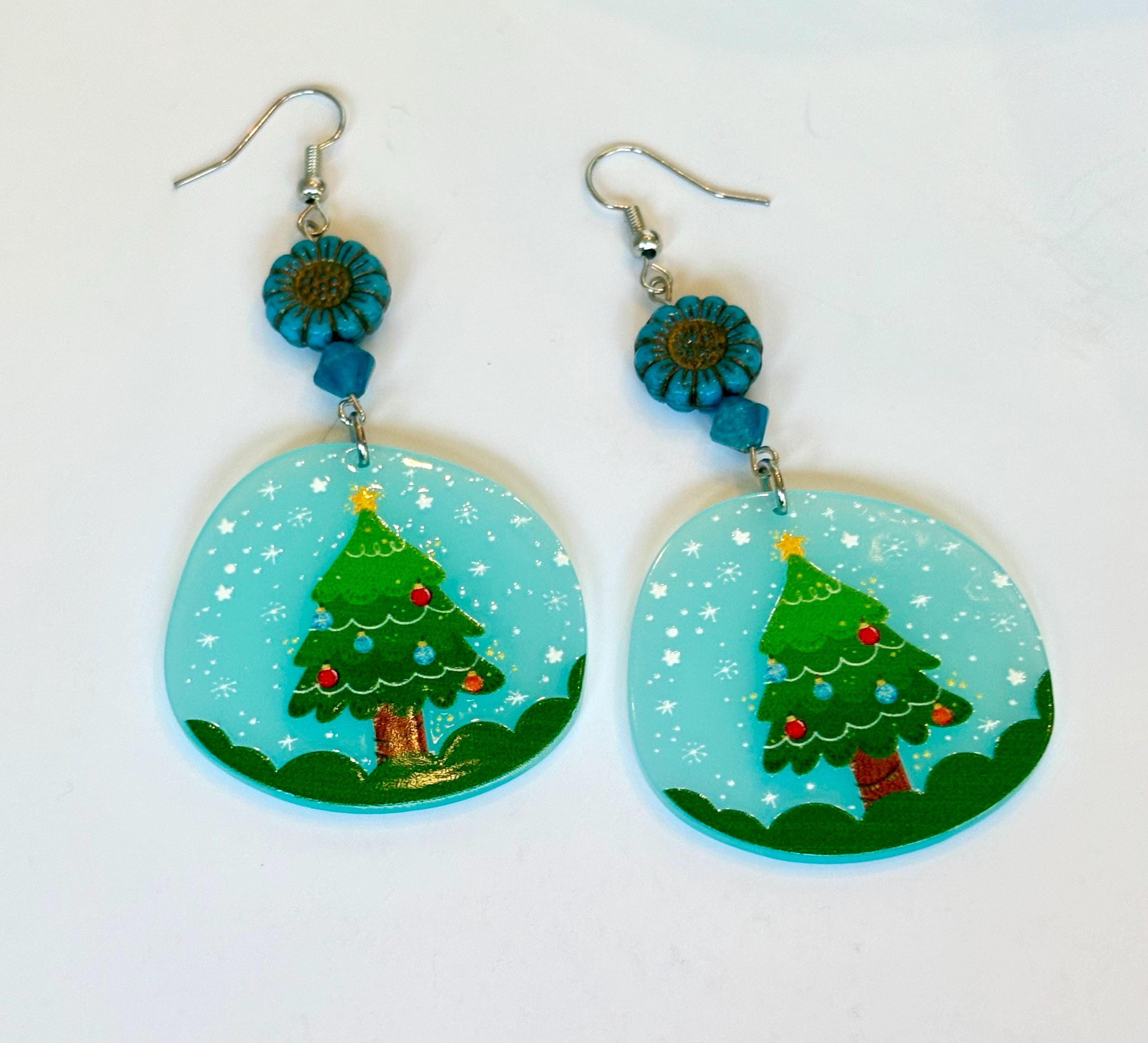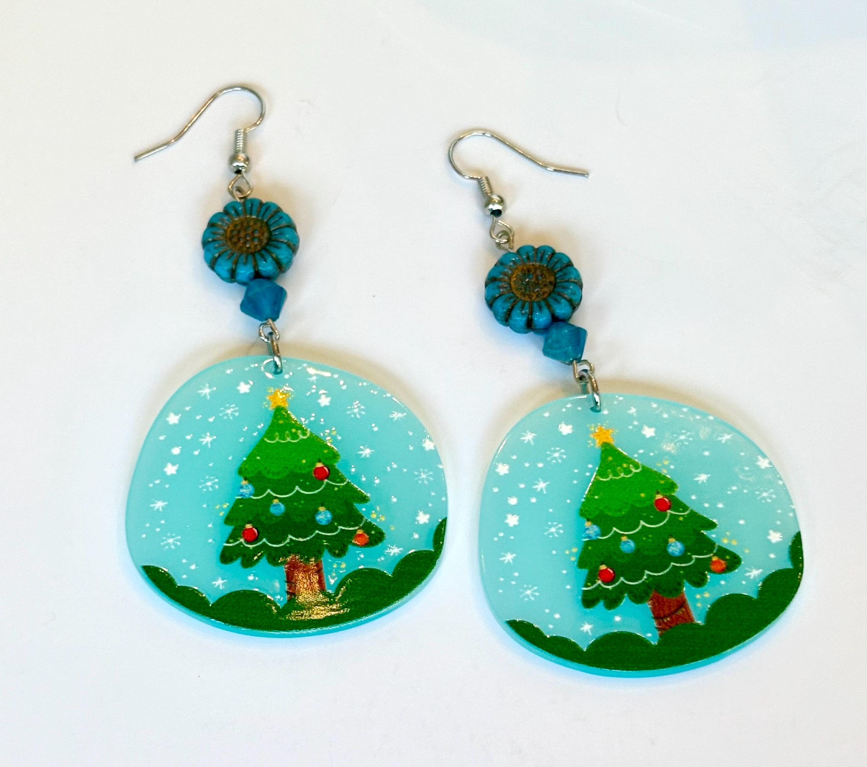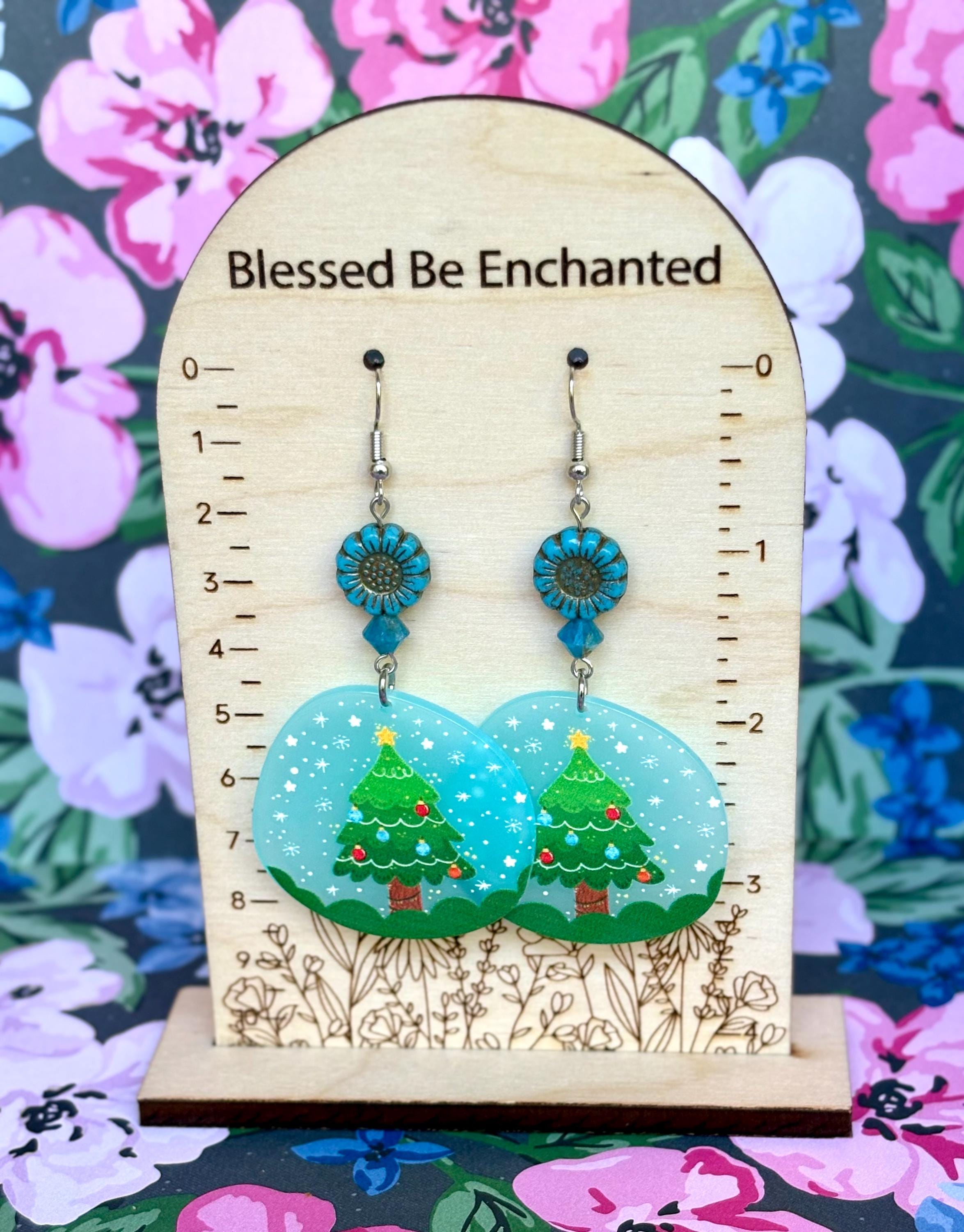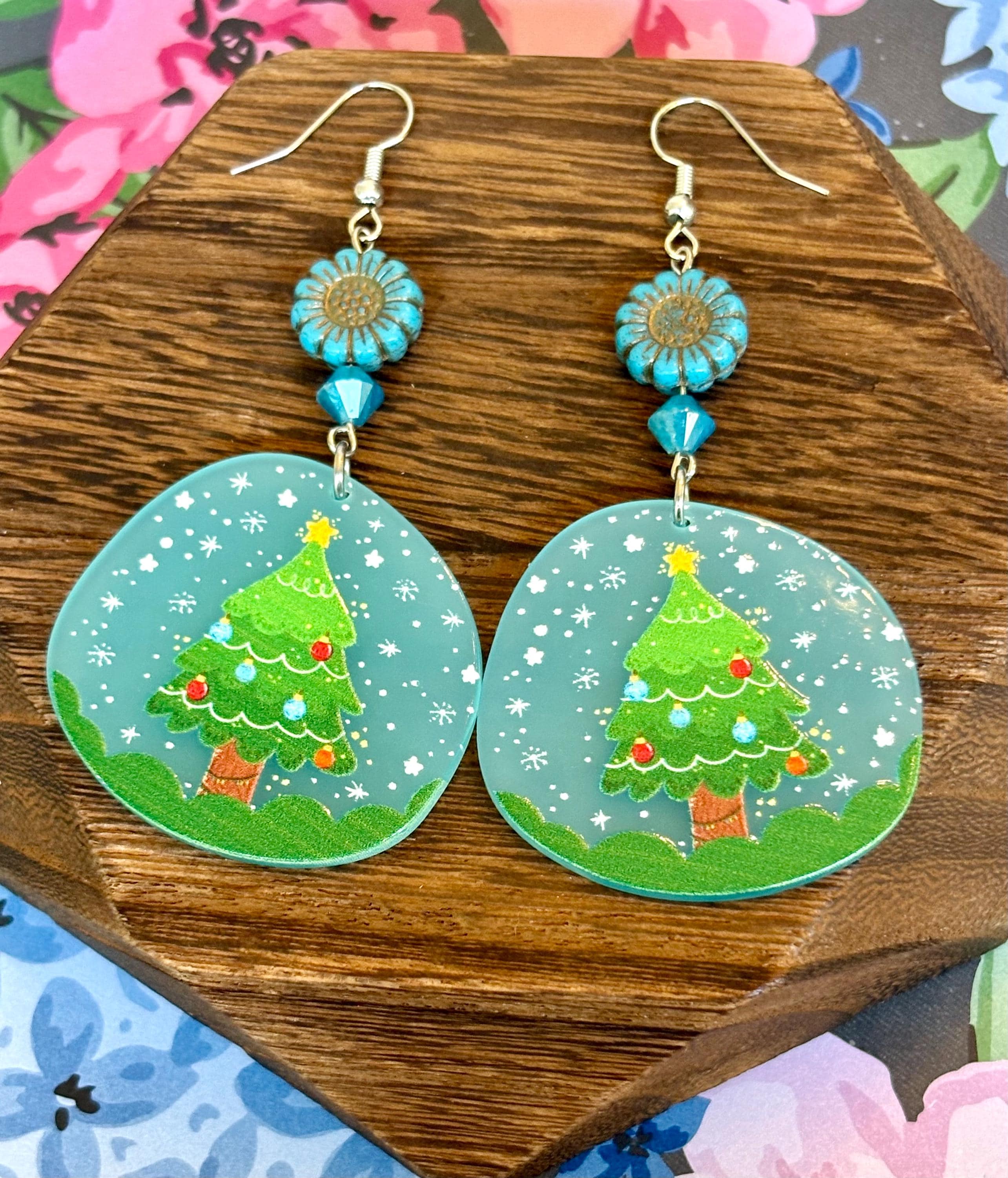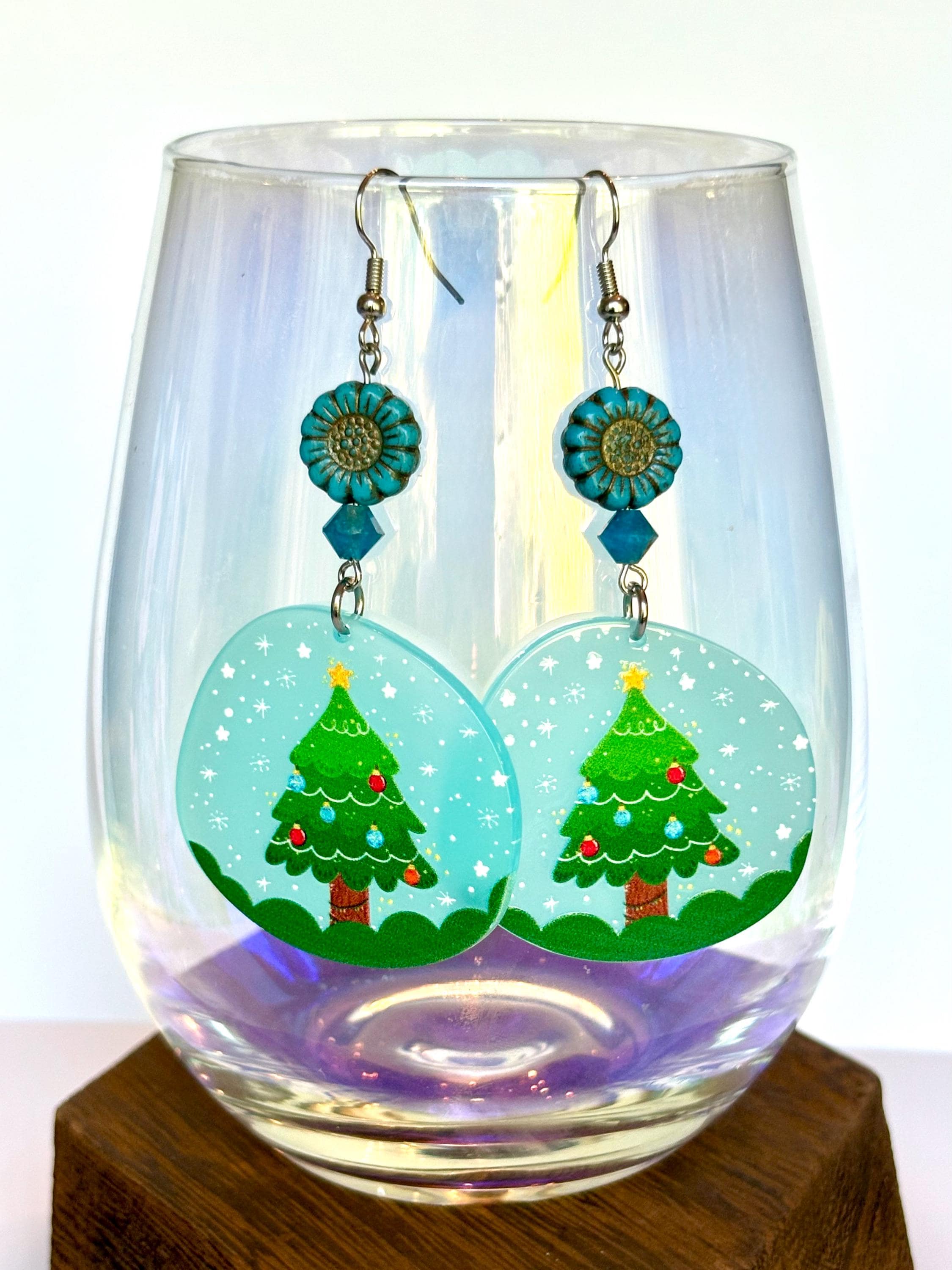 Frosted Holiday Glow Earrings – Apatite Gemstones, Czech Glass Sunflowers & Acrylic Christmas Tree Pendants – 3.25” Hypoallergenic Silver Earrings