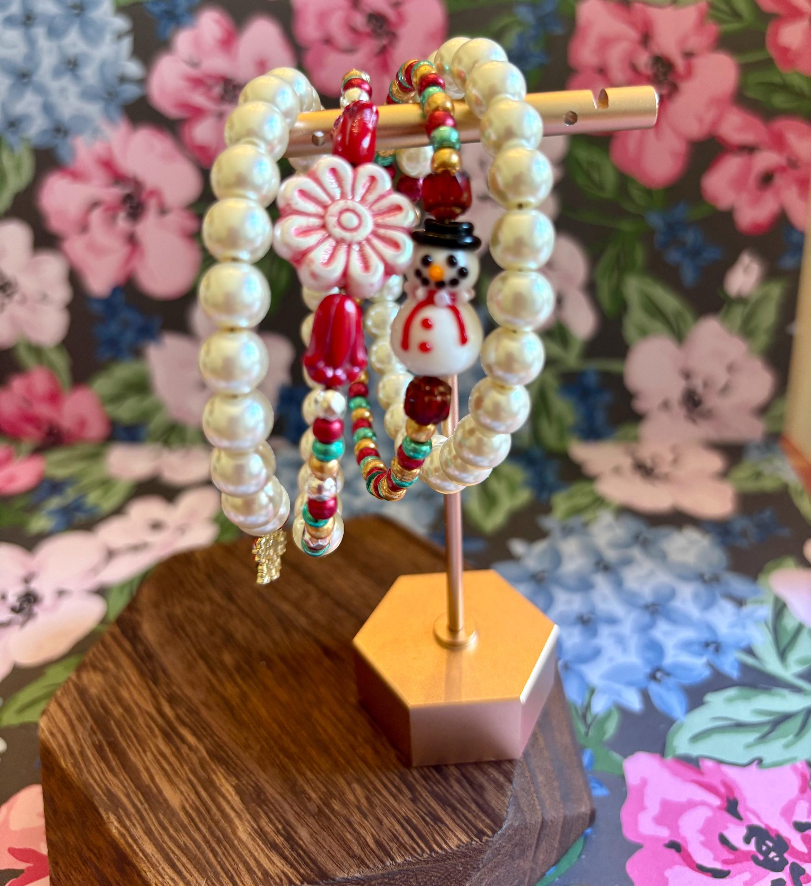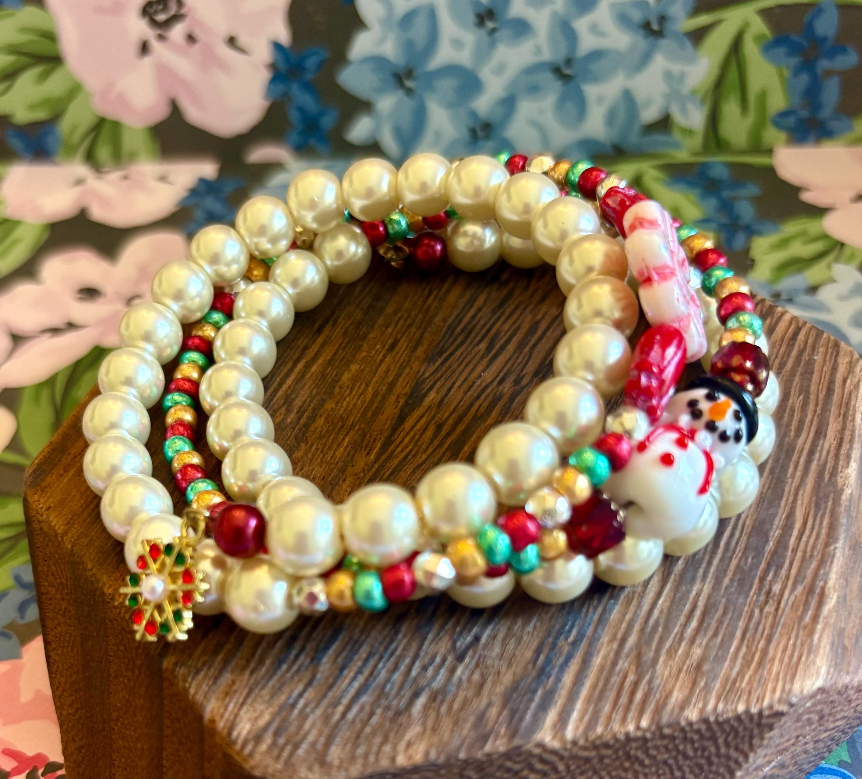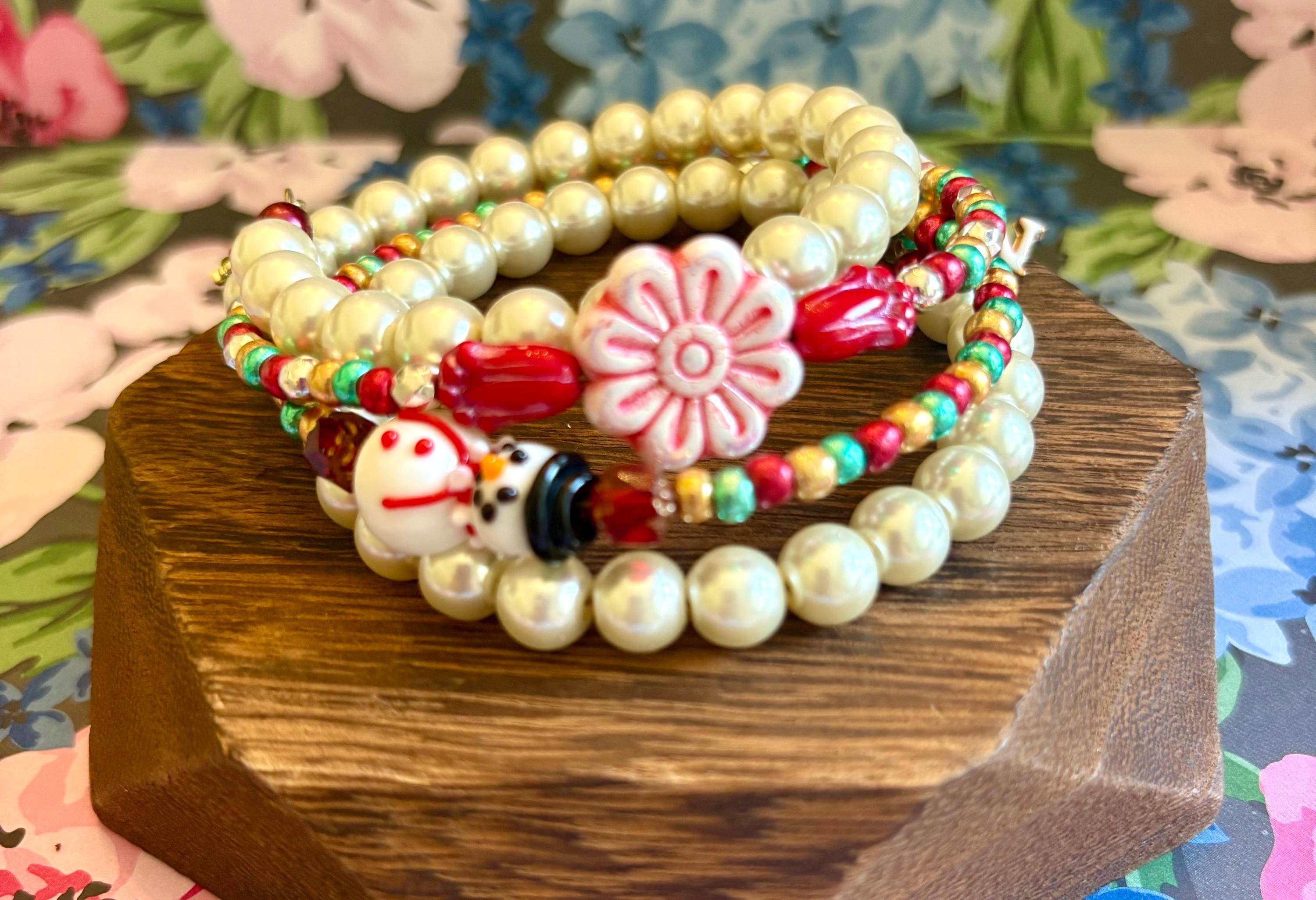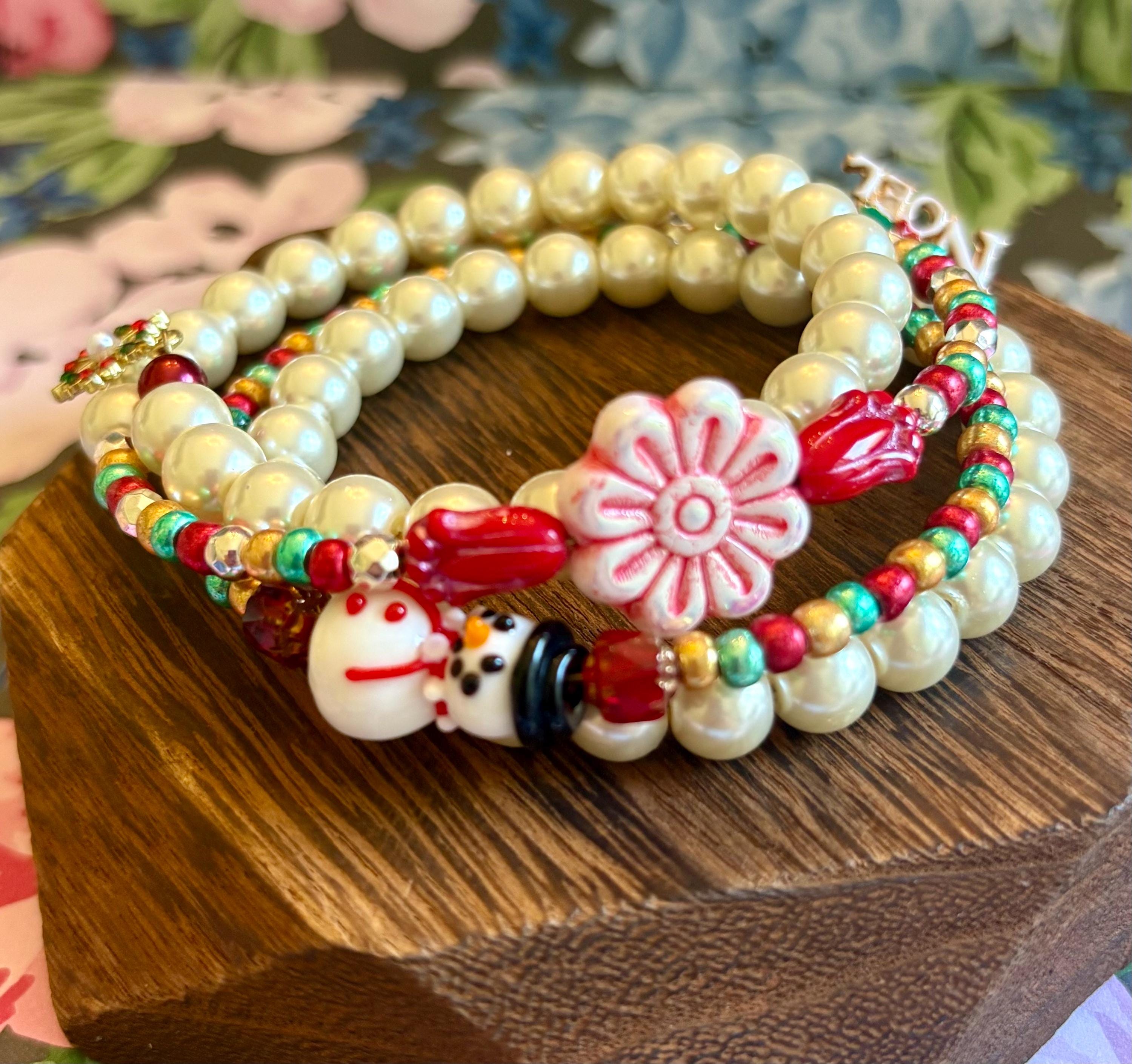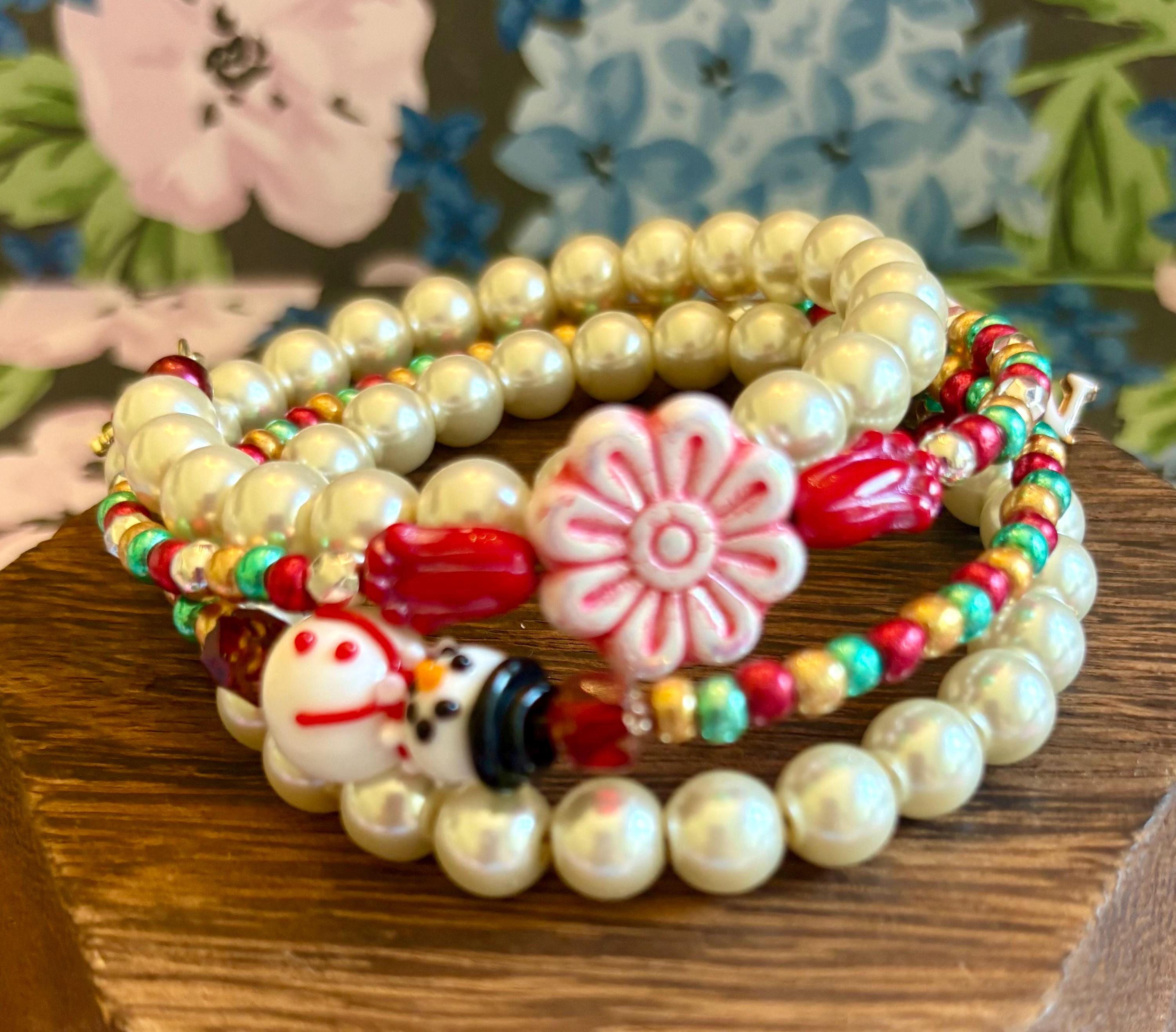 This handcrafted memory-wire bracelet layers glowing glass pearls with metallic pearls and shimmering silver faceted hematite gemstones for a radiant holiday shine! A charming lampwork glass snowman bead sits alongside a soft Czech glass daisy focal, vivid red Czech glass tulips, and glittering cathedral beads. A merry seed-bead Christmas ornament mix dances between layers, while two enchanting charms—a snowflake with pearl and red/green rhinestones and an enamel Noel charm—add the perfect finishing touch.