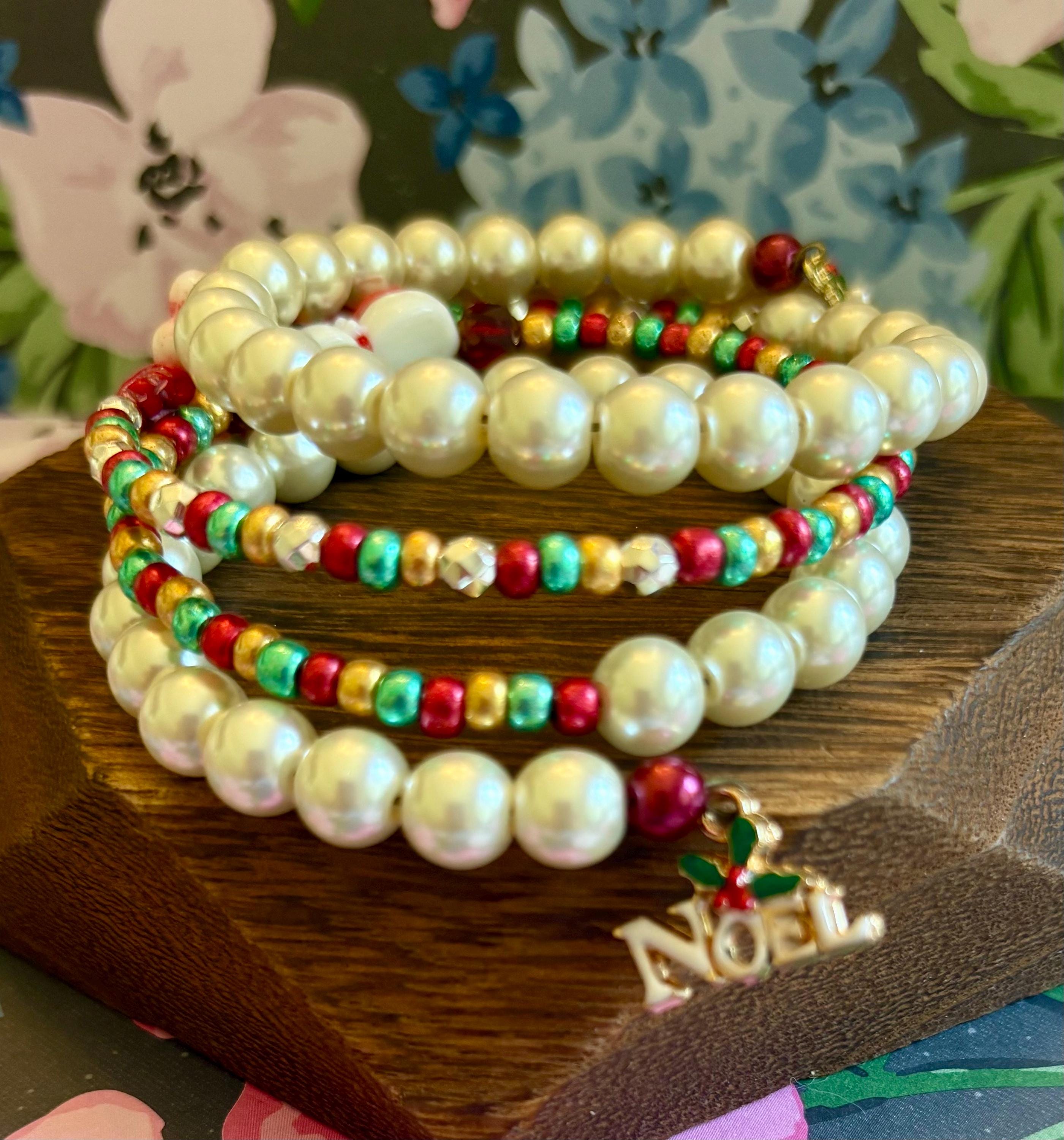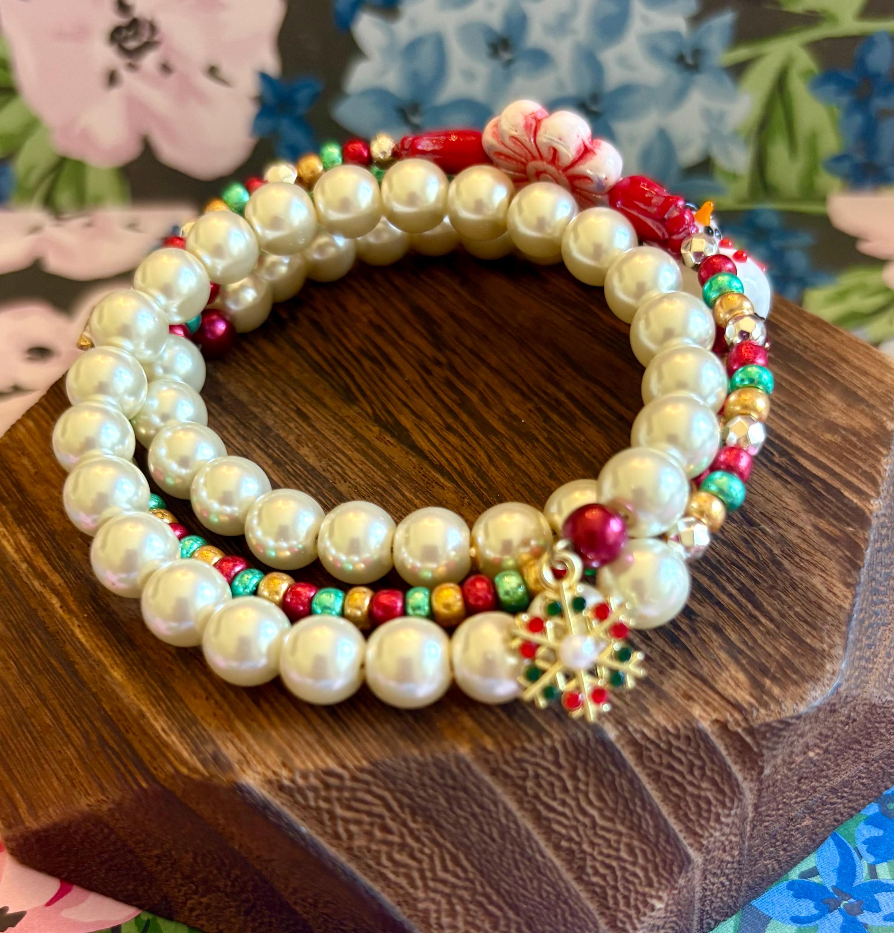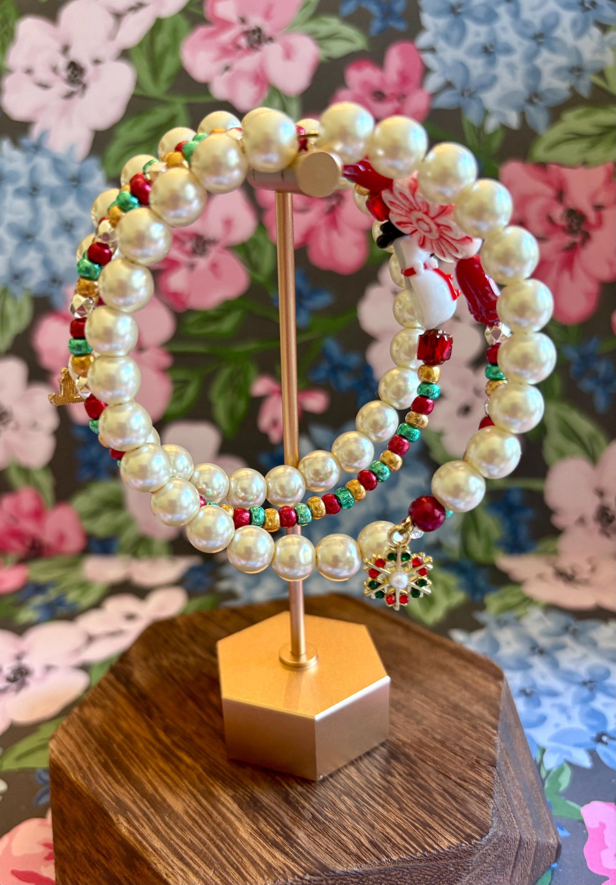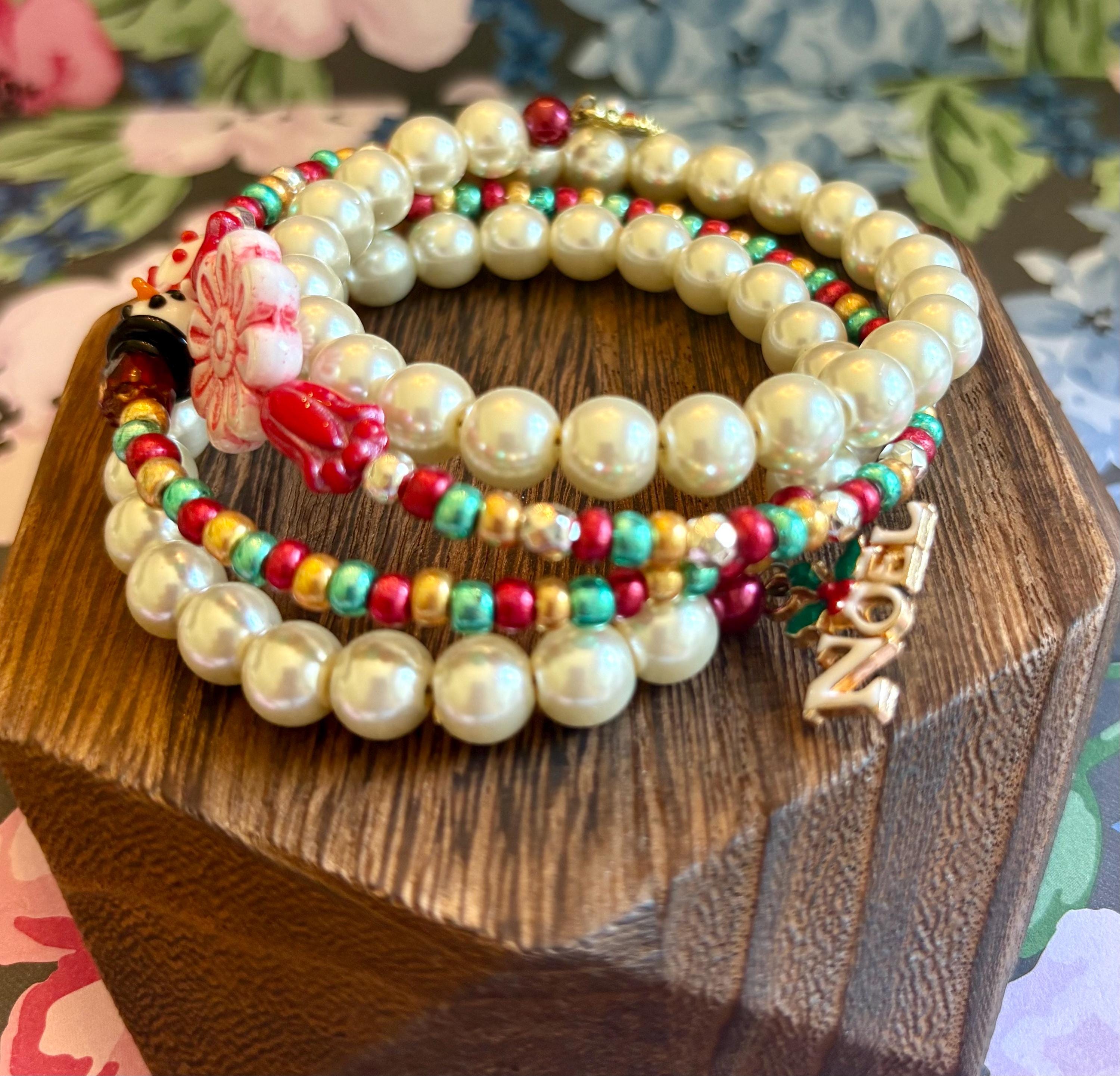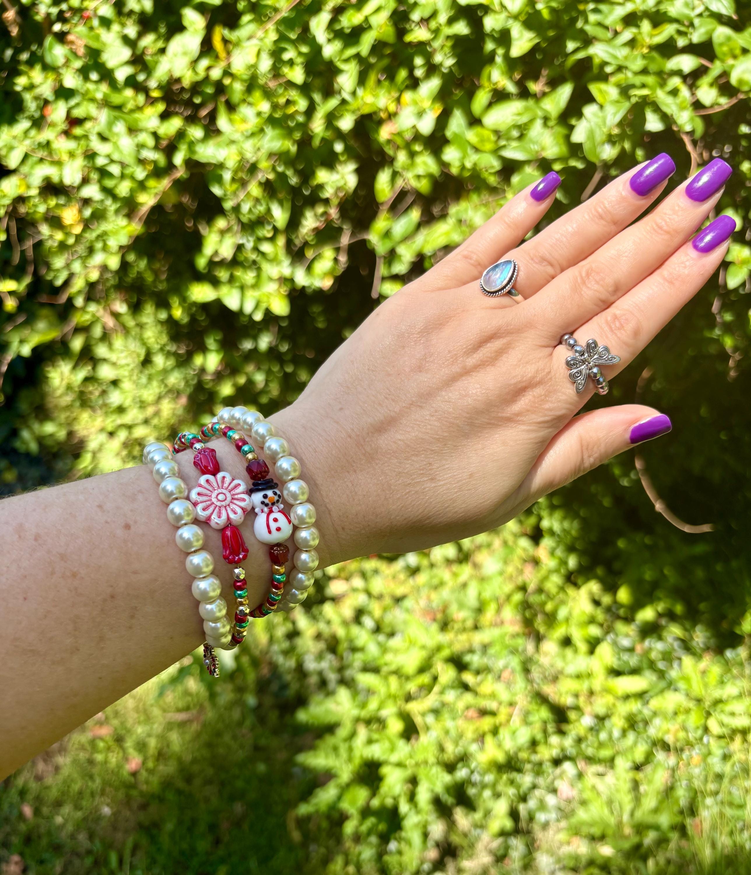 This handcrafted memory-wire bracelet layers glowing glass pearls with metallic pearls and shimmering silver faceted hematite gemstones for a radiant holiday shine! A charming lampwork glass snowman bead sits alongside a soft Czech glass daisy focal, vivid red Czech glass tulips, and glittering cathedral beads. A merry seed-bead Christmas ornament mix dances between layers, while two enchanting charms—a snowflake with pearl and red/green rhinestones and an enamel Noel charm—add the perfect finishing touch.