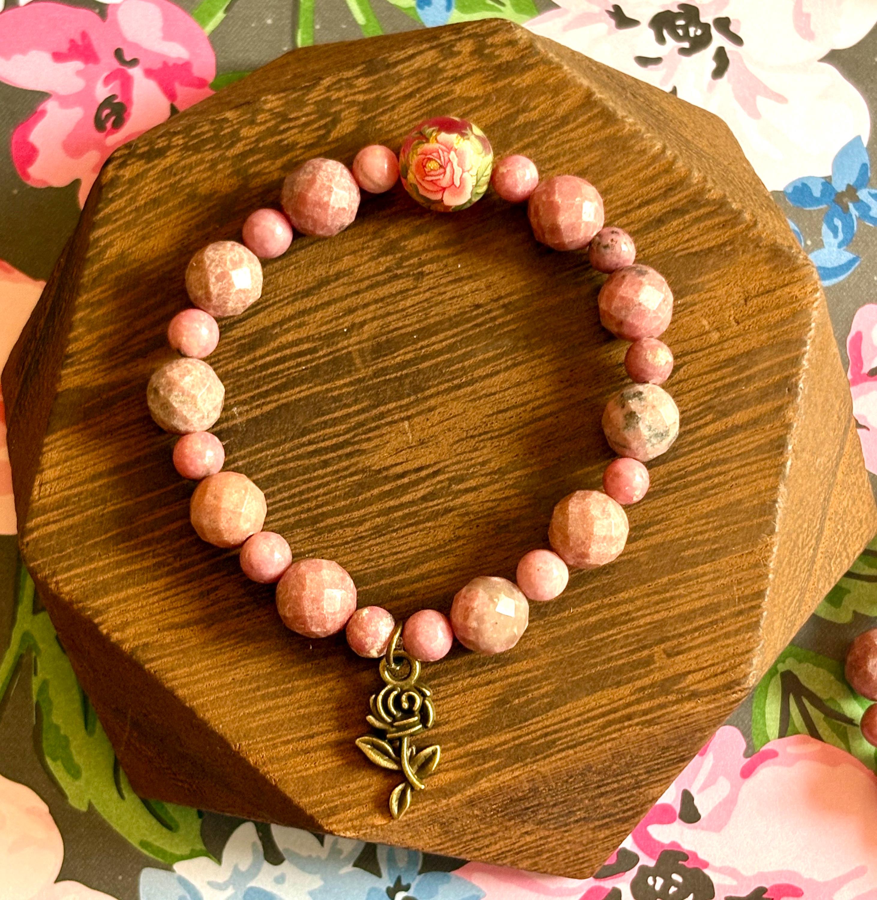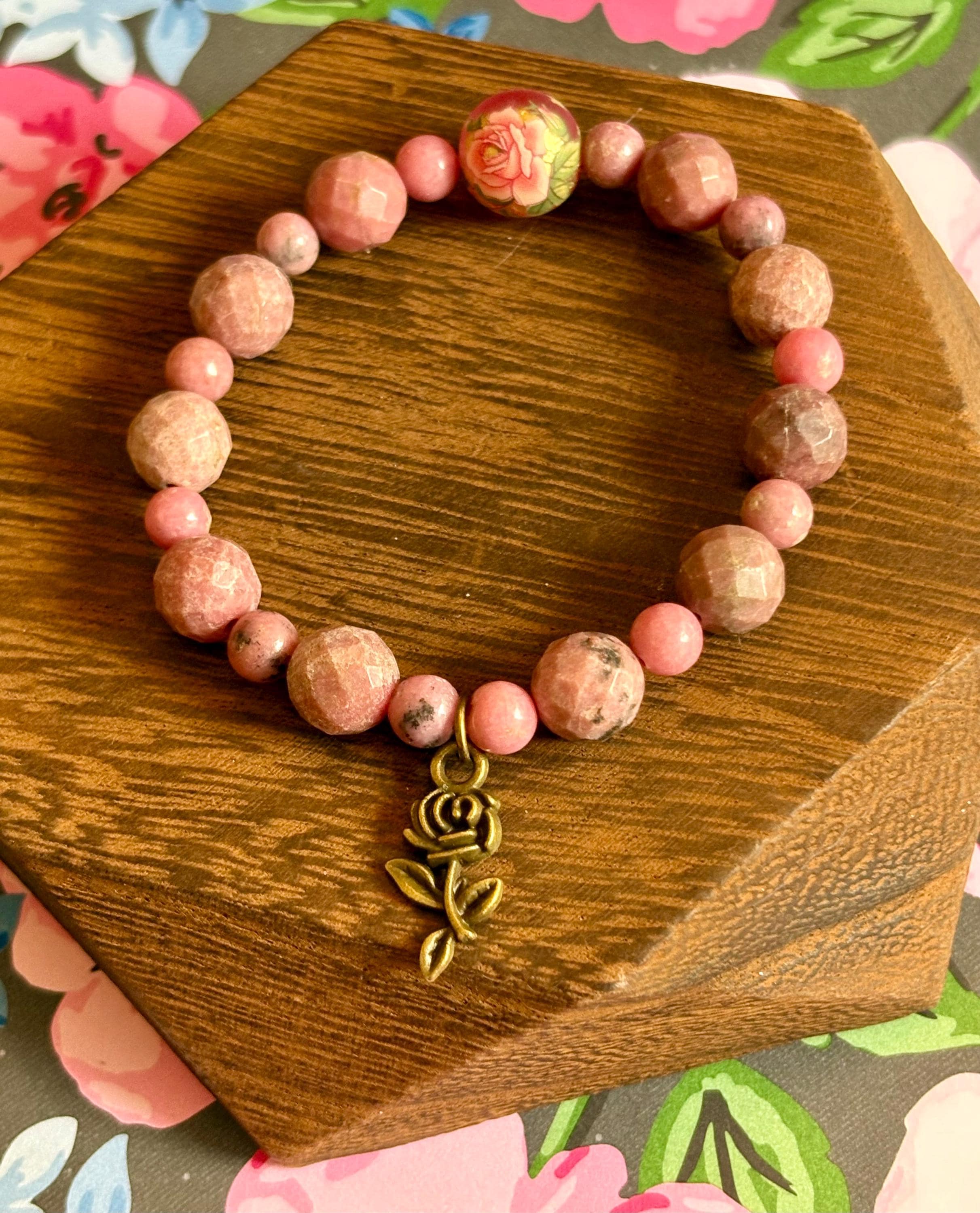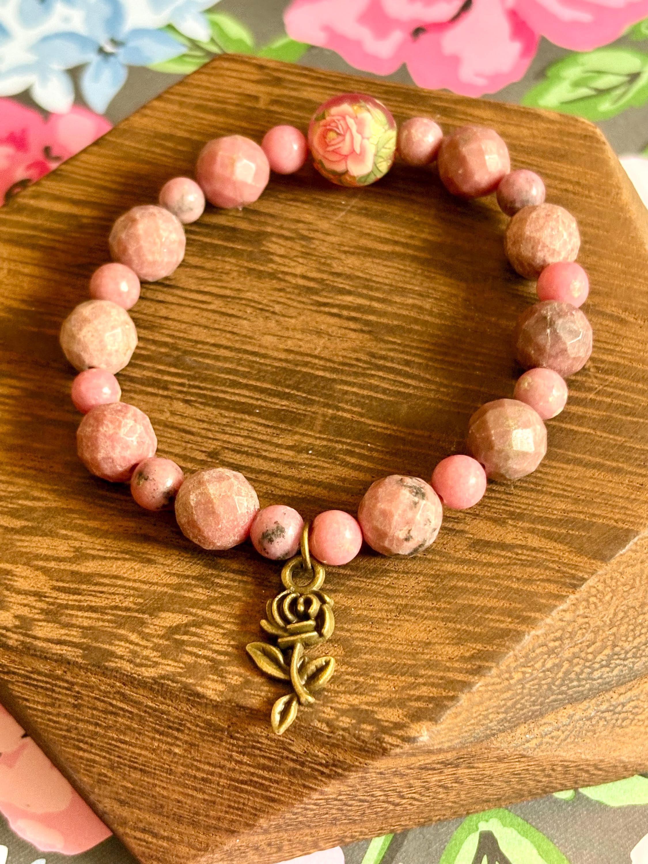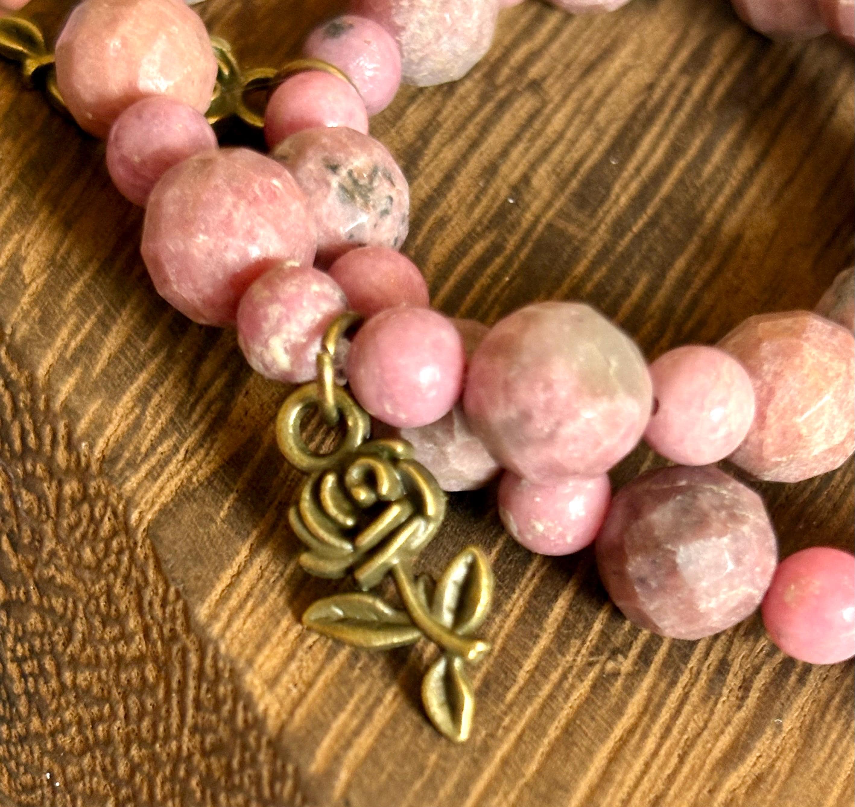 Rhodonite Gemstone Bracelet: Japanese Rose Bead & Bronze Charm, Reiki-Infused