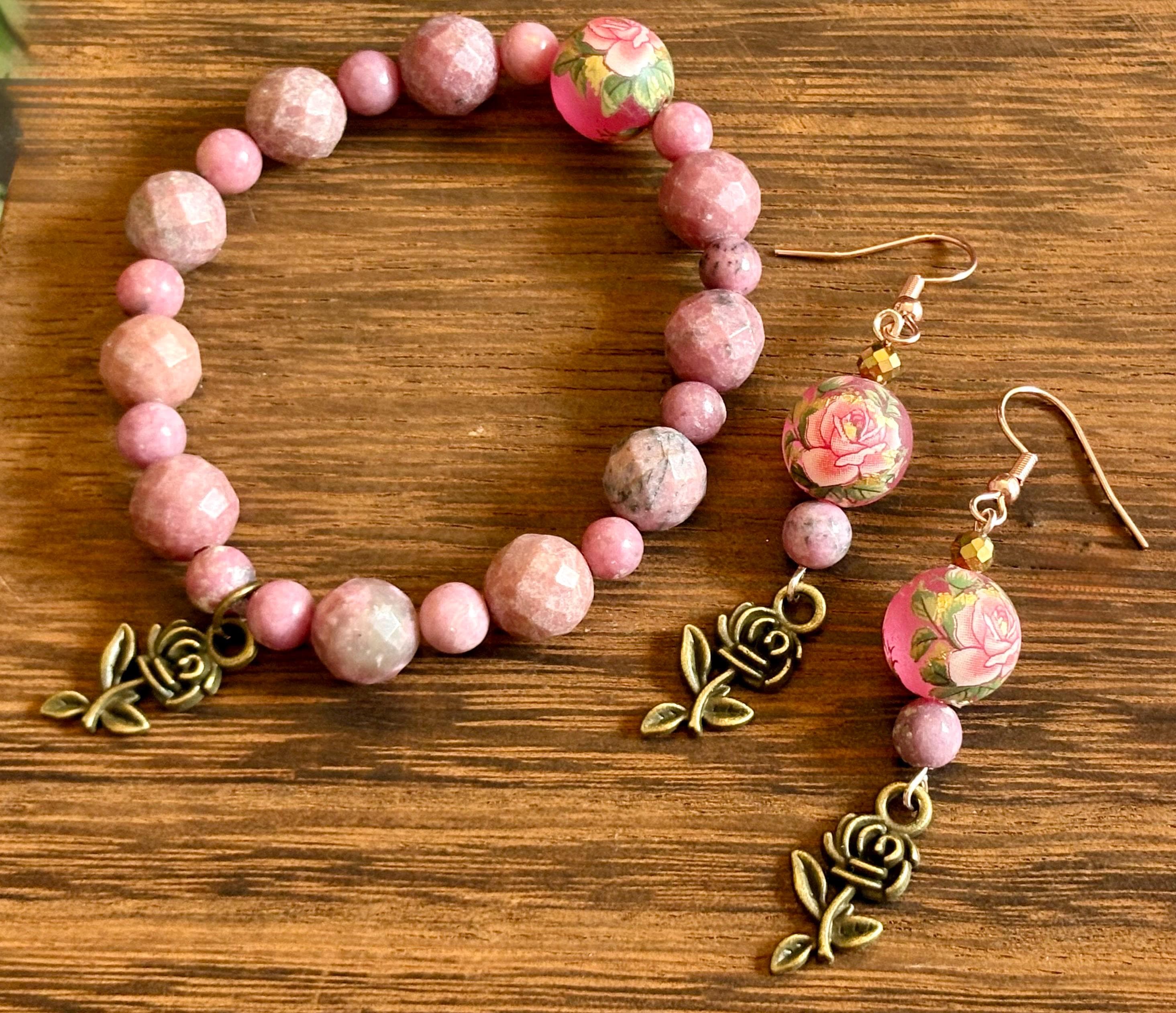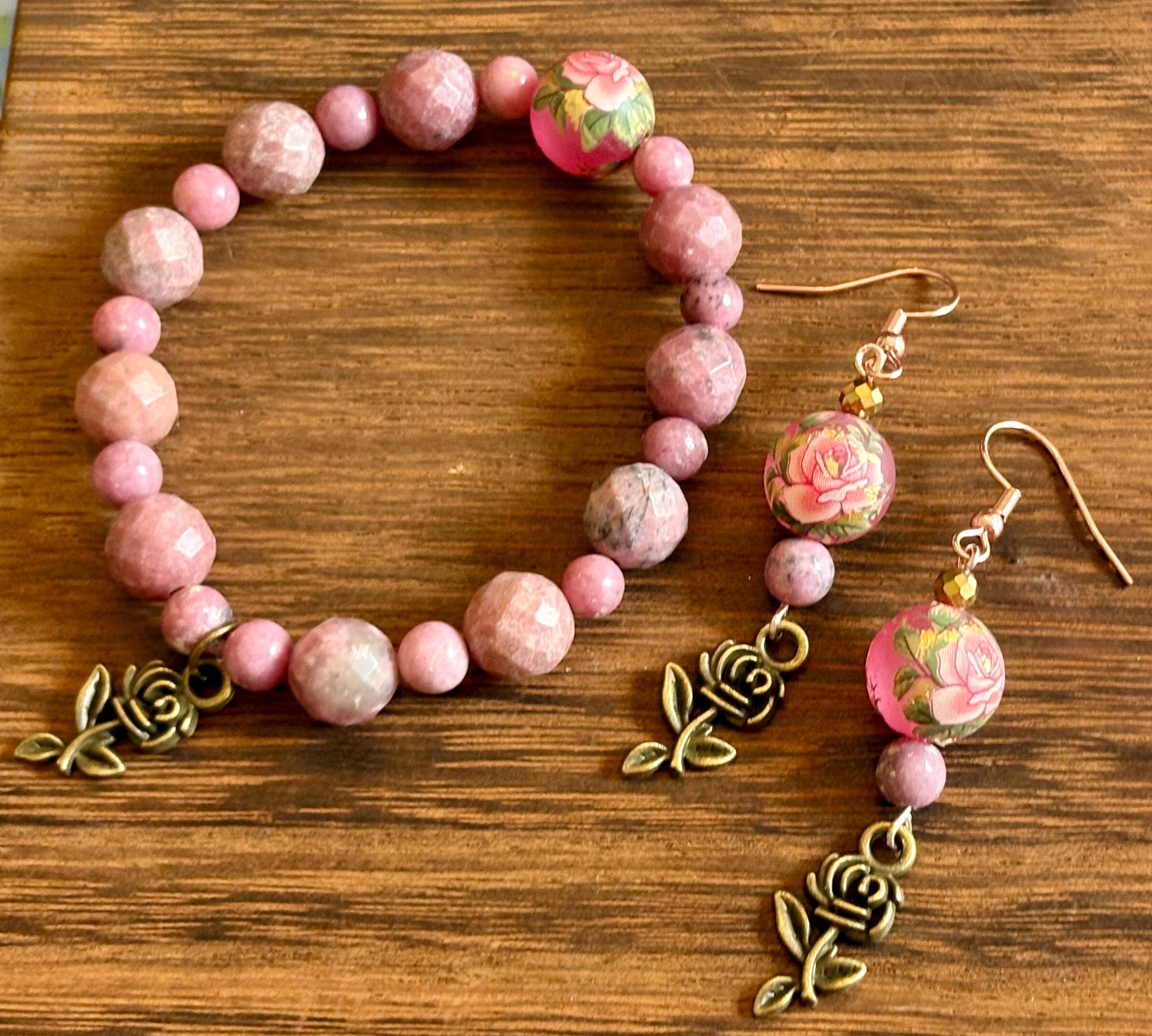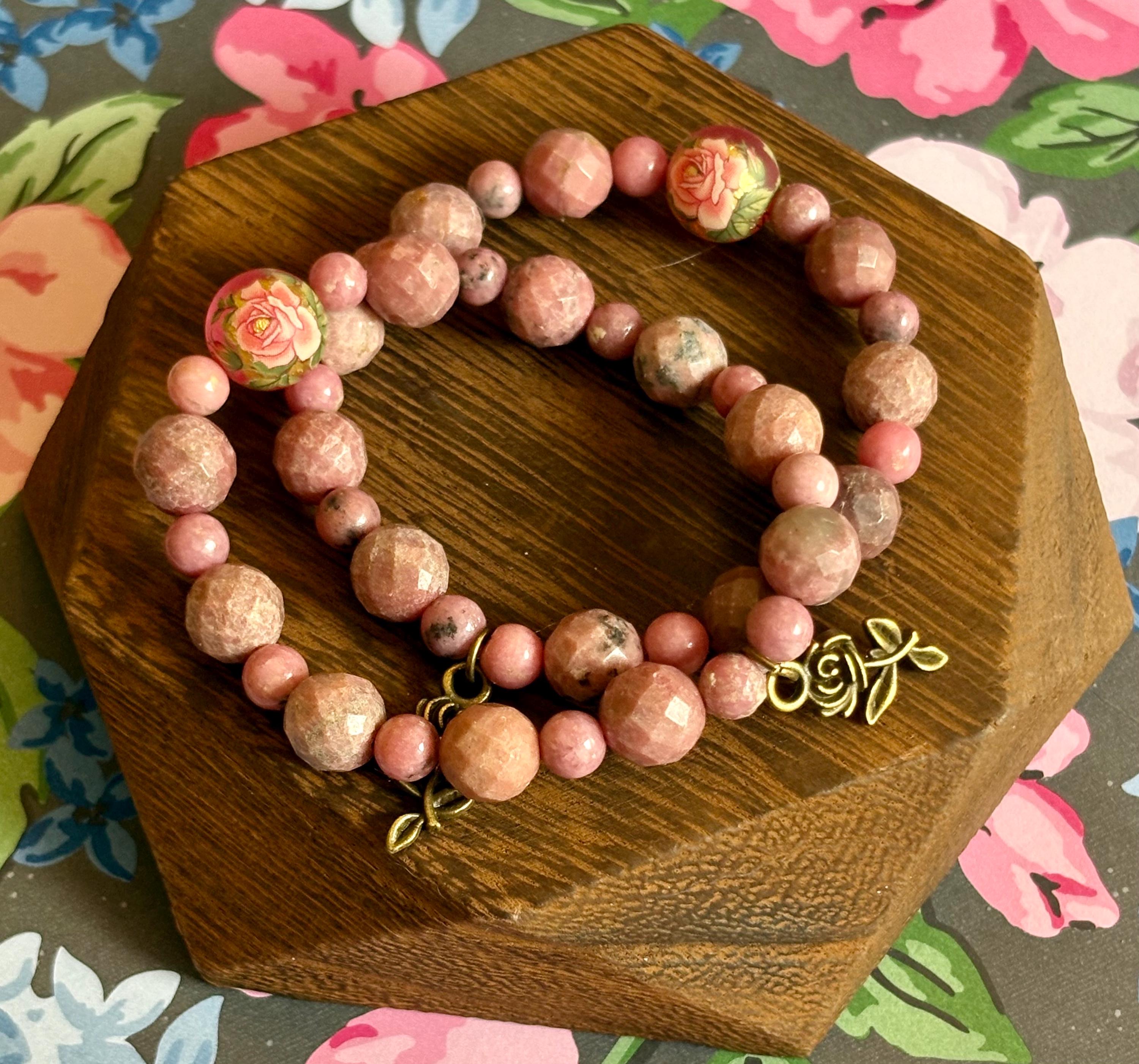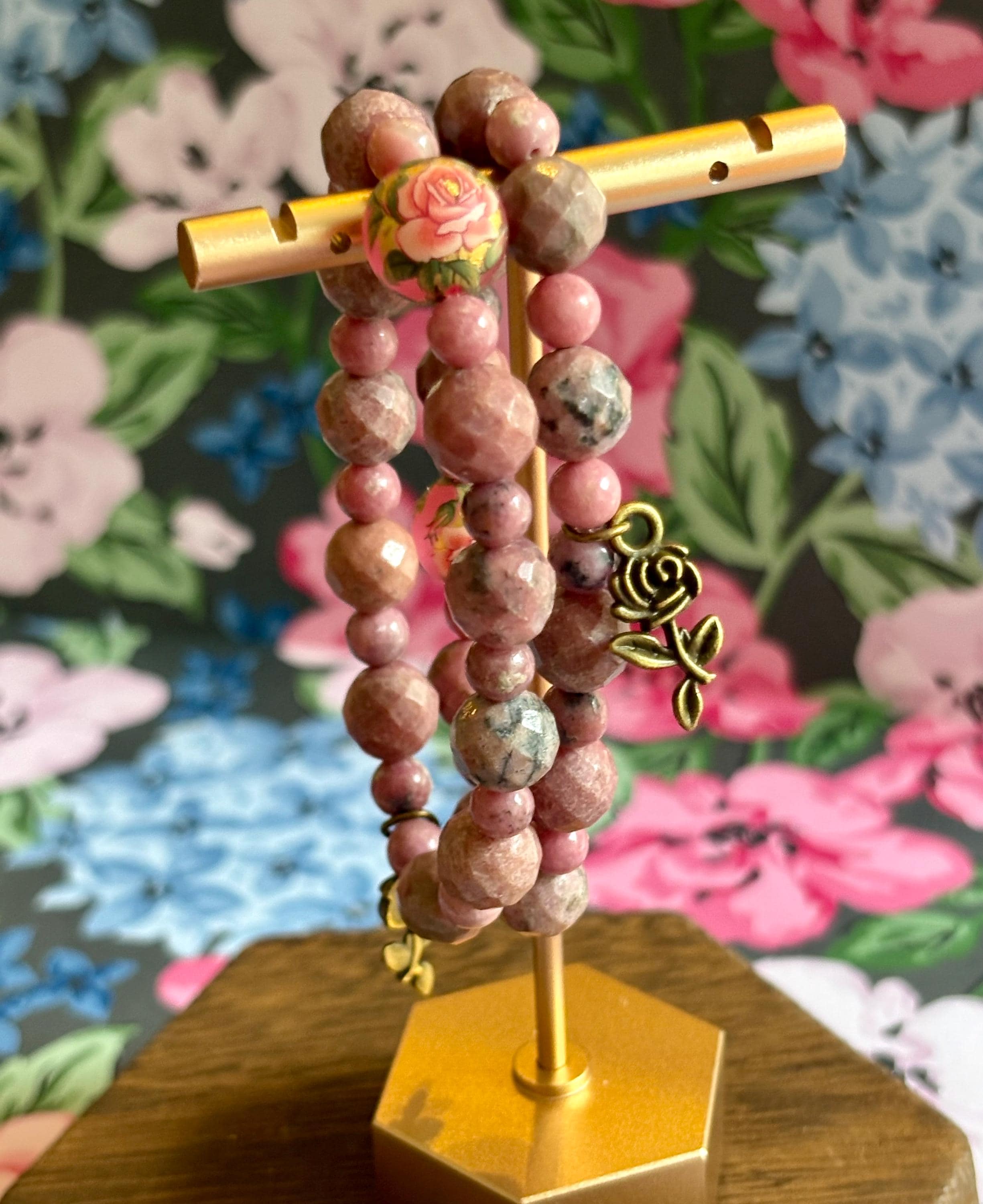 Rhodonite Gemstone Bracelet: Japanese Rose Bead & Bronze Charm, Reiki-Infused