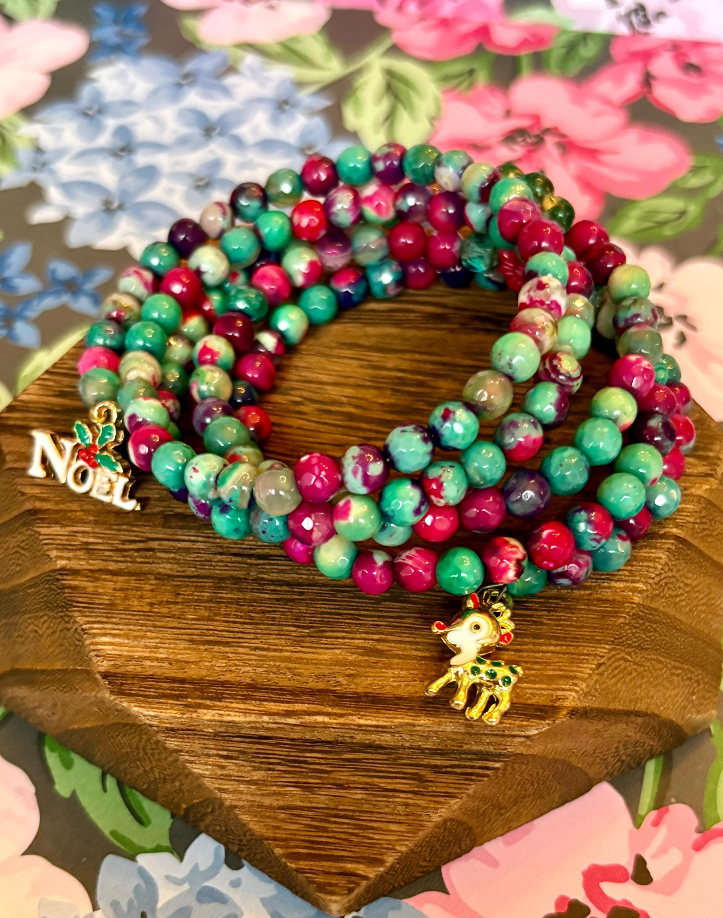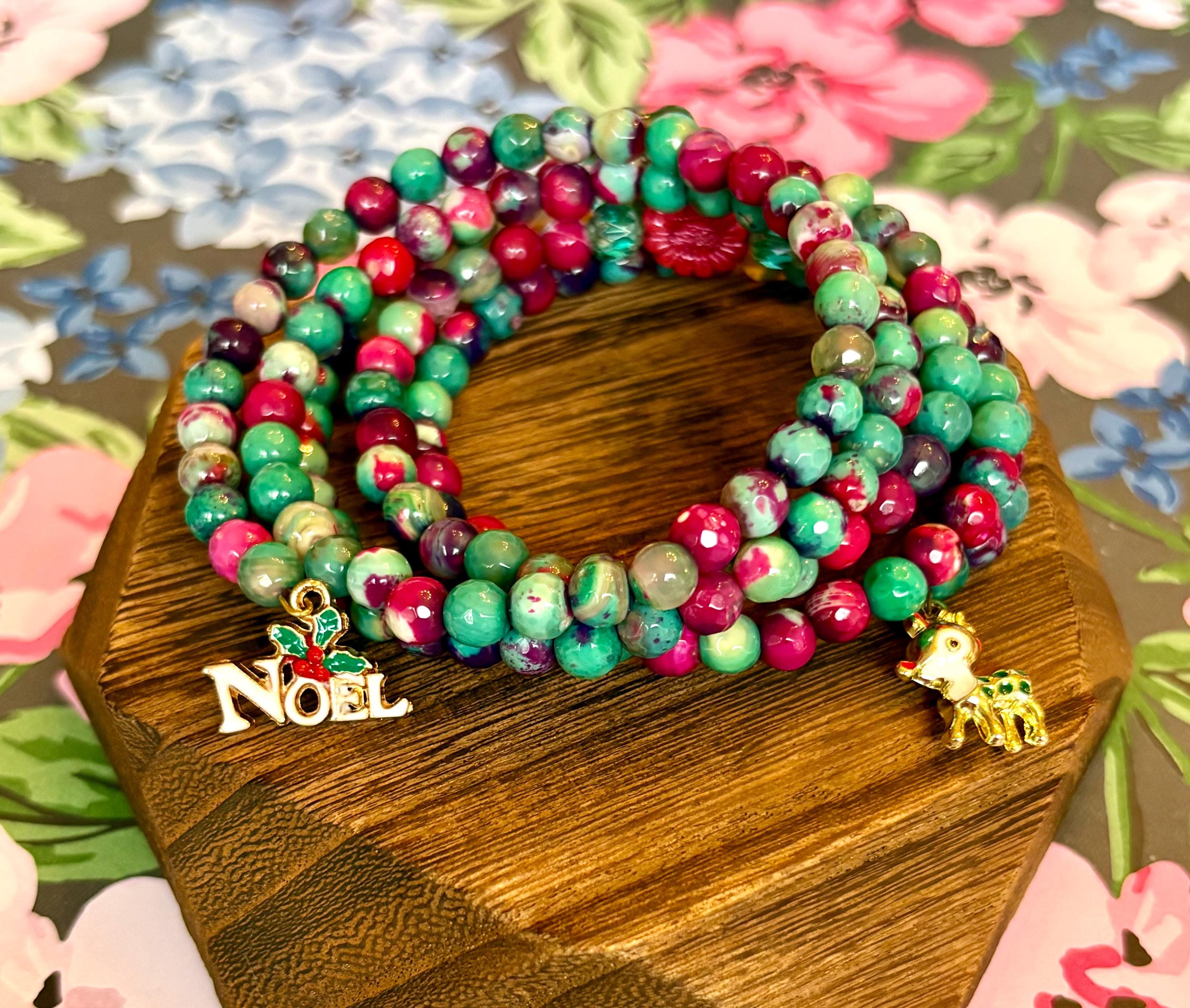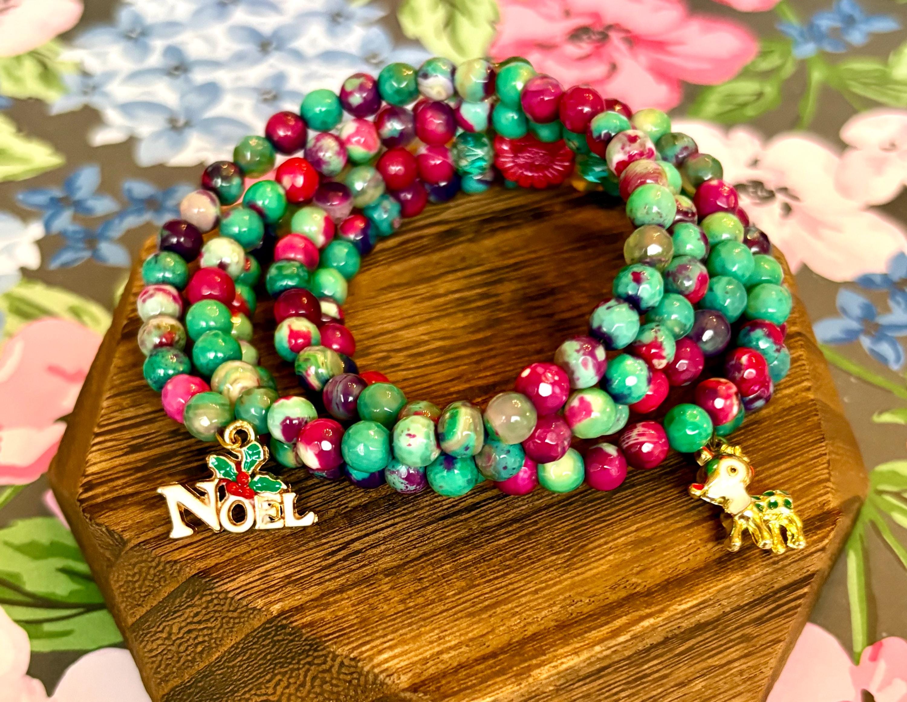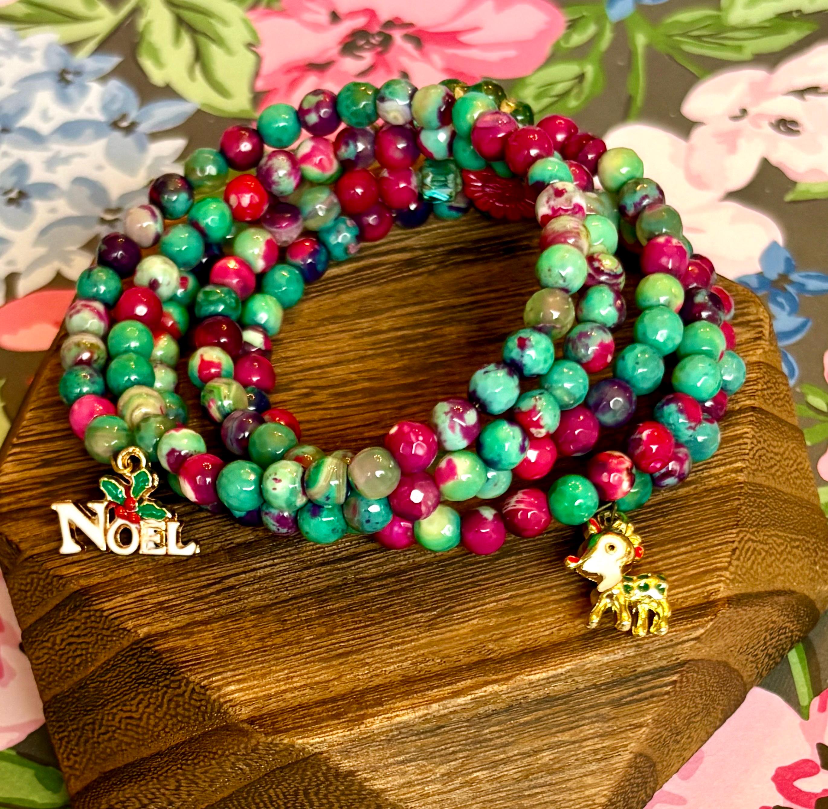 Holly Berry Joy Gemstone Wrap Bracelet – Jade, Czech Glass Daisy & Cathedral Beads | Reindeer and Noel Charms | Holiday Kissed Collection