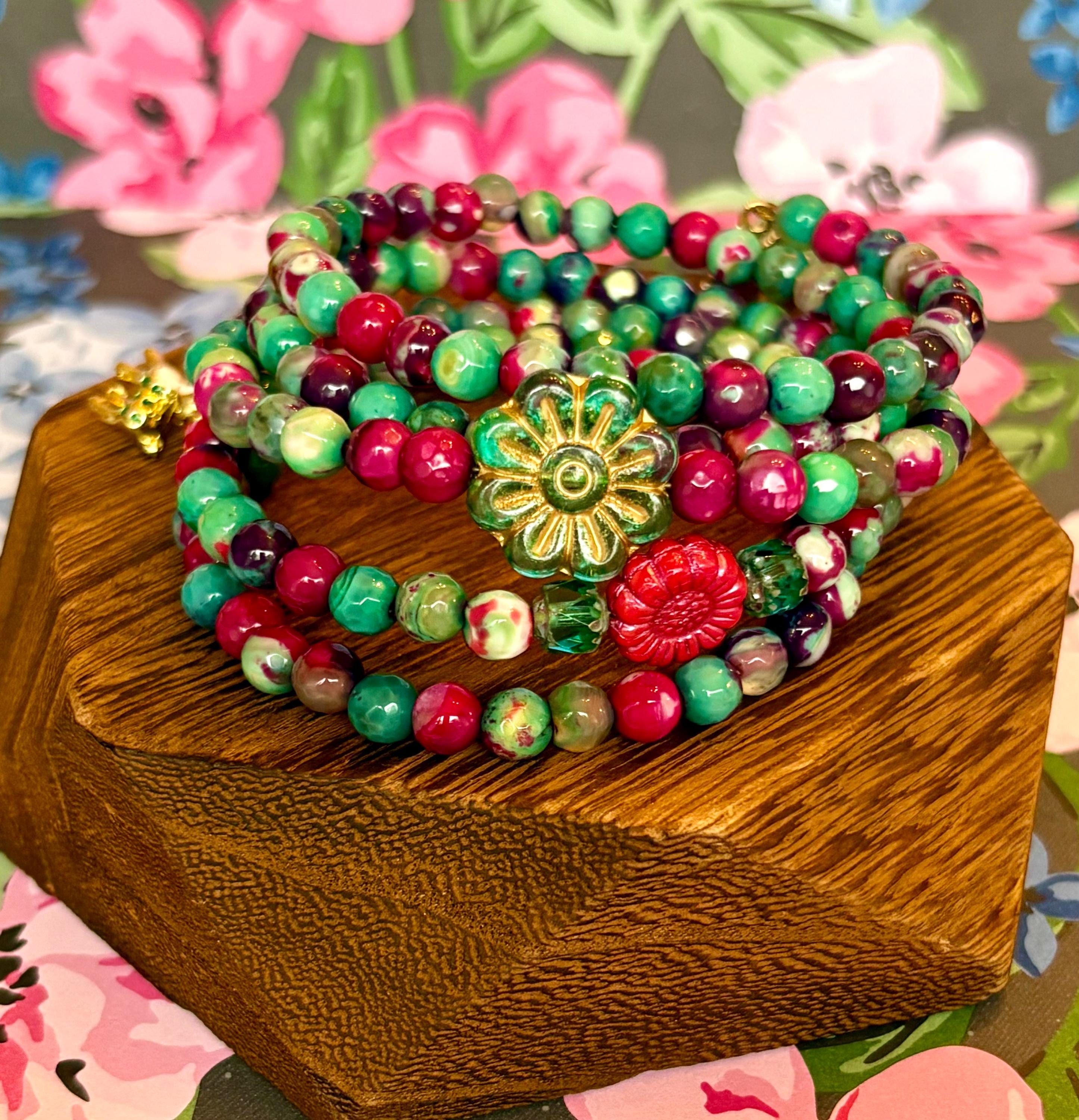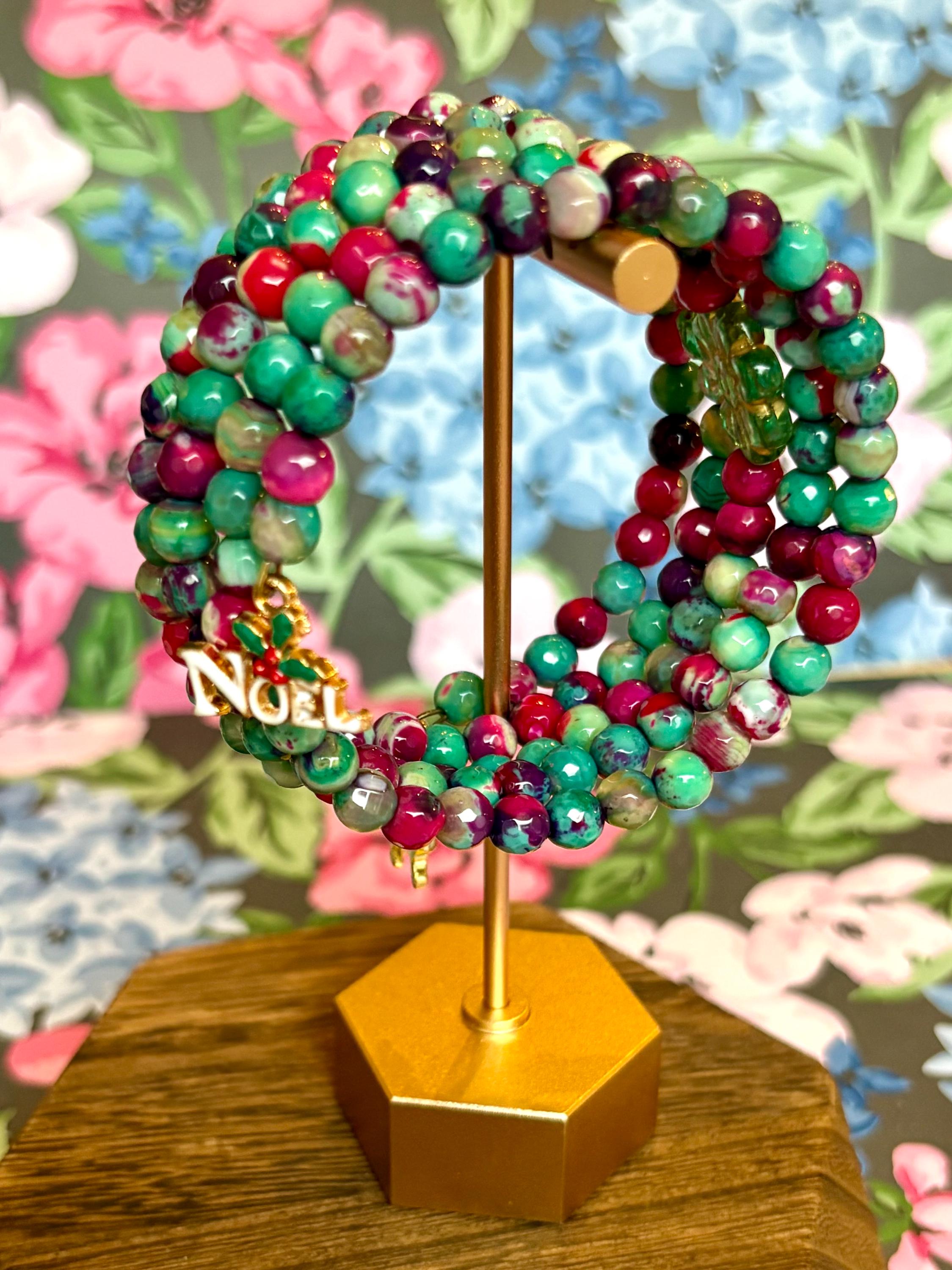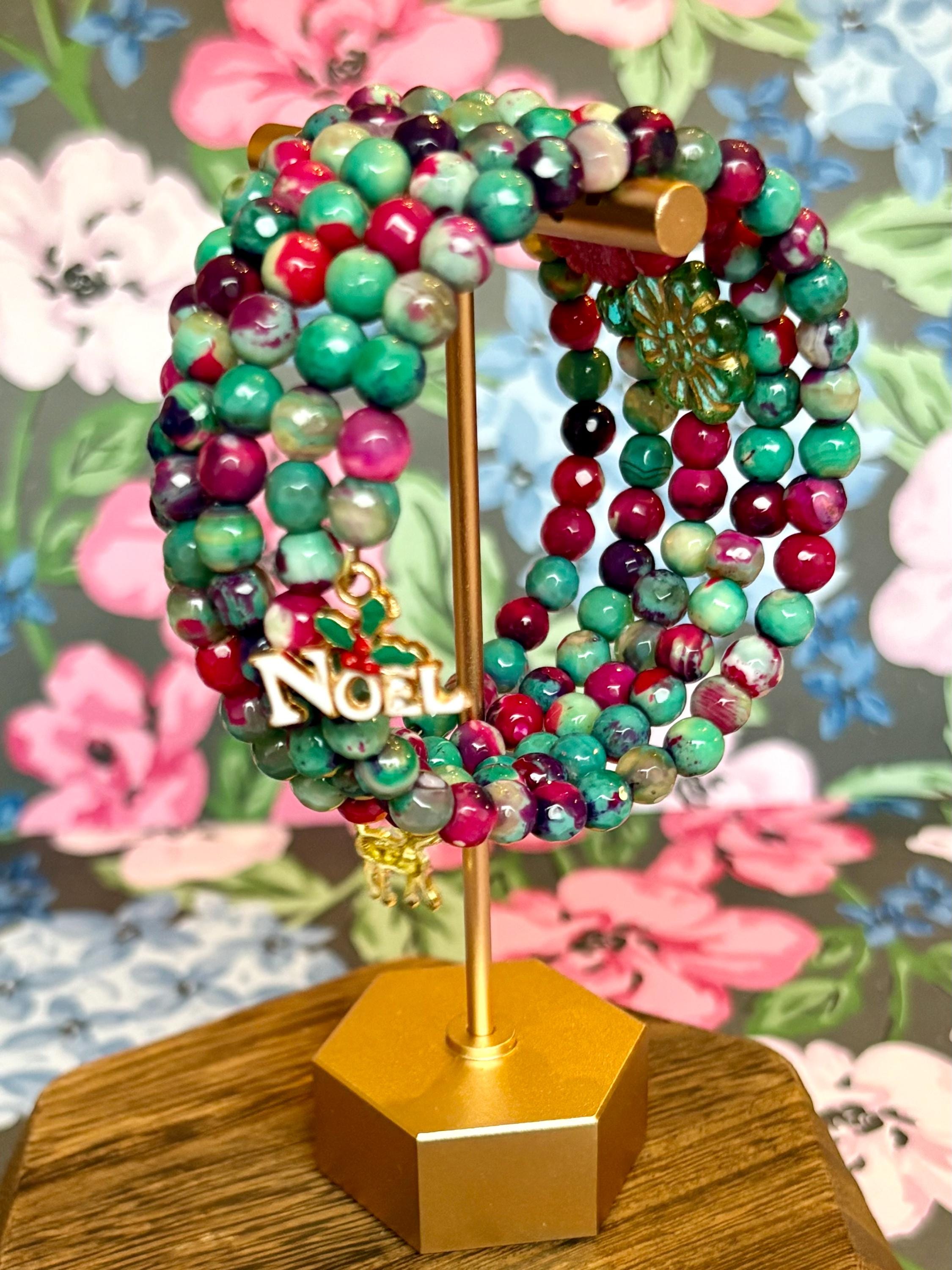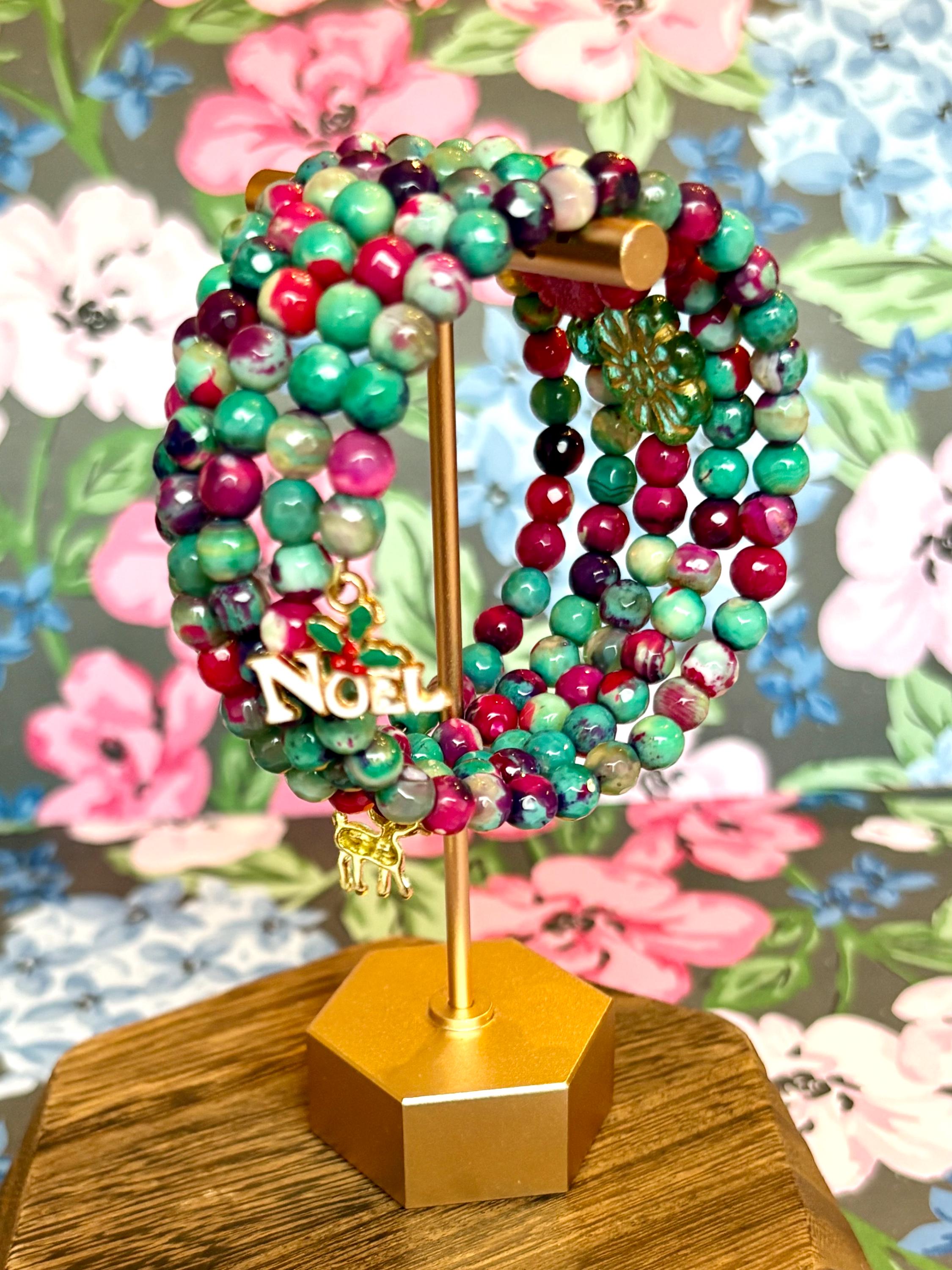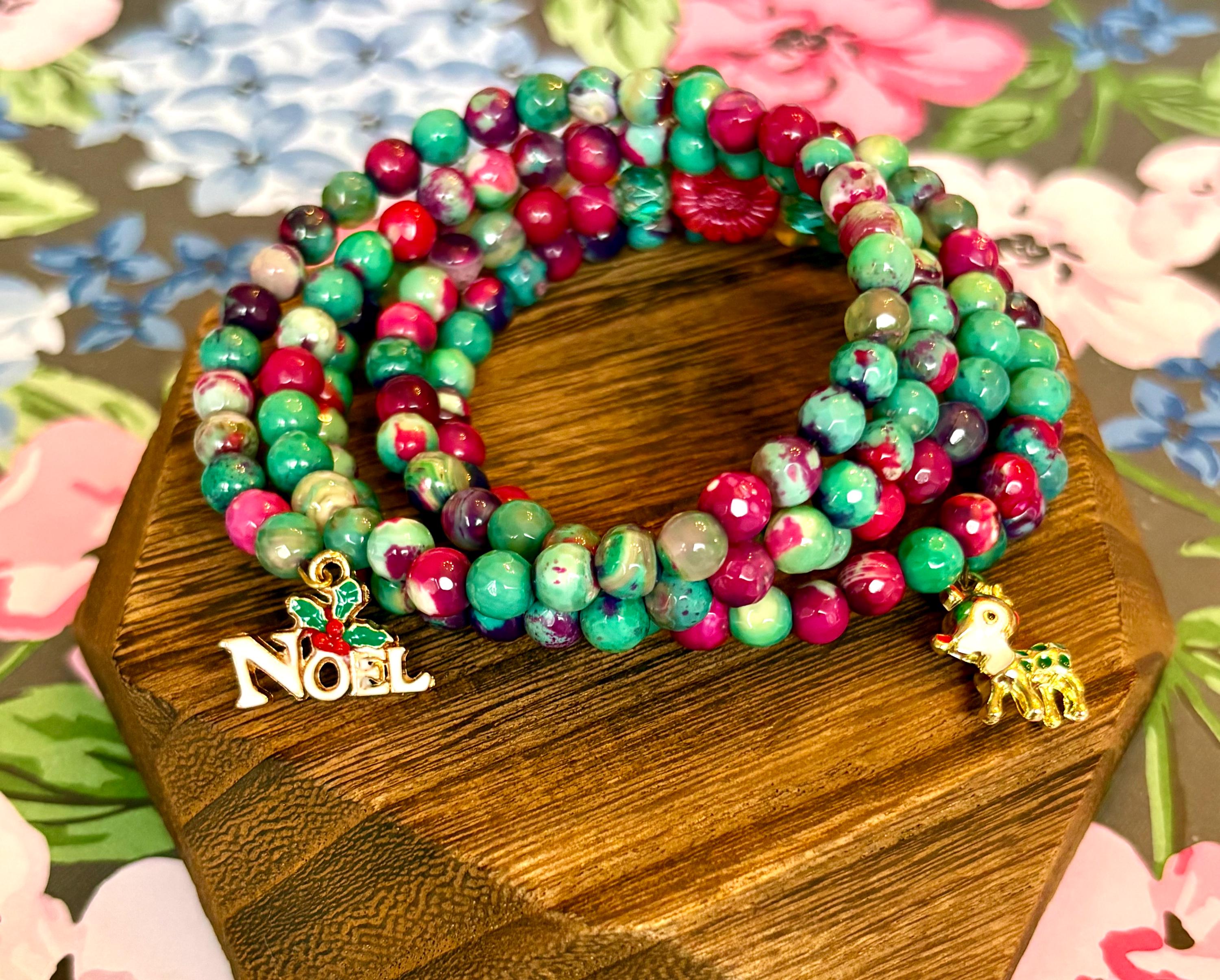 Holly Berry Joy Gemstone Wrap Bracelet – Jade, Czech Glass Daisy & Cathedral Beads | Reindeer and Noel Charms | Holiday Kissed Collection