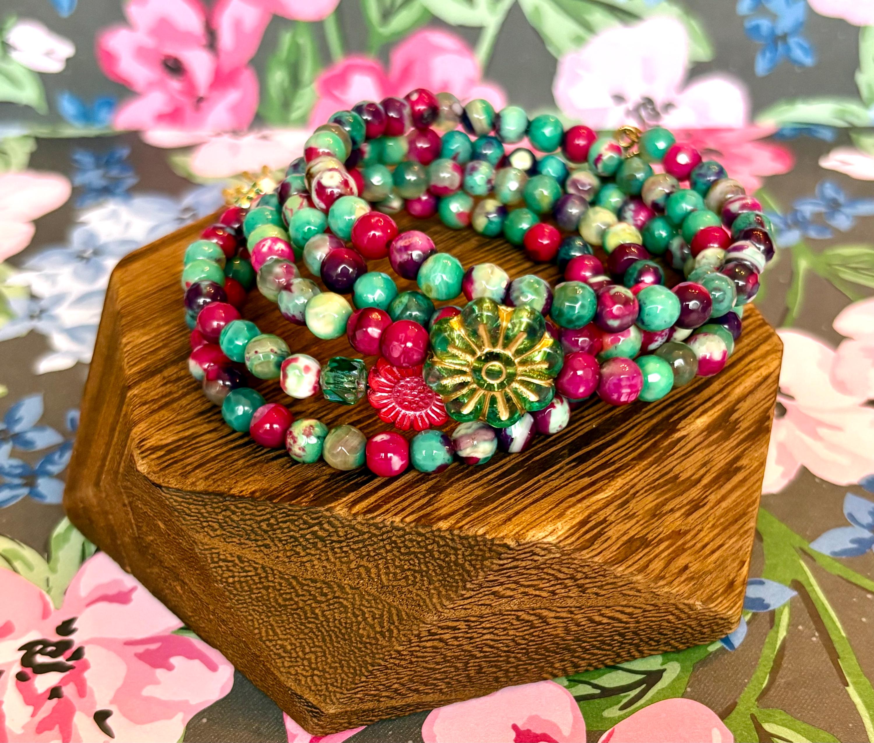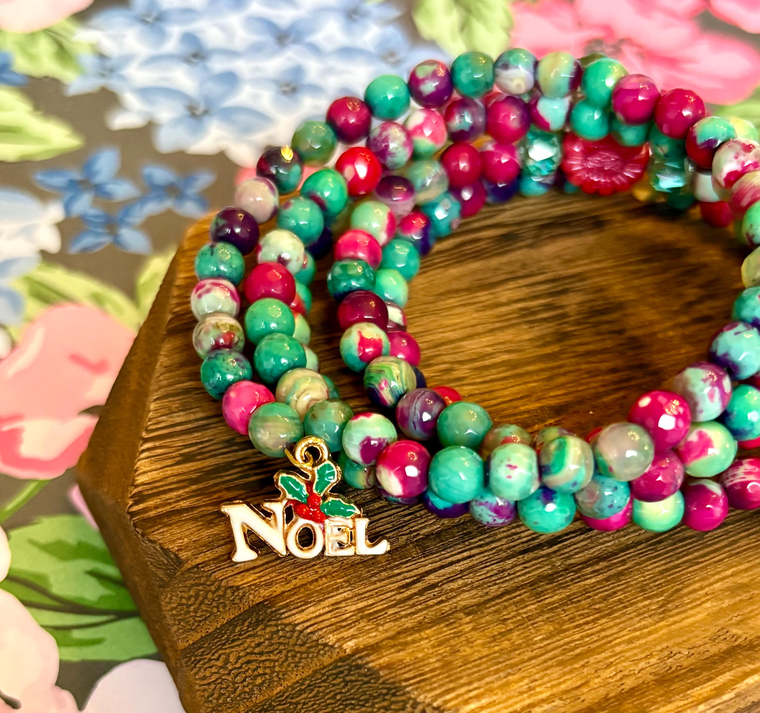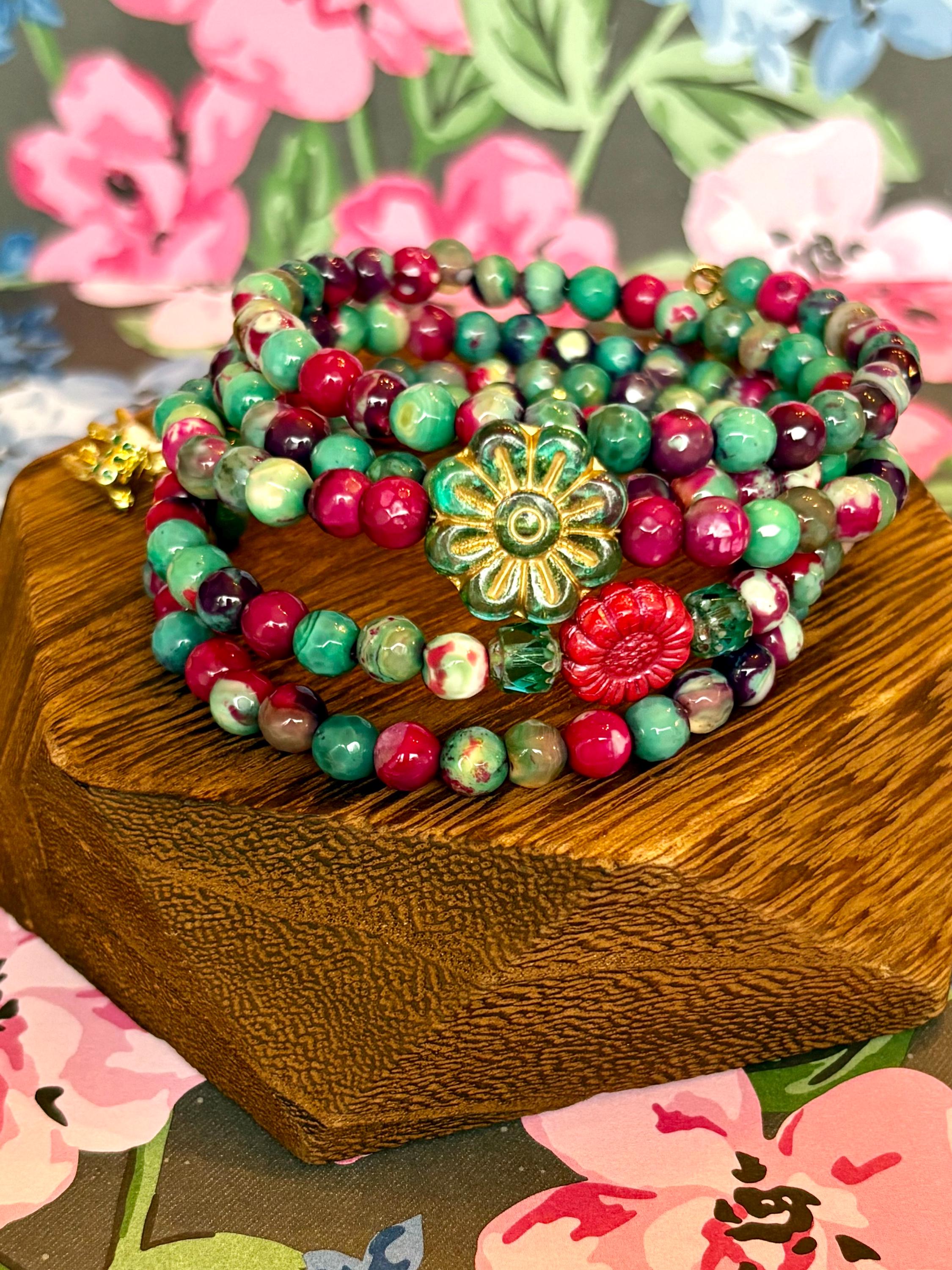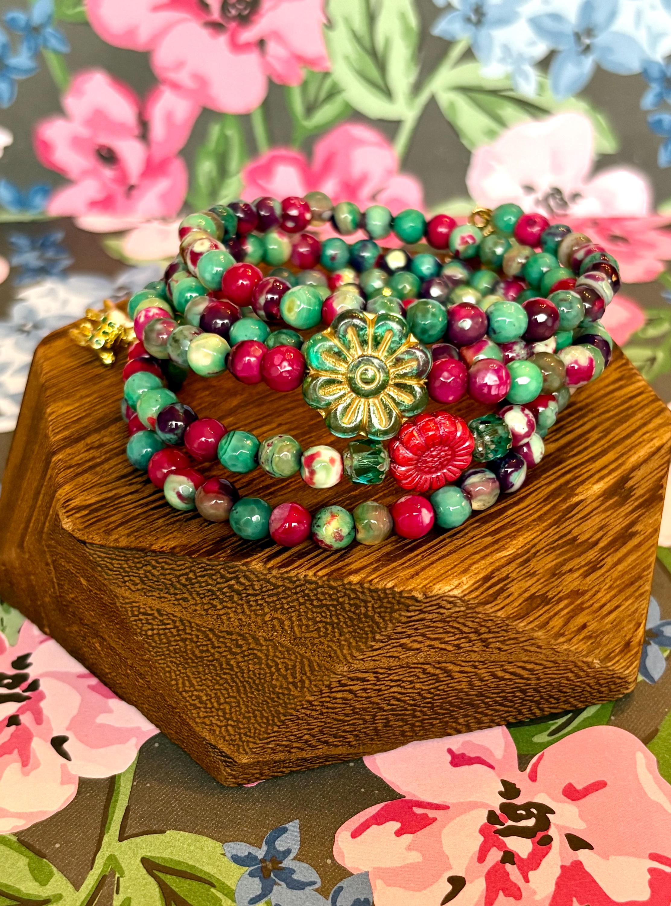 Holly Berry Joy Gemstone Wrap Bracelet – Jade, Czech Glass Daisy & Cathedral Beads | Reindeer and Noel Charms | Holiday Kissed Collection