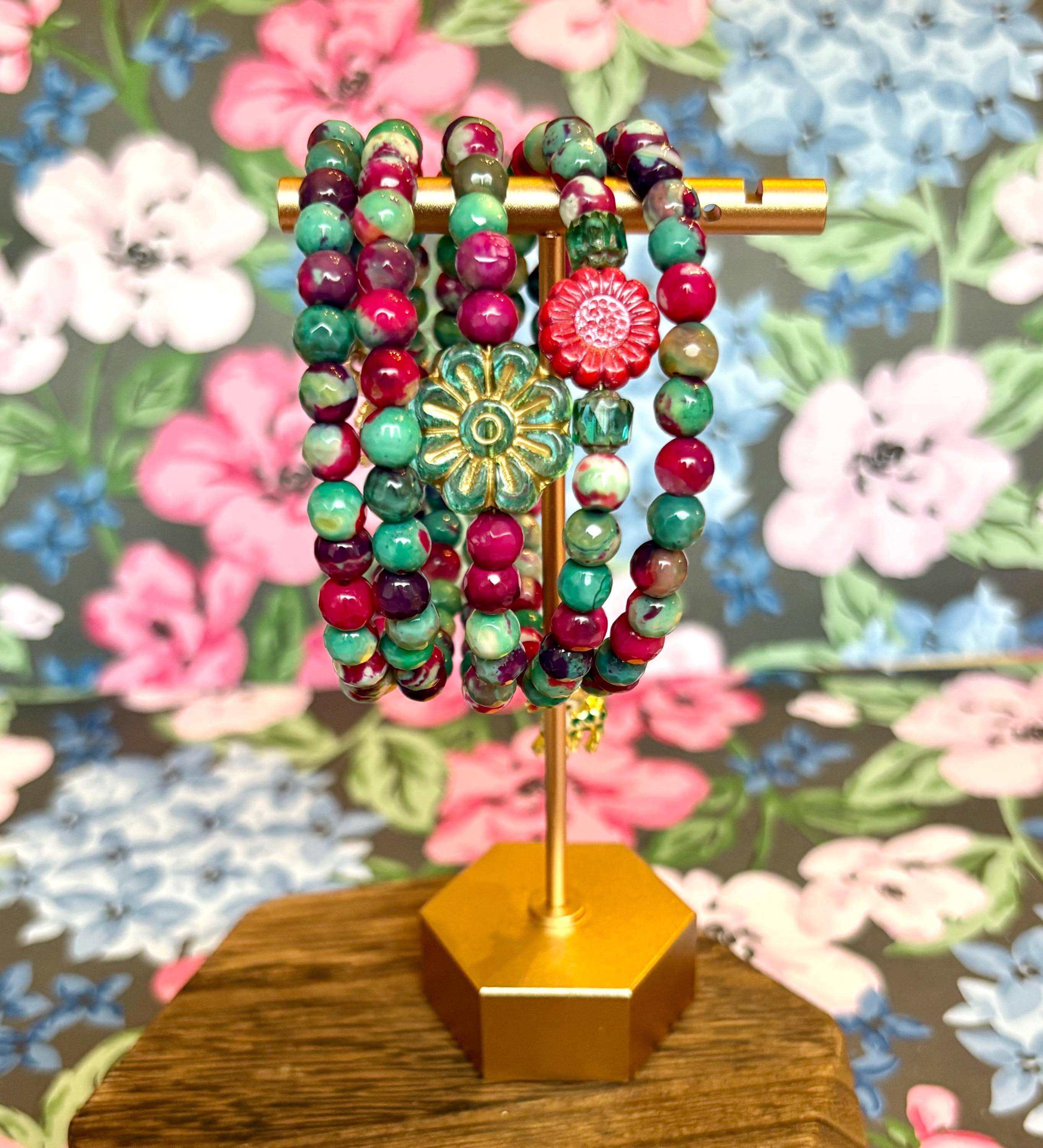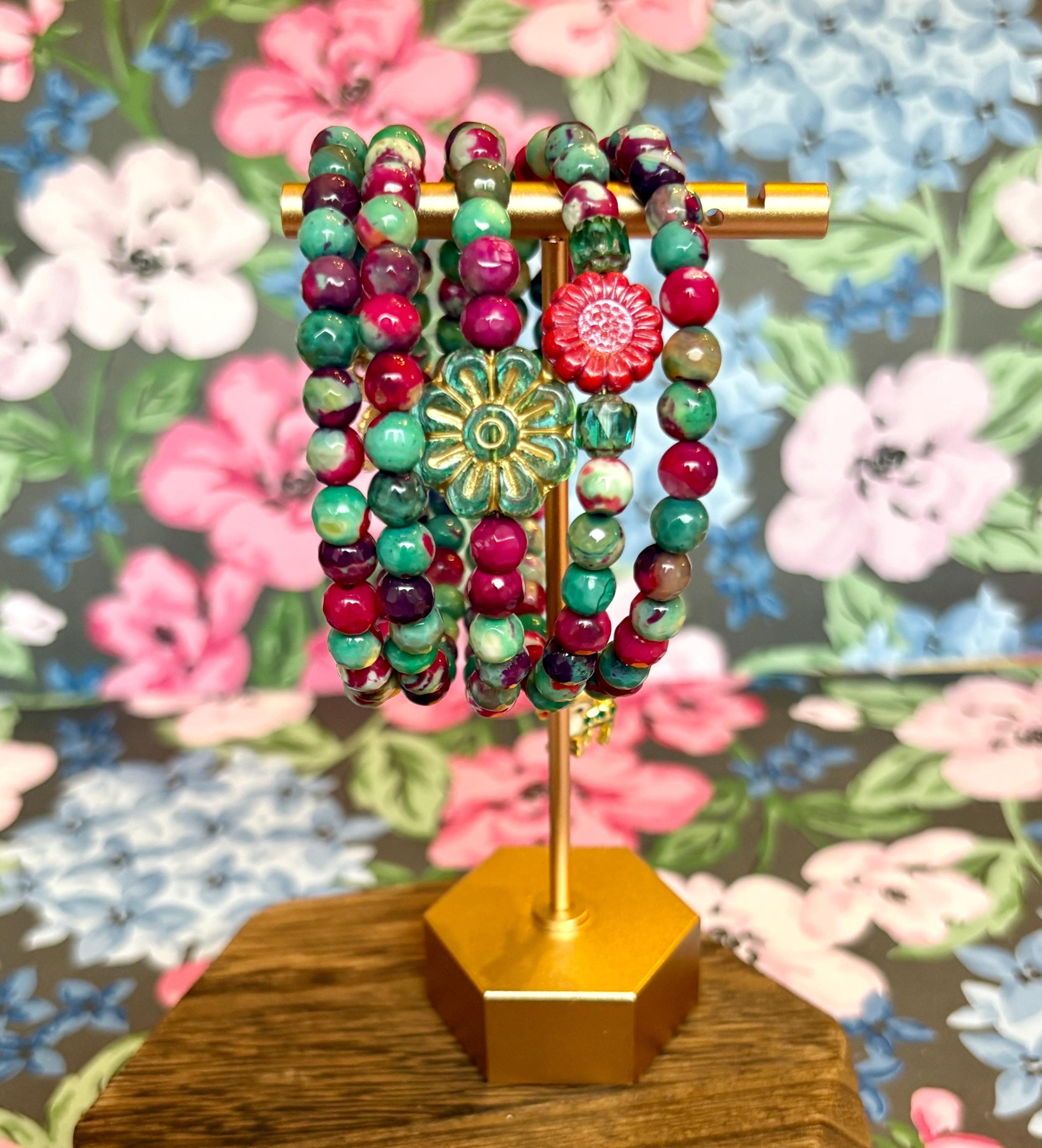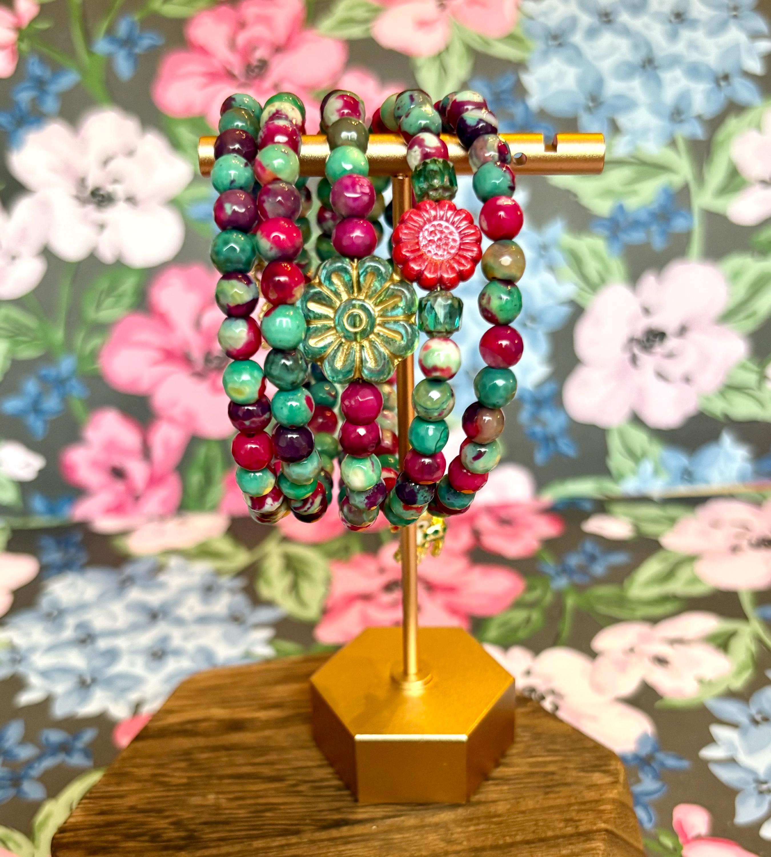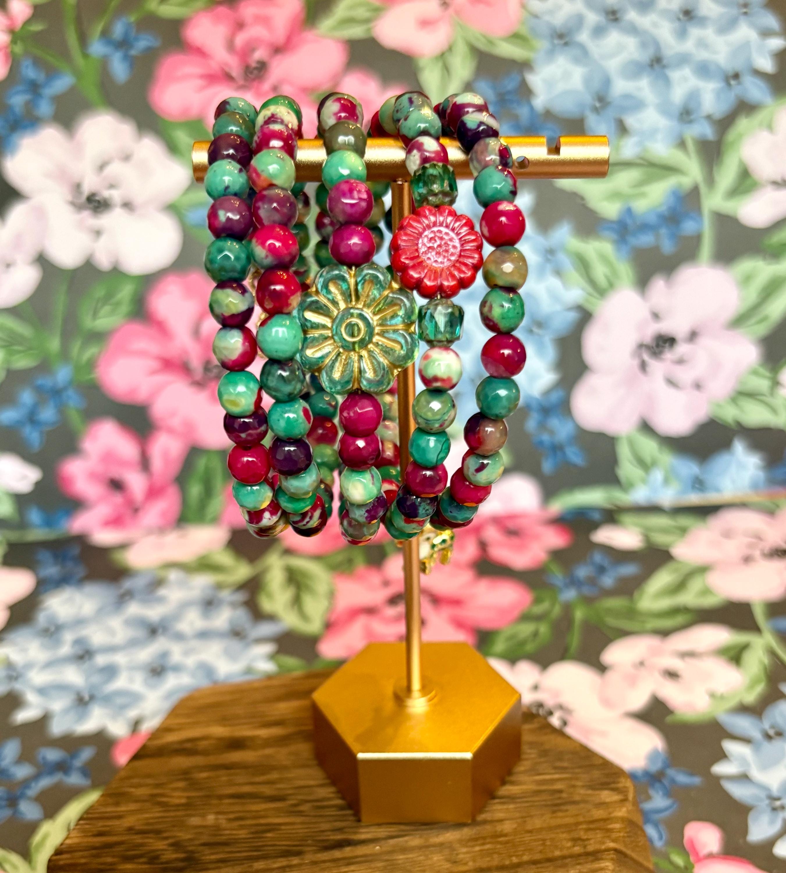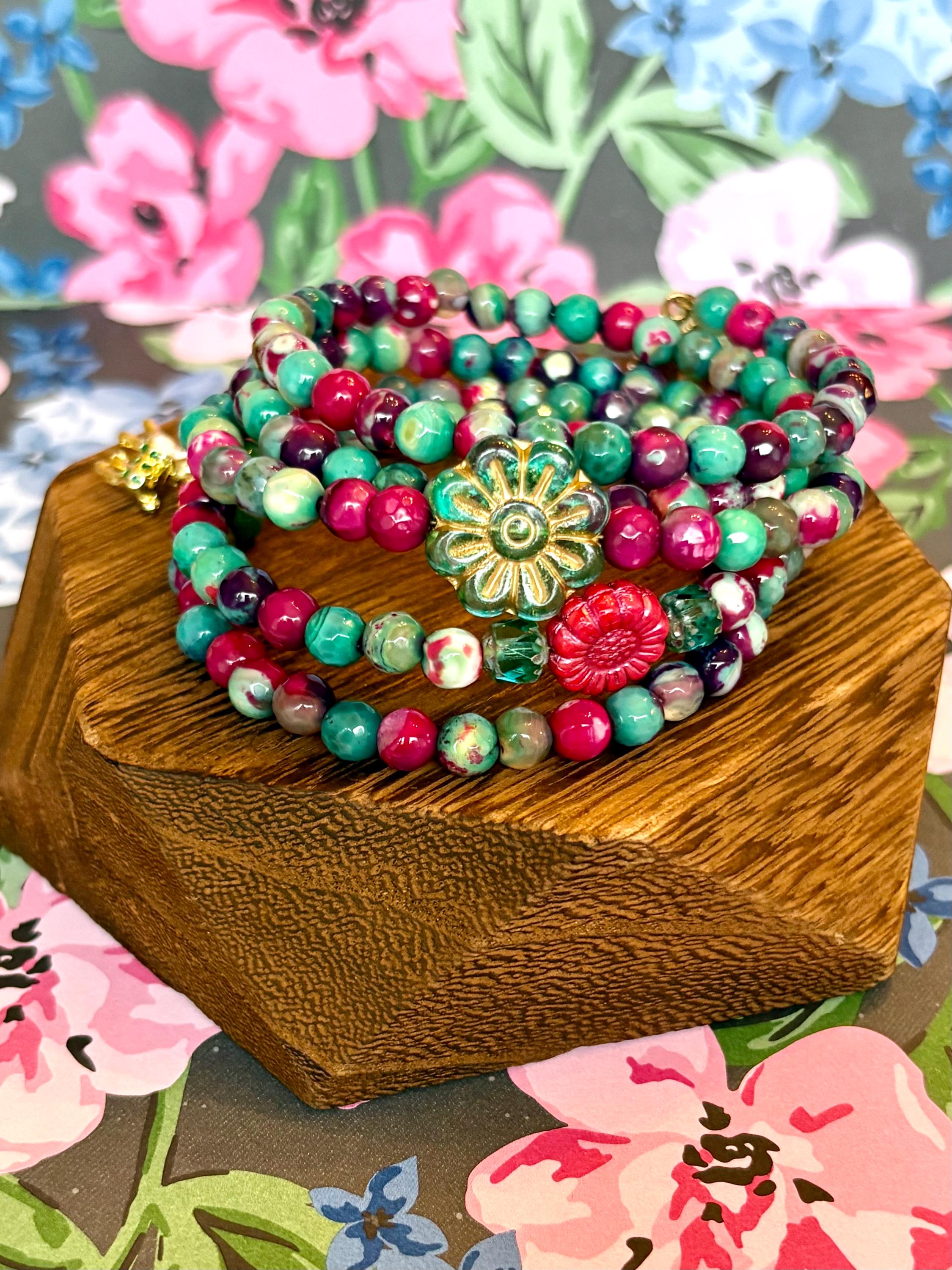 Holly Berry Joy Gemstone Wrap Bracelet – Jade, Czech Glass Daisy & Cathedral Beads | Reindeer and Noel Charms | Holiday Kissed Collection