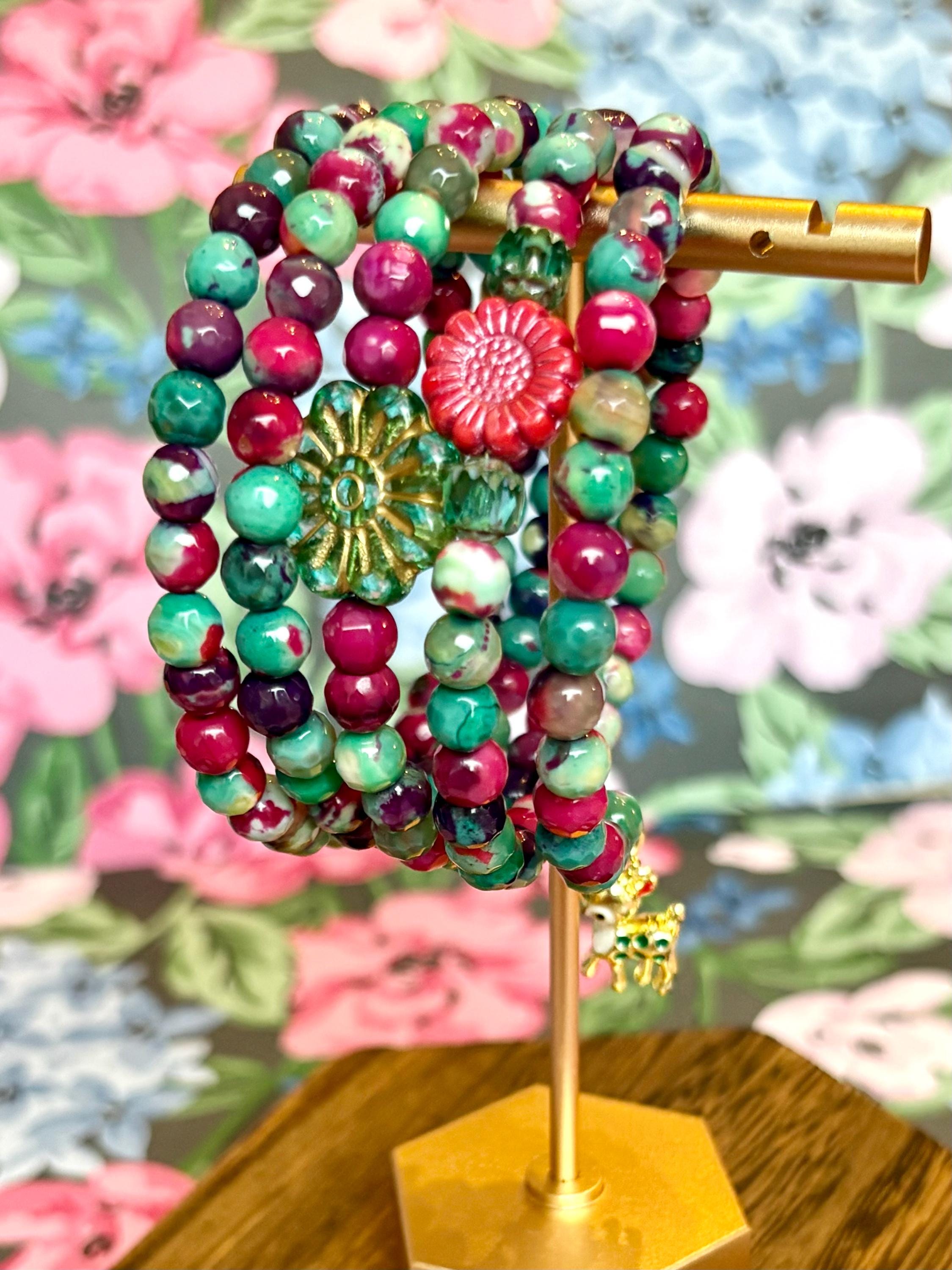 Handcrafted with loving Reiki intention, this wrap features Jade gemstones, Czech glass daisy, sunflower, and cathedral beads, and two cheerful enamel charms — a red-nosed reindeer and a Noel charm — symbols of light, laughter, and love.