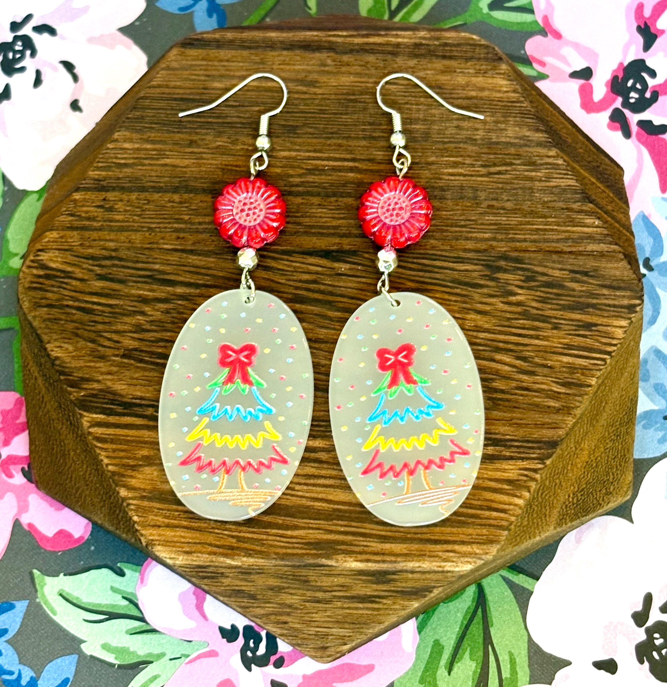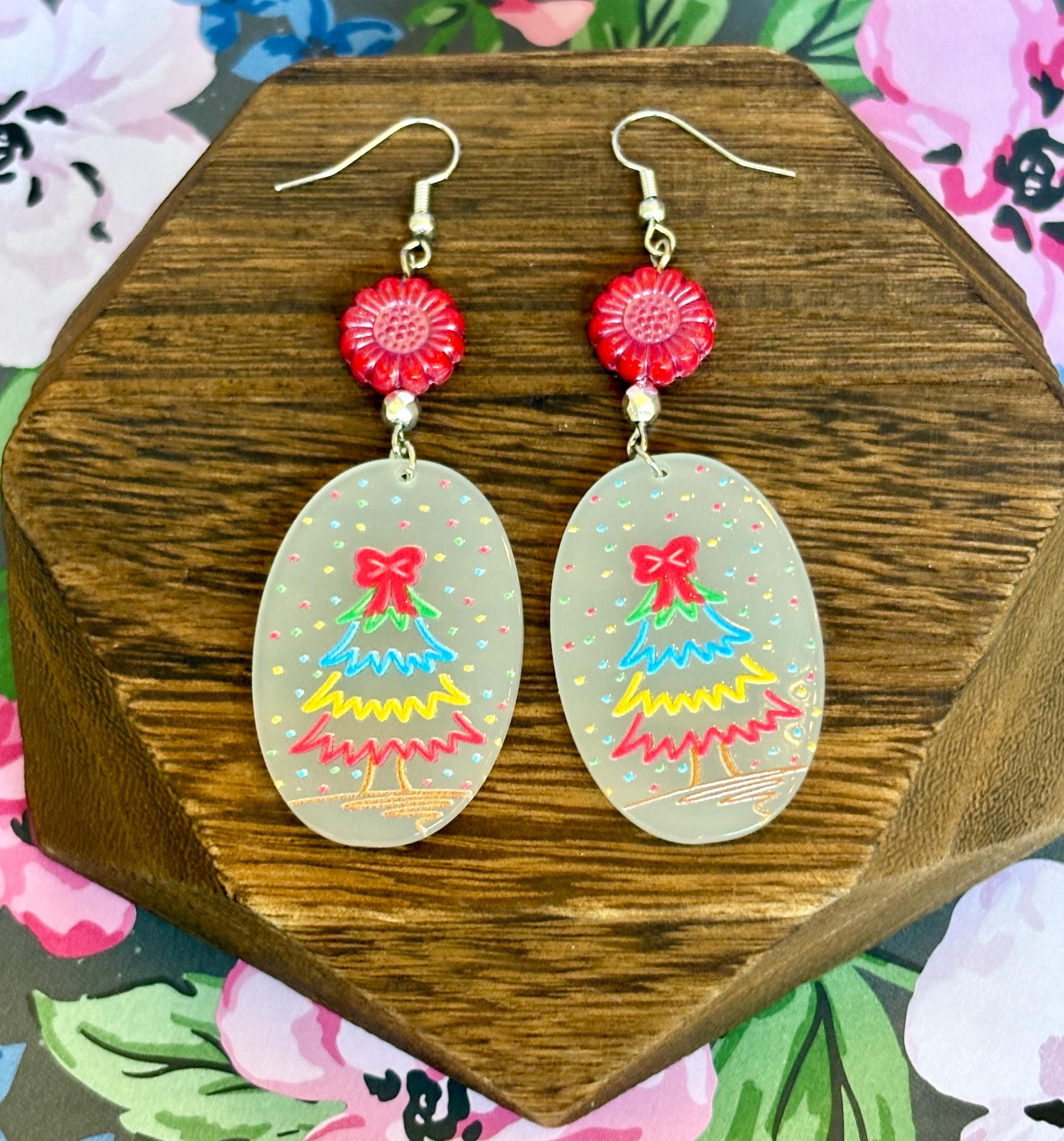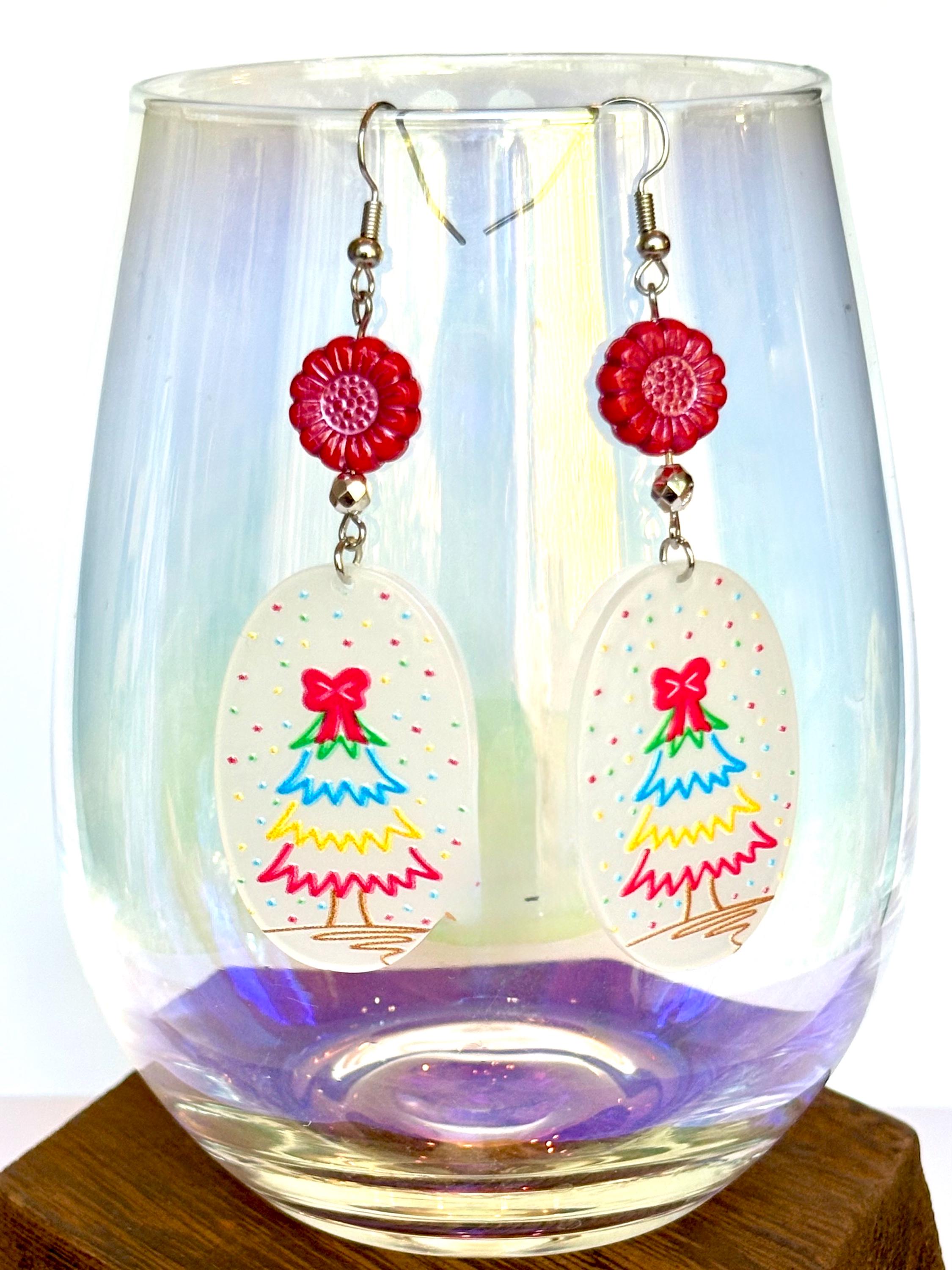 Each pair features Czech glass red sunflower beads that radiate warmth like a winter sunset, bright faceted silver hematite gemstones for a touch of shimmer and strength, and whimsical acrylic pendants that capture the playful spirit of Christmas magic.