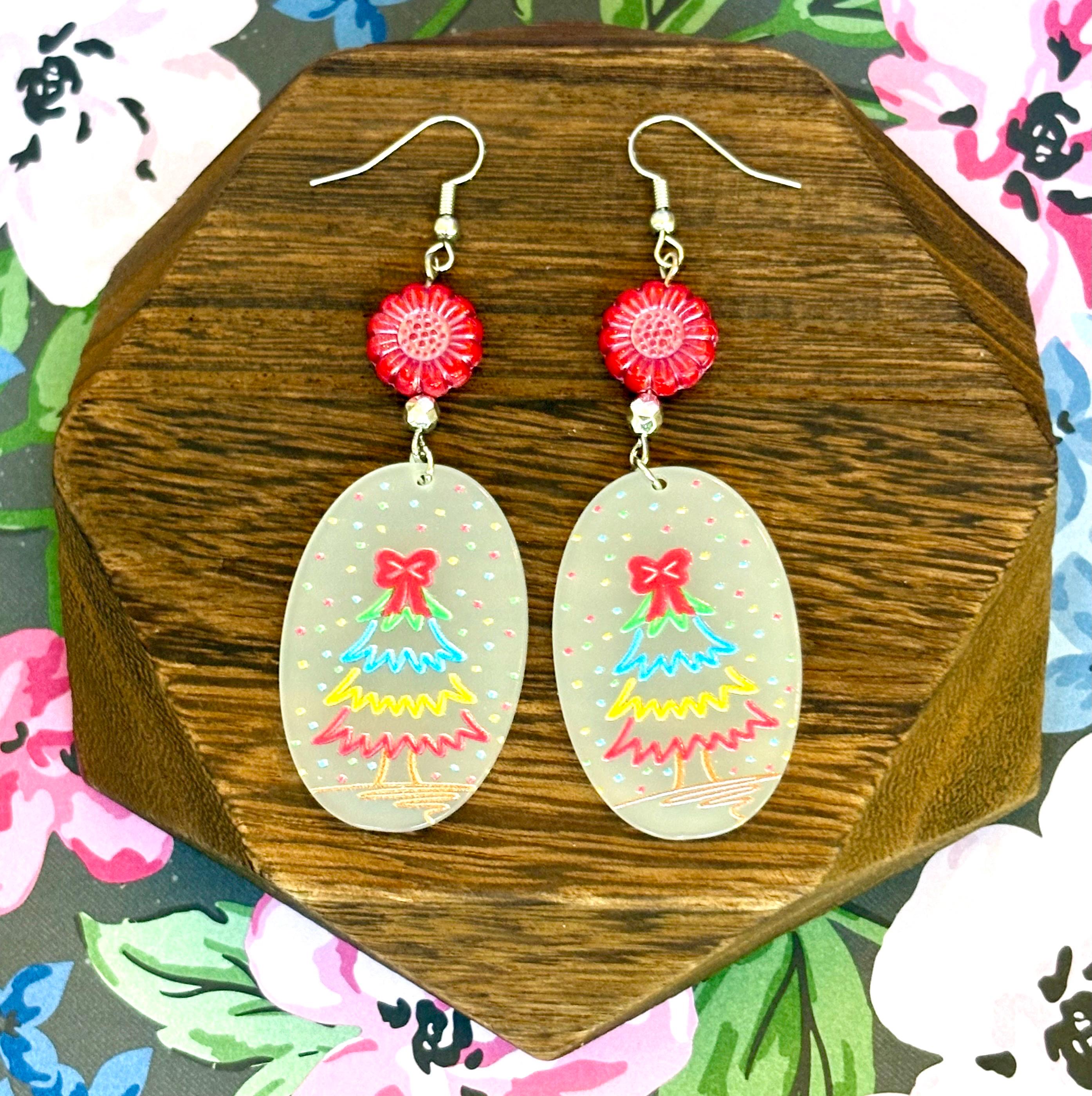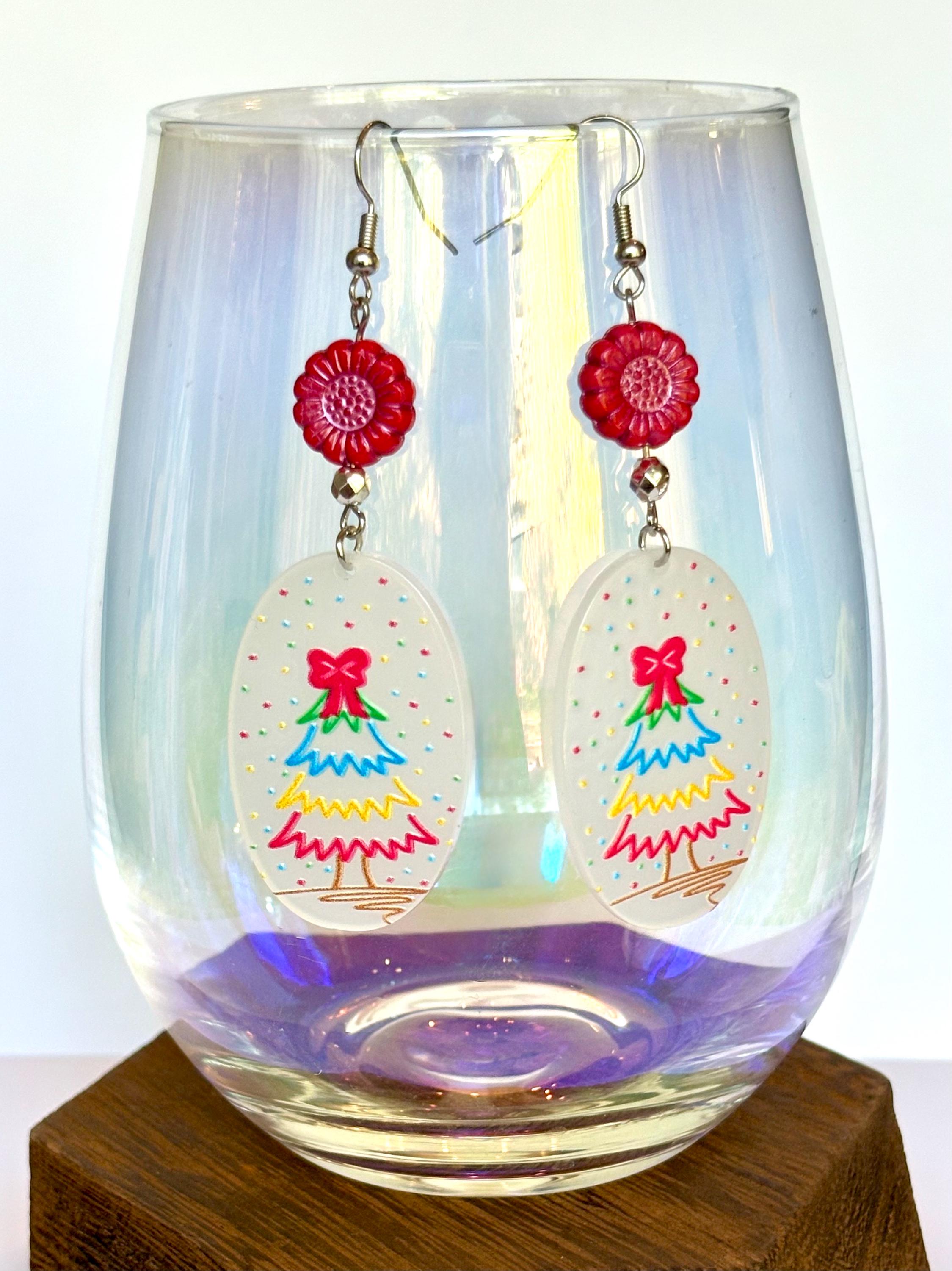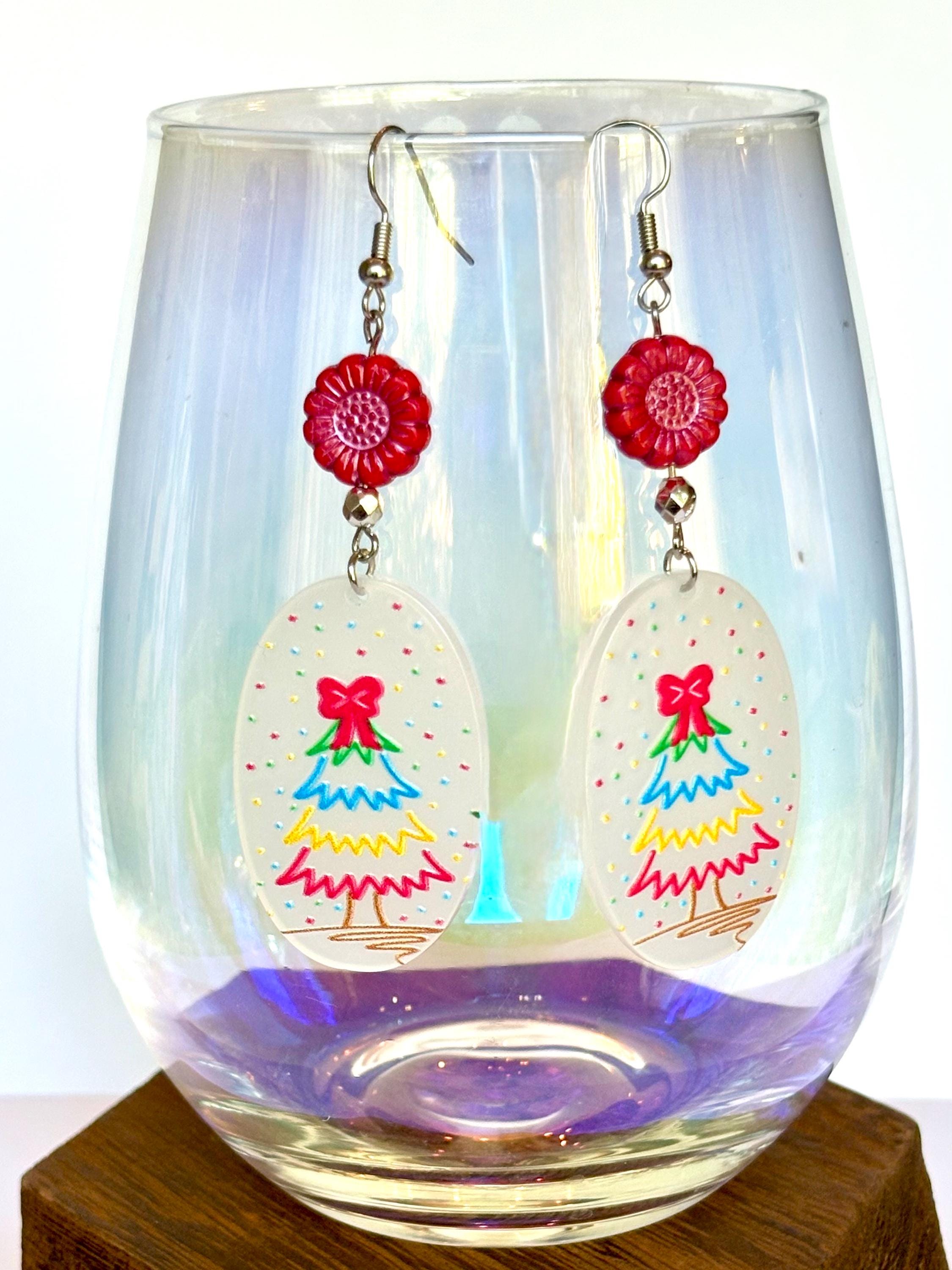 Each pair features Czech glass red sunflower beads that radiate warmth like a winter sunset, bright faceted silver hematite gemstones for a touch of shimmer and strength, and whimsical acrylic pendants that capture the playful spirit of Christmas magic.