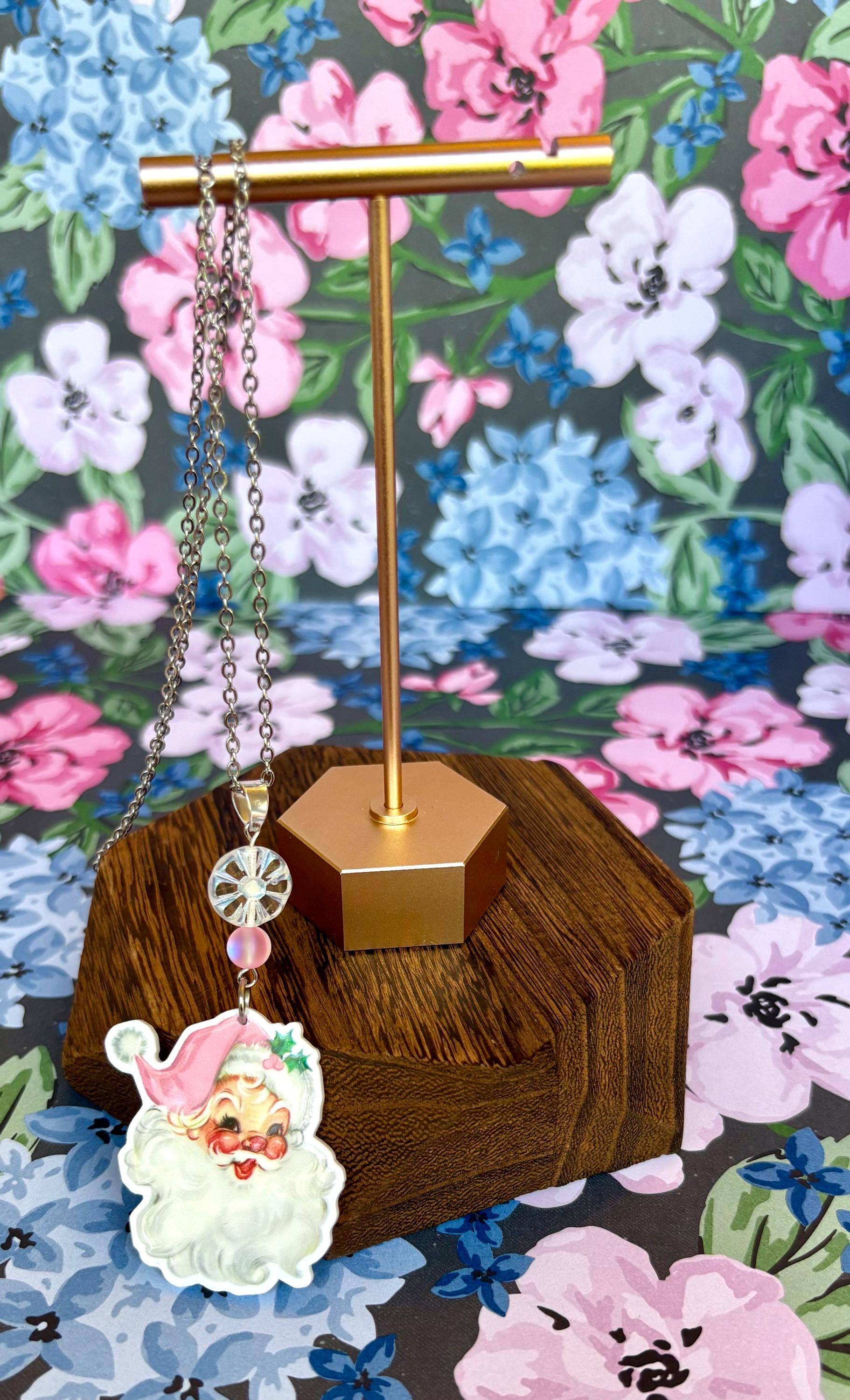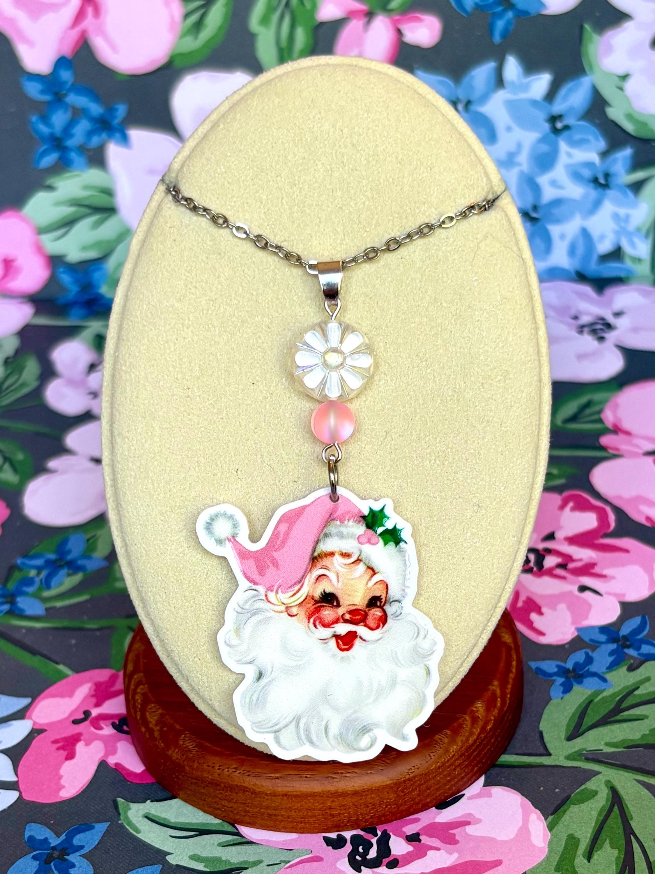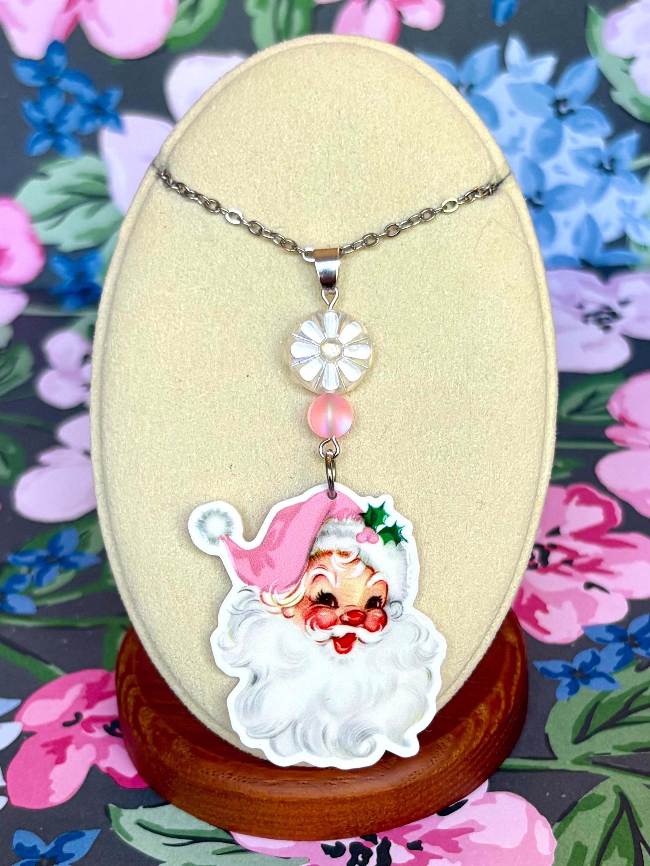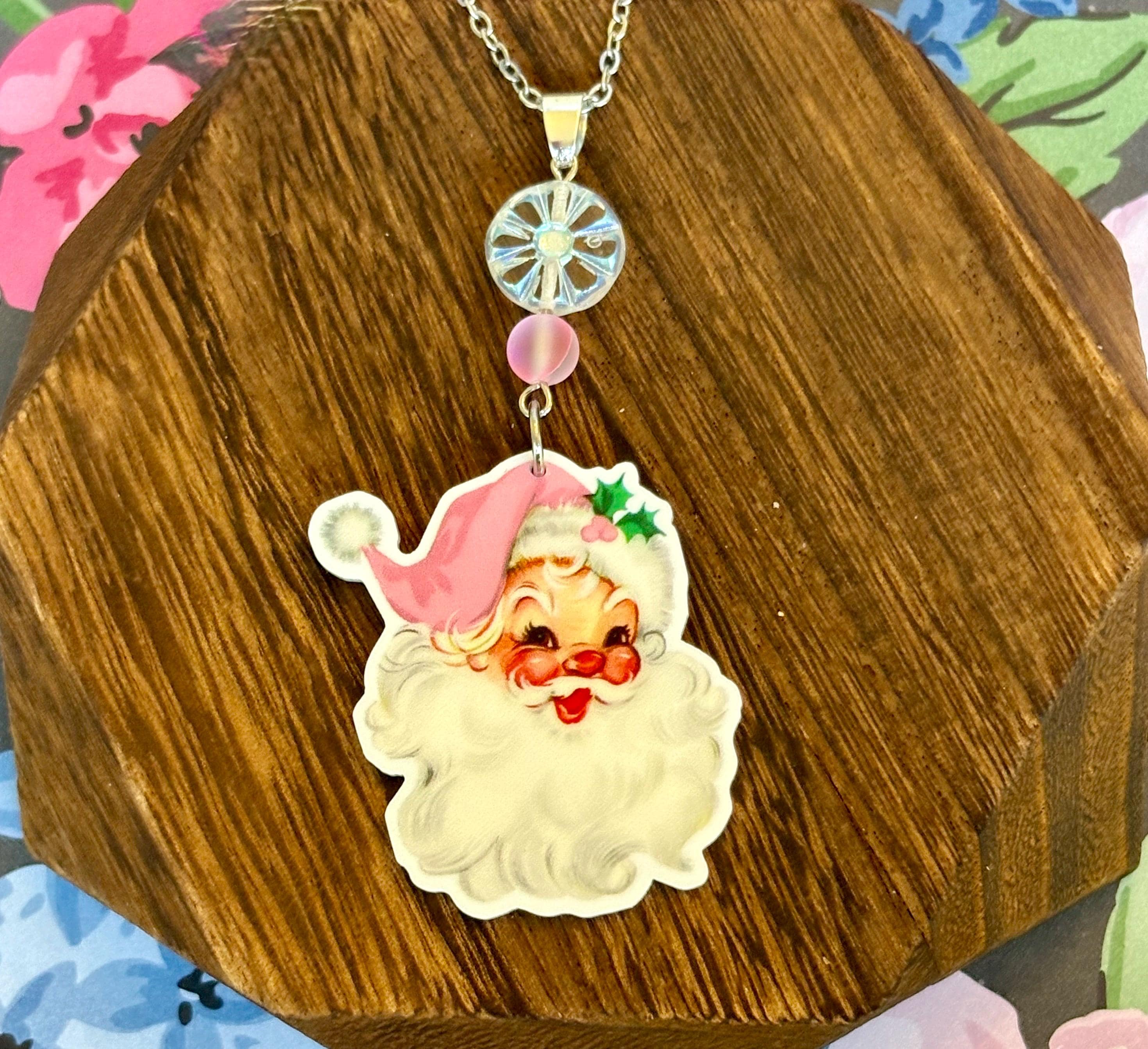 Bring some retro holiday cheer to your look with this Pink Santa Sparkle Pendant Necklace! This festive design features a charming vintage-style Santa charm wearing a pink hat, symbolizing joy, love, and the magic of Christmas. Above Santa, a Czech glass snowflake flower bead catches the light with icy brilliance, paired with a luminous Mystic Aura Quartz gemstone that radiates iridescent, angelic energy.