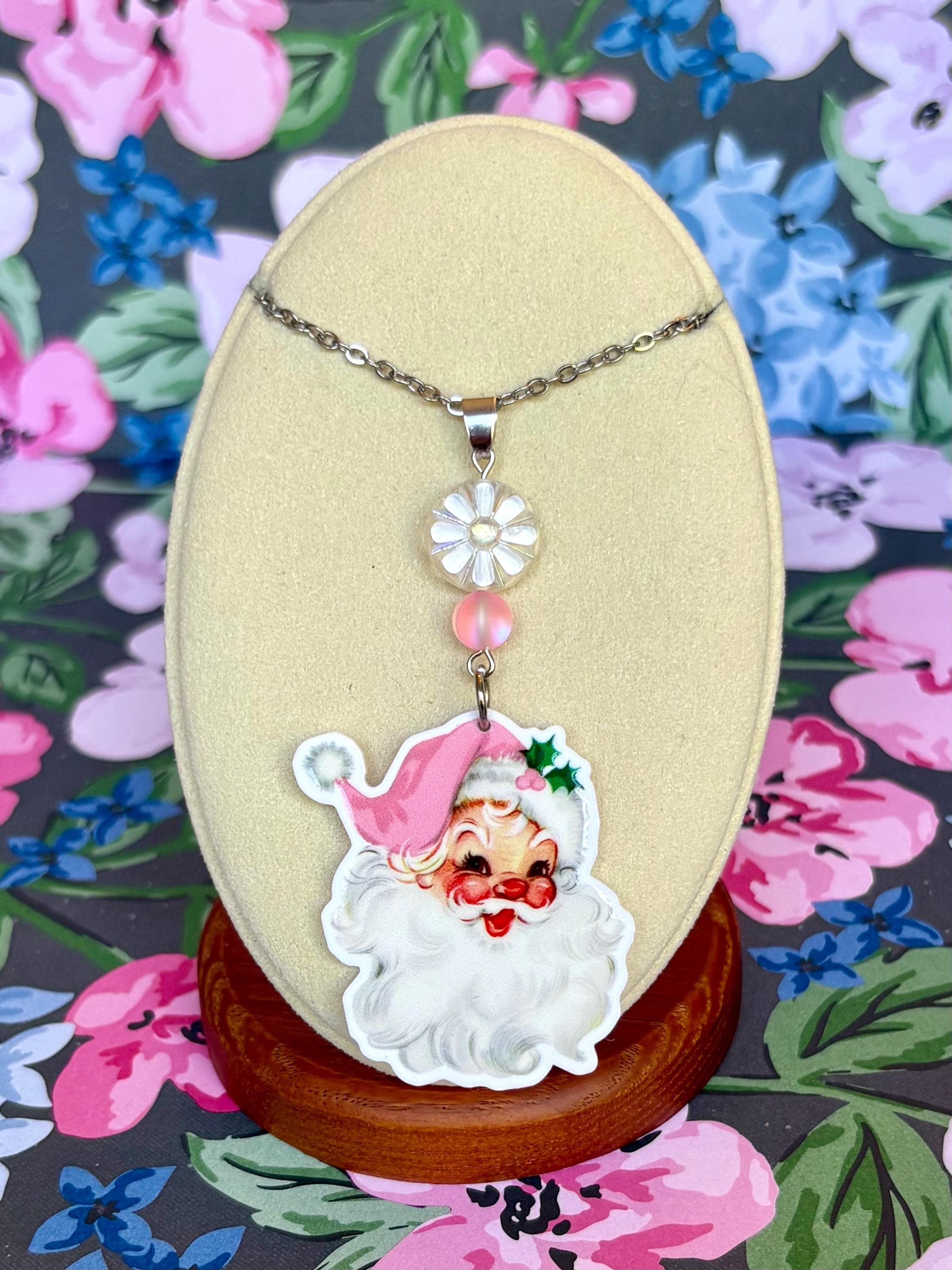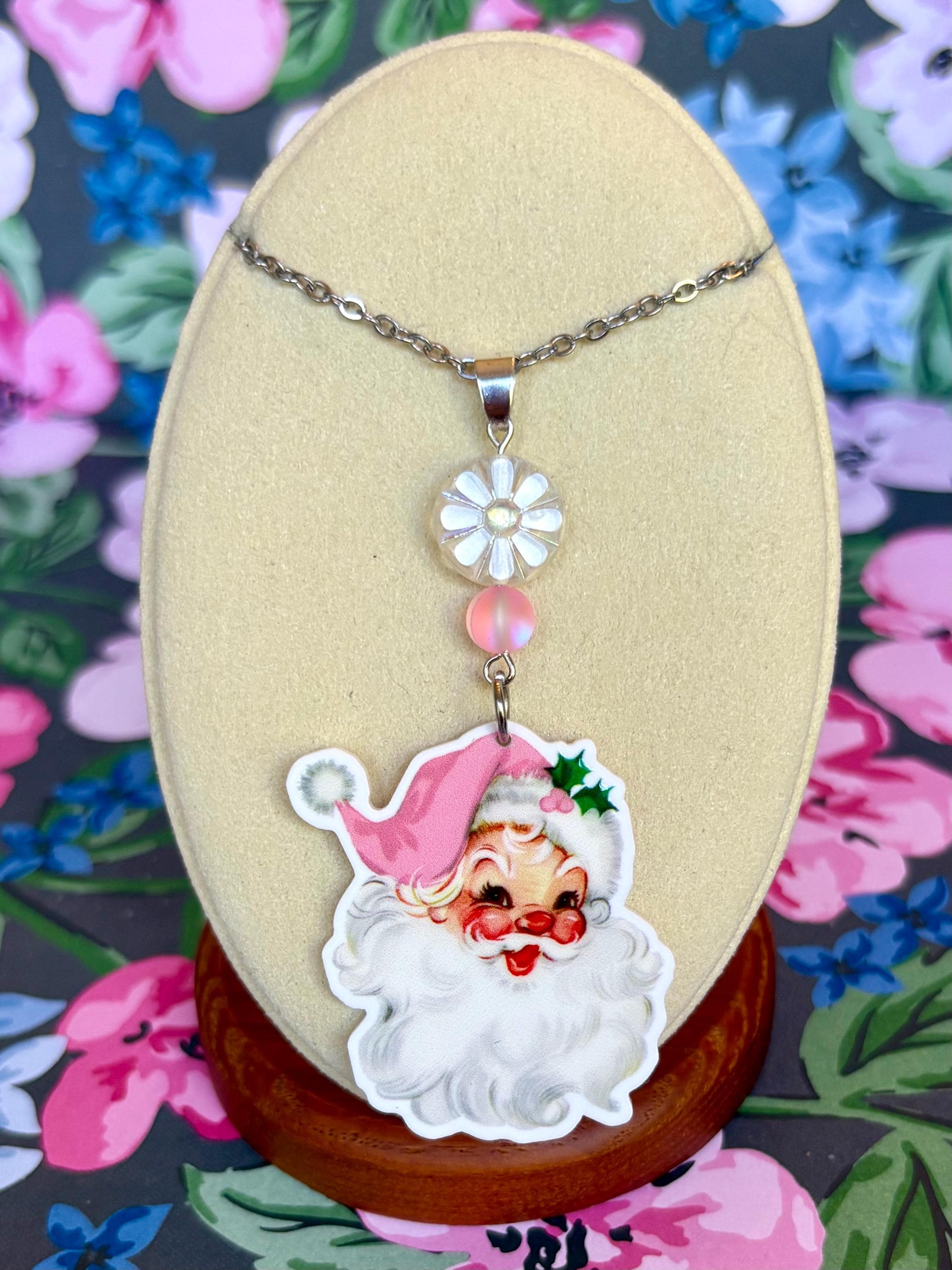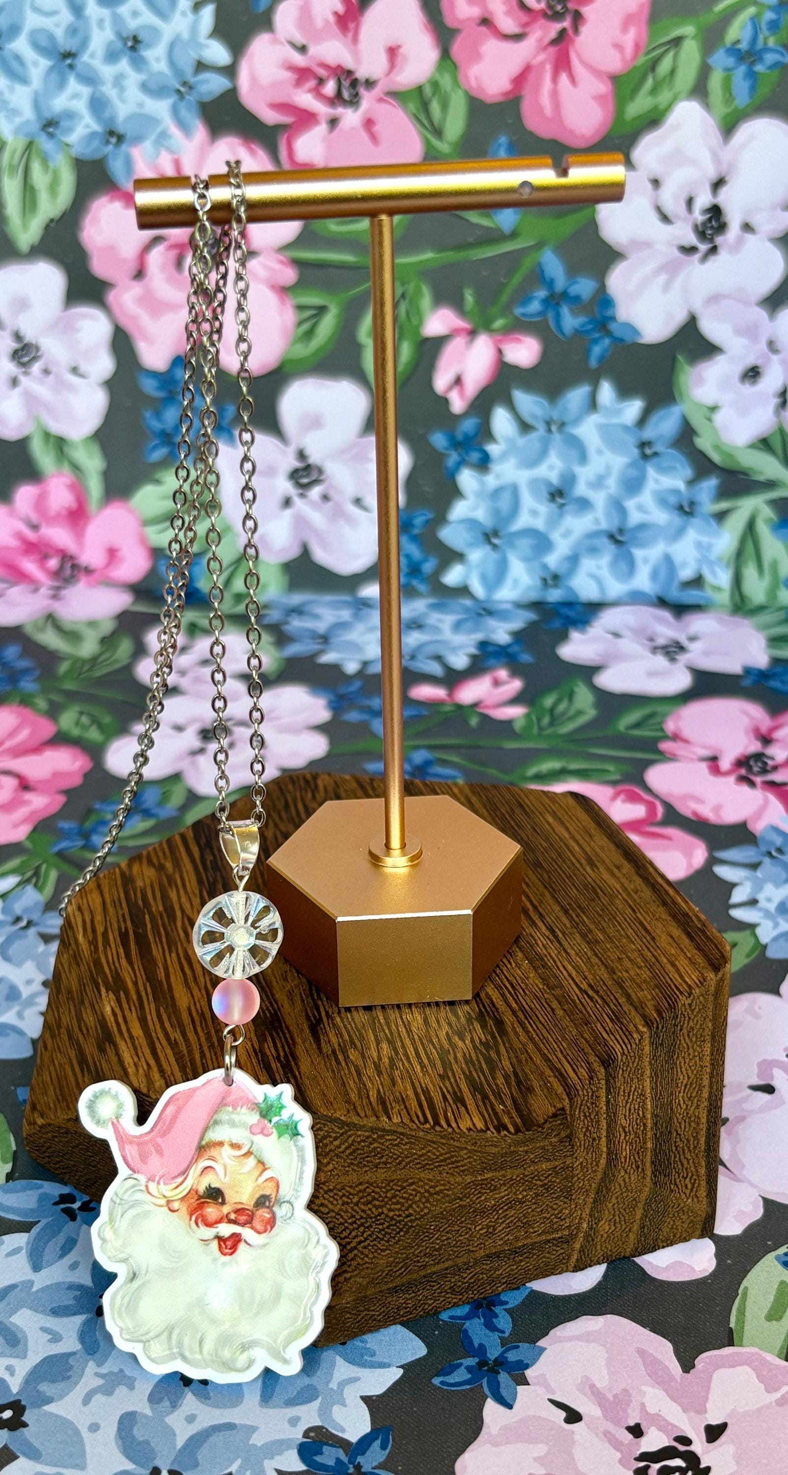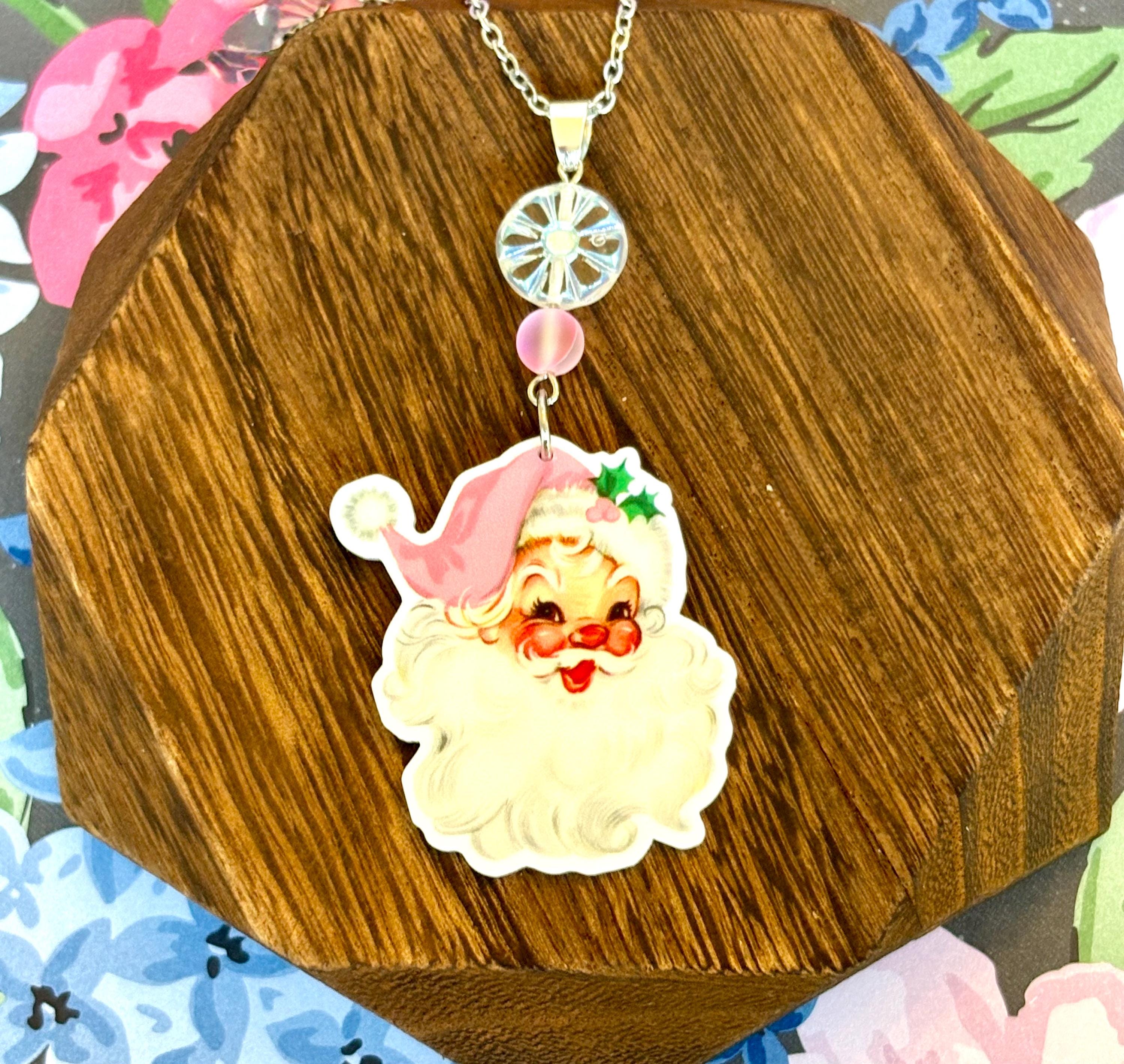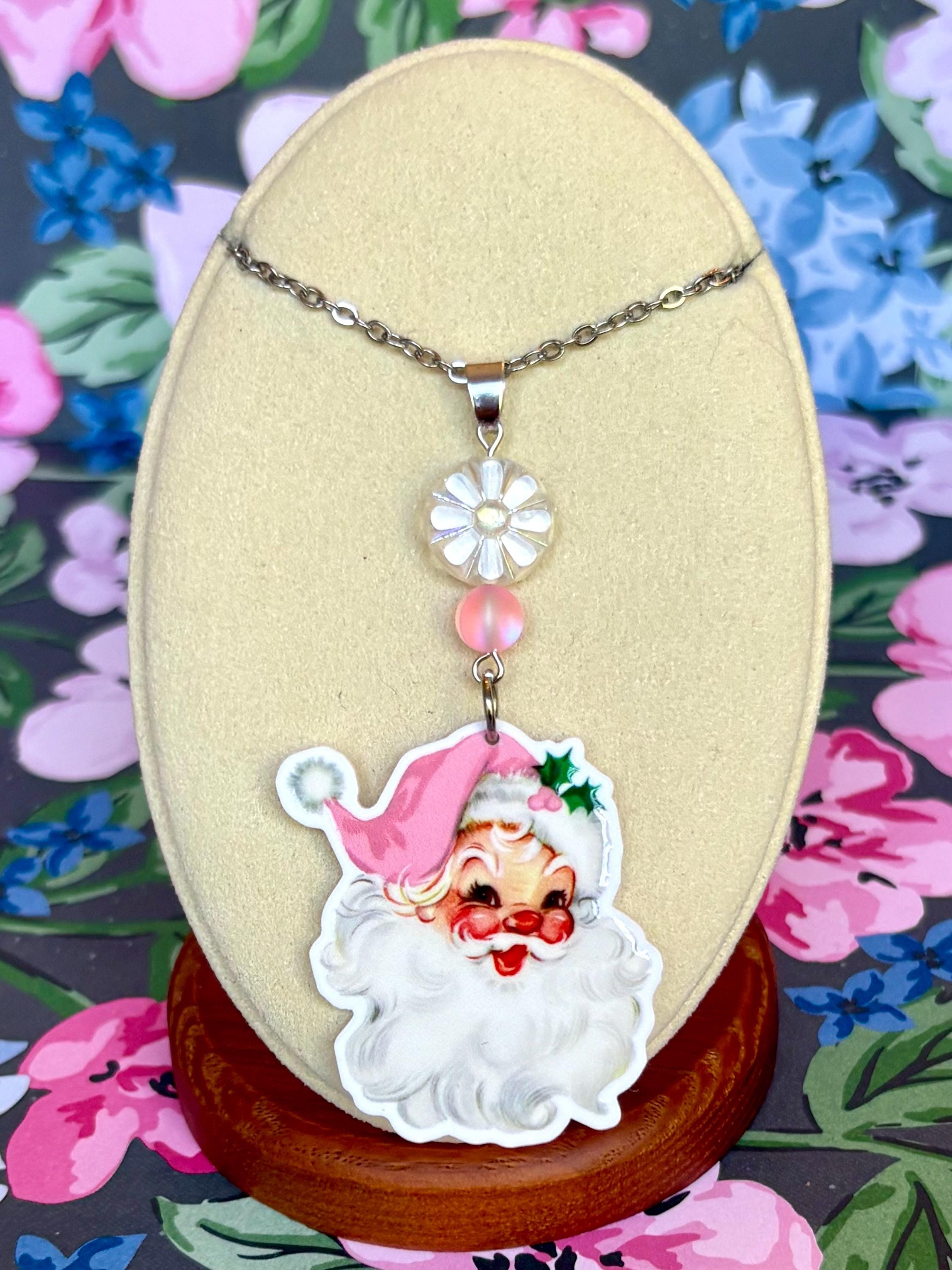 Bring some retro holiday cheer to your look with this Pink Santa Sparkle Pendant Necklace! This festive design features a charming vintage-style Santa charm wearing a pink hat, symbolizing joy, love, and the magic of Christmas. Above Santa, a Czech glass snowflake flower bead catches the light with icy brilliance, paired with a luminous Mystic Aura Quartz gemstone that radiates iridescent, angelic energy.