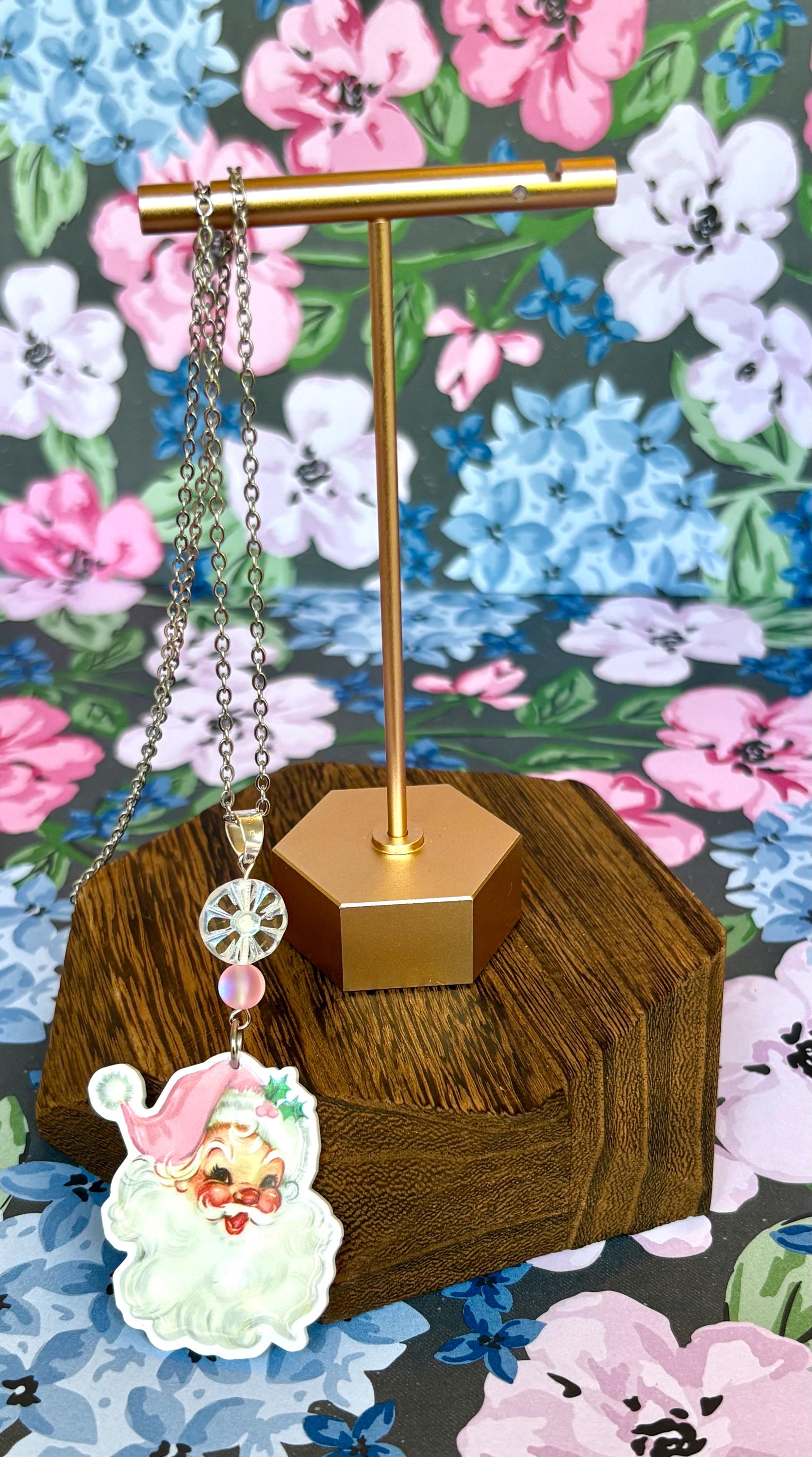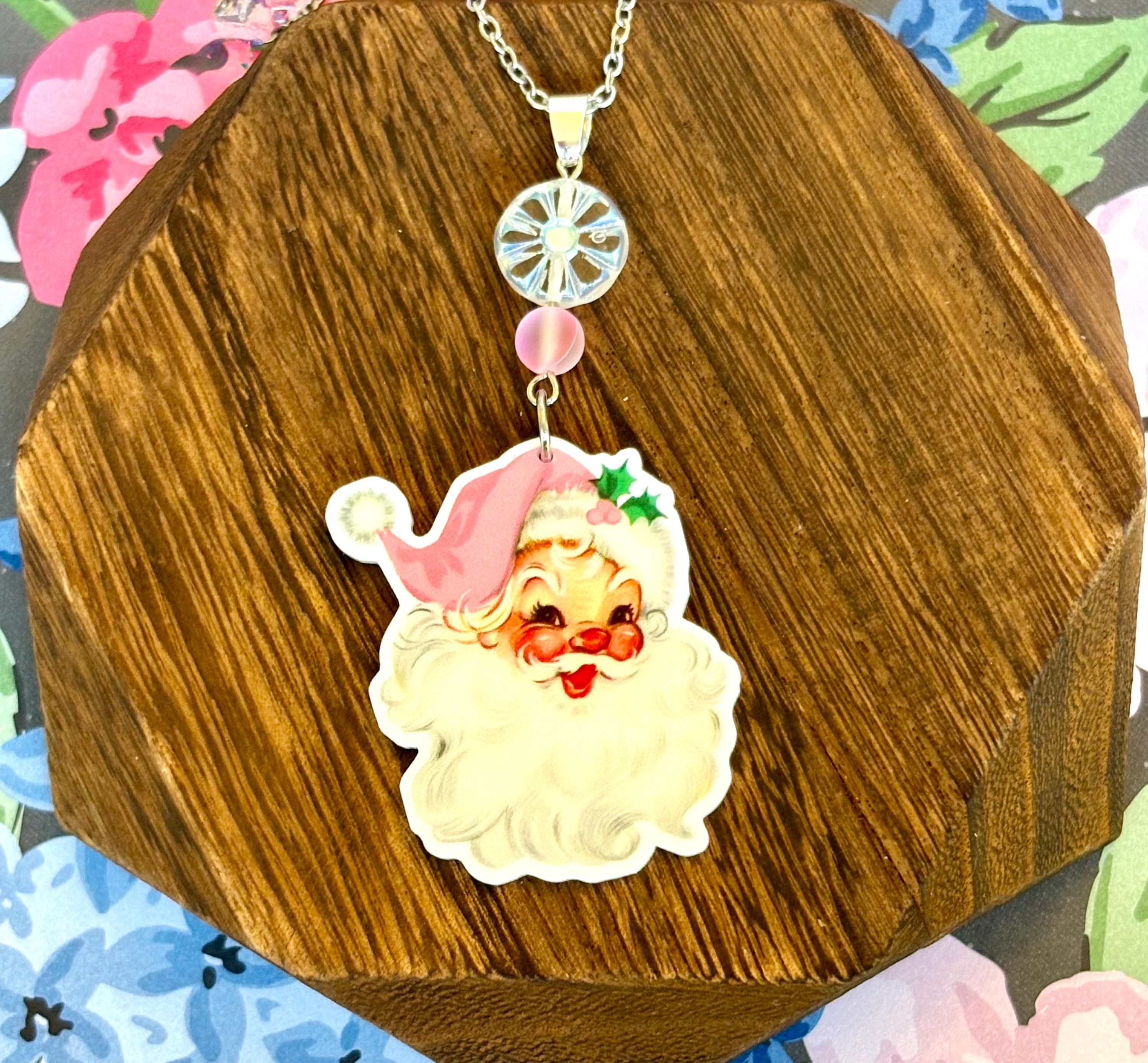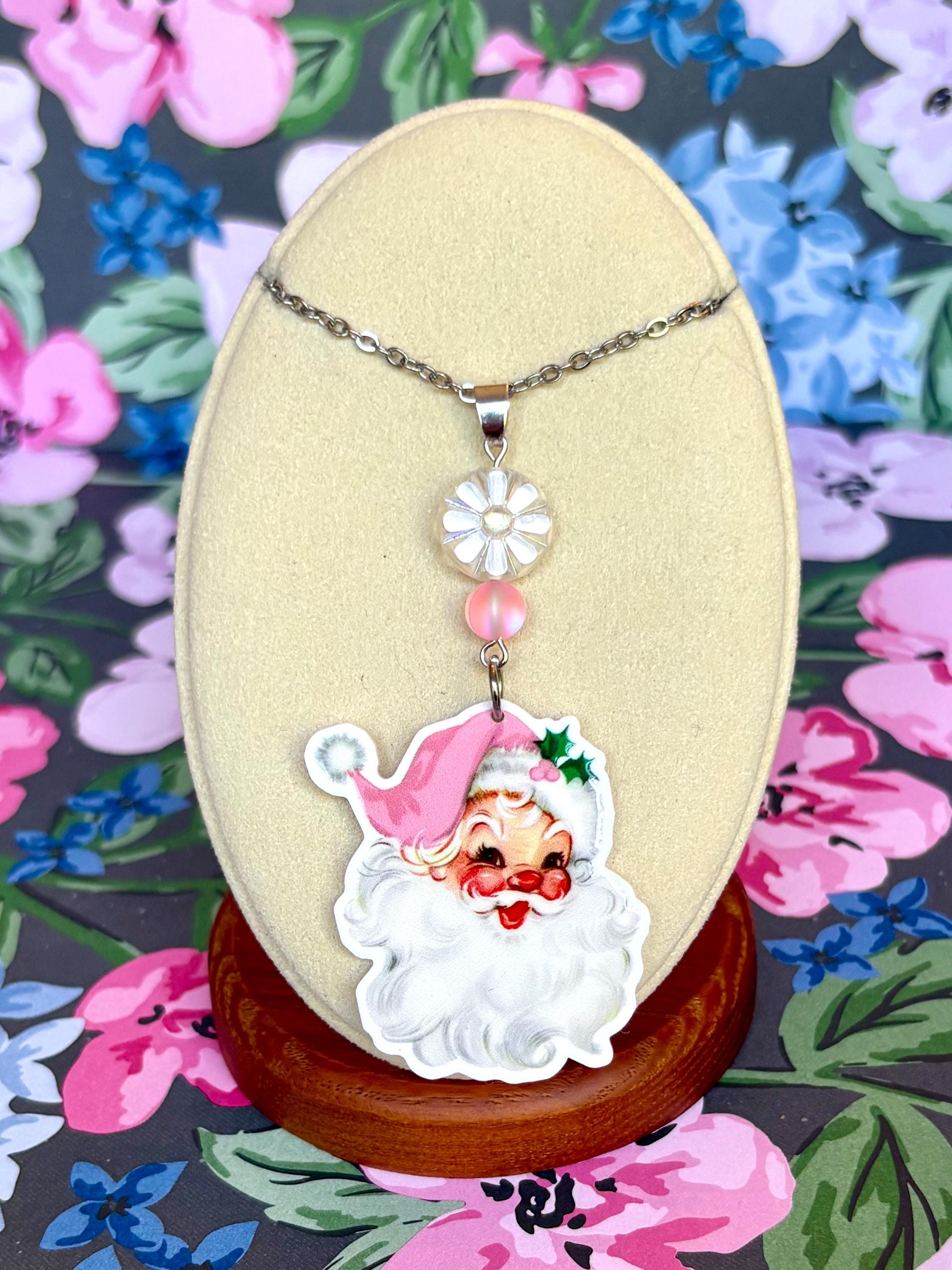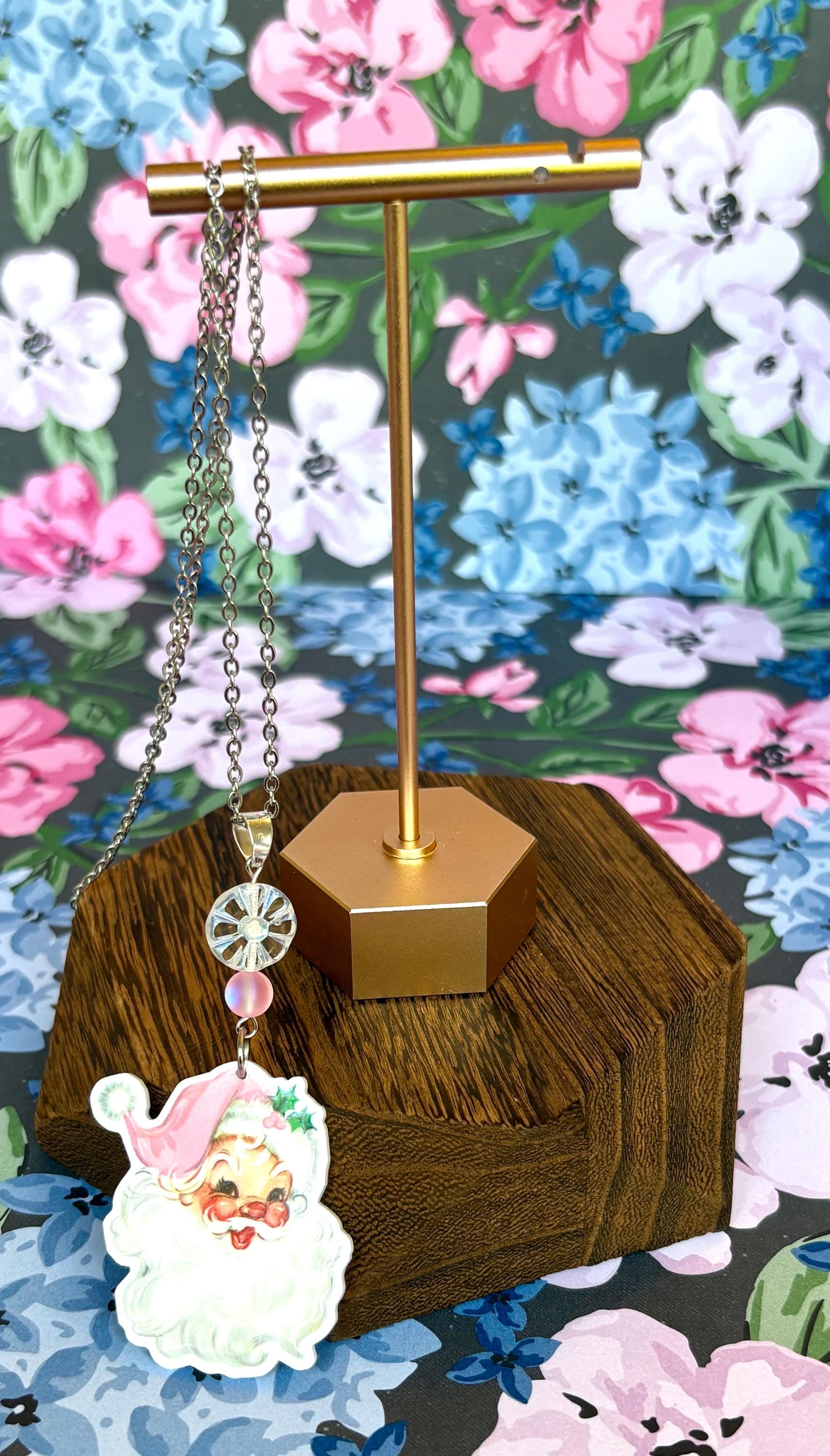 Bring some retro holiday cheer to your look with this Pink Santa Sparkle Pendant Necklace! This festive design features a charming vintage-style Santa charm wearing a pink hat, symbolizing joy, love, and the magic of Christmas. Above Santa, a Czech glass snowflake flower bead catches the light with icy brilliance, paired with a luminous Mystic Aura Quartz gemstone that radiates iridescent, angelic energy.