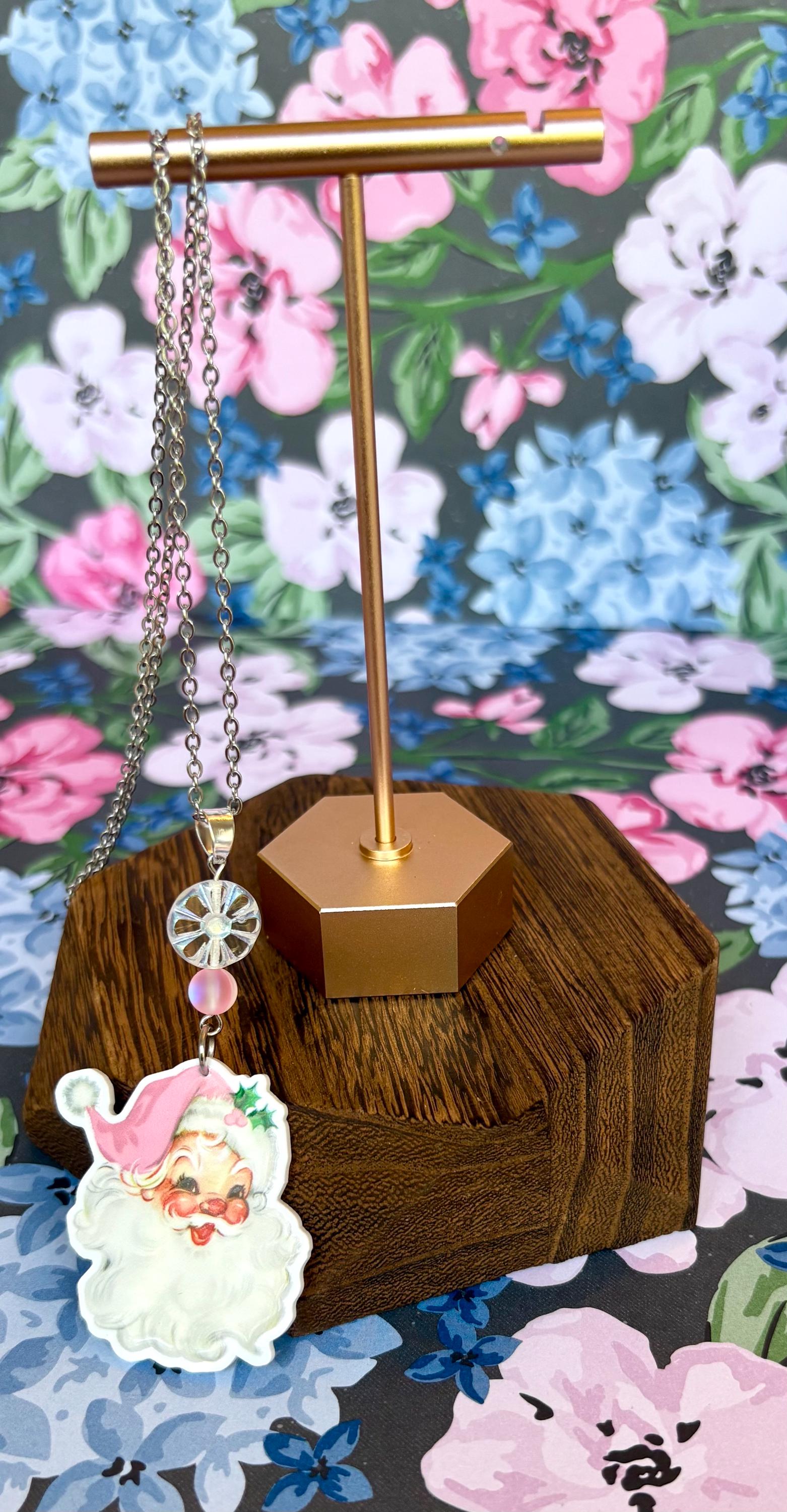 Pink Santa Sparkle Pendant Necklace | Mystic Aura Quartz & Czech Glass Snowflake | Vintage Style Christmas Jewelry | Holiday Gift