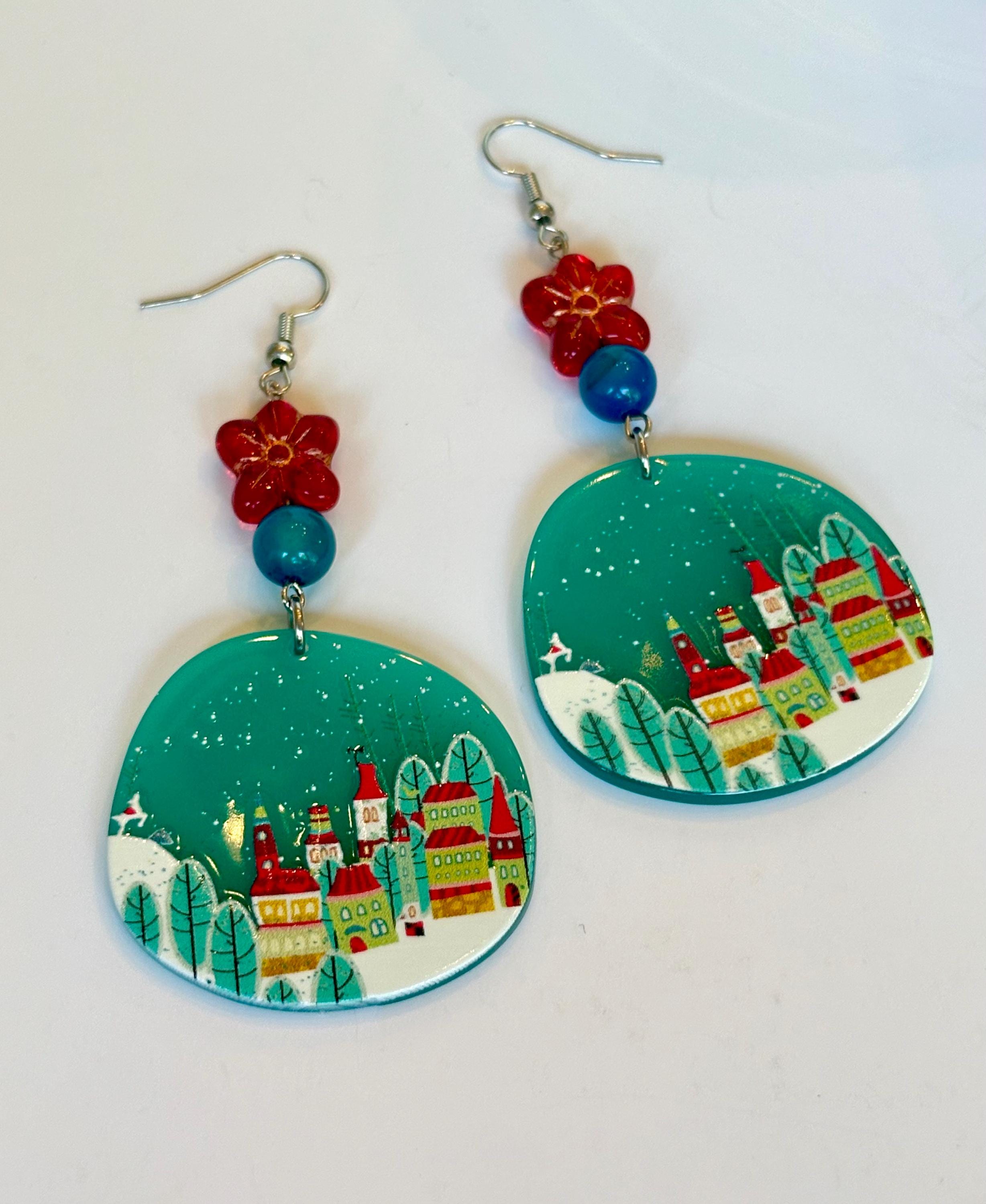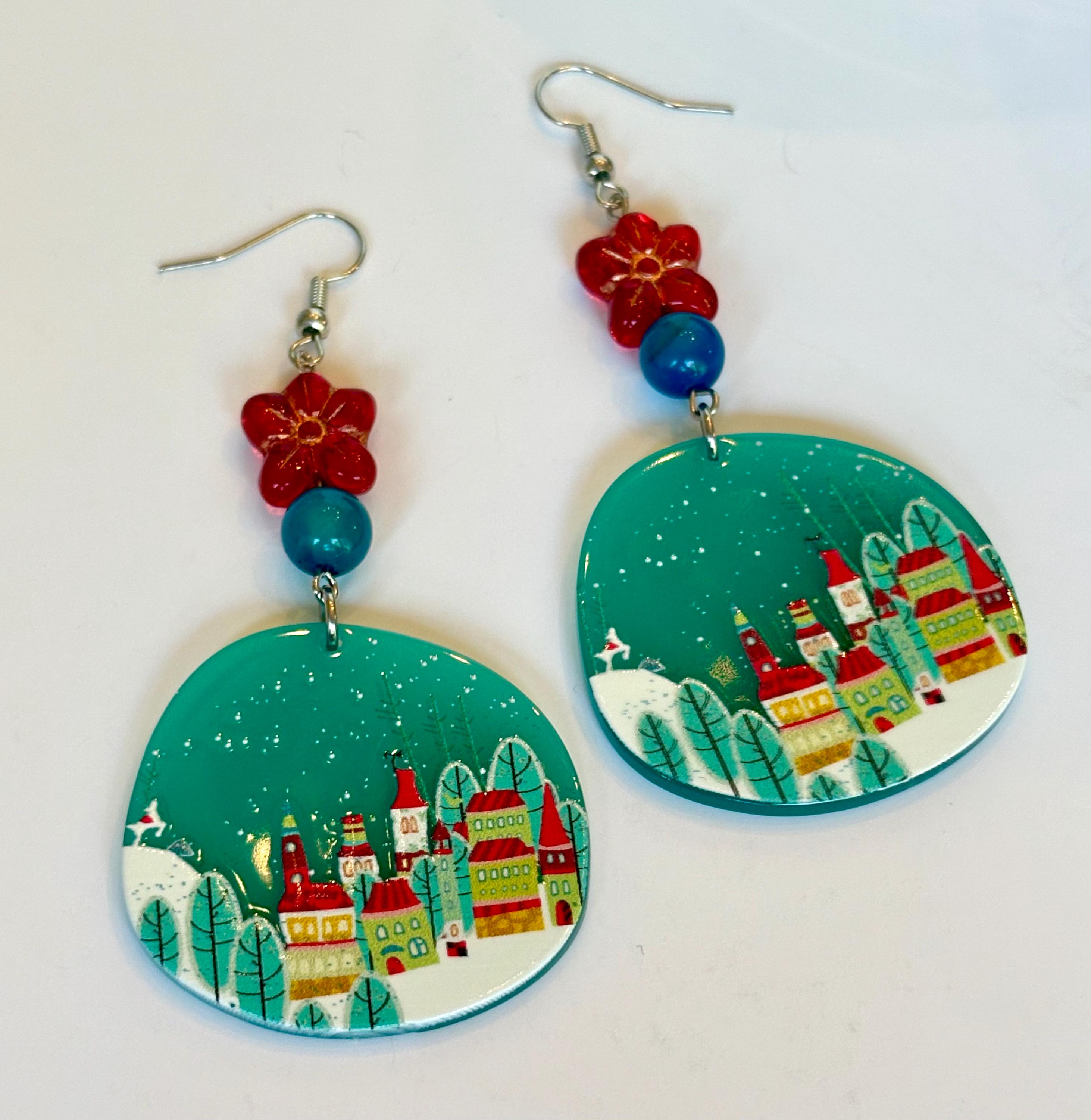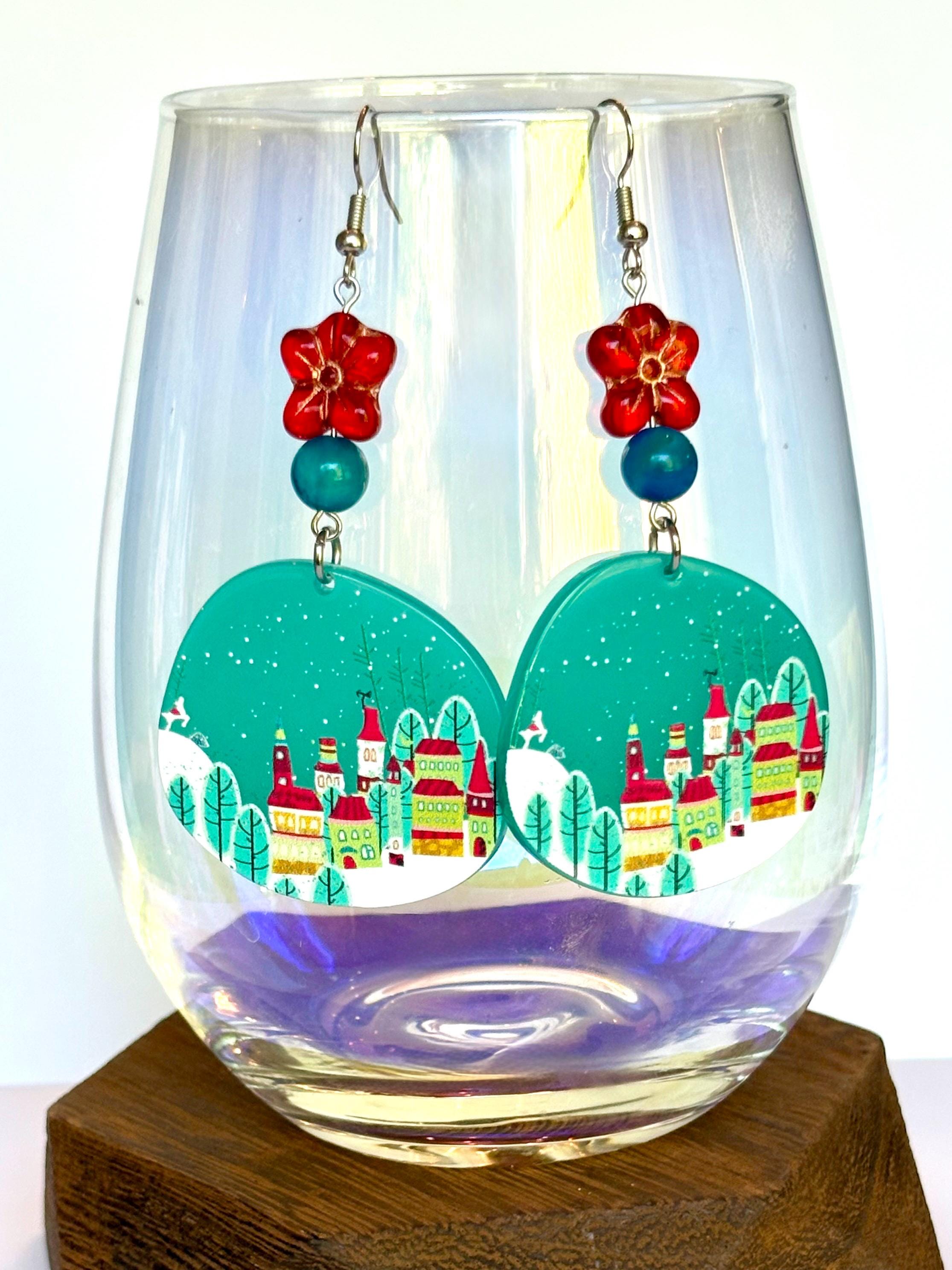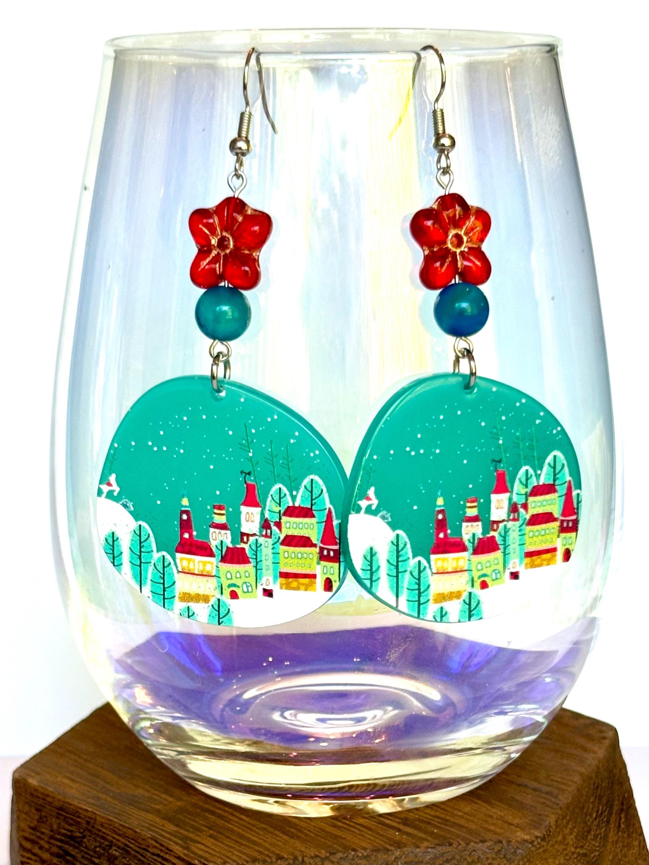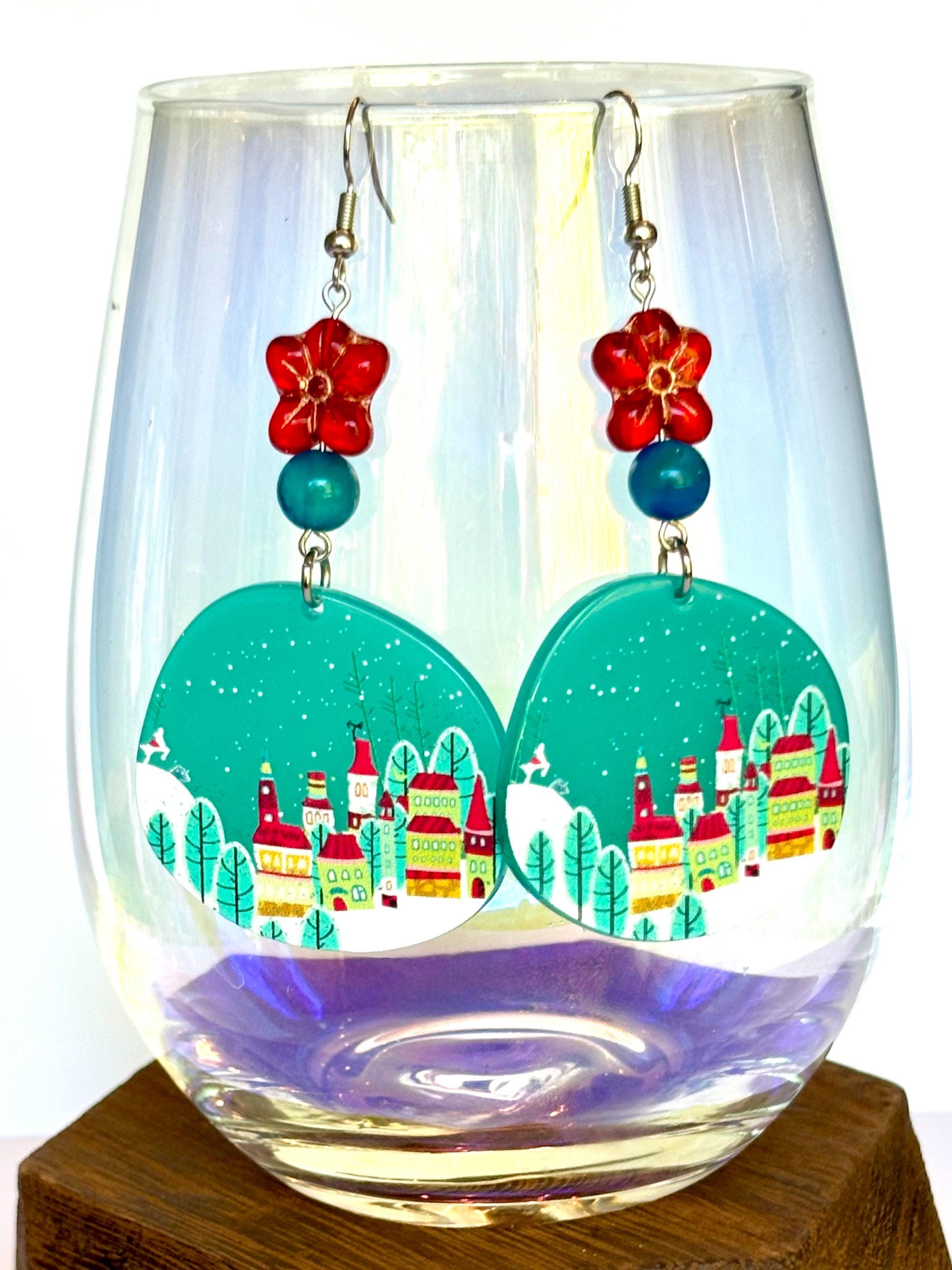Step into a storybook winter wonderland with these Enchanted Winter Village Earrings, where cheerful color meets cozy holiday magic!✨ Each pair features handcrafted acrylic pendants showcasing a whimsical snow-covered village in shades of teal, red, yellow, and white—like a Christmas card come to life! Above the village dangle glowing blue Apatite gemstones and shimmering red Czech glass flowers, adding a joyful pop of color and festive charm.