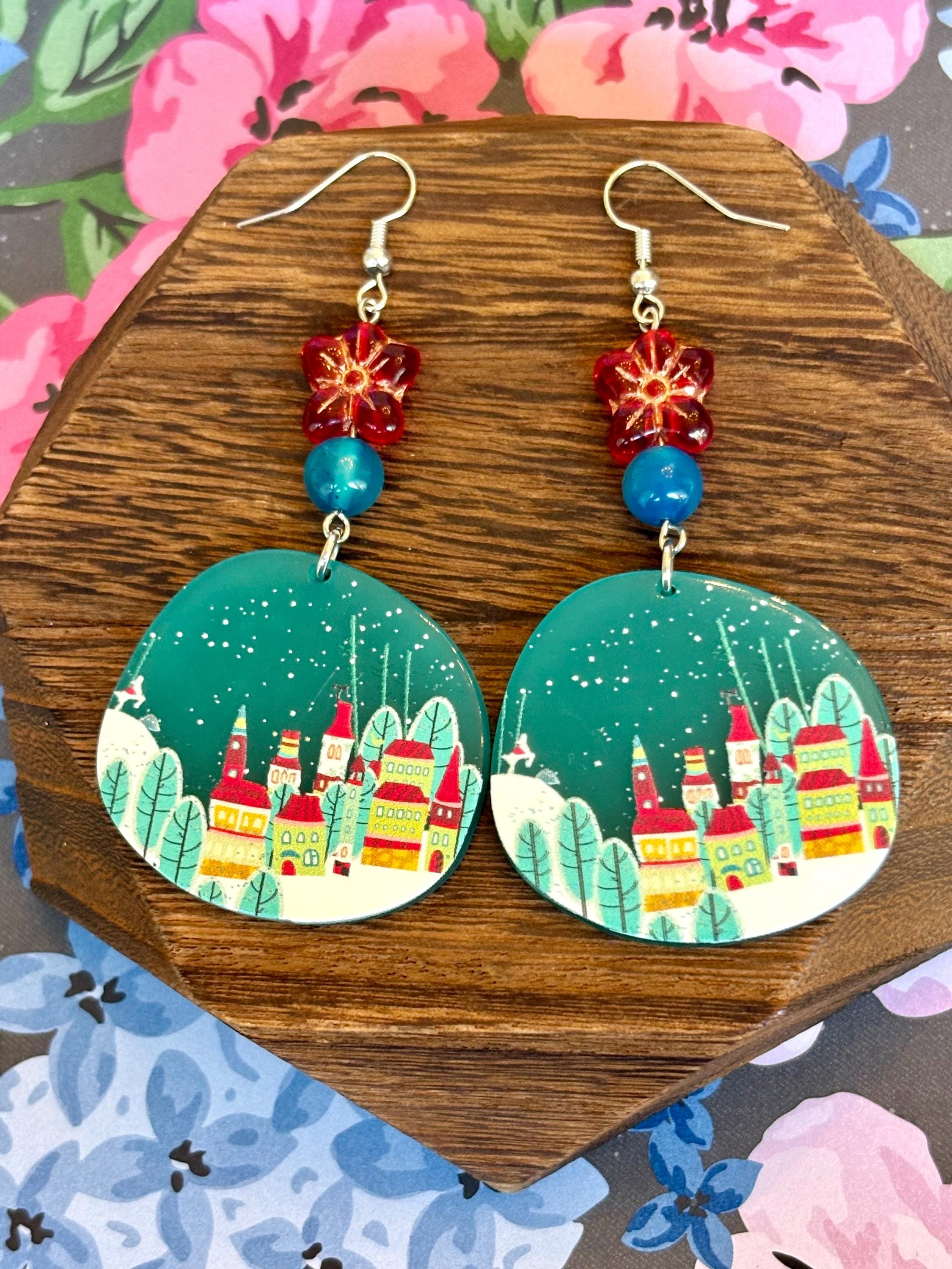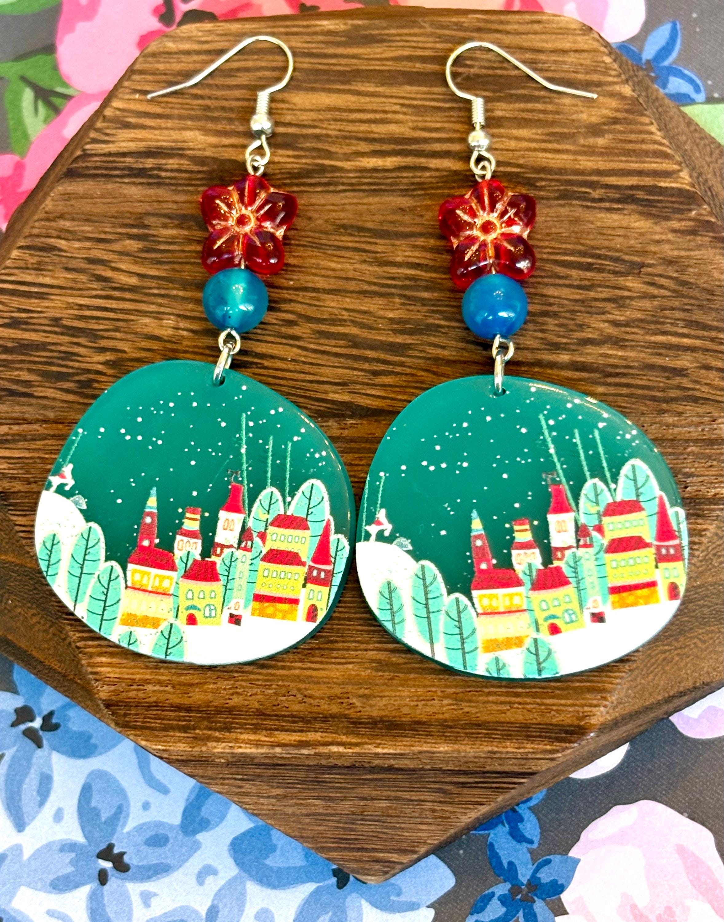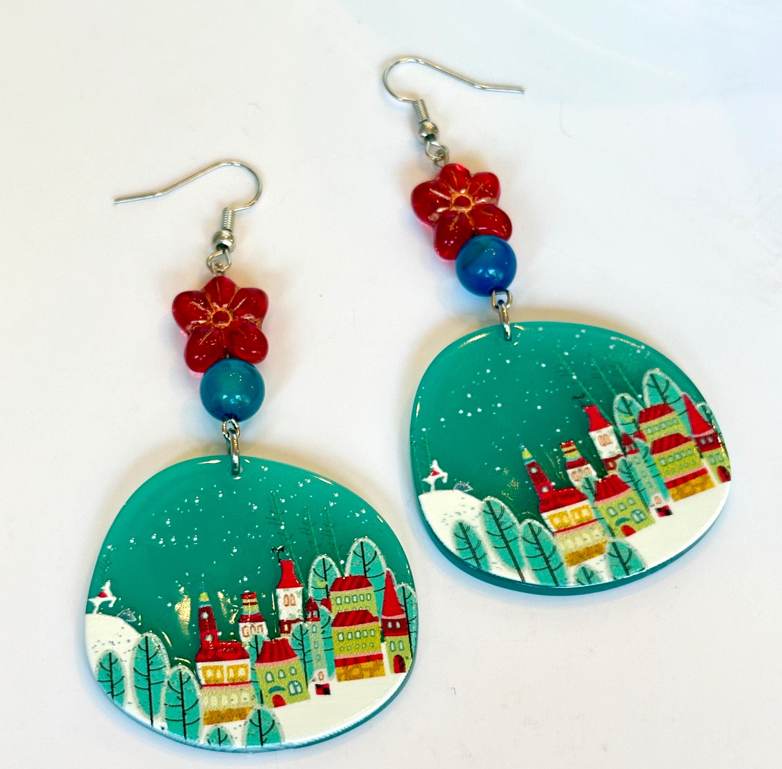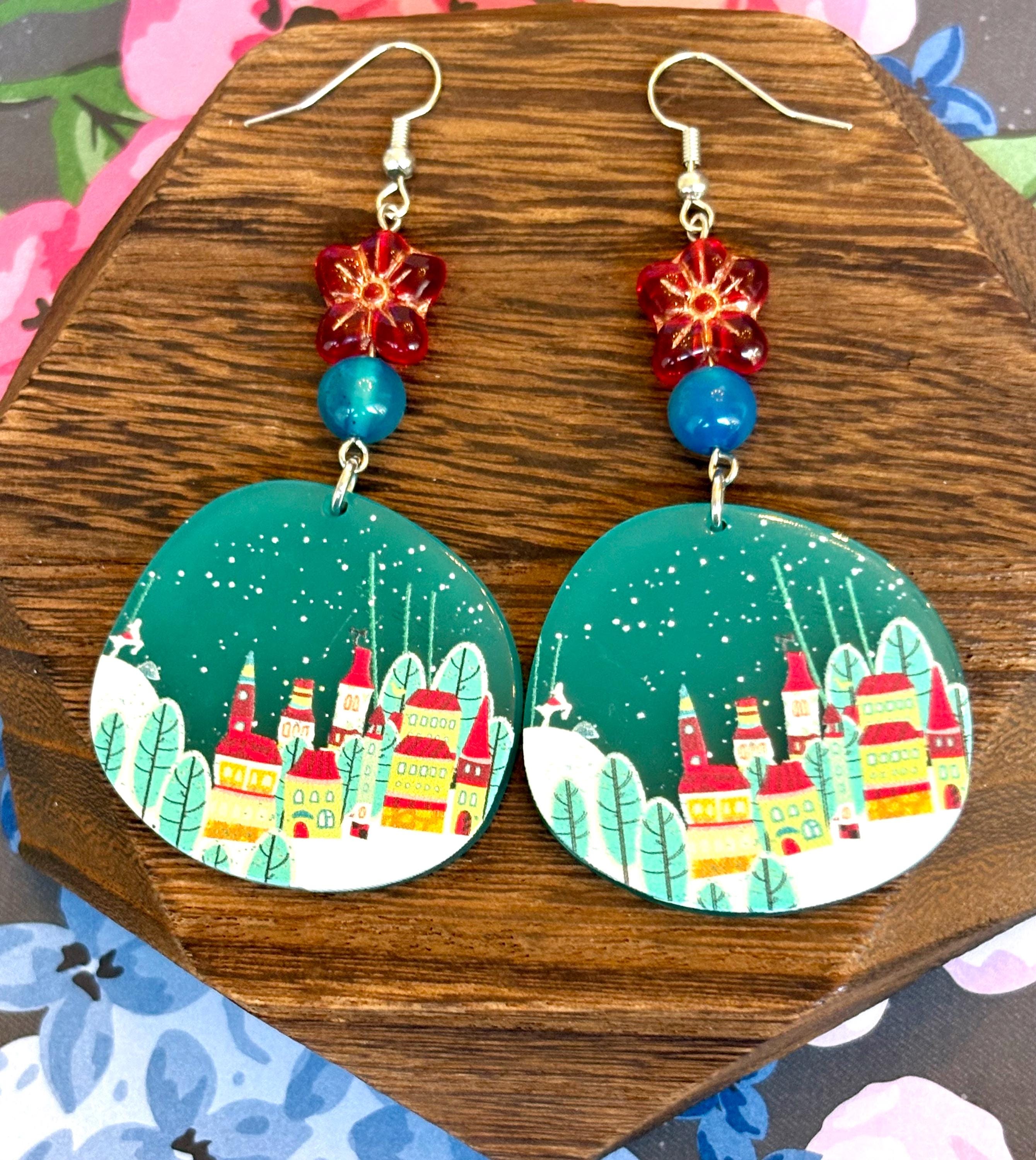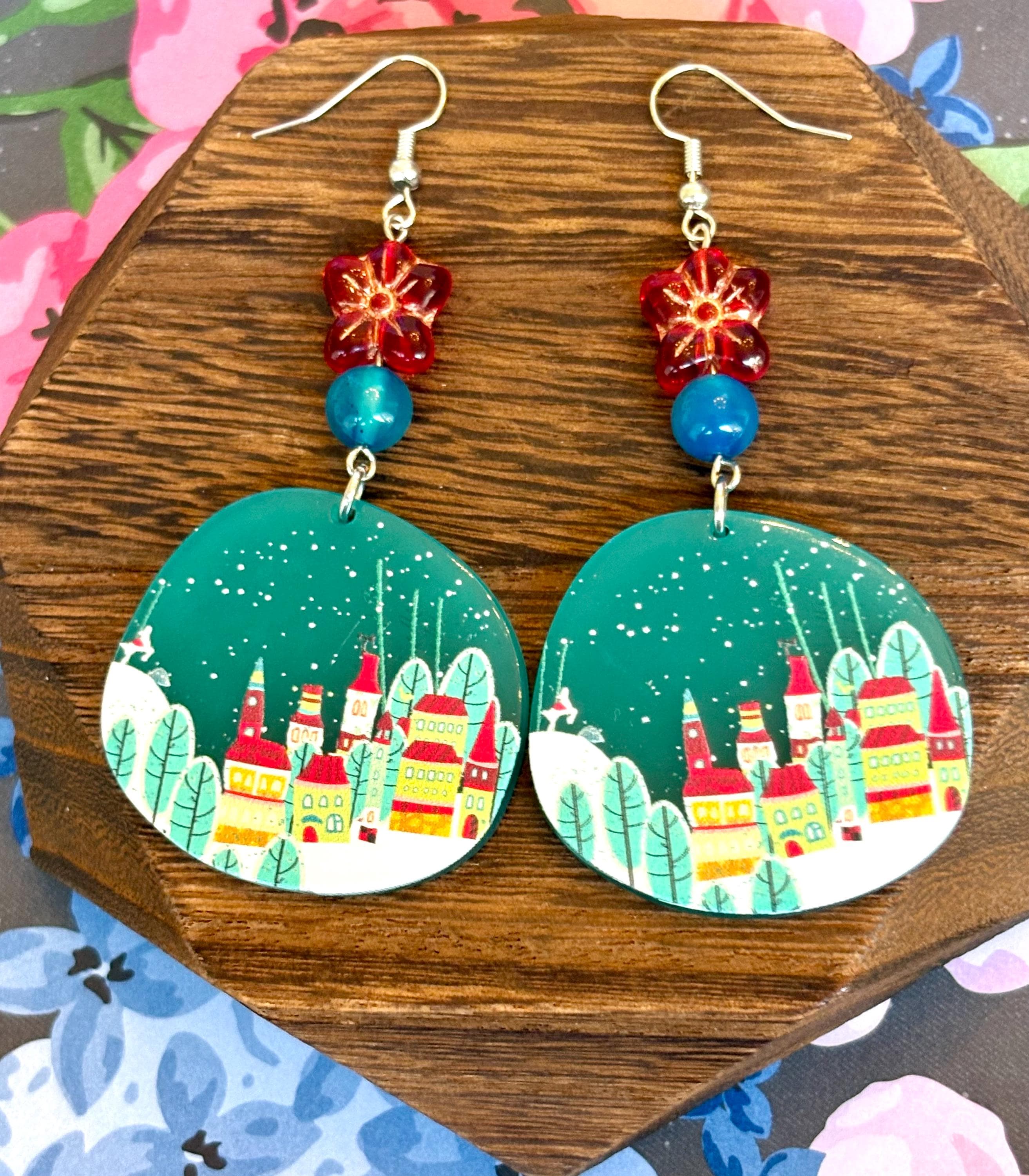 Step into a storybook winter wonderland with these Enchanted Winter Village Earrings, where cheerful color meets cozy holiday magic!✨ Each pair features handcrafted acrylic pendants showcasing a whimsical snow-covered village in shades of teal, red, yellow, and white—like a Christmas card come to life! Above the village dangle glowing blue Apatite gemstones and shimmering red Czech glass flowers, adding a joyful pop of color and festive charm.
