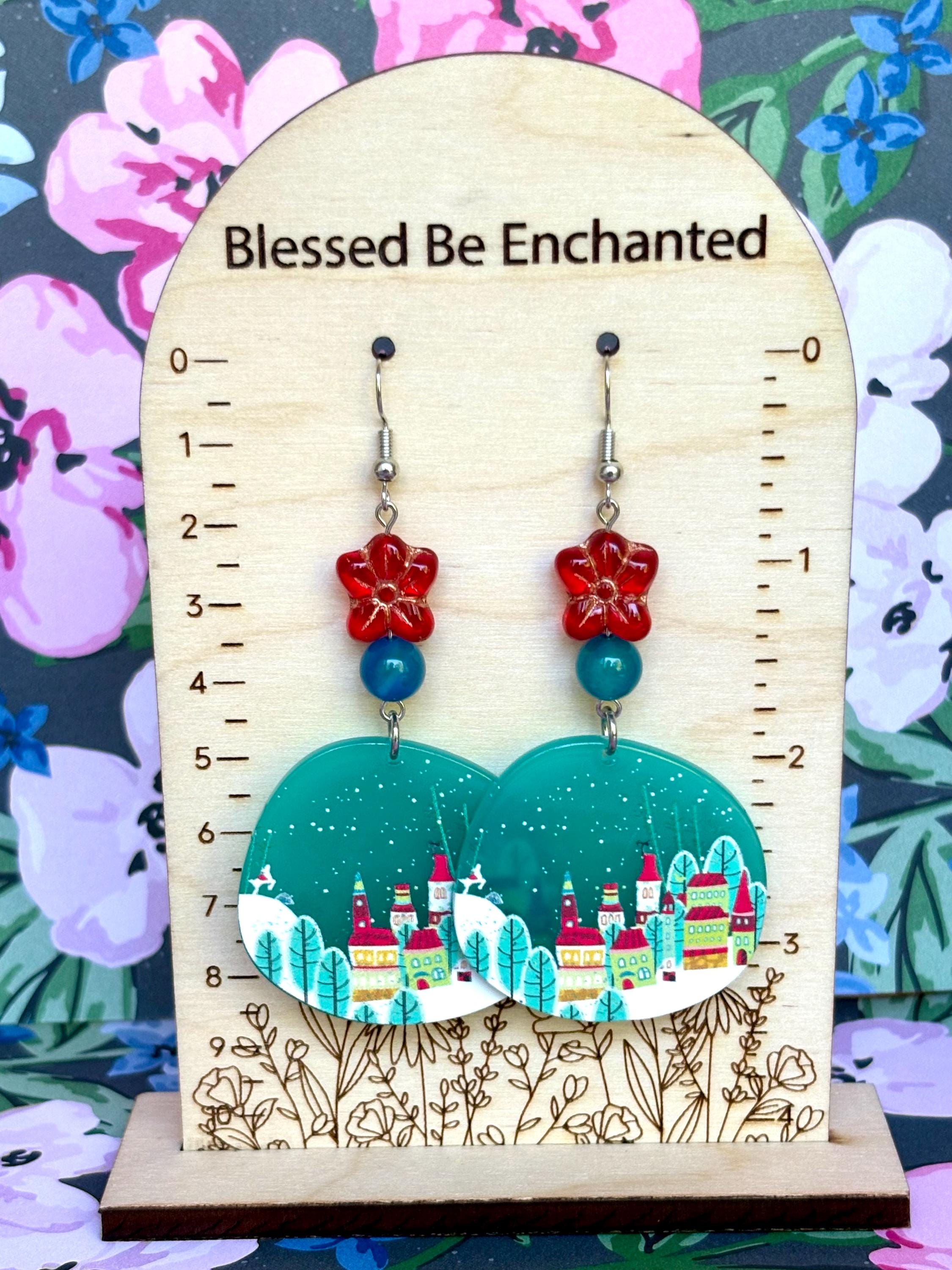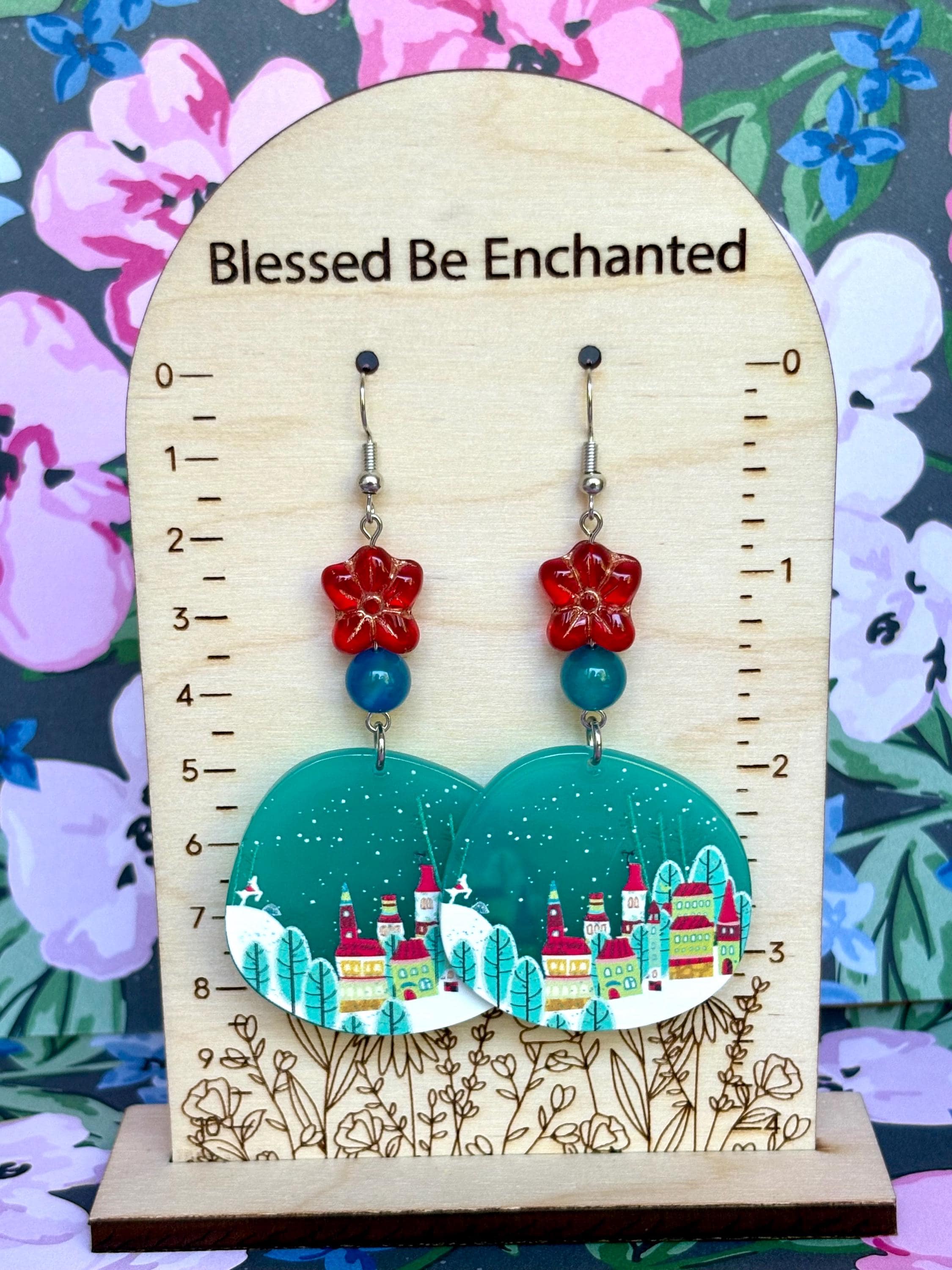 Enchanted Winter Village Earrings – Czech Glass Flowers, Apatite Gemstones & Snowy Town Acrylic Pendants | Festive Holiday Earrings | Hypoallergenic 316L Stainless Steel