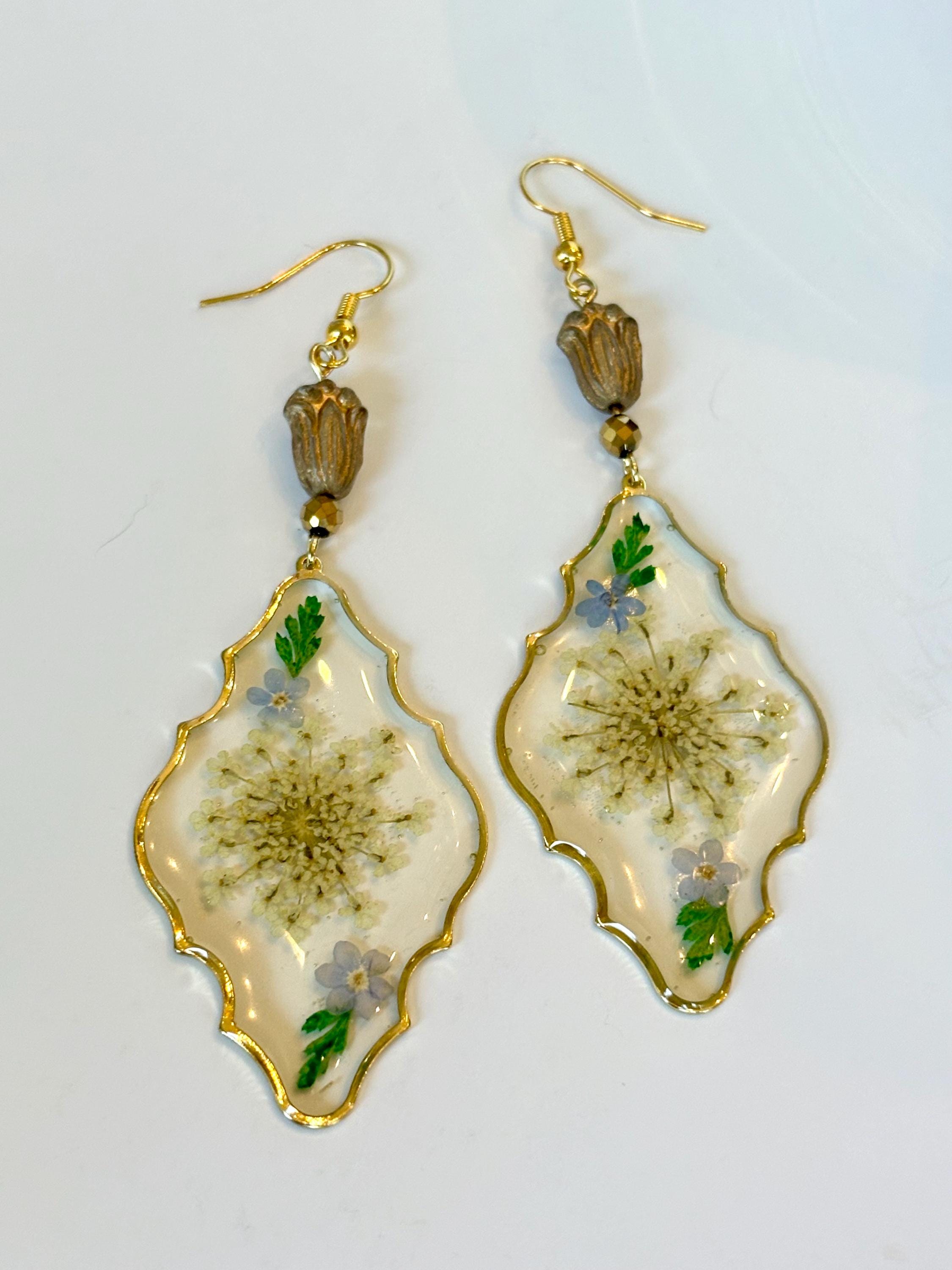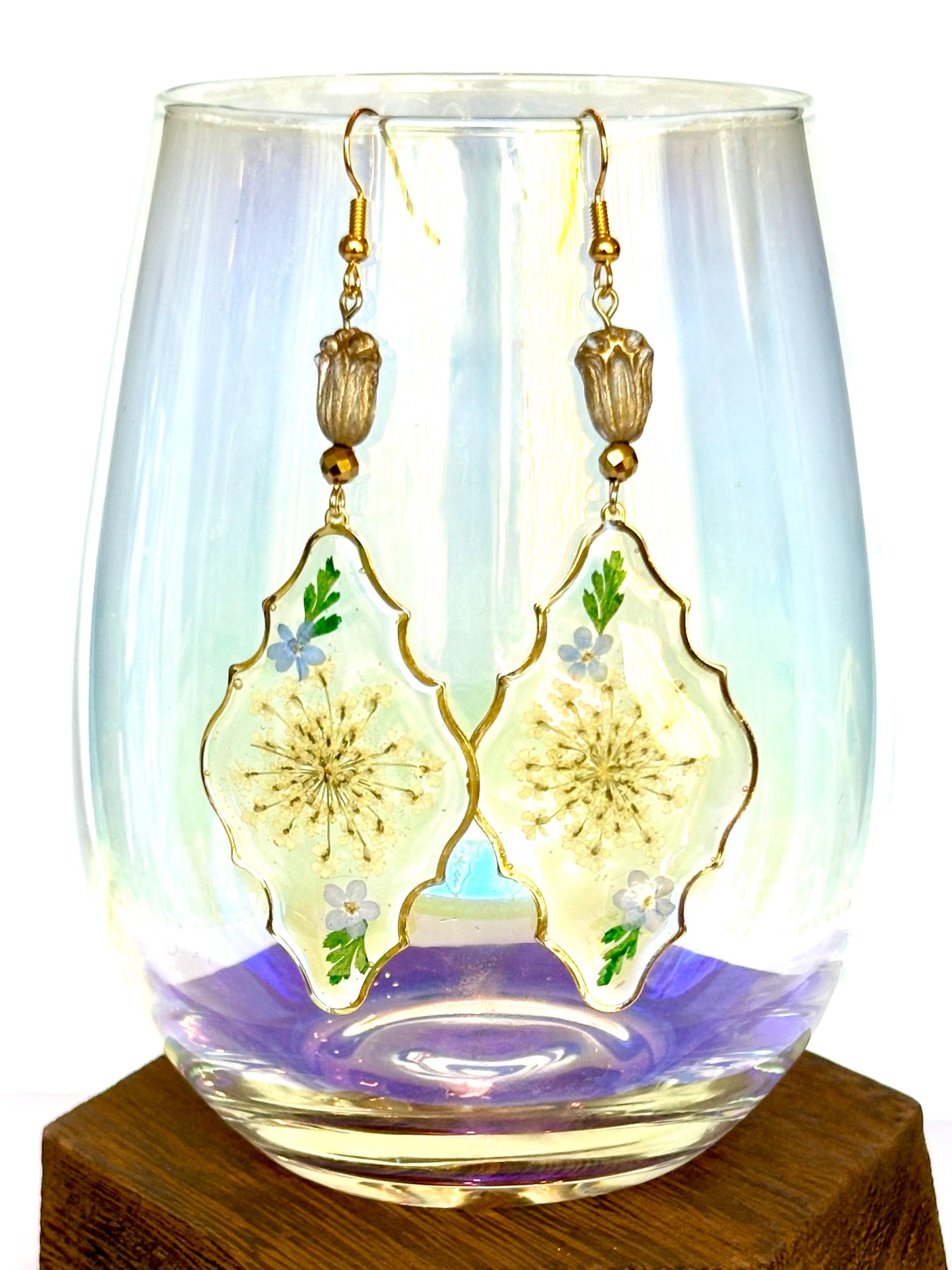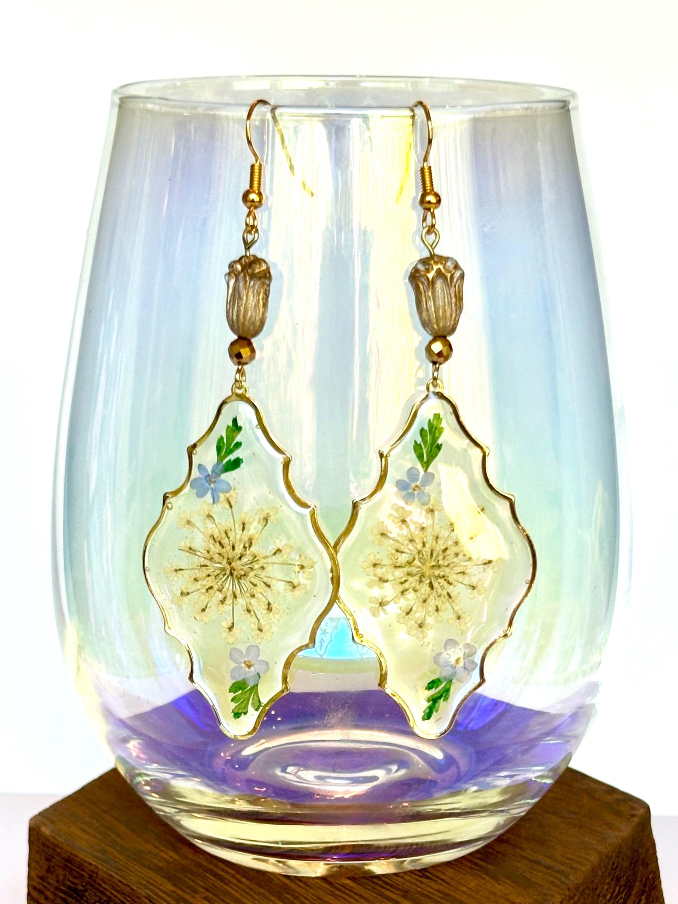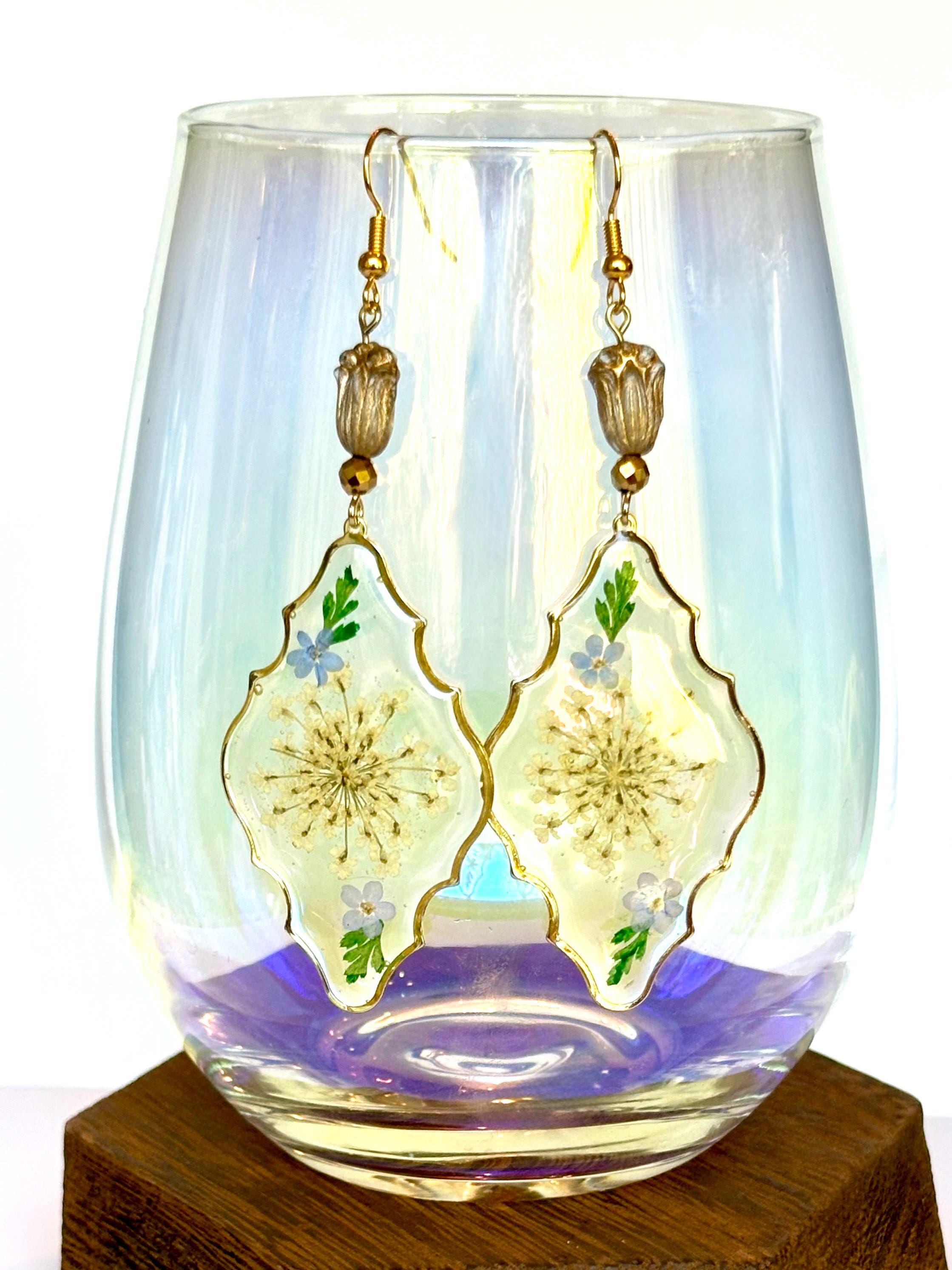 Celebrate the magic of the season with these Enchanted Holiday Blossom Earrings, a radiant mix of natural beauty and golden elegance! Each pair features delicate resin pendants filled with real pressed flowers and greenery, creating a timeless botanical keepsake that glimmers with light. Above, Czech glass tulip beads and faceted gold hematite gemstones add warmth and sparkle, symbolizing joy, protection, and abundance.