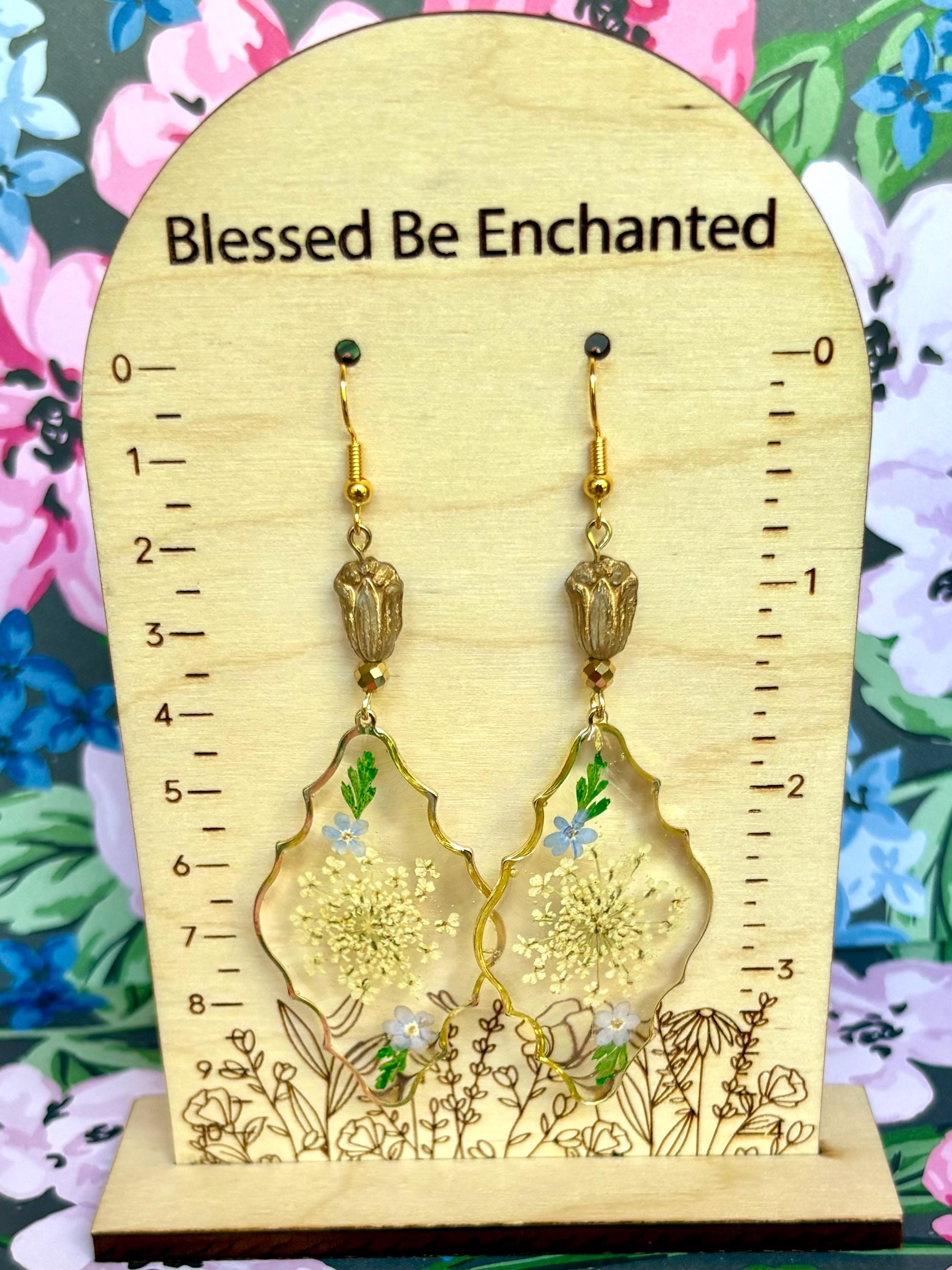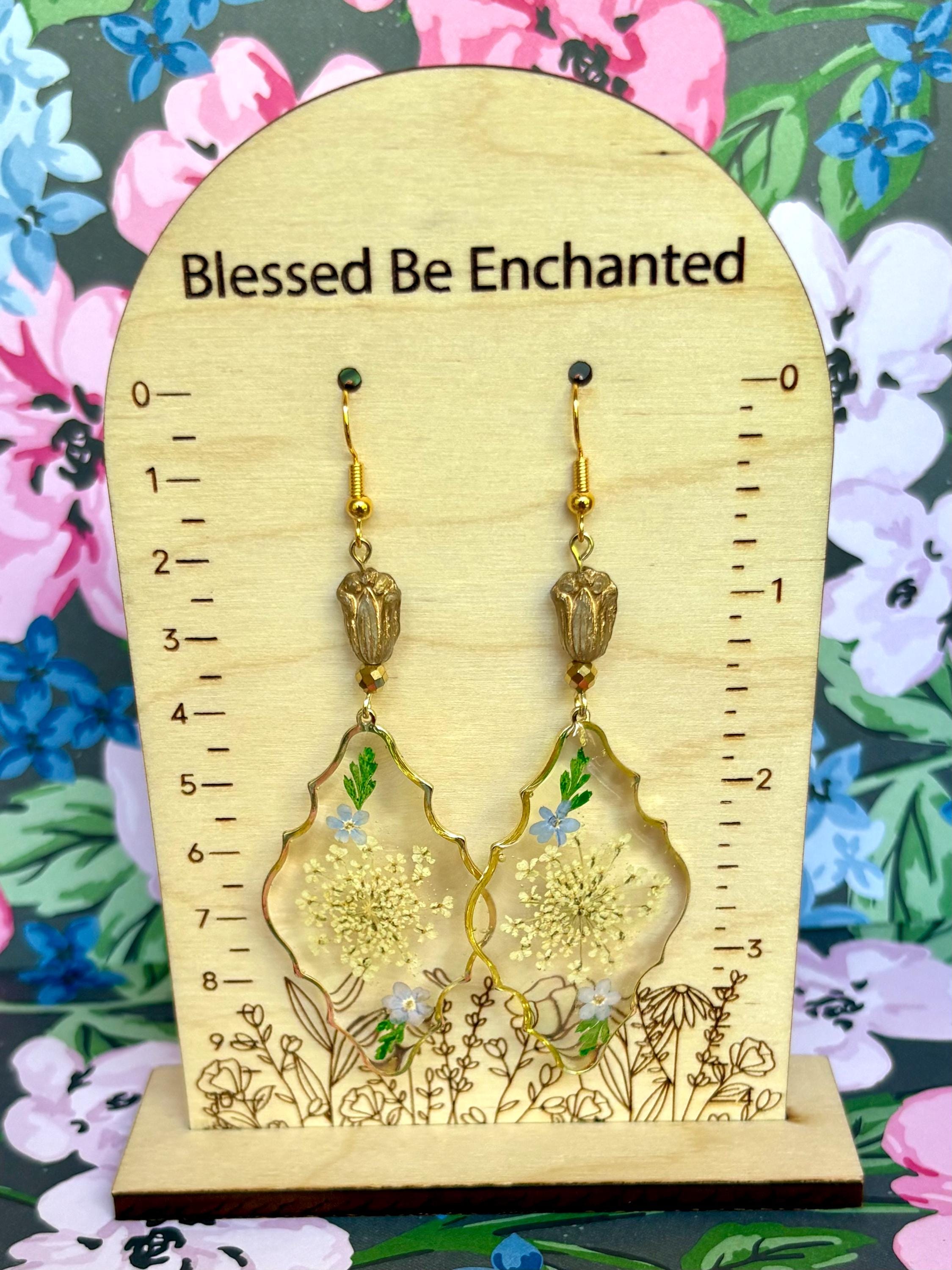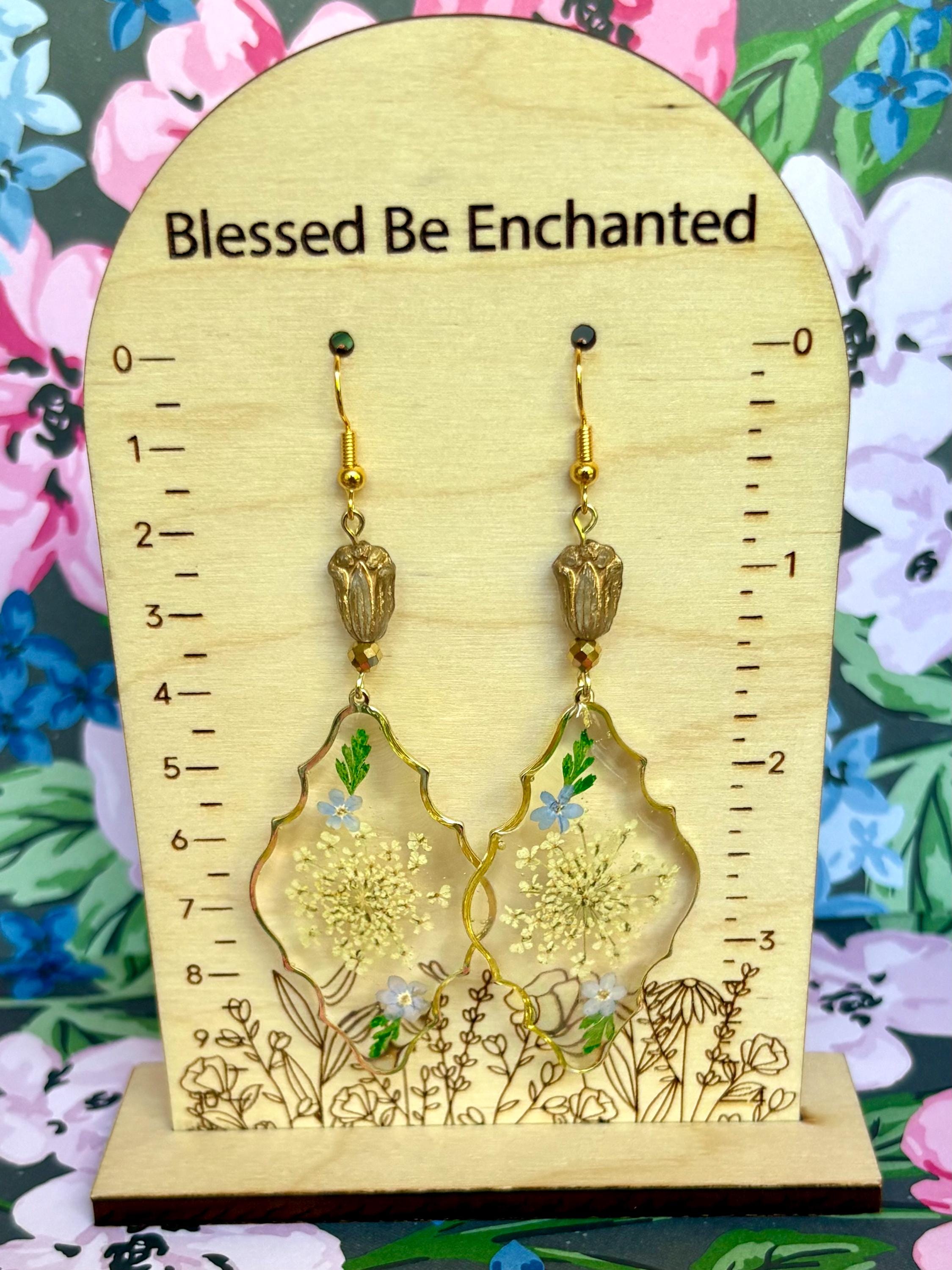 Celebrate the magic of the season with these Enchanted Holiday Blossom Earrings, a radiant mix of natural beauty and golden elegance! Each pair features delicate resin pendants filled with real pressed flowers and greenery, creating a timeless botanical keepsake that glimmers with light. Above, Czech glass tulip beads and faceted gold hematite gemstones add warmth and sparkle, symbolizing joy, protection, and abundance.